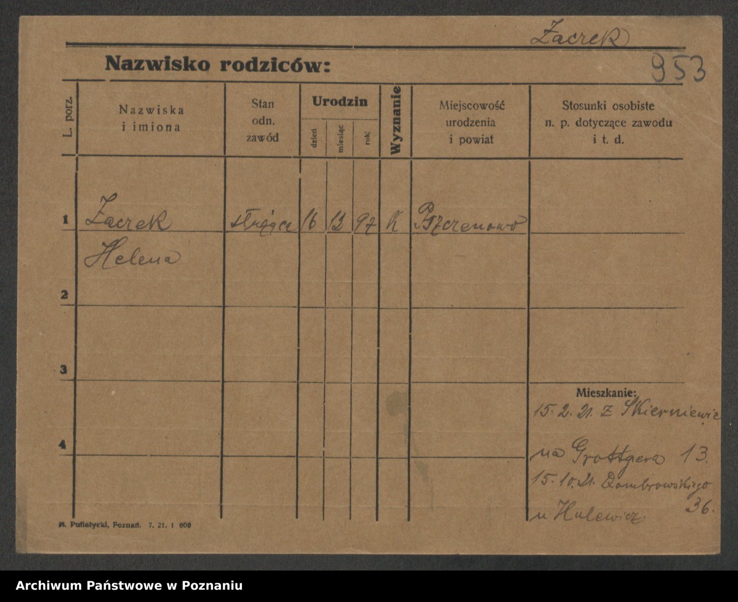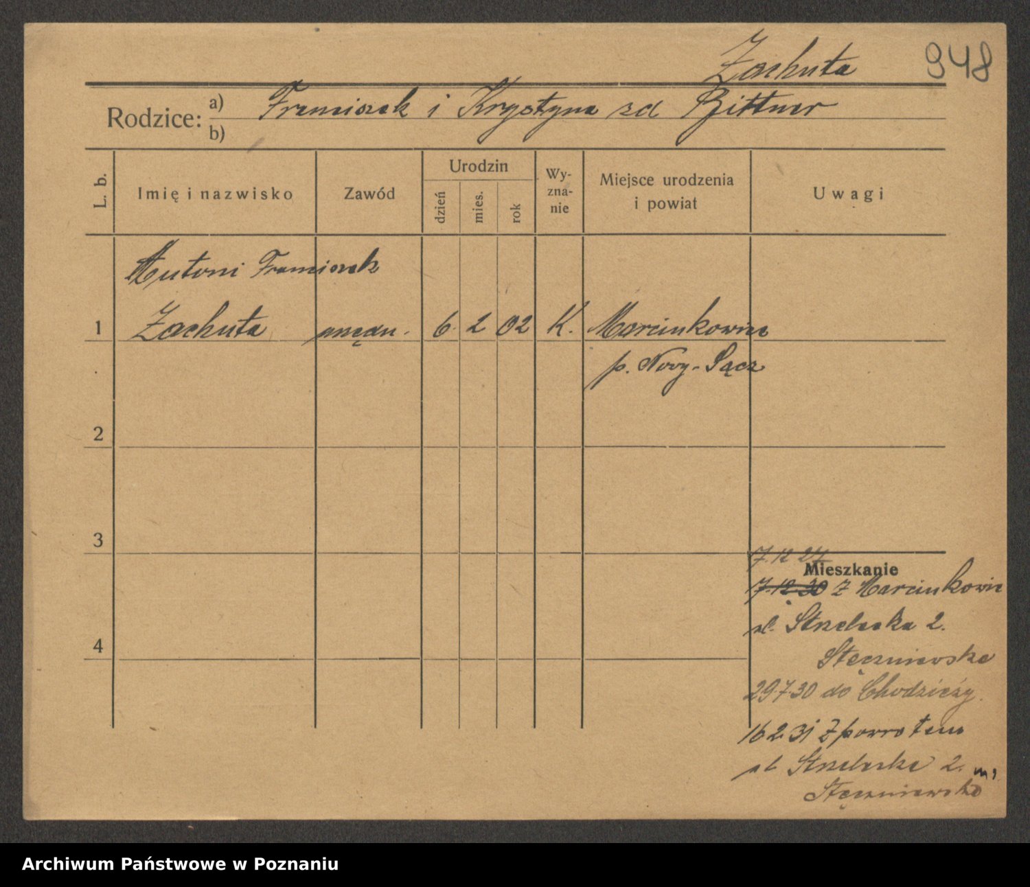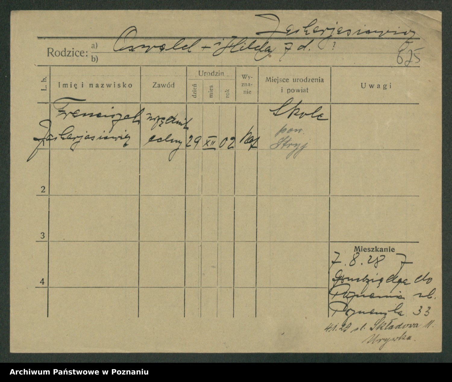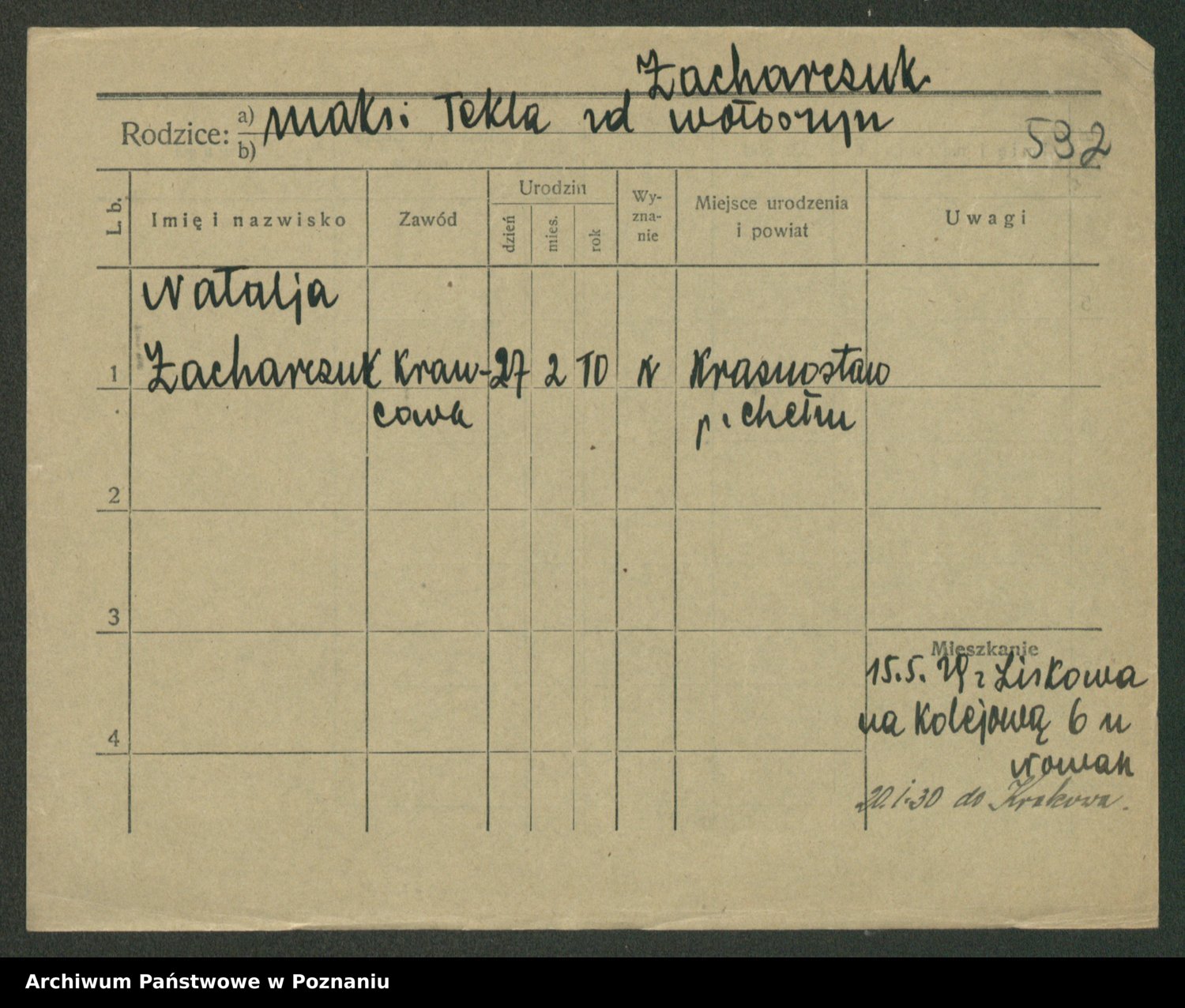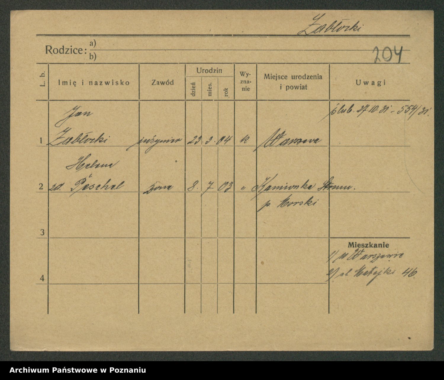 Podgląd karty osobowej dostępny jest po kliknięciu na nazwisko lub ikonkę karty. Można dokonywać powiększenia (ikony na górze) lub przechodzić między kolejnymi skanami (strzałki po bokach).
