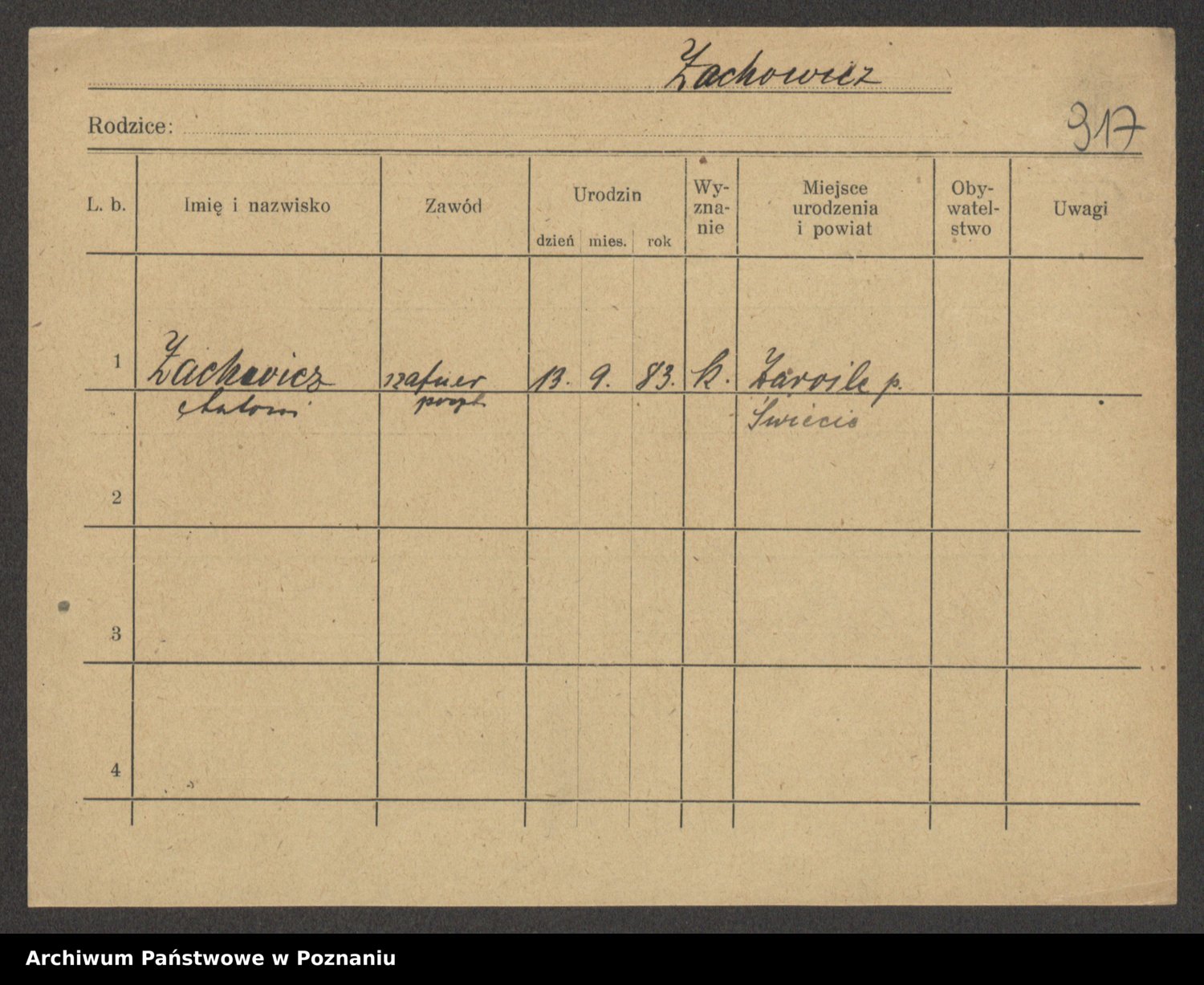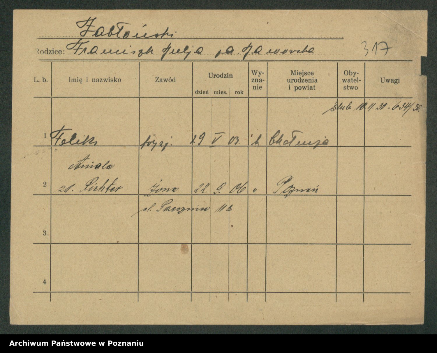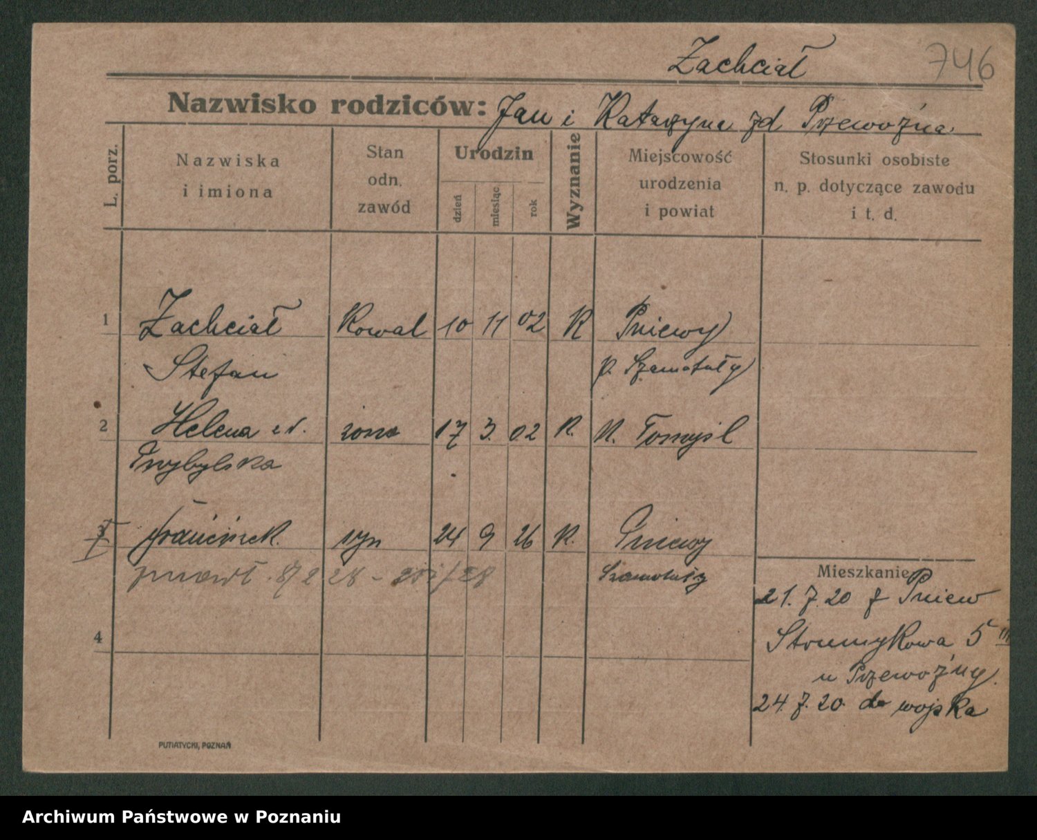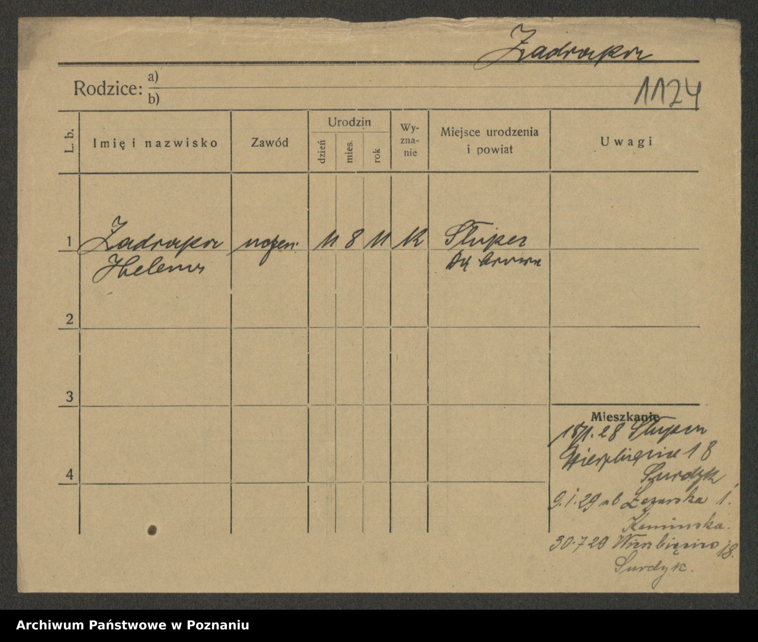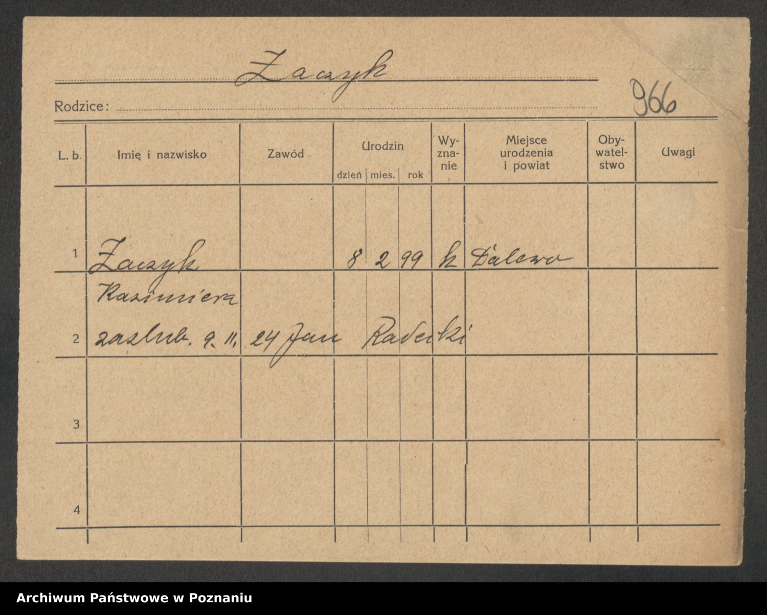 Podgląd karty osobowej dostępny jest po kliknięciu na nazwisko lub ikonkę karty. Można dokonywać powiększenia (ikony na górze) lub przechodzić między kolejnymi skanami (strzałki po bokach).