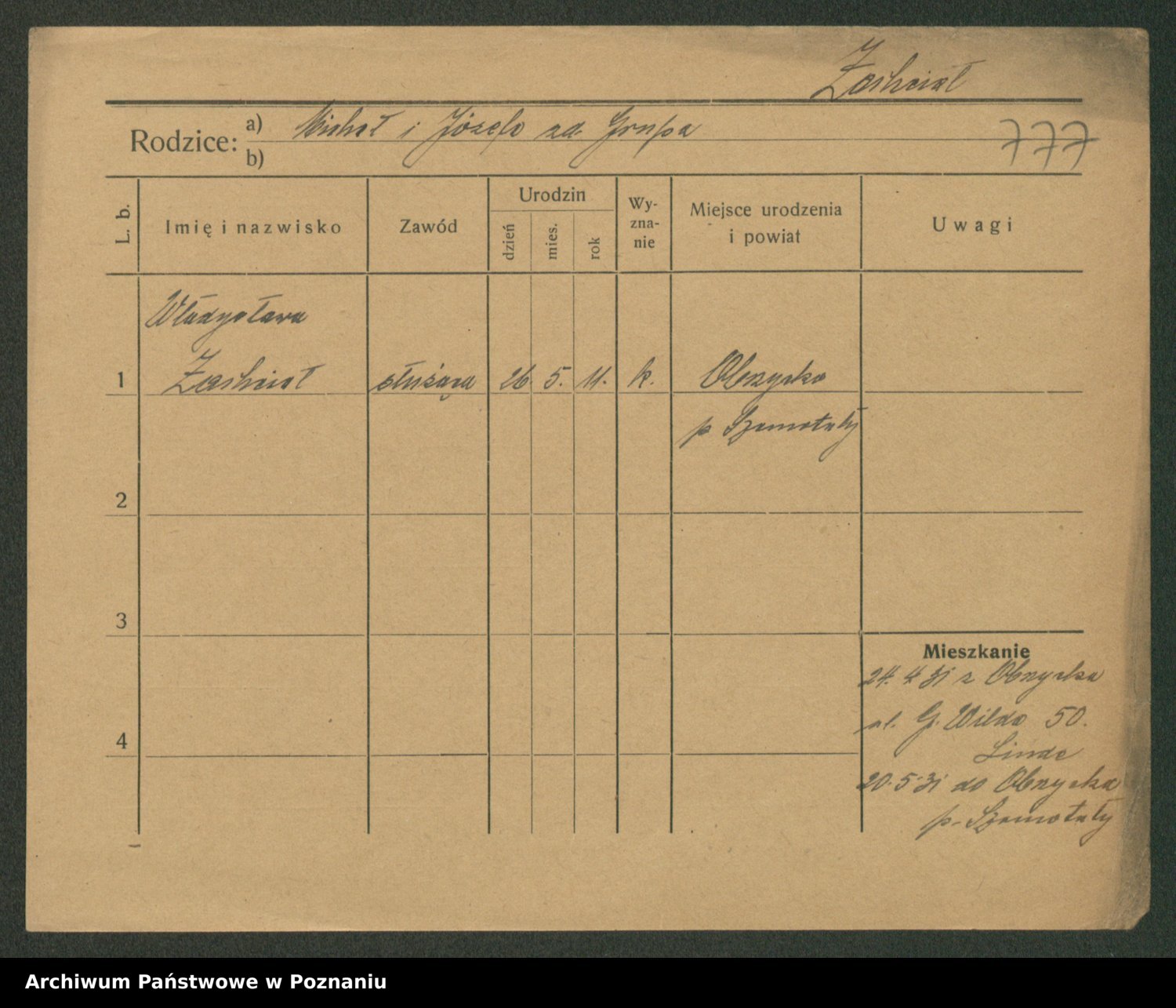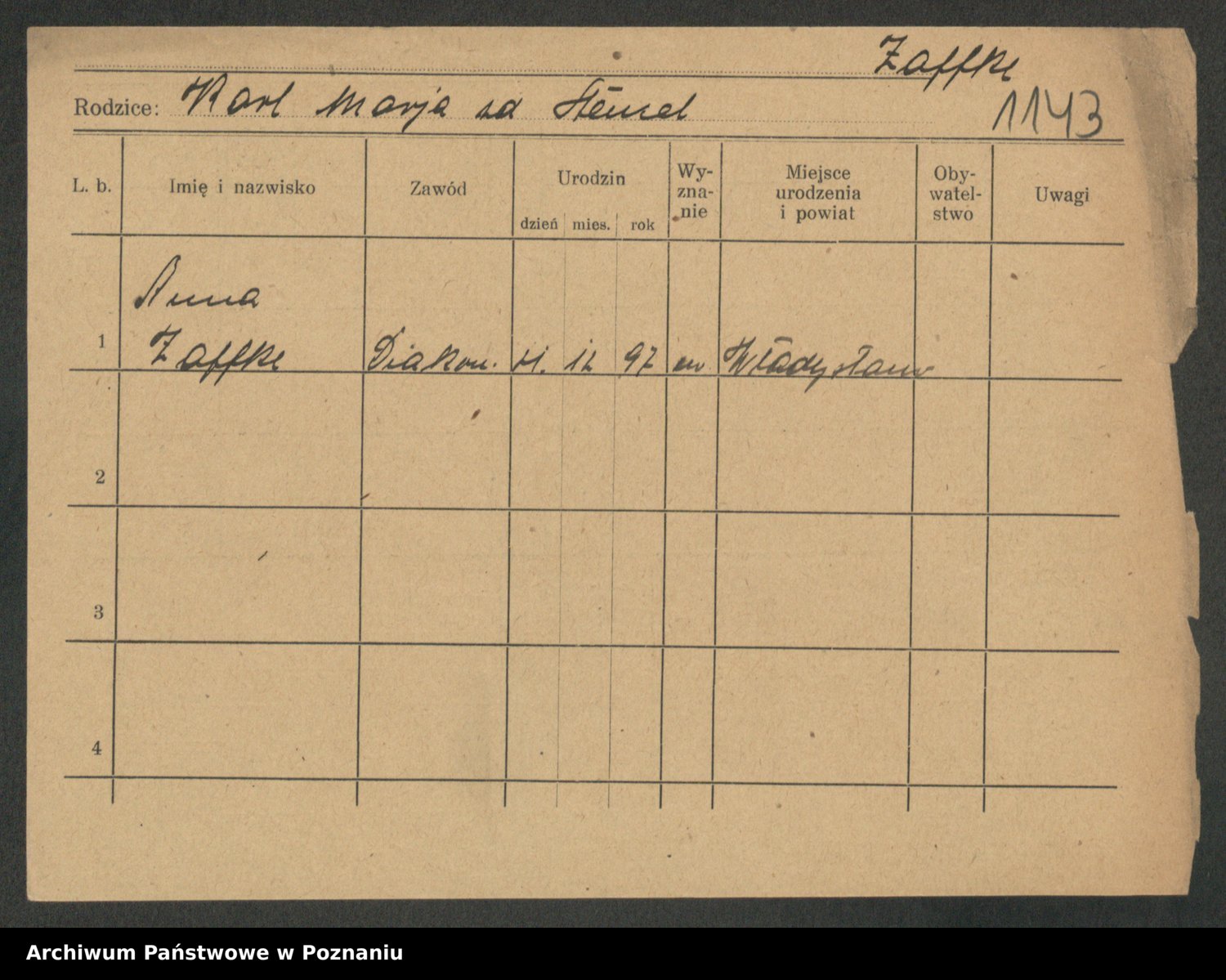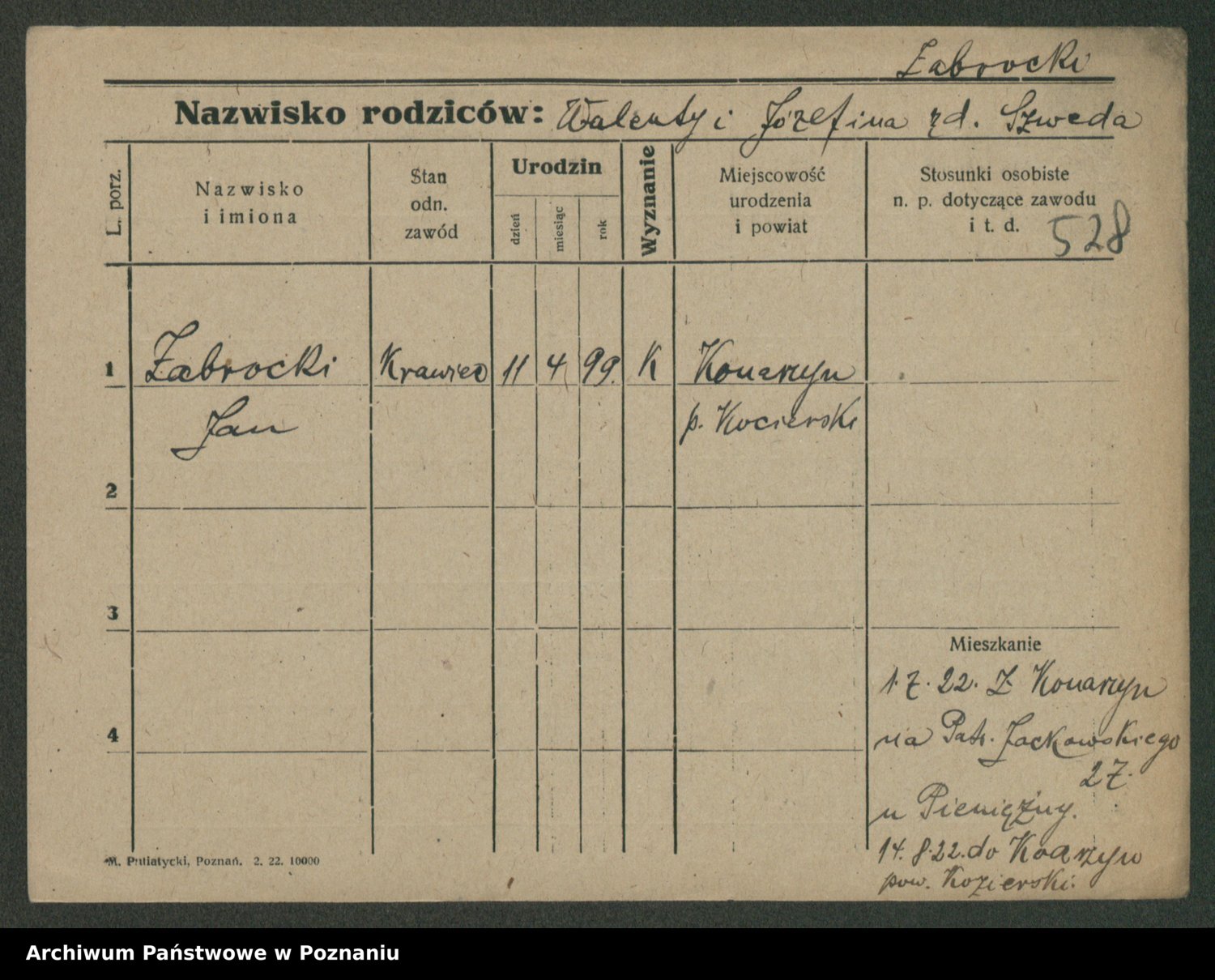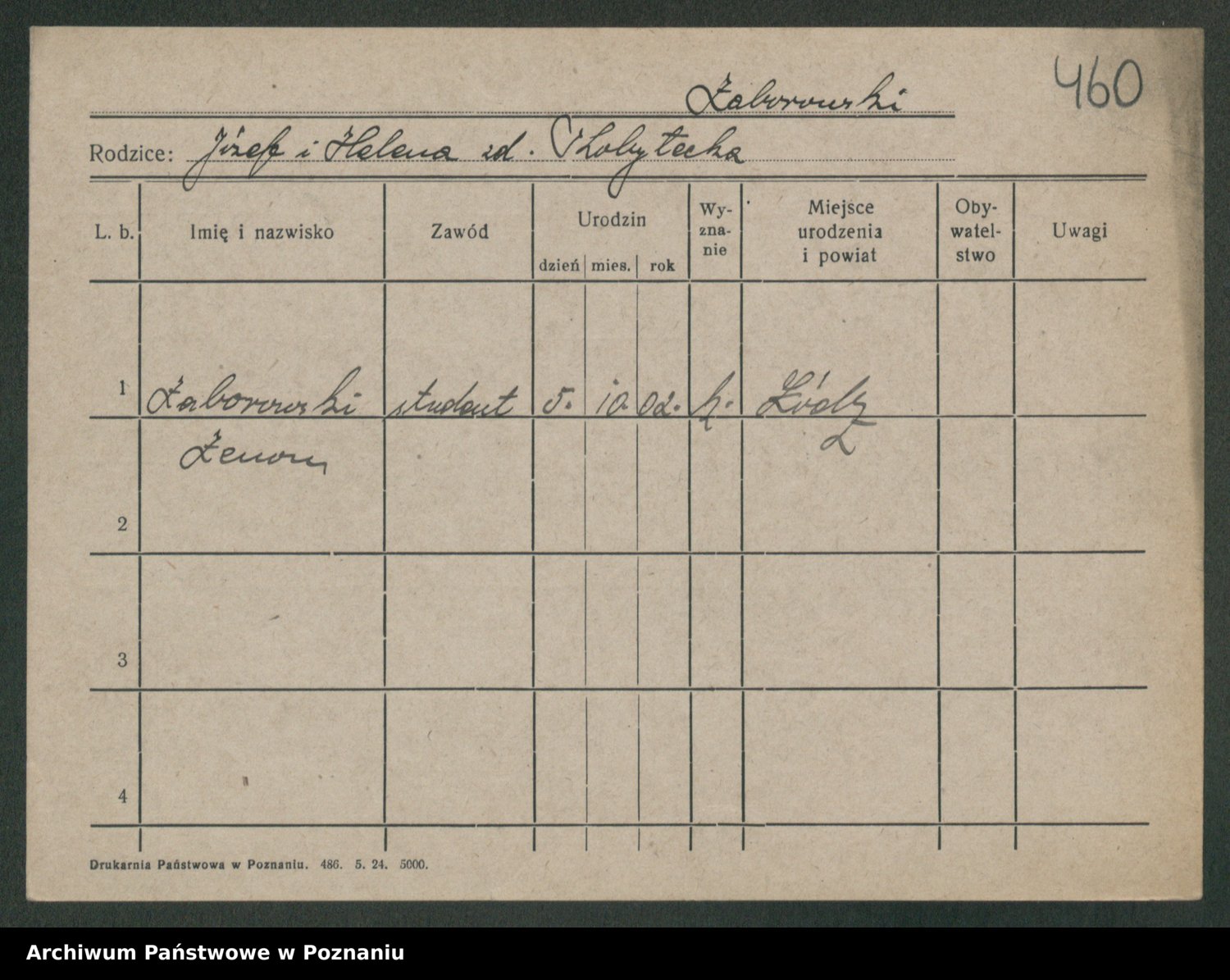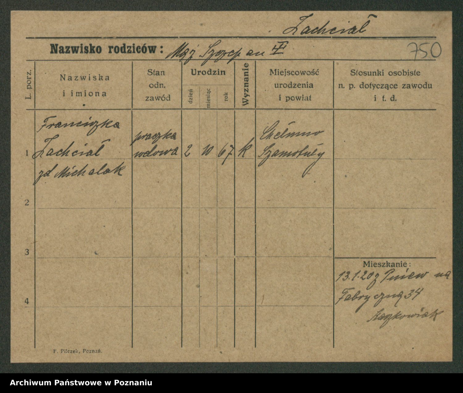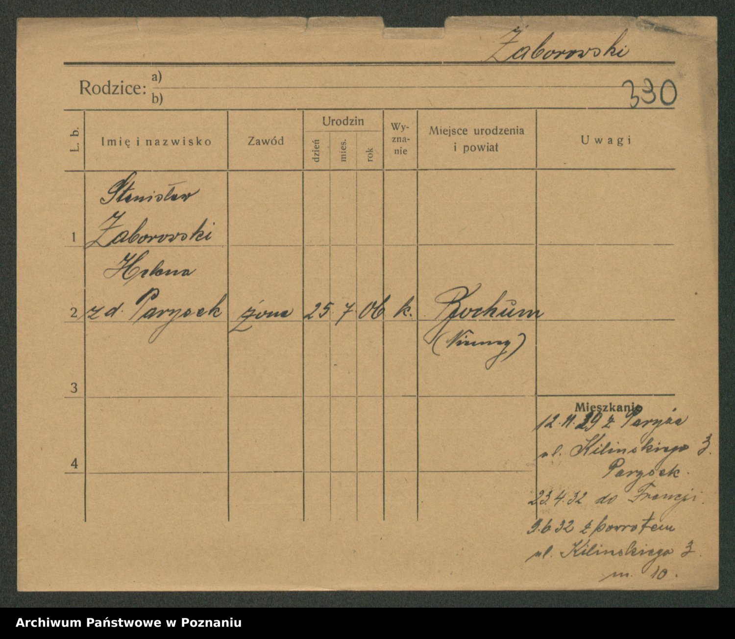 Podgląd karty osobowej dostępny jest po kliknięciu na nazwisko lub ikonkę karty. Można dokonywać powiększenia (ikony na górze) lub przechodzić między kolejnymi skanami (strzałki po bokach).