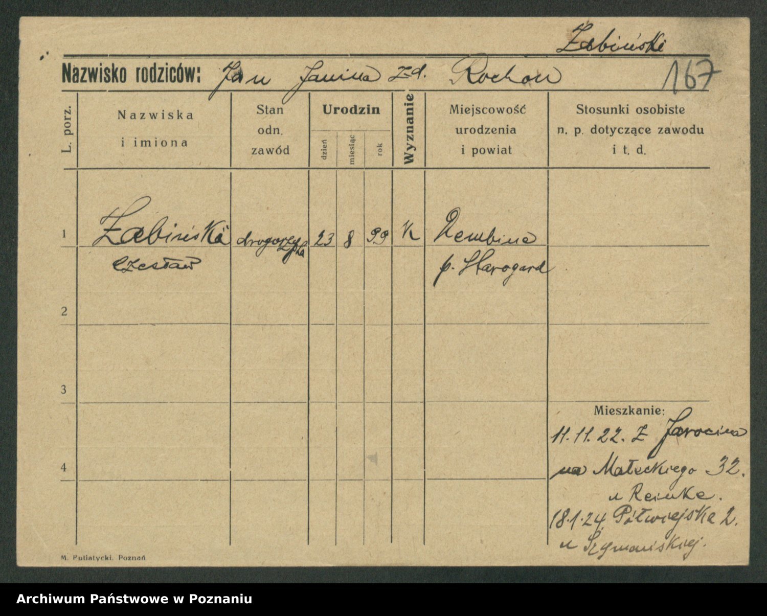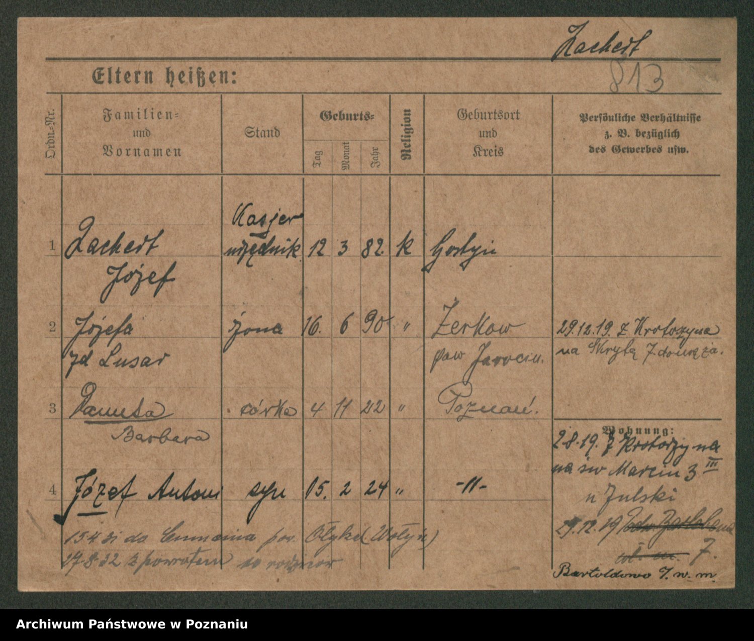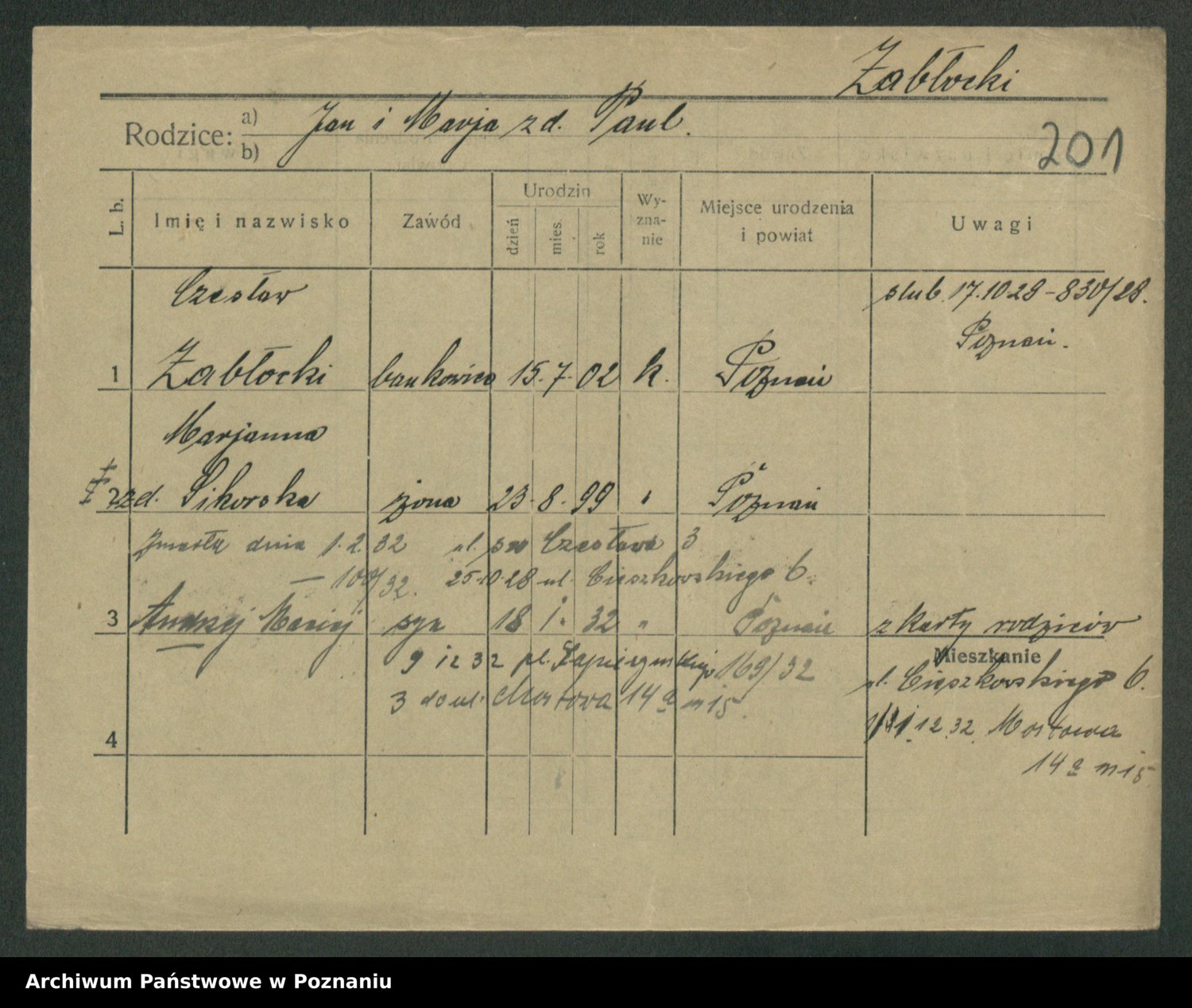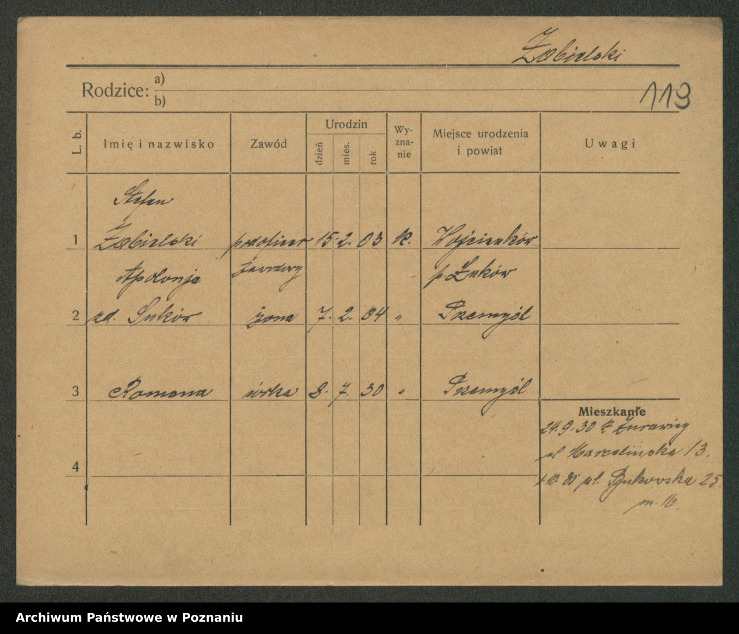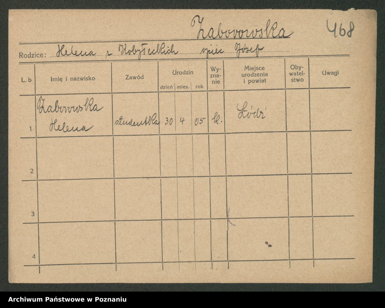 Podgląd karty osobowej dostępny jest po kliknięciu na nazwisko lub ikonkę karty. Można dokonywać powiększenia (ikony na górze) lub przechodzić między kolejnymi skanami (strzałki po bokach).