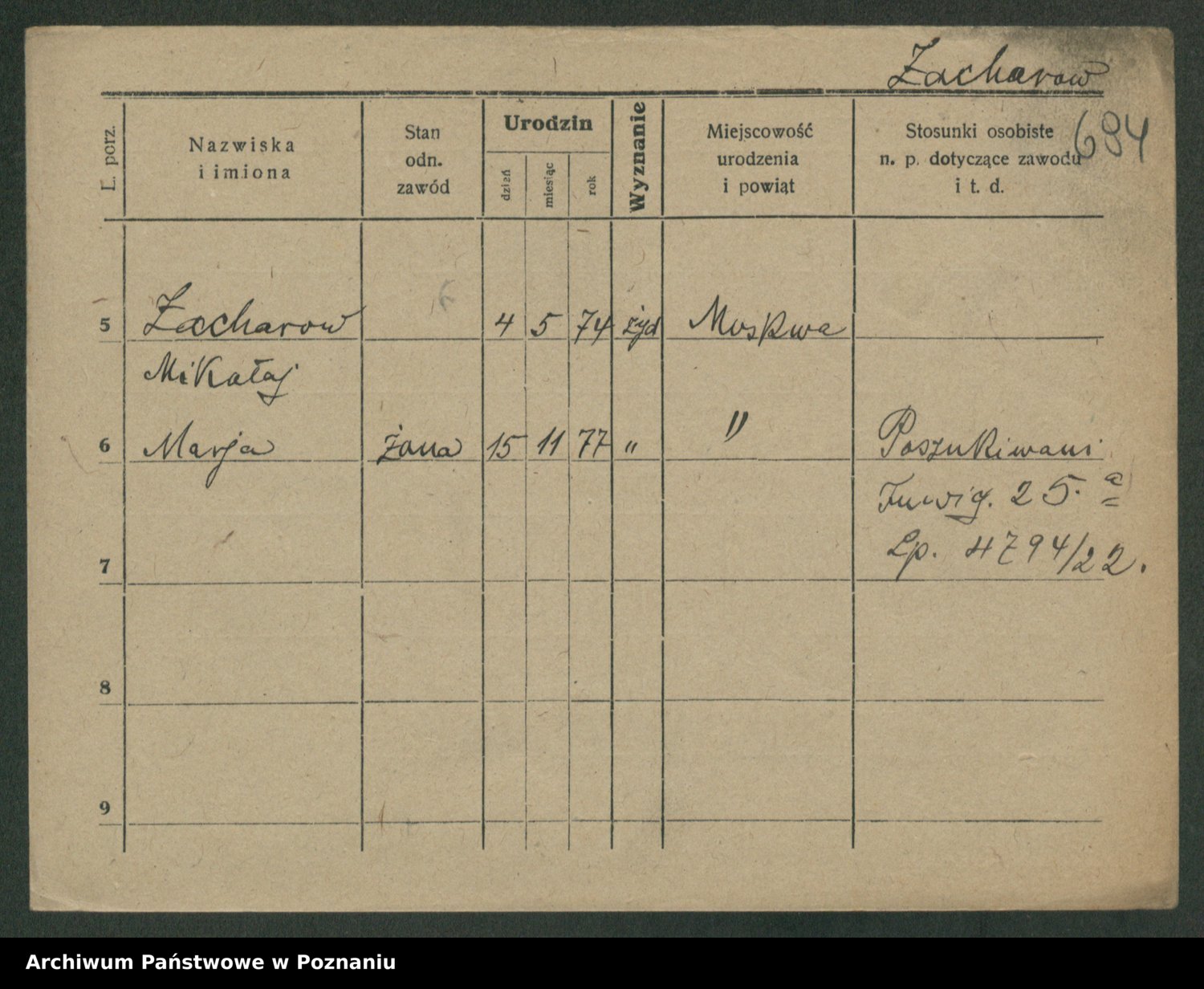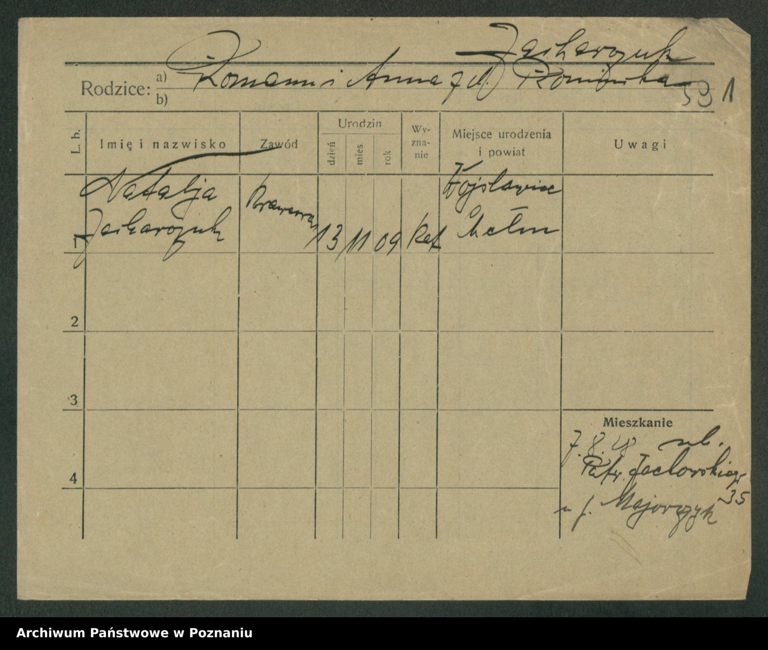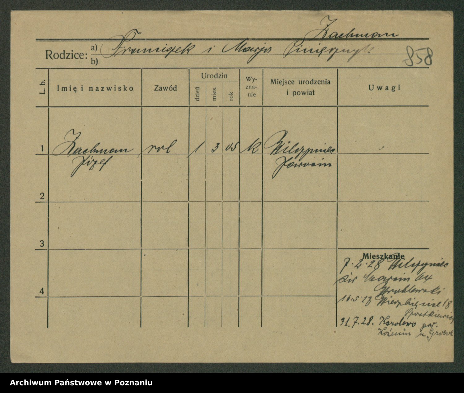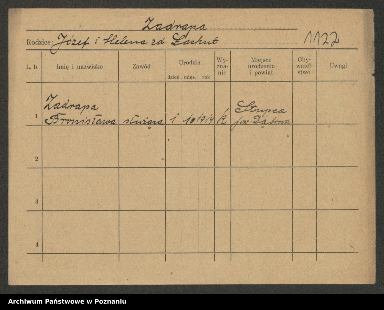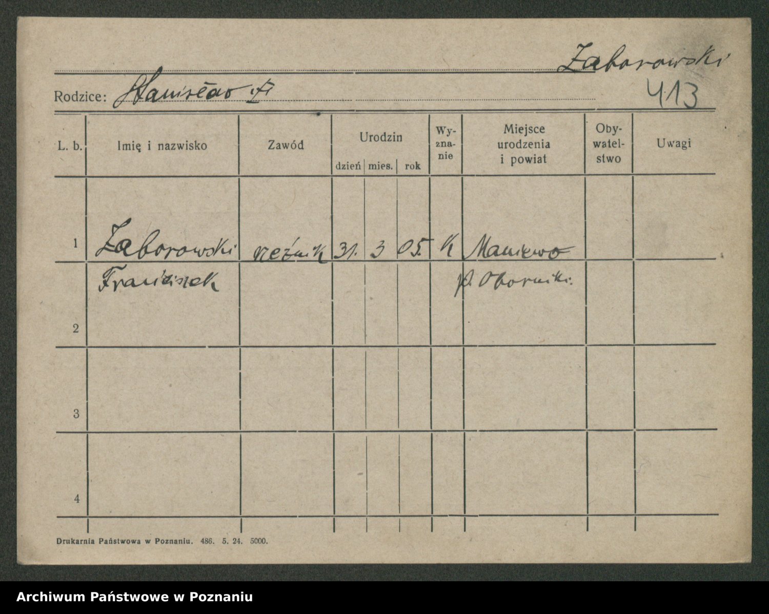 Podgląd karty osobowej dostępny jest po kliknięciu na nazwisko lub ikonkę karty. Można dokonywać powiększenia (ikony na górze) lub przechodzić między kolejnymi skanami (strzałki po bokach).