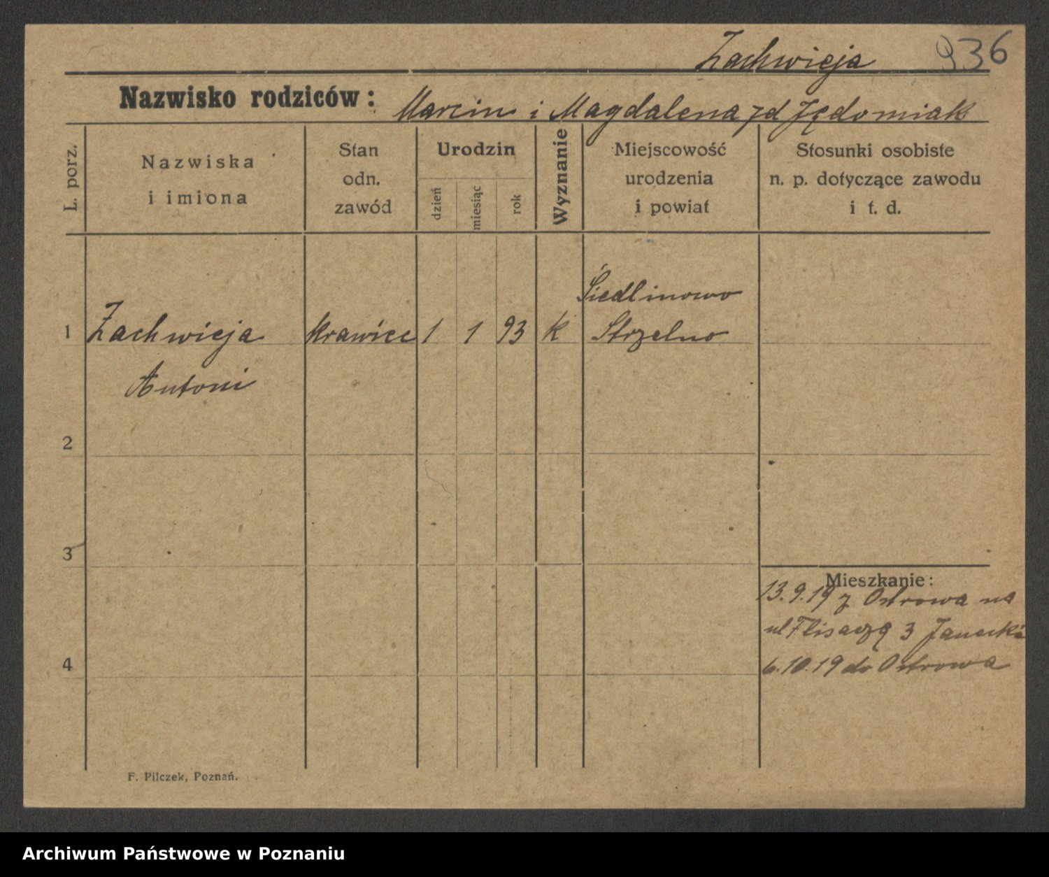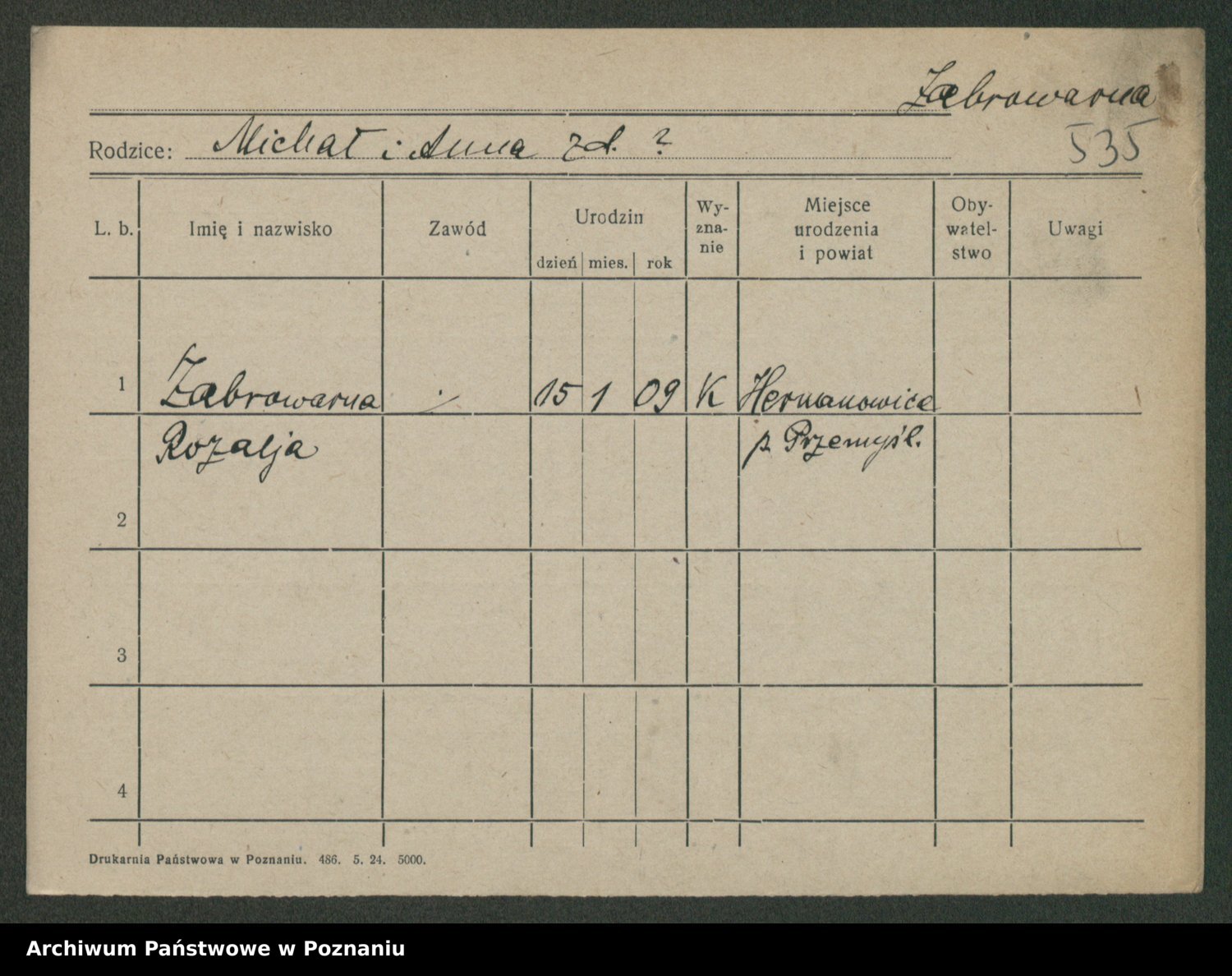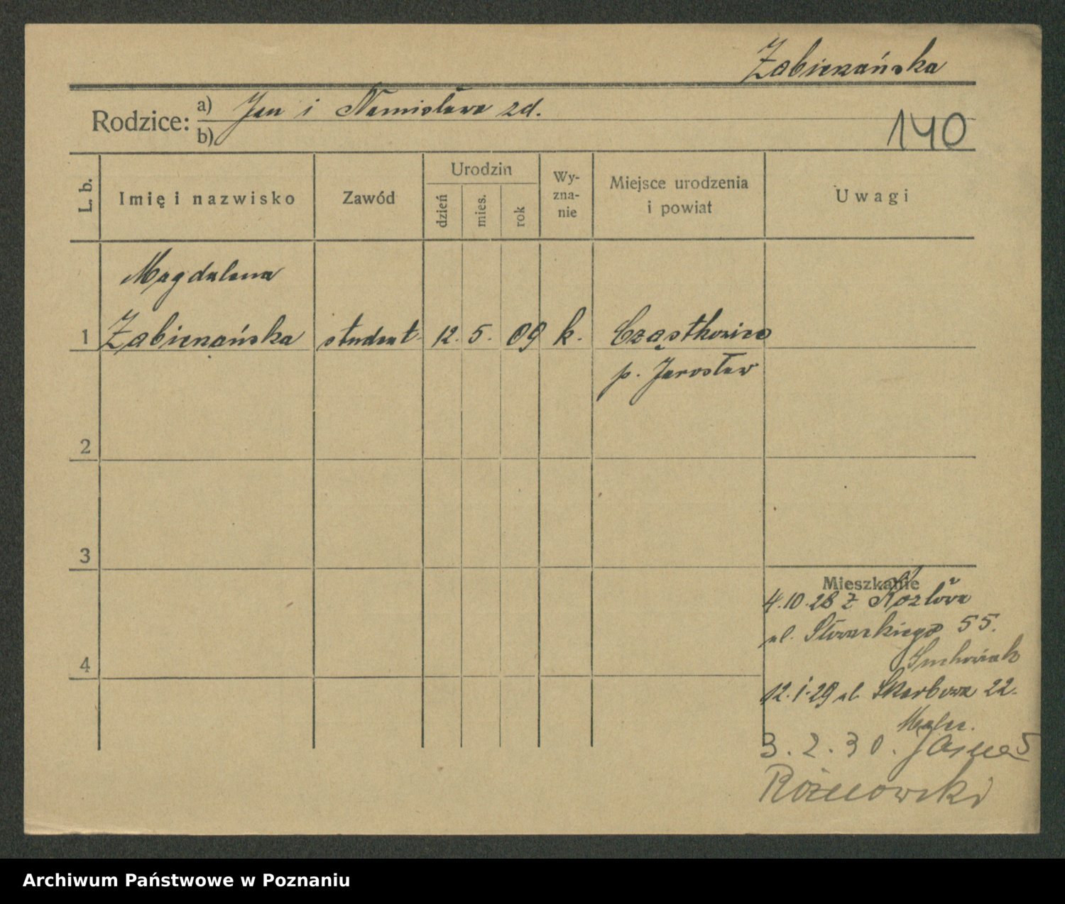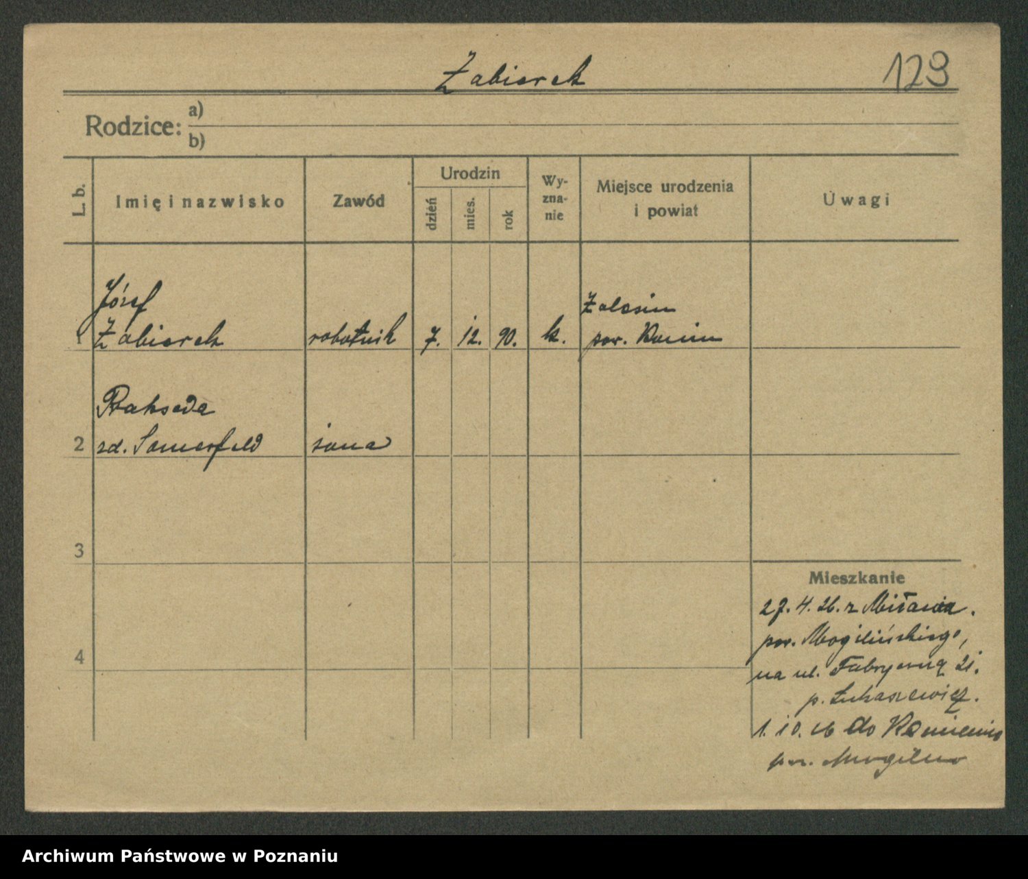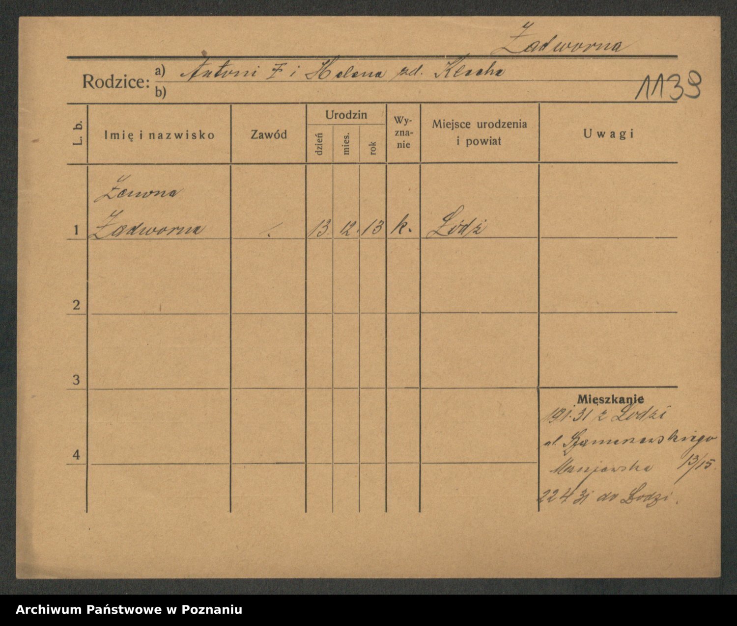 Podgląd karty osobowej dostępny jest po kliknięciu na nazwisko lub ikonkę karty. Można dokonywać powiększenia (ikony na górze) lub przechodzić między kolejnymi skanami (strzałki po bokach).