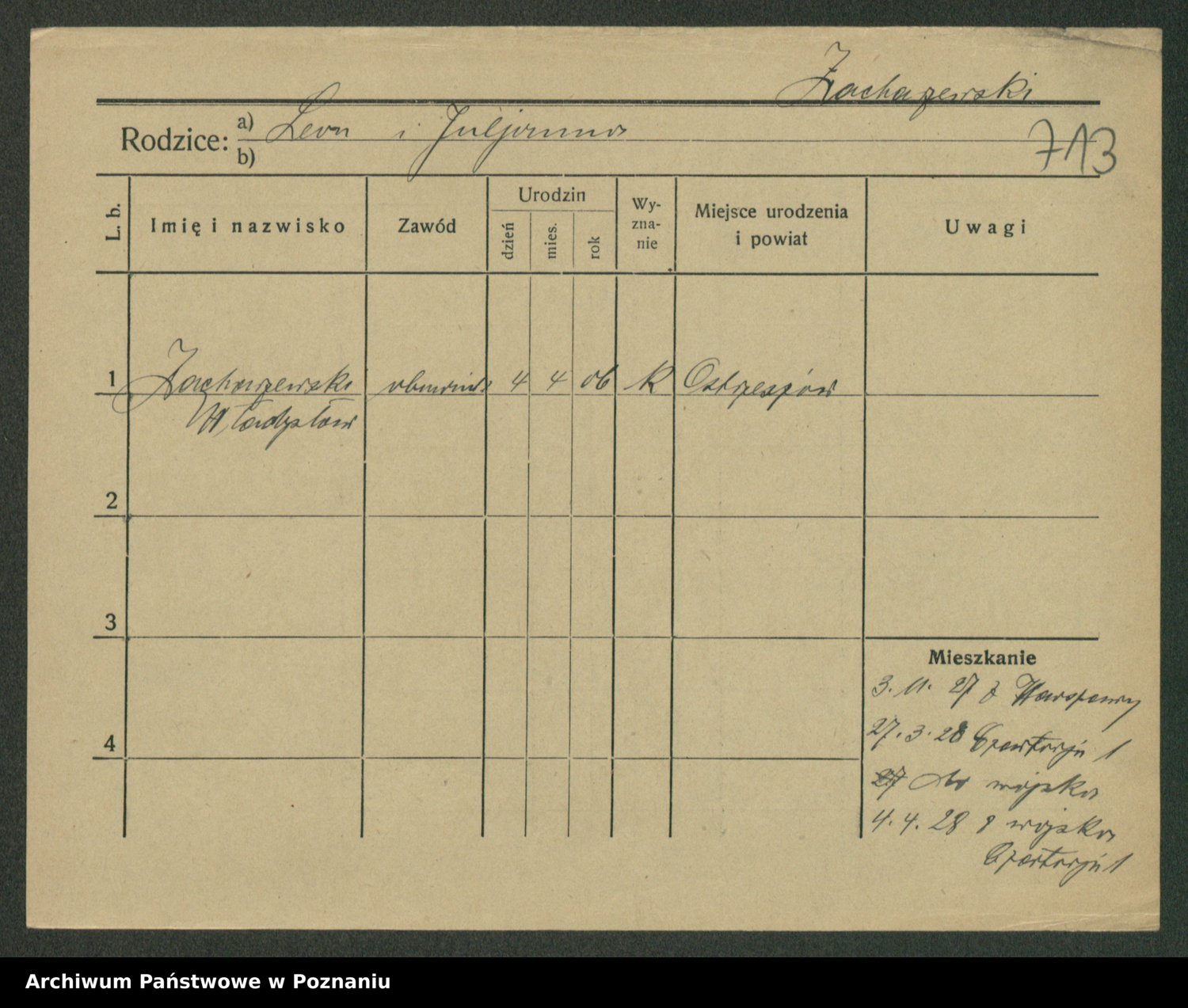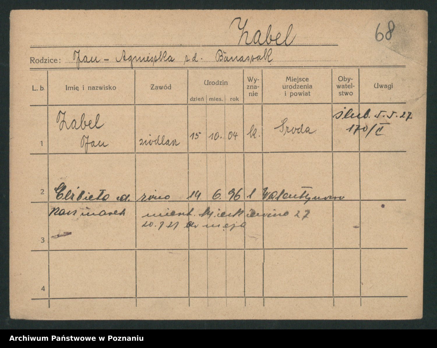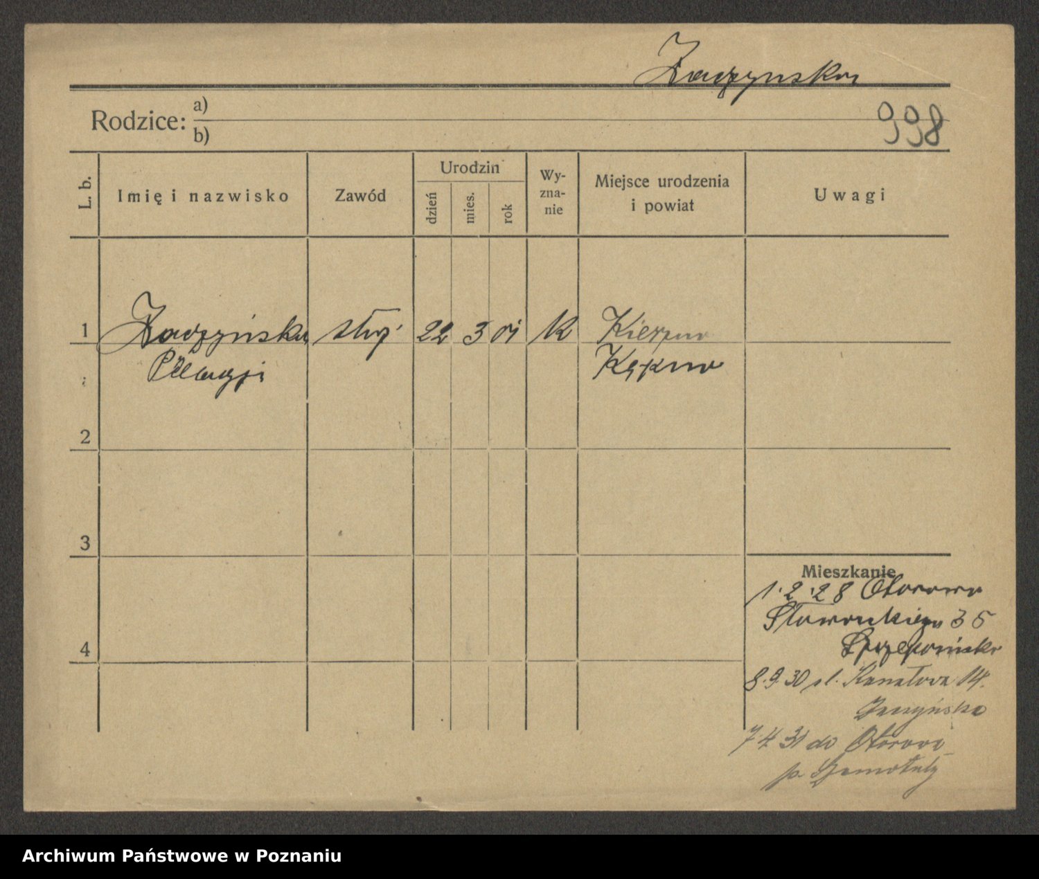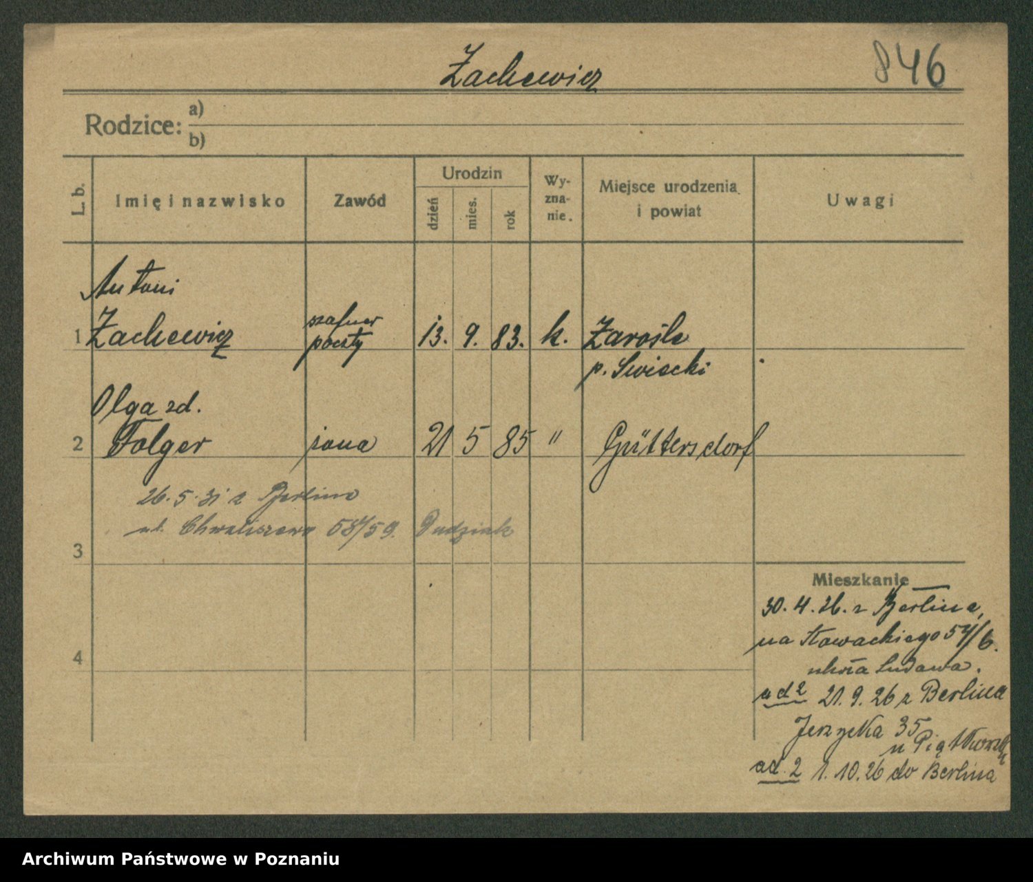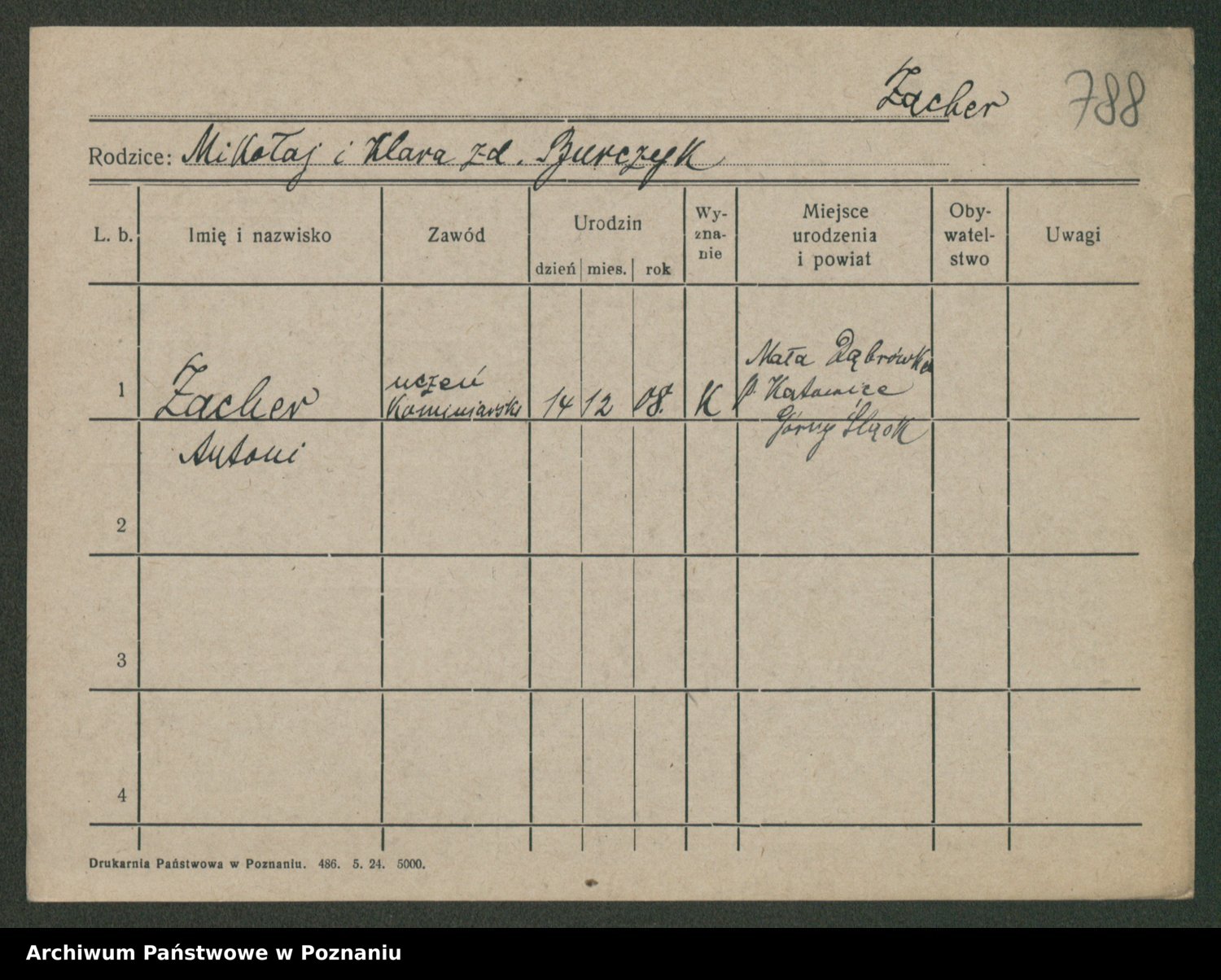 Podgląd karty osobowej dostępny jest po kliknięciu na nazwisko lub ikonkę karty. Można dokonywać powiększenia (ikony na górze) lub przechodzić między kolejnymi skanami (strzałki po bokach).