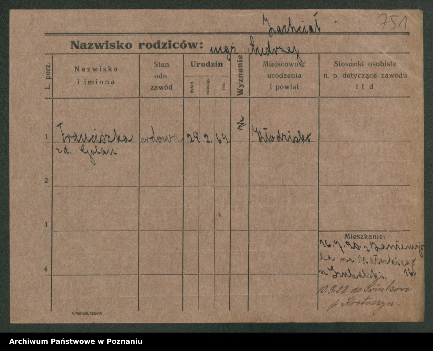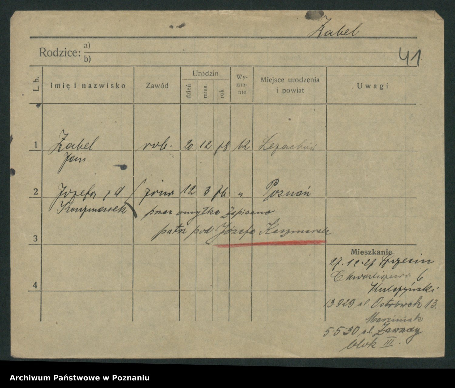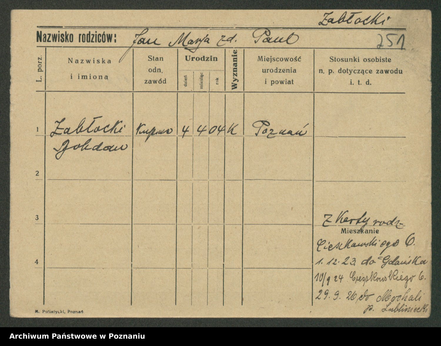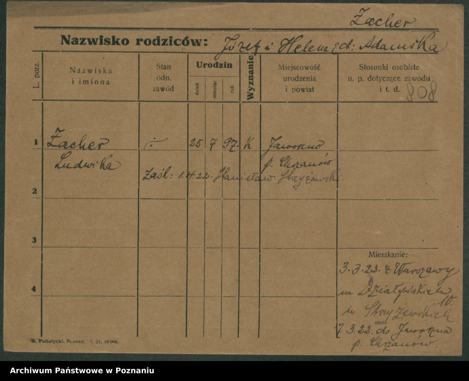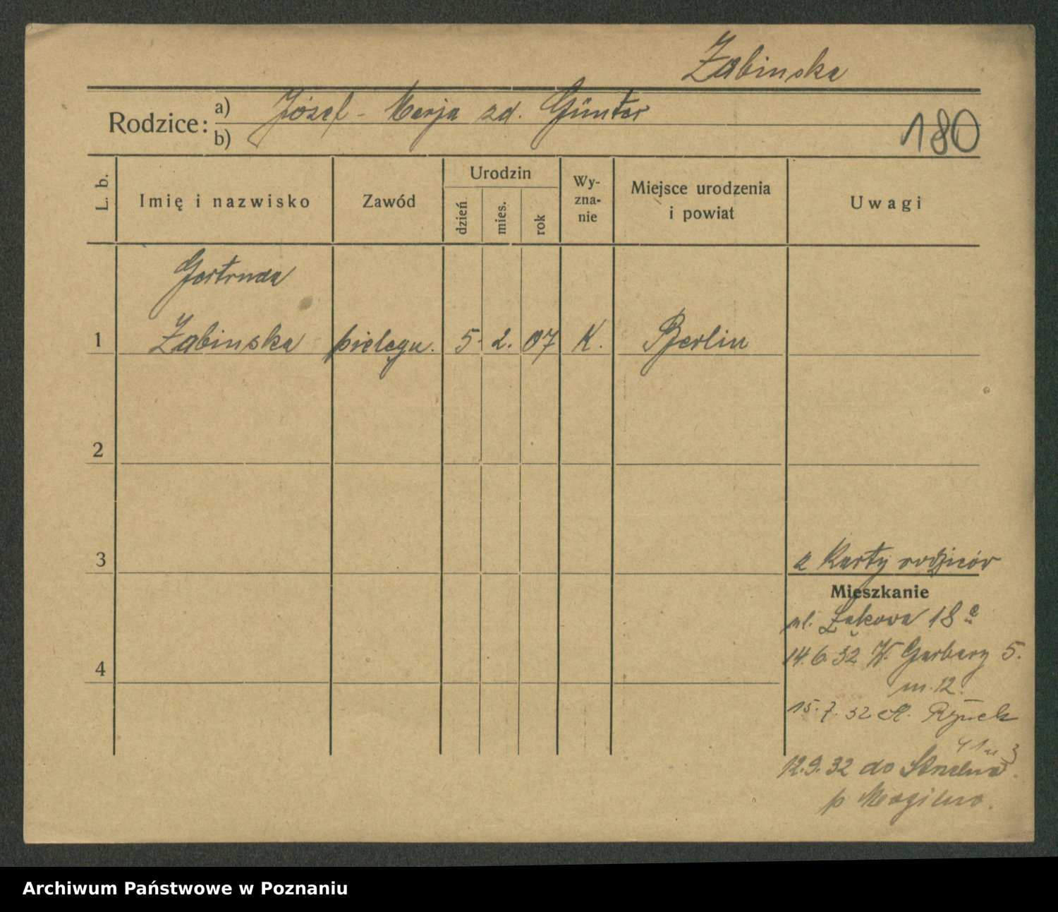 Podgląd karty osobowej dostępny jest po kliknięciu na nazwisko lub ikonkę karty. Można dokonywać powiększenia (ikony na górze) lub przechodzić między kolejnymi skanami (strzałki po bokach).