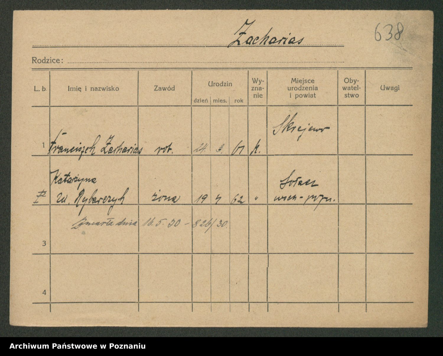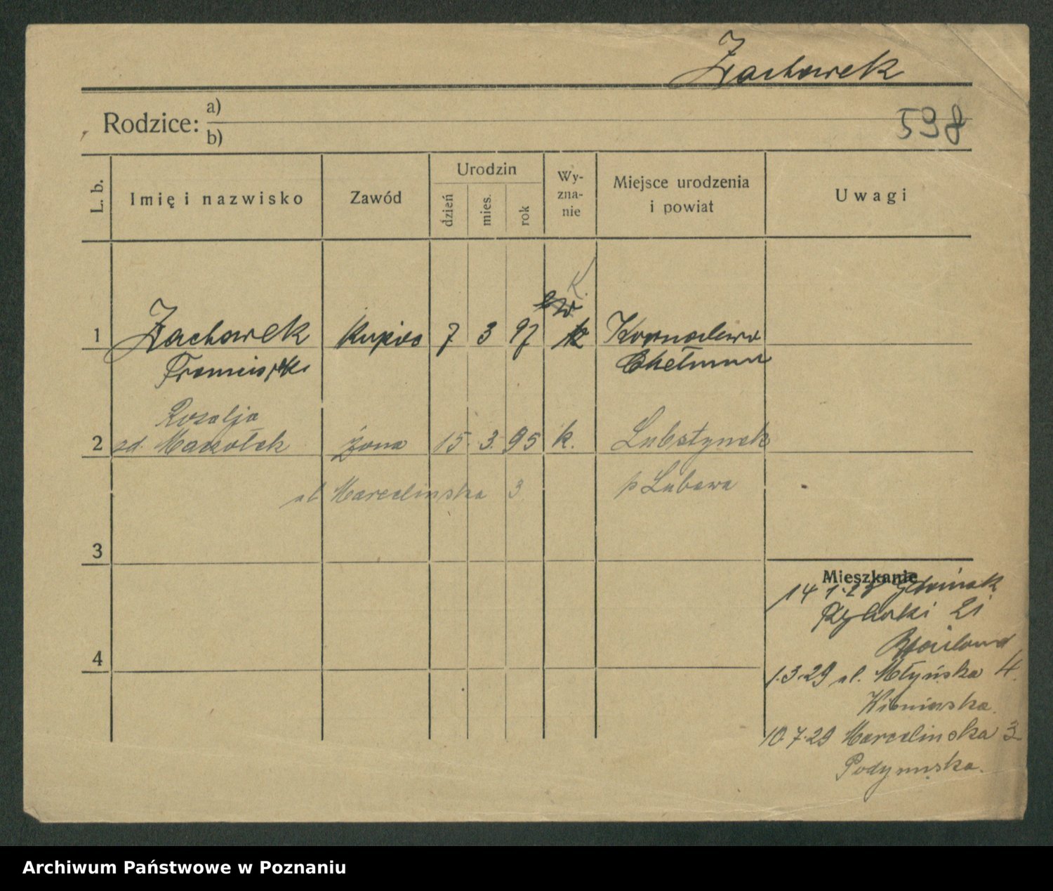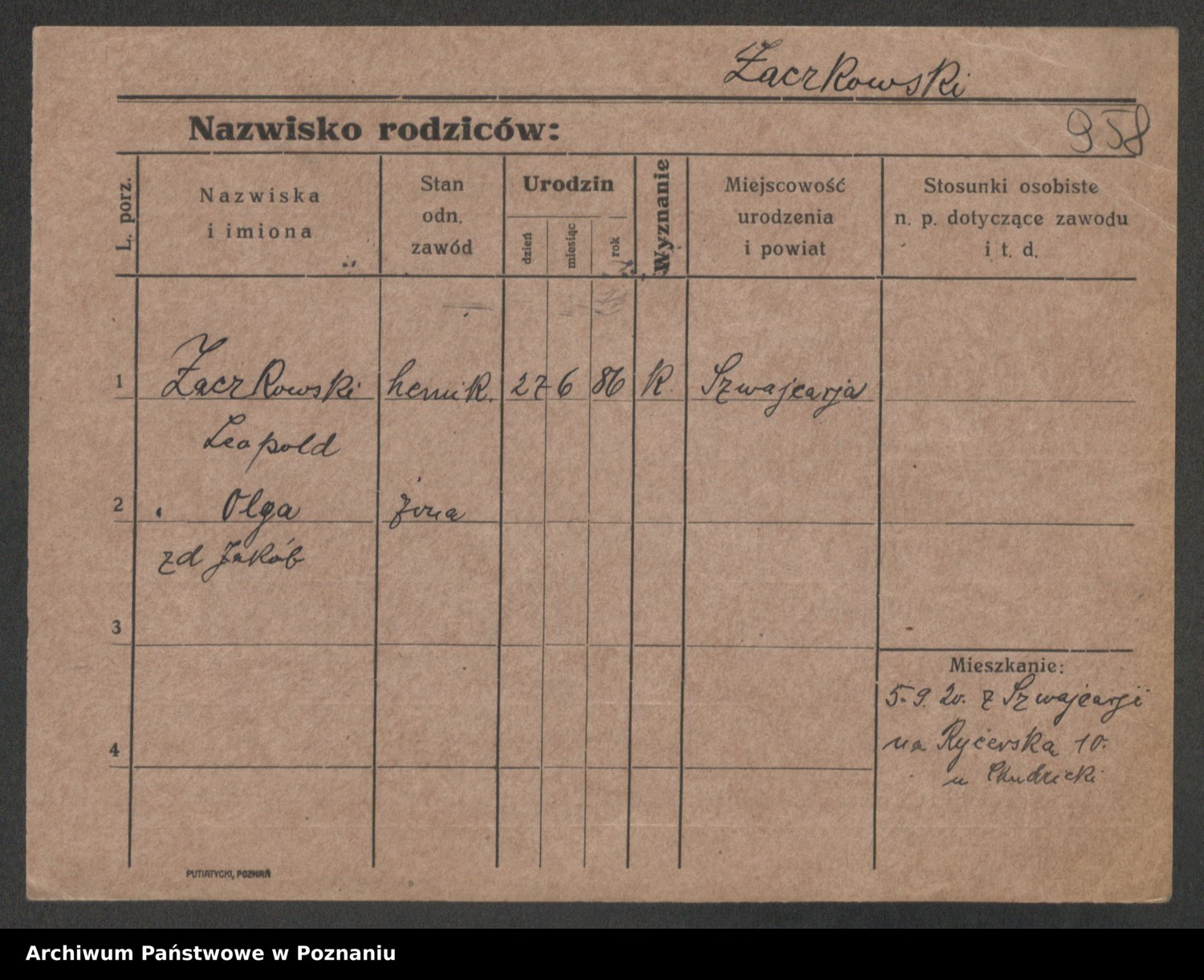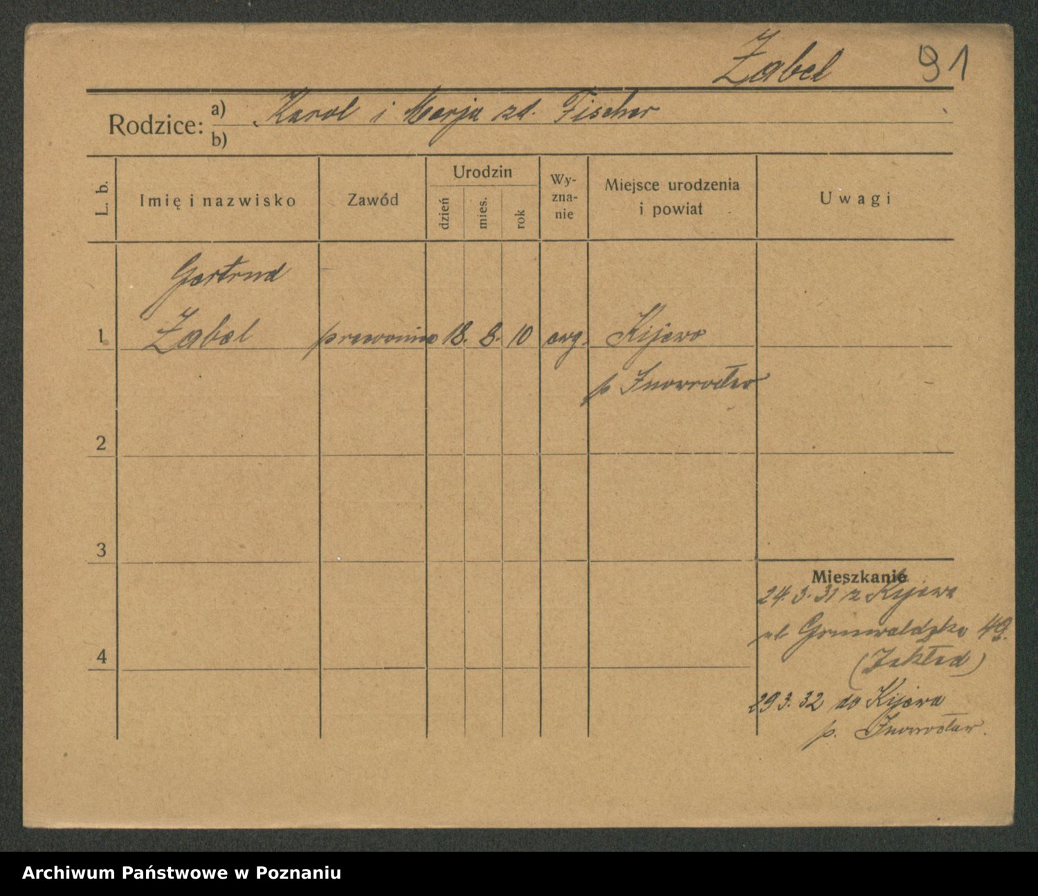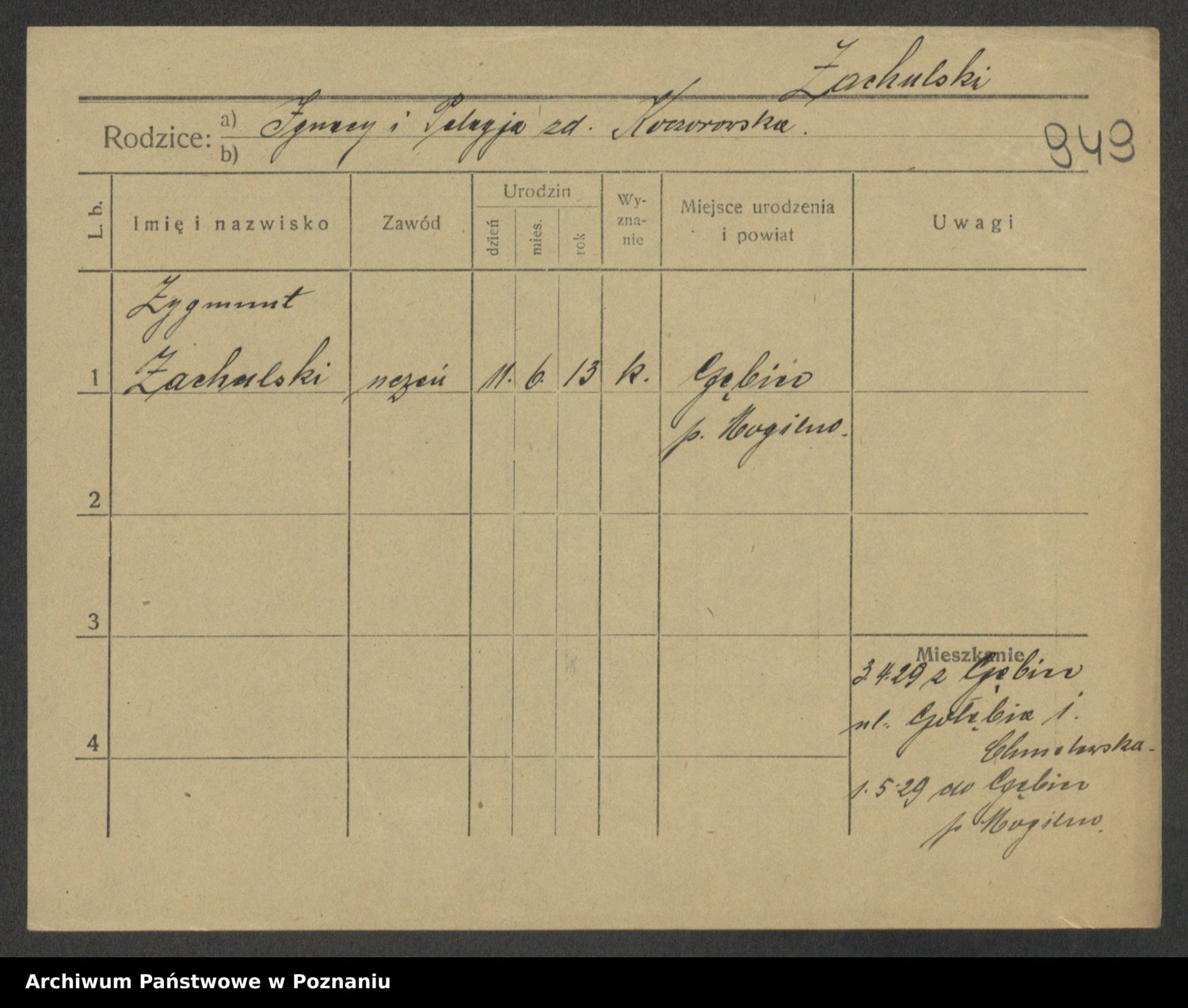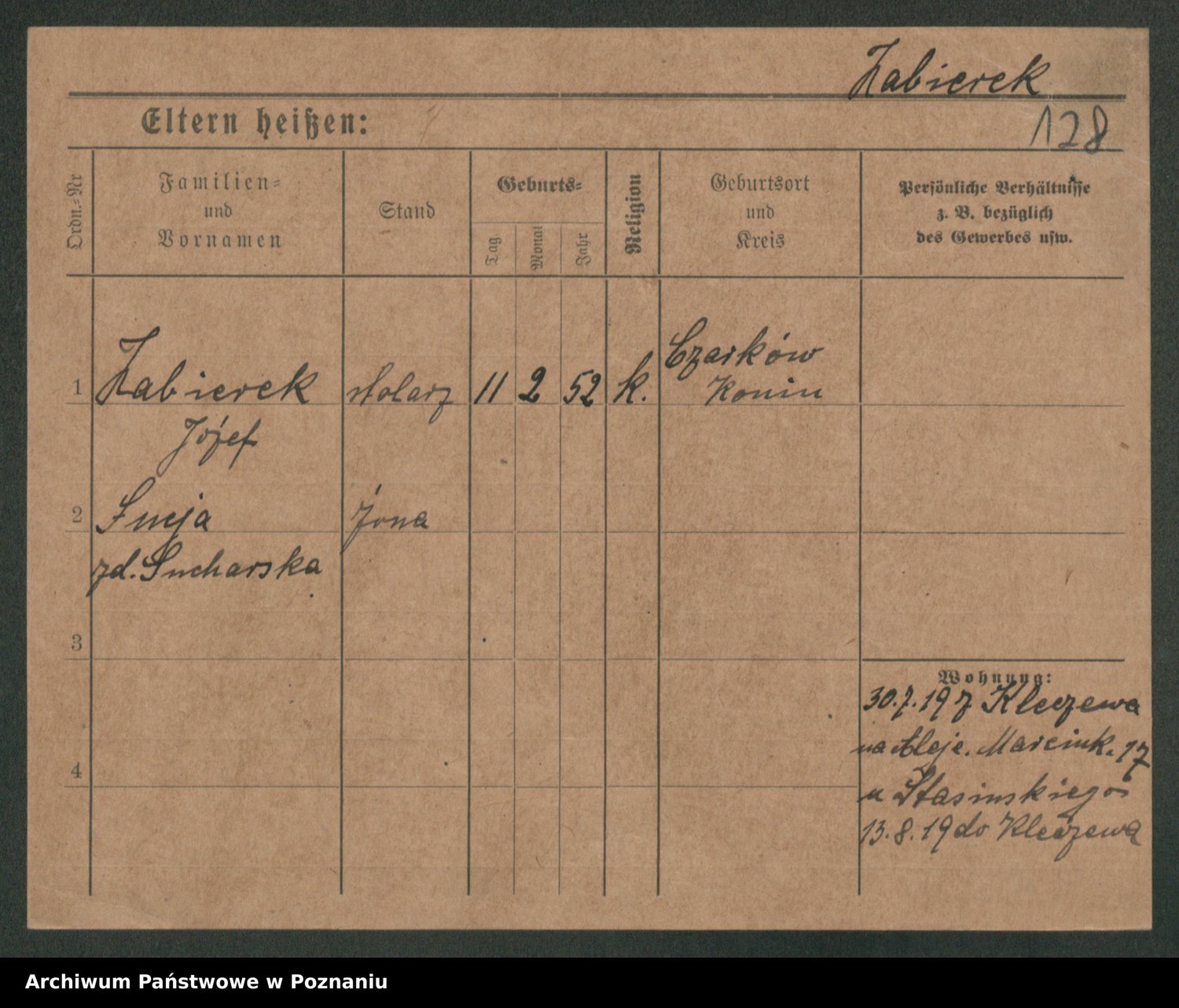 Podgląd karty osobowej dostępny jest po kliknięciu na nazwisko lub ikonkę karty. Można dokonywać powiększenia (ikony na górze) lub przechodzić między kolejnymi skanami (strzałki po bokach).