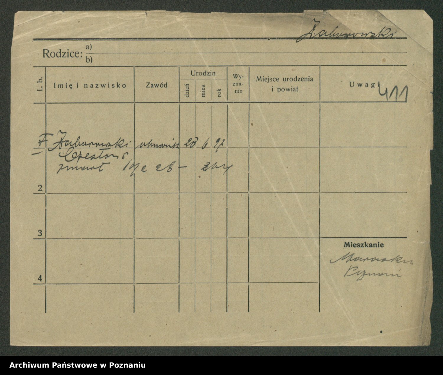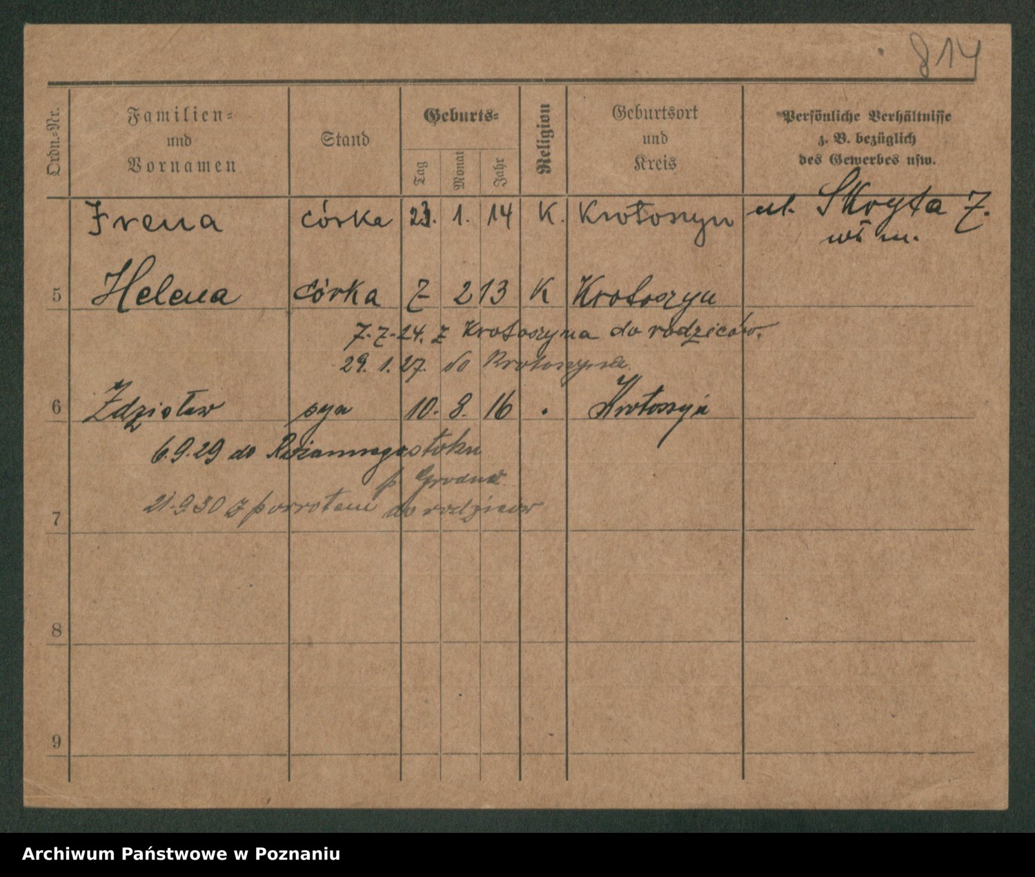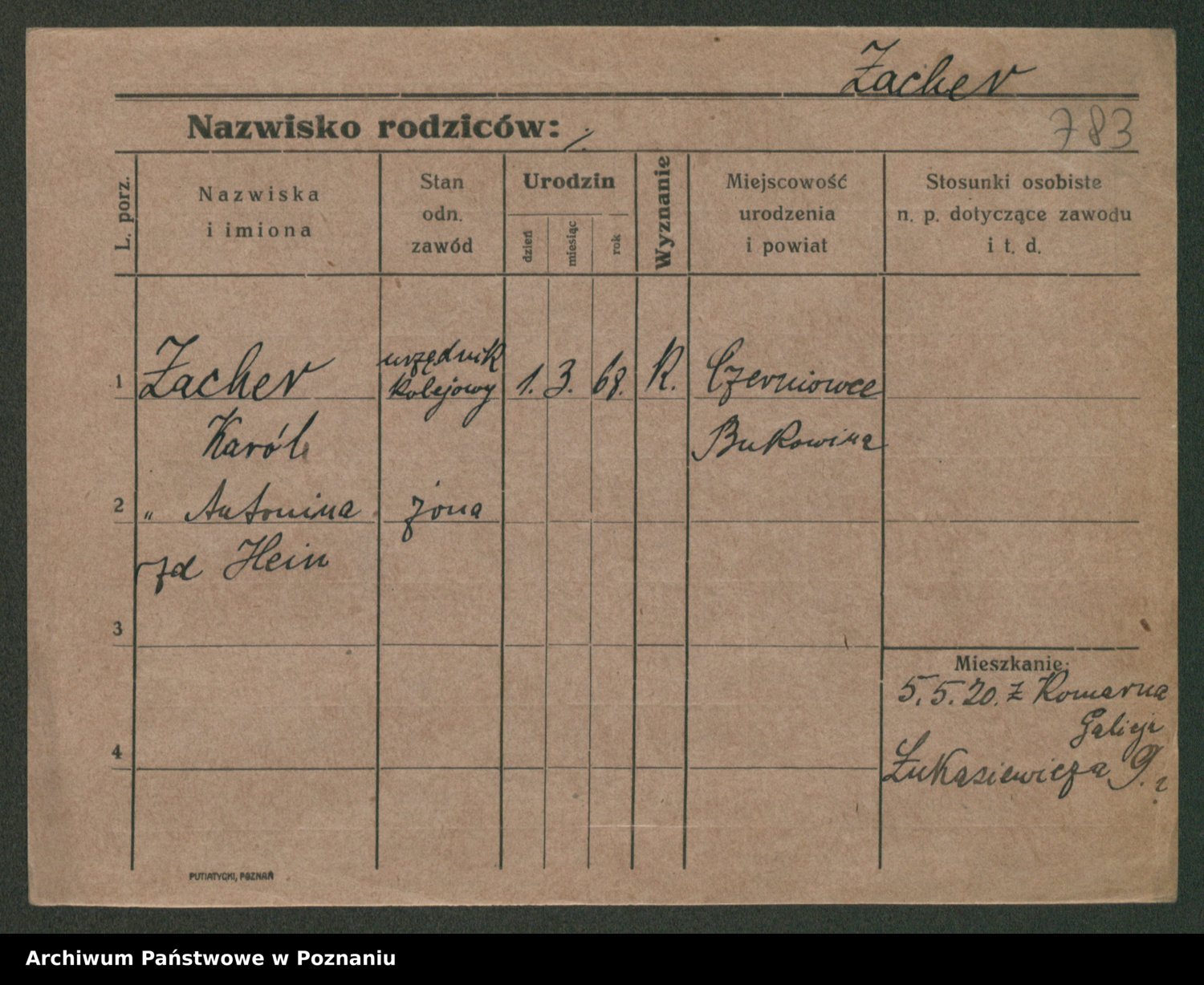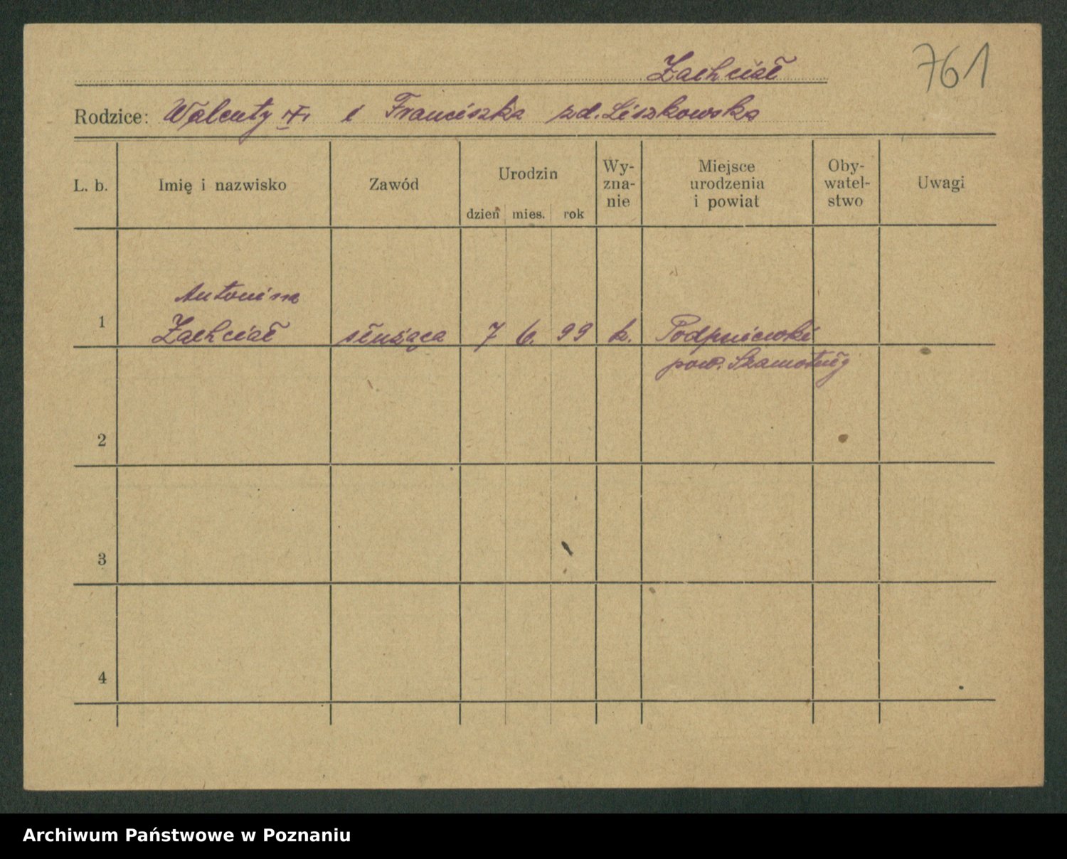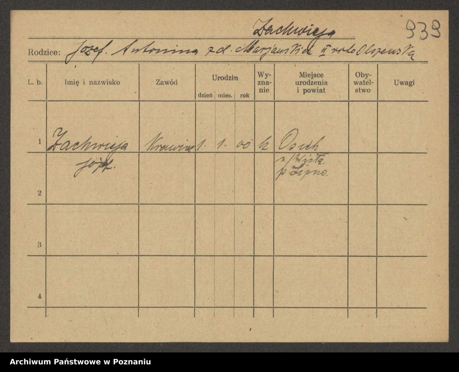 Podgląd karty osobowej dostępny jest po kliknięciu na nazwisko lub ikonkę karty. Można dokonywać powiększenia (ikony na górze) lub przechodzić między kolejnymi skanami (strzałki po bokach).