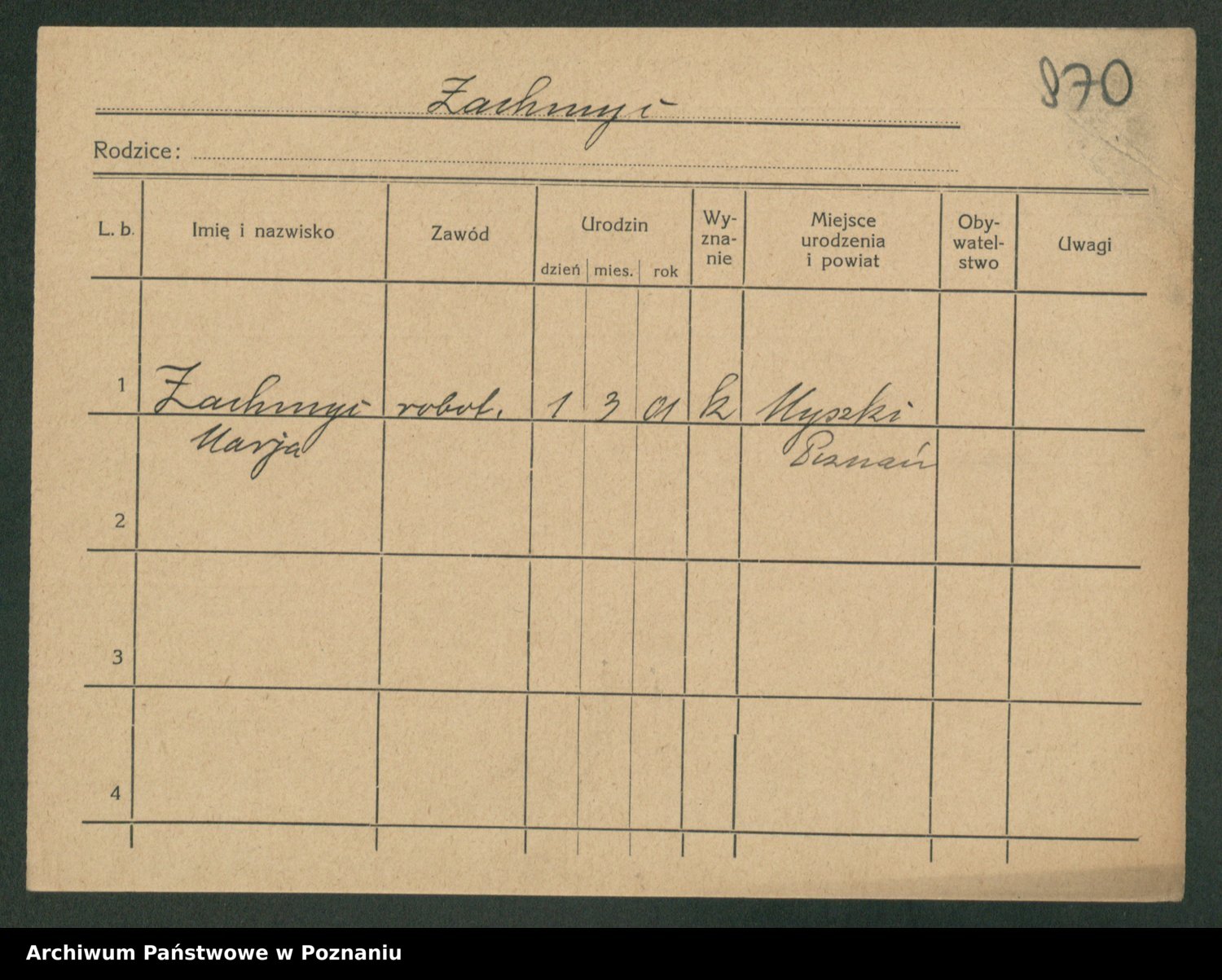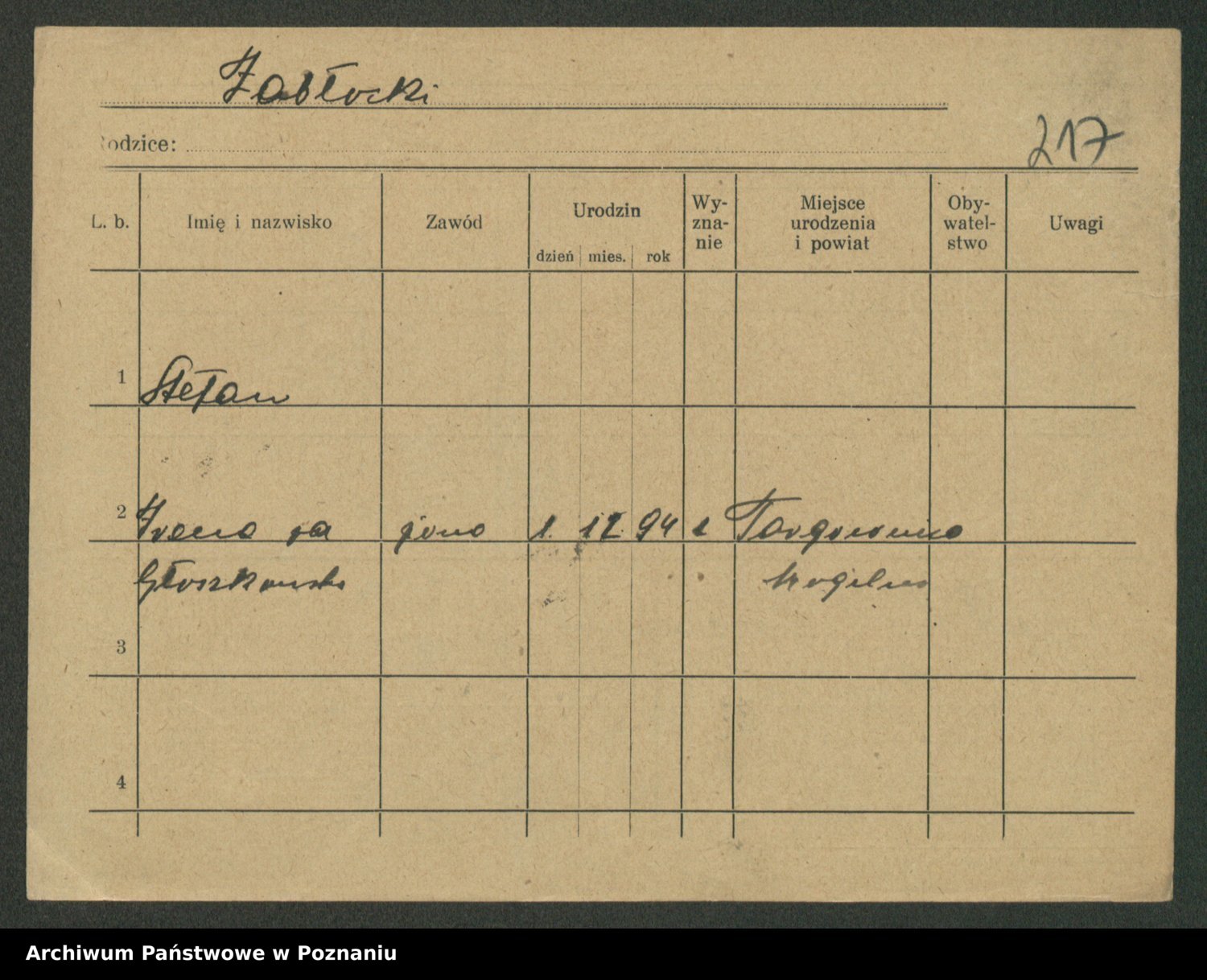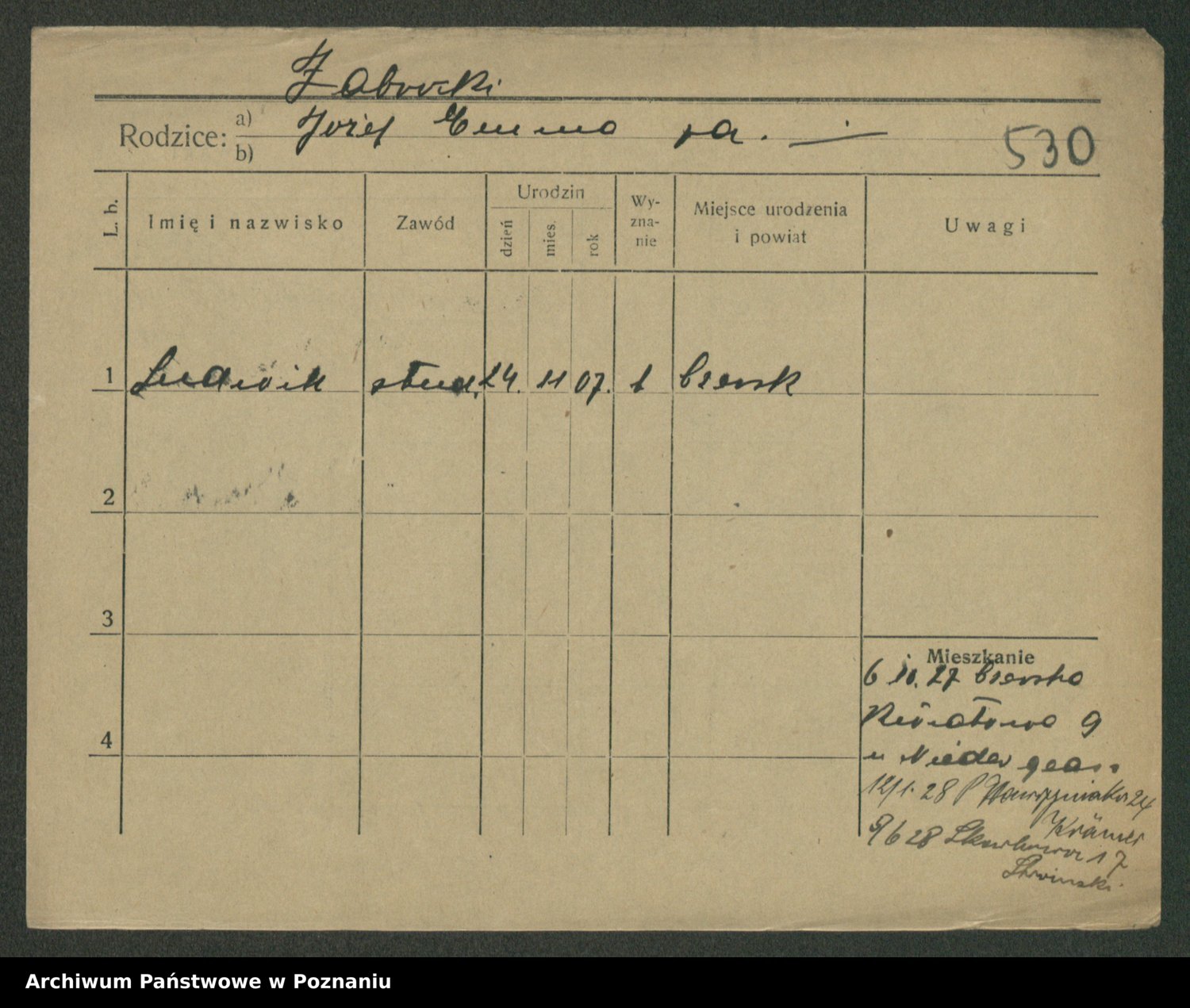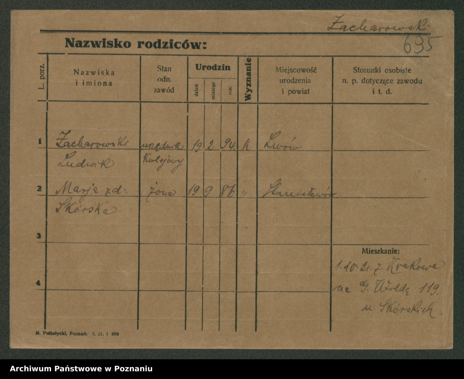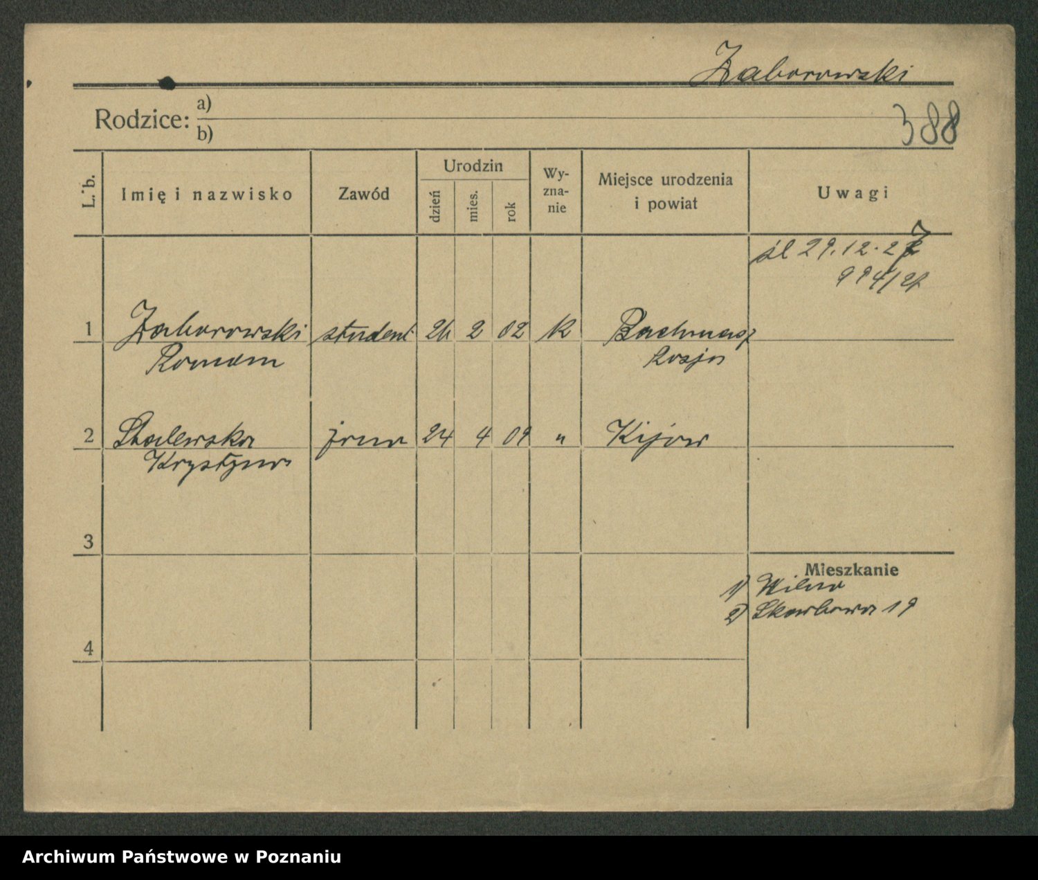 Podgląd karty osobowej dostępny jest po kliknięciu na nazwisko lub ikonkę karty. Można dokonywać powiększenia (ikony na górze) lub przechodzić między kolejnymi skanami (strzałki po bokach).