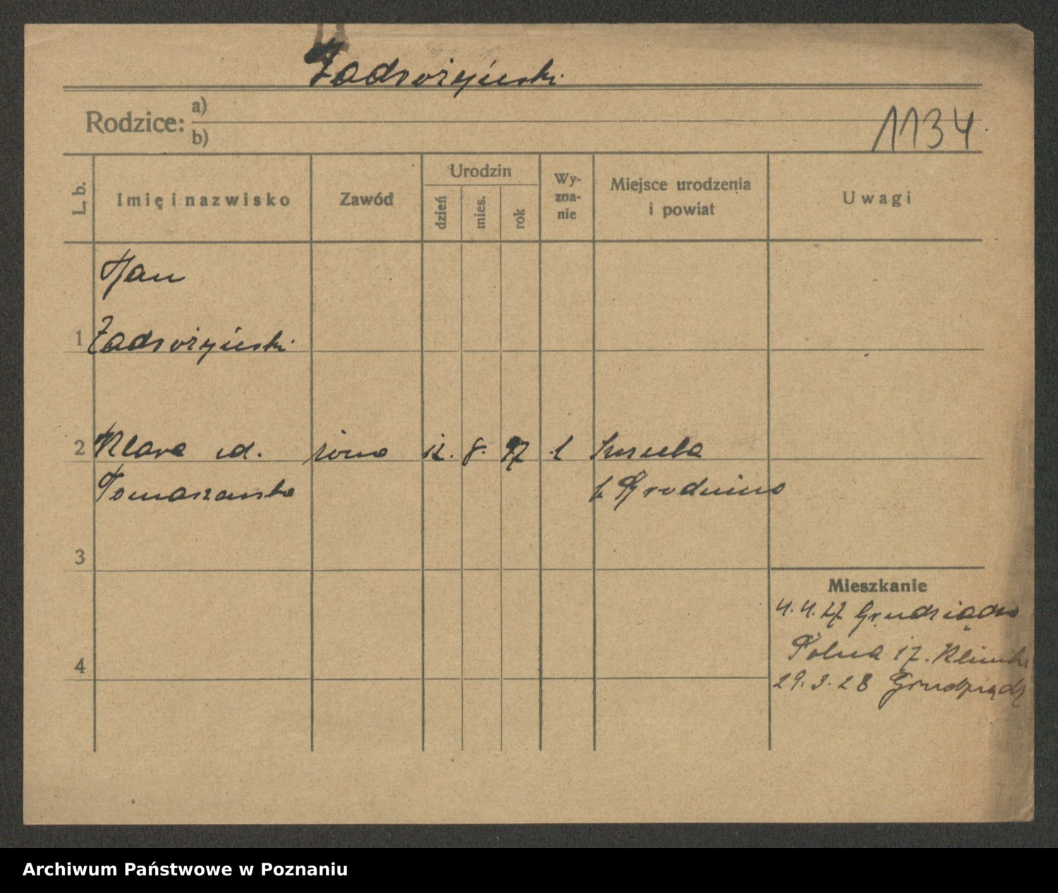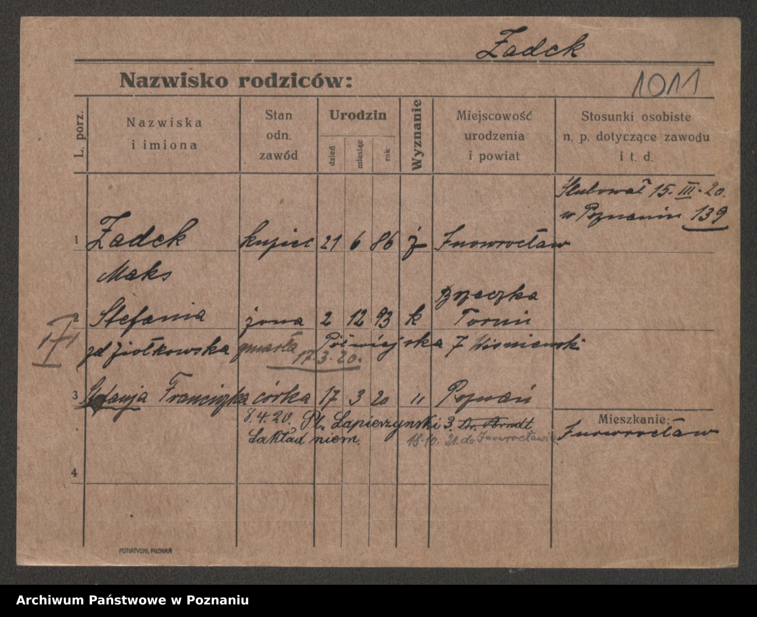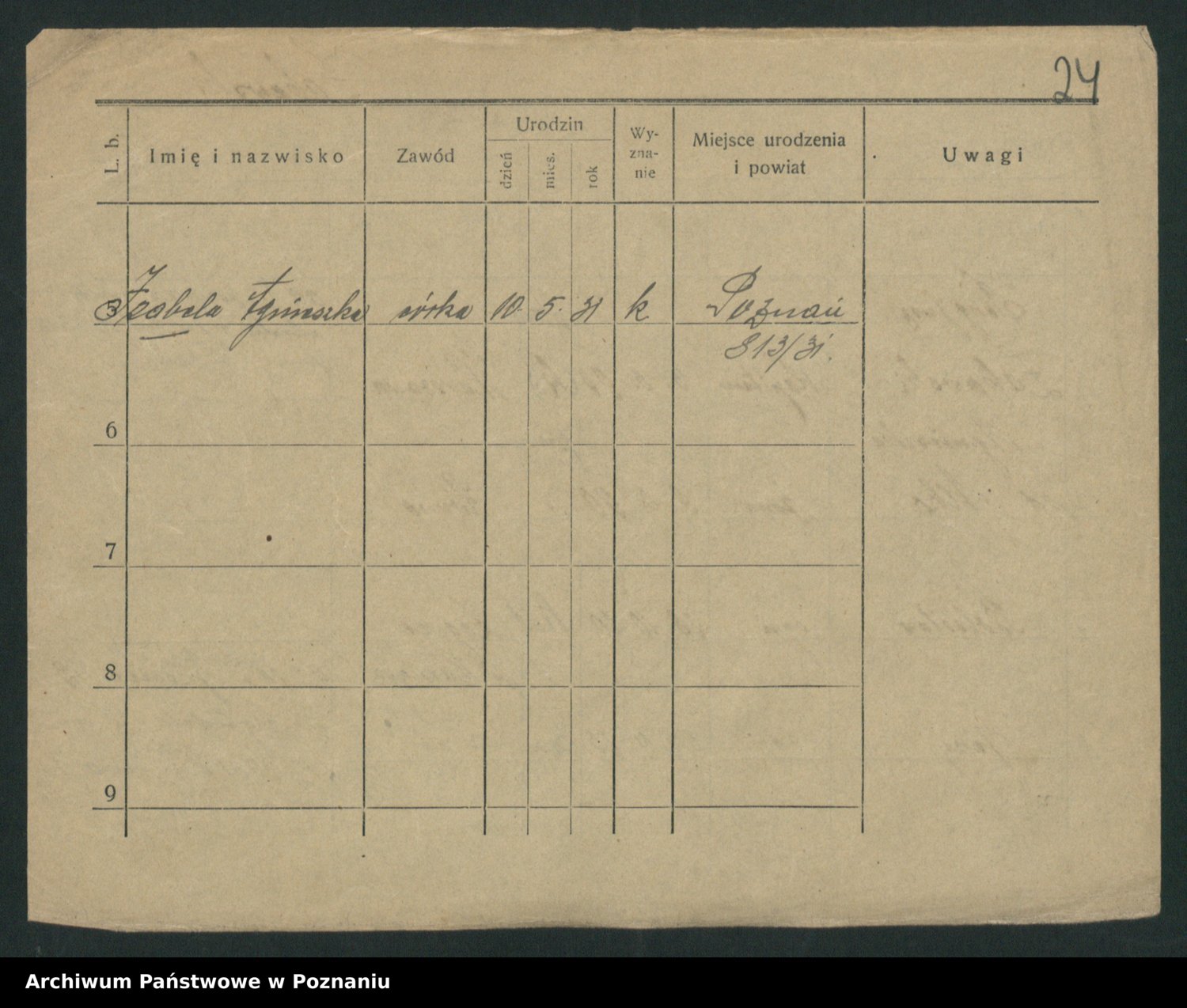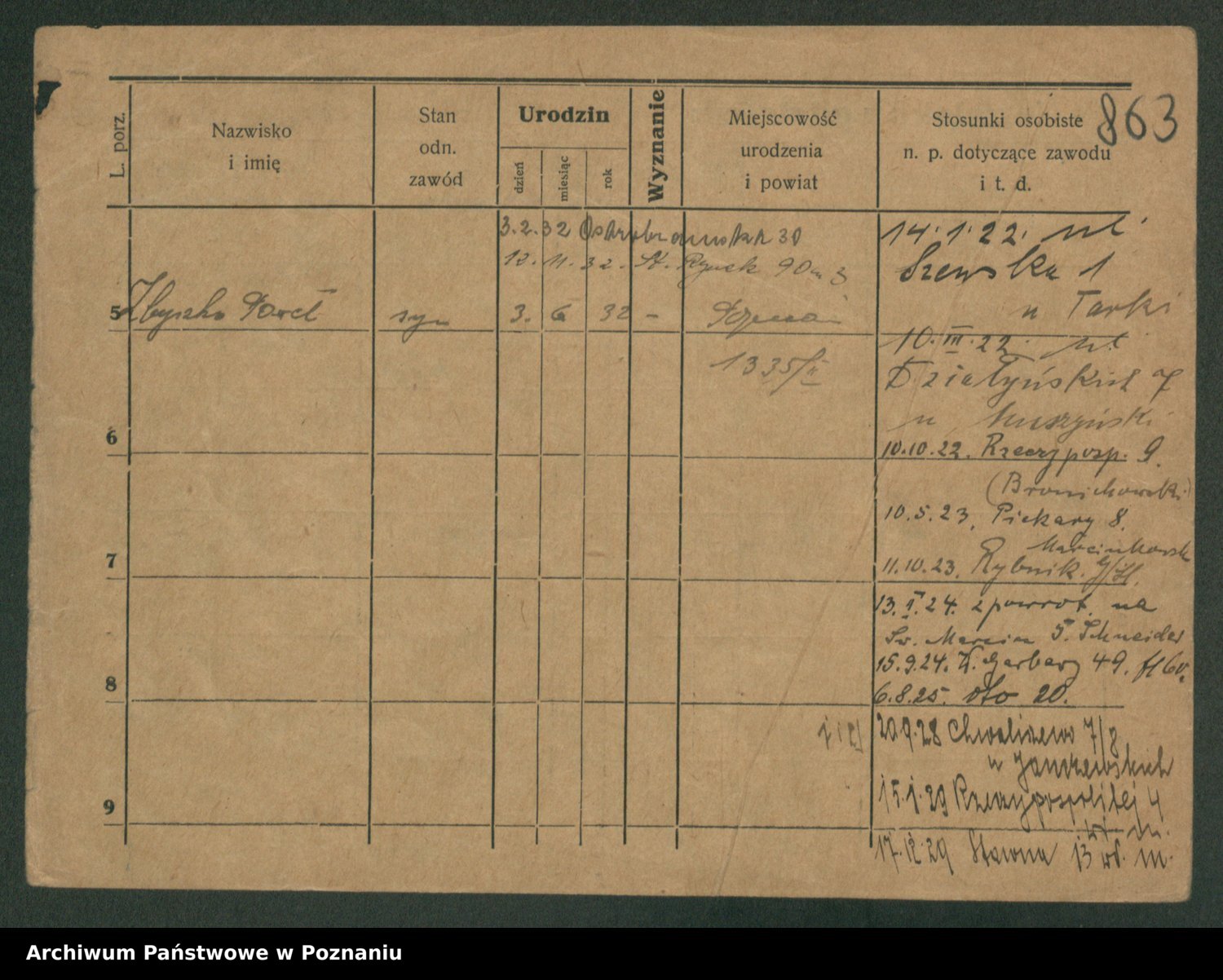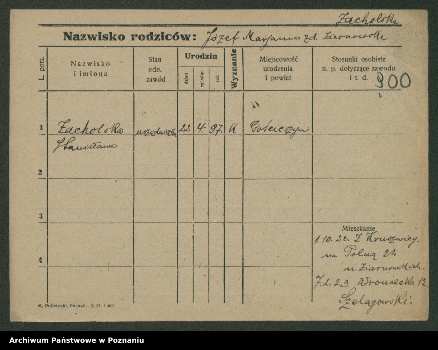 Podgląd karty osobowej dostępny jest po kliknięciu na nazwisko lub ikonkę karty. Można dokonywać powiększenia (ikony na górze) lub przechodzić między kolejnymi skanami (strzałki po bokach).