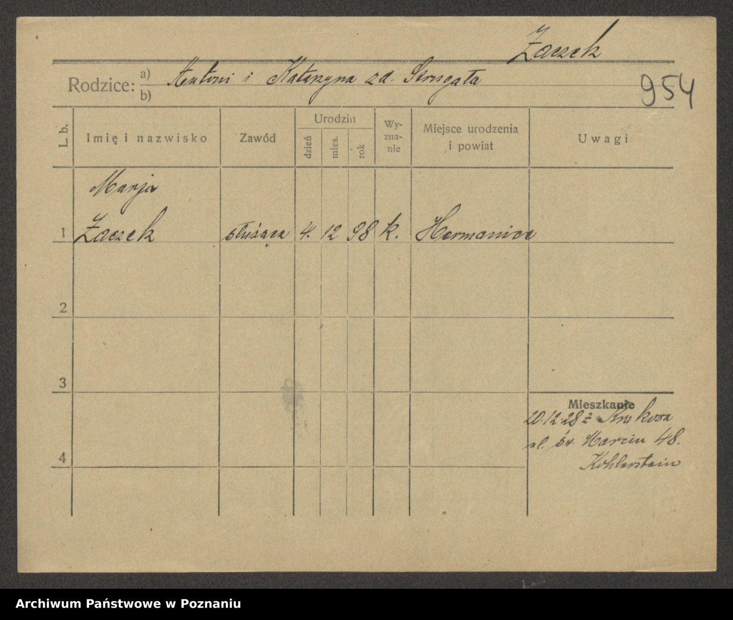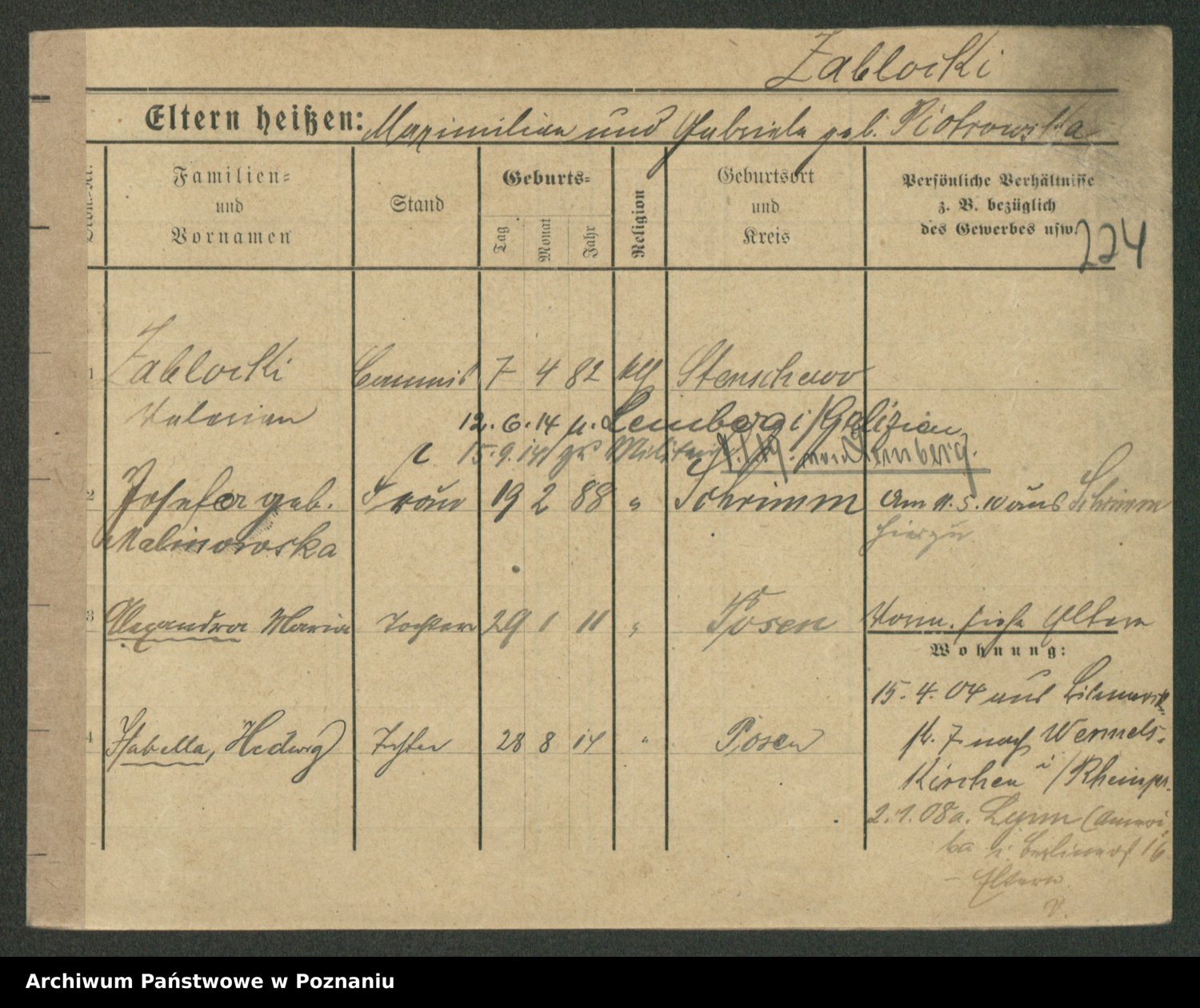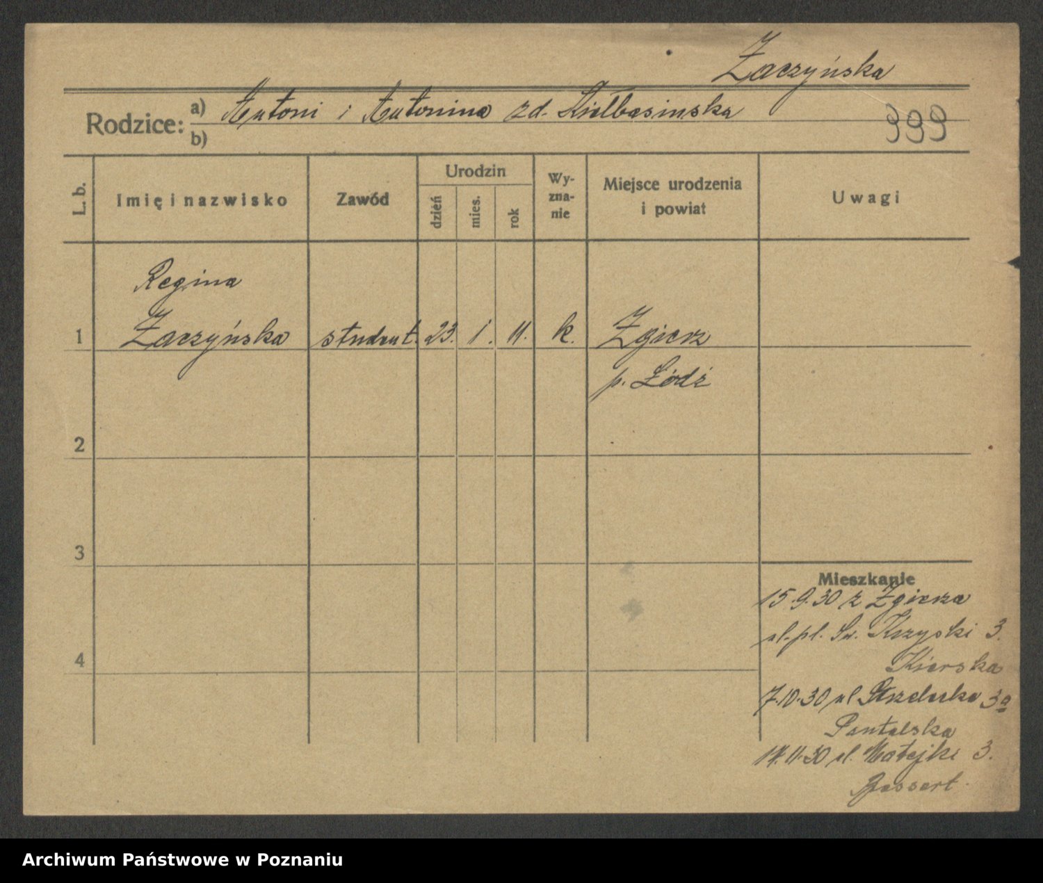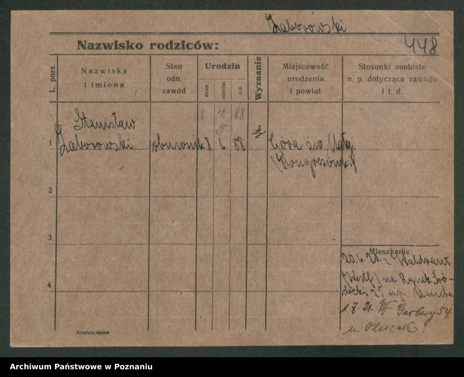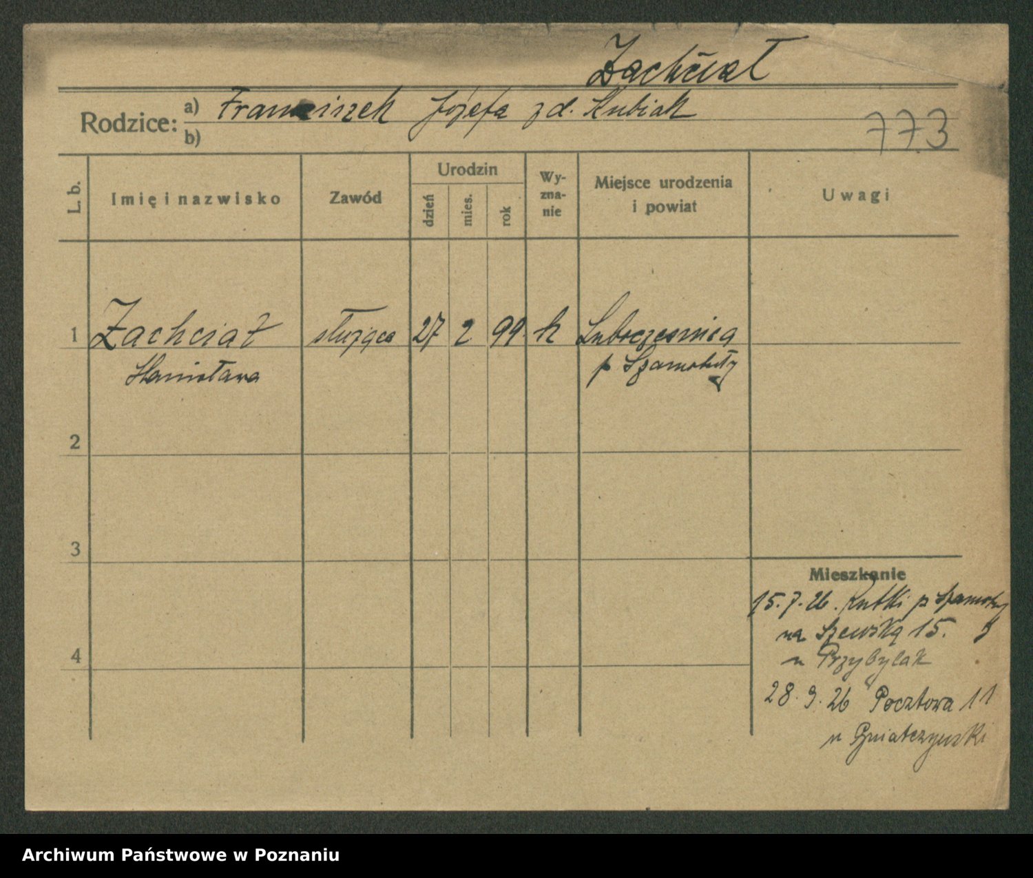 Podgląd karty osobowej dostępny jest po kliknięciu na nazwisko lub ikonkę karty. Można dokonywać powiększenia (ikony na górze) lub przechodzić między kolejnymi skanami (strzałki po bokach).