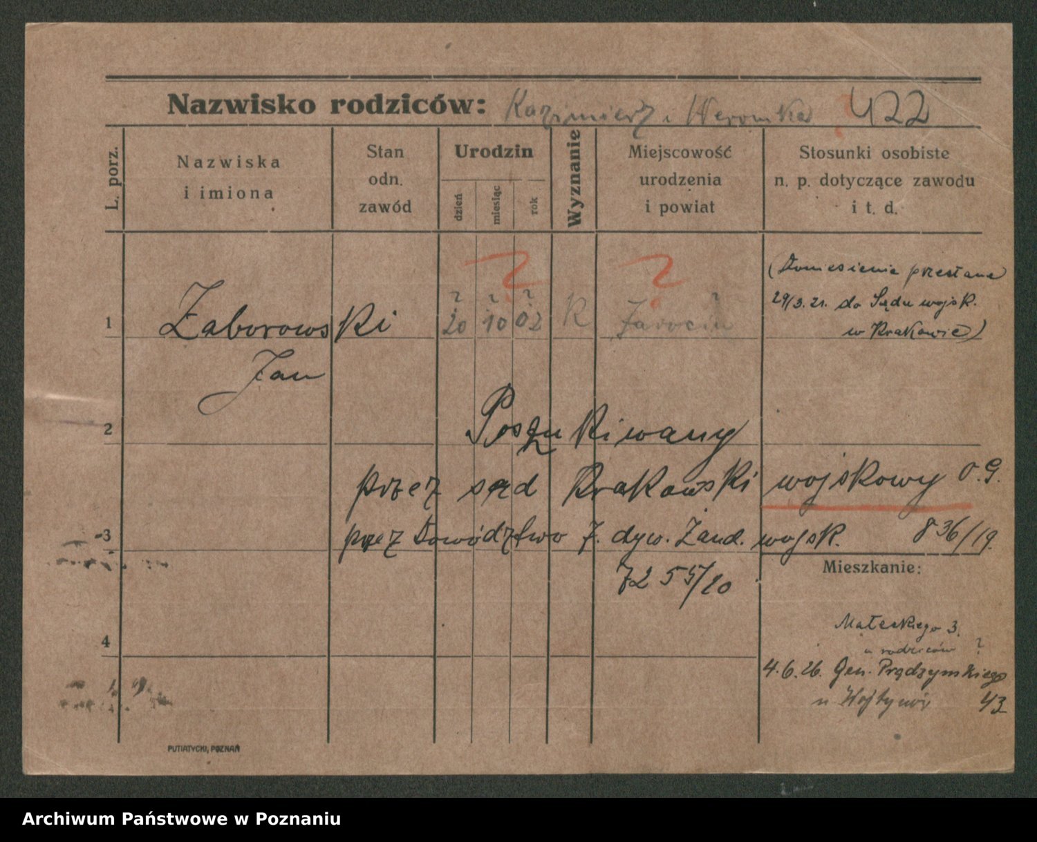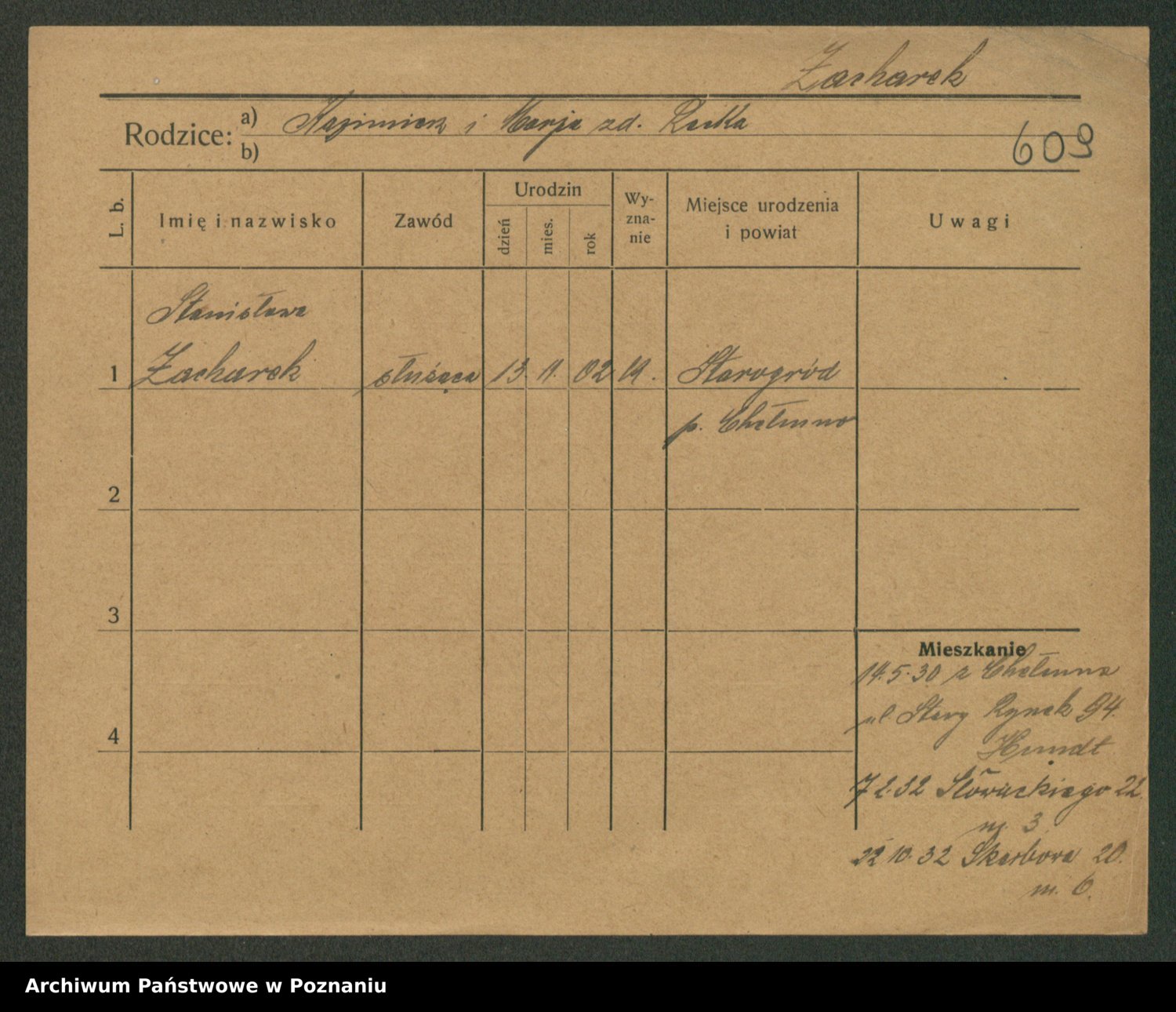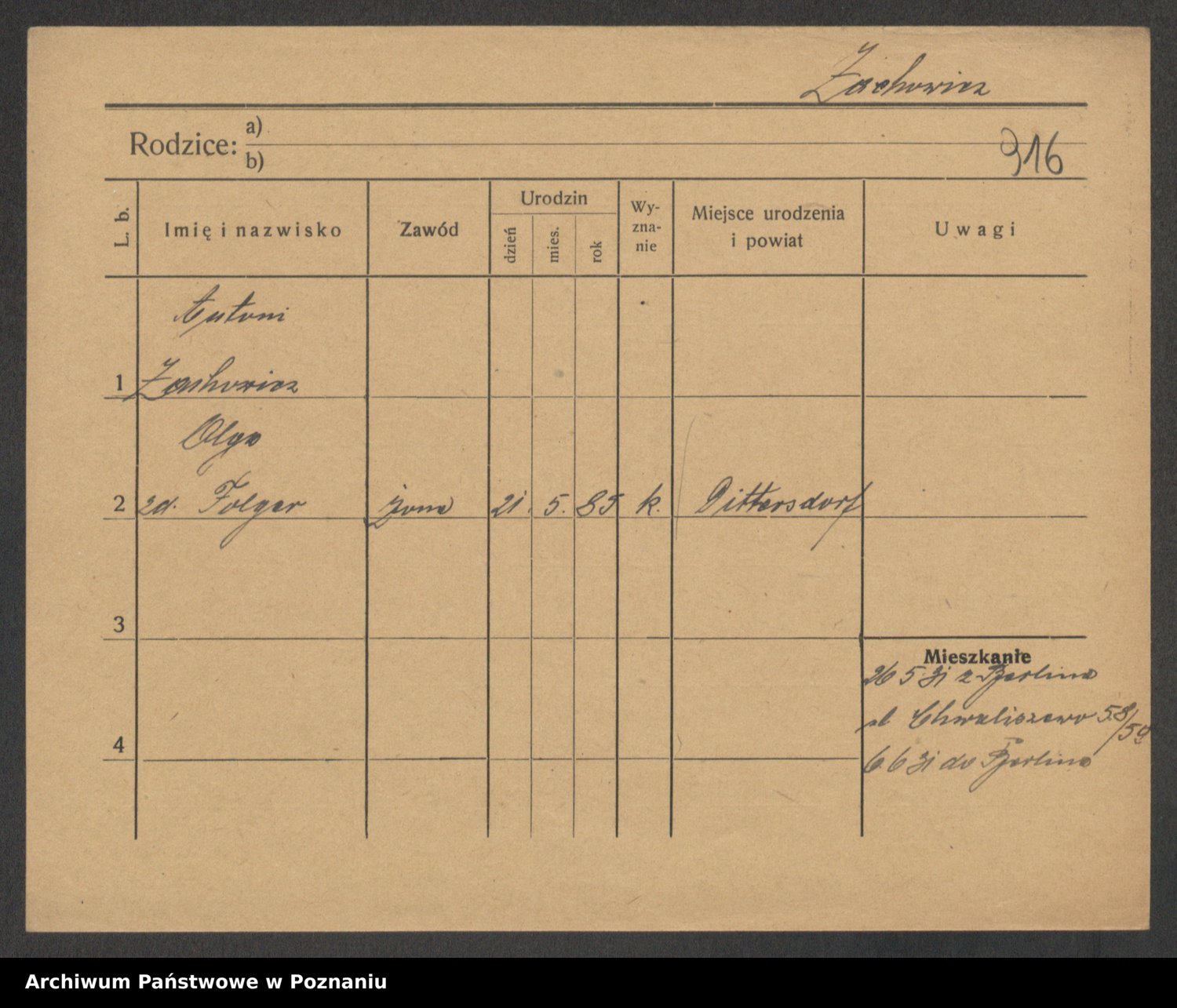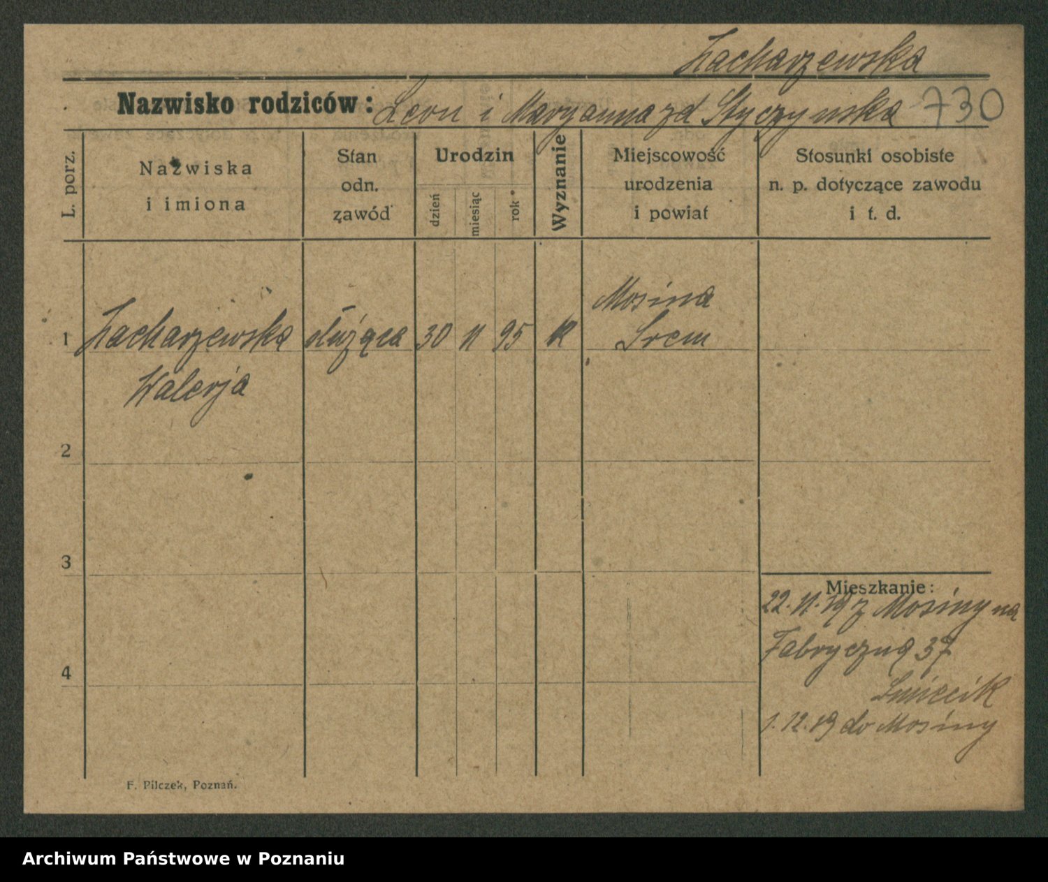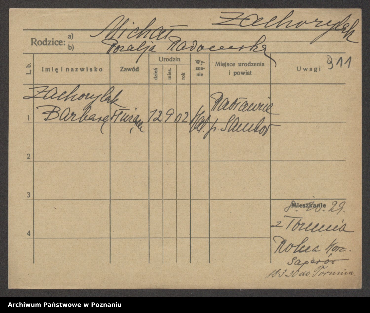 Podgląd karty osobowej dostępny jest po kliknięciu na nazwisko lub ikonkę karty. Można dokonywać powiększenia (ikony na górze) lub przechodzić między kolejnymi skanami (strzałki po bokach).
