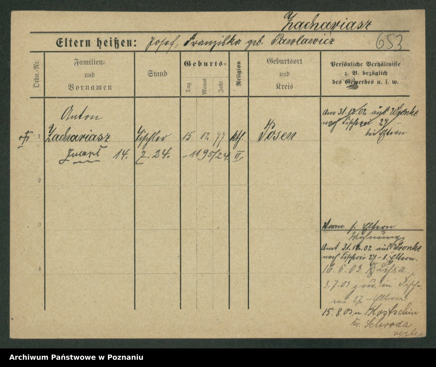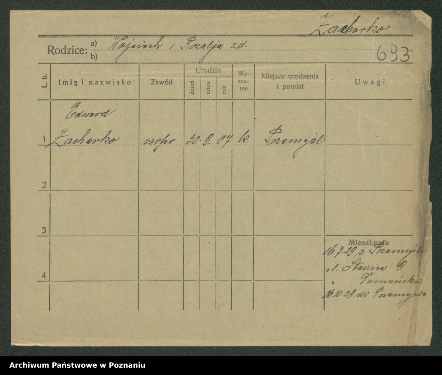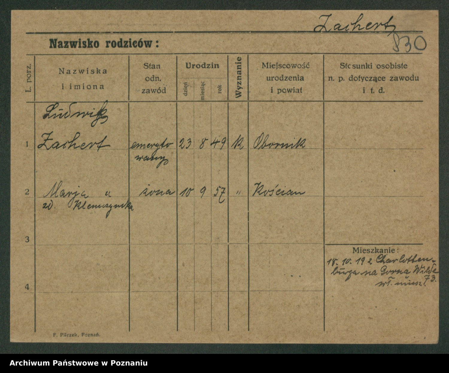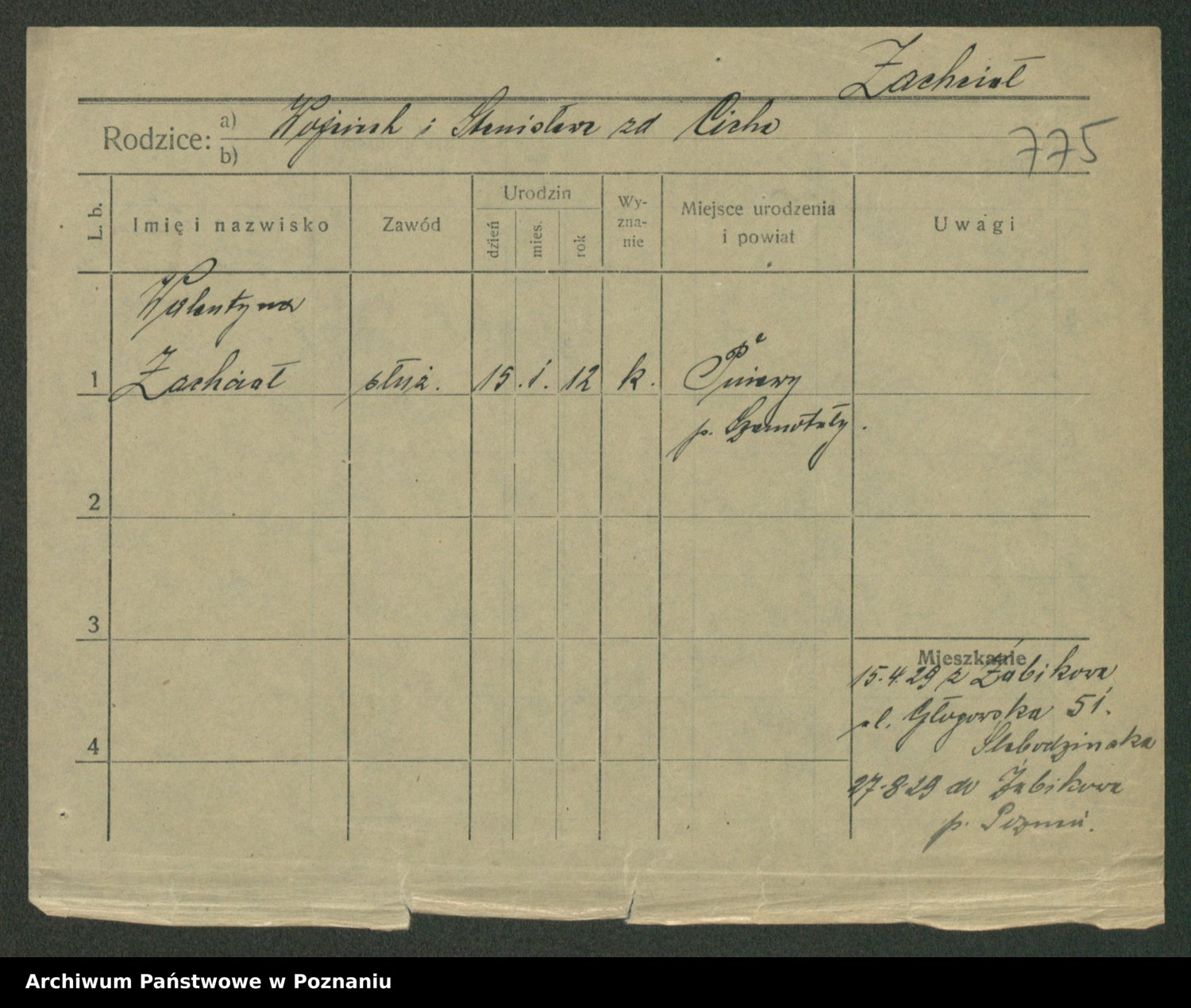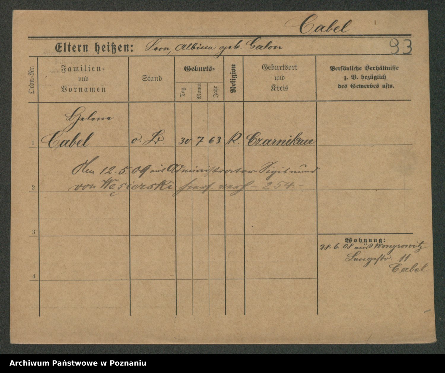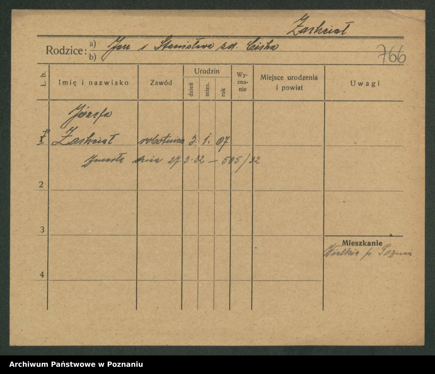 Podgląd karty osobowej dostępny jest po kliknięciu na nazwisko lub ikonkę karty. Można dokonywać powiększenia (ikony na górze) lub przechodzić między kolejnymi skanami (strzałki po bokach).