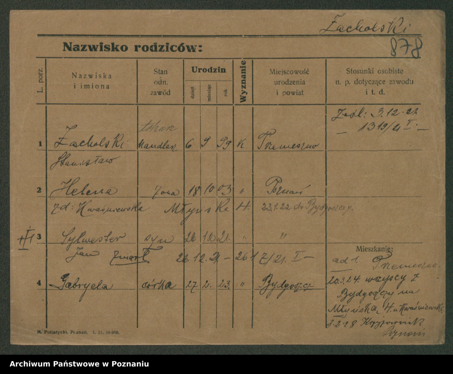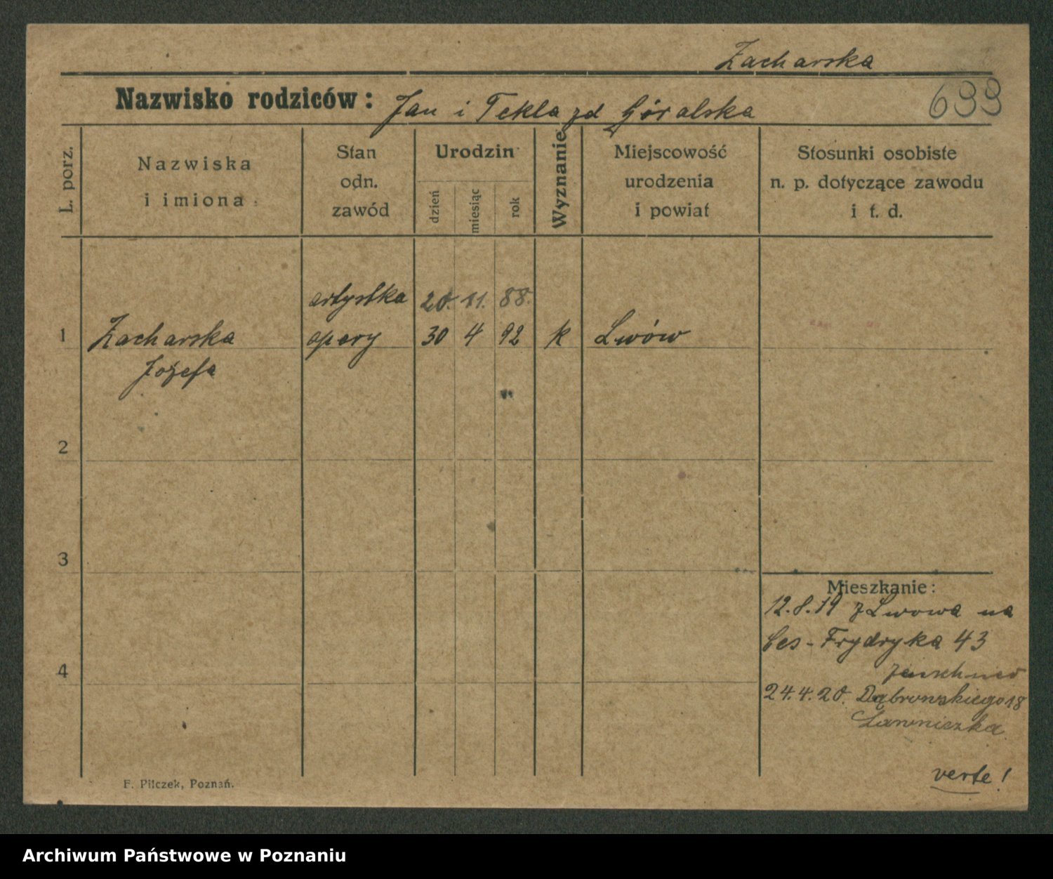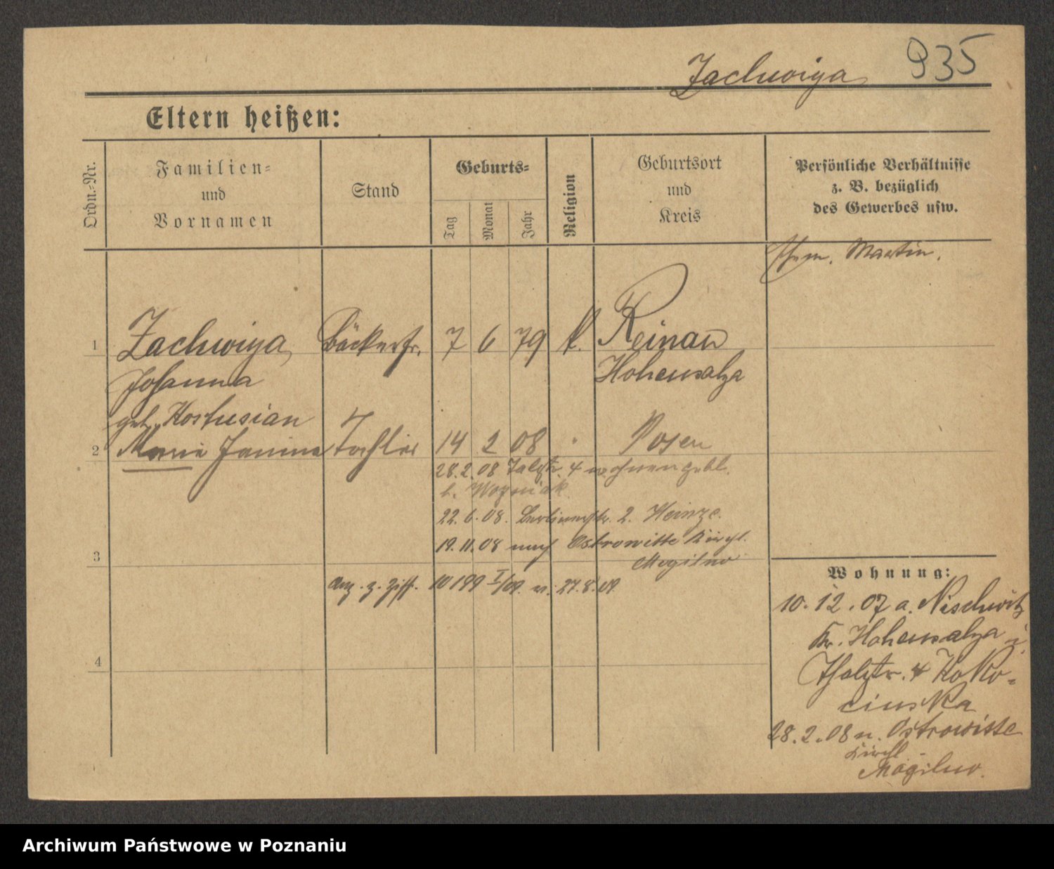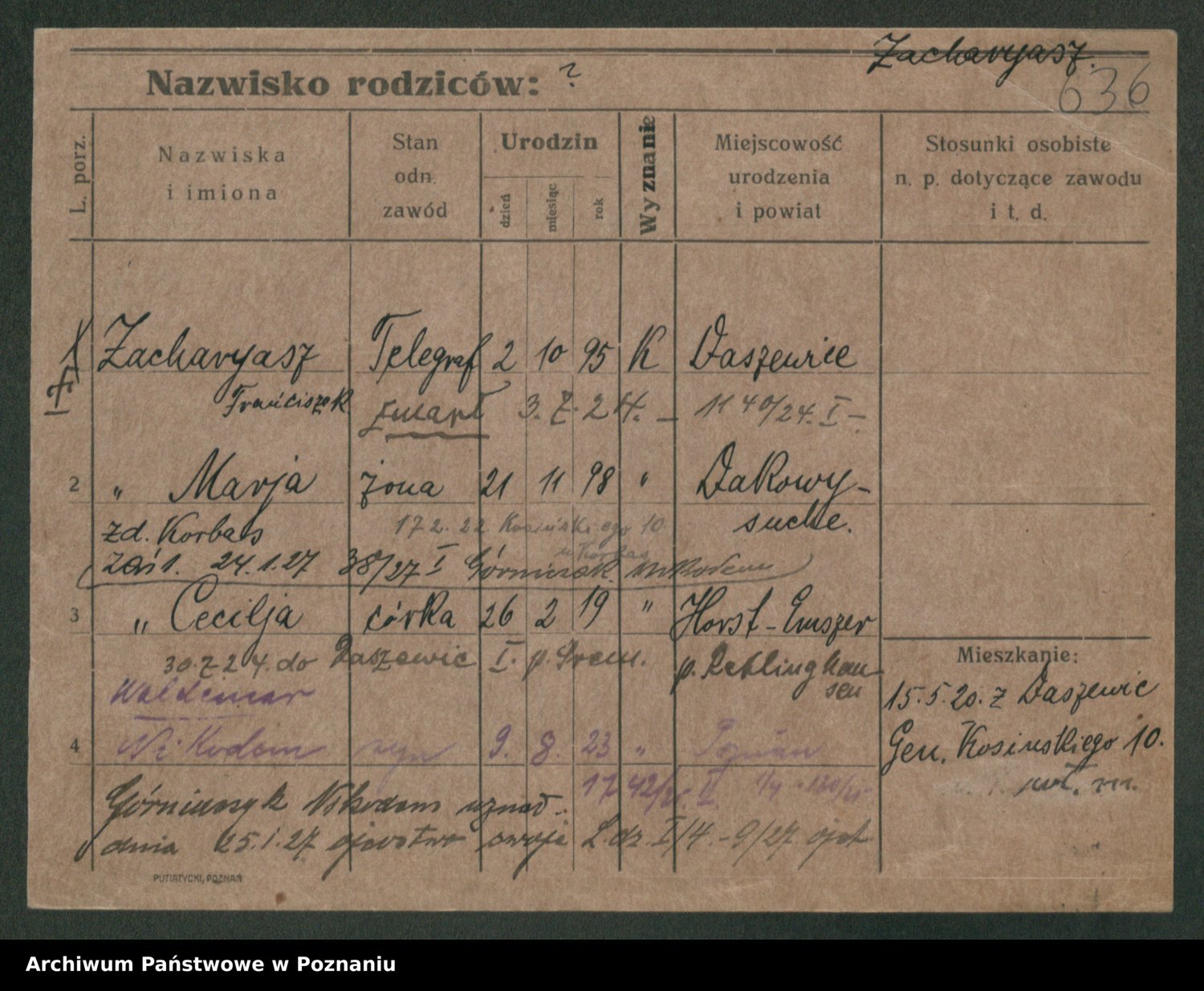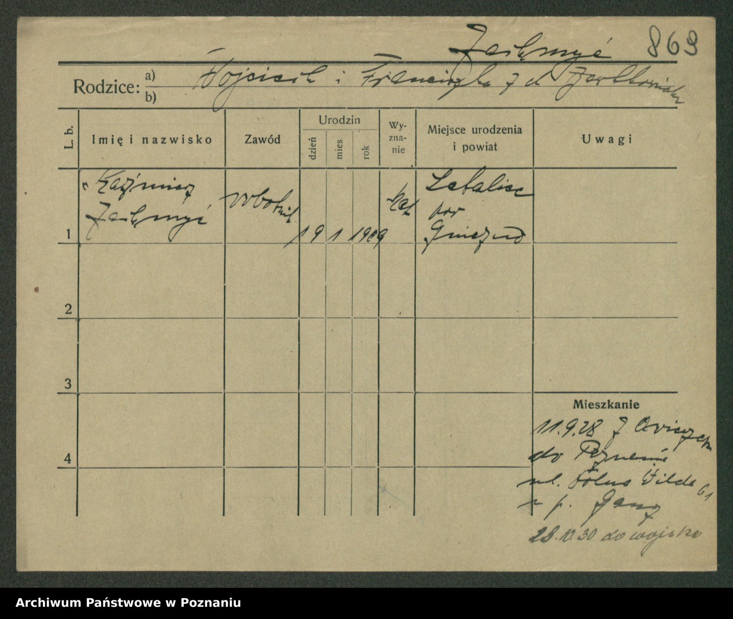 Podgląd karty osobowej dostępny jest po kliknięciu na nazwisko lub ikonkę karty. Można dokonywać powiększenia (ikony na górze) lub przechodzić między kolejnymi skanami (strzałki po bokach).
