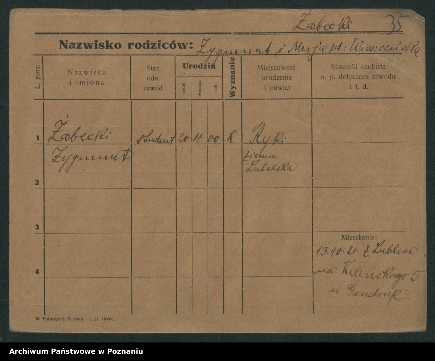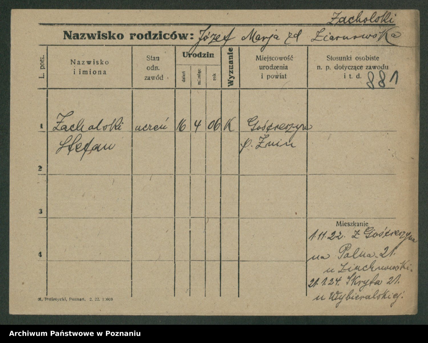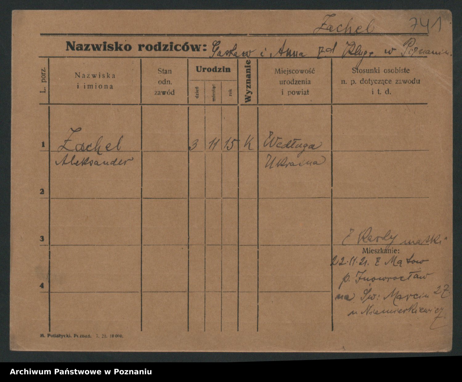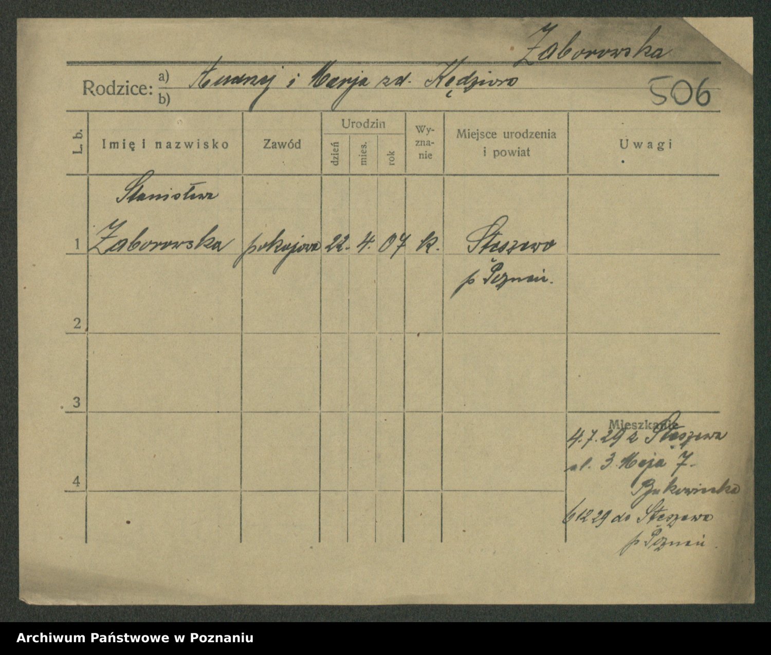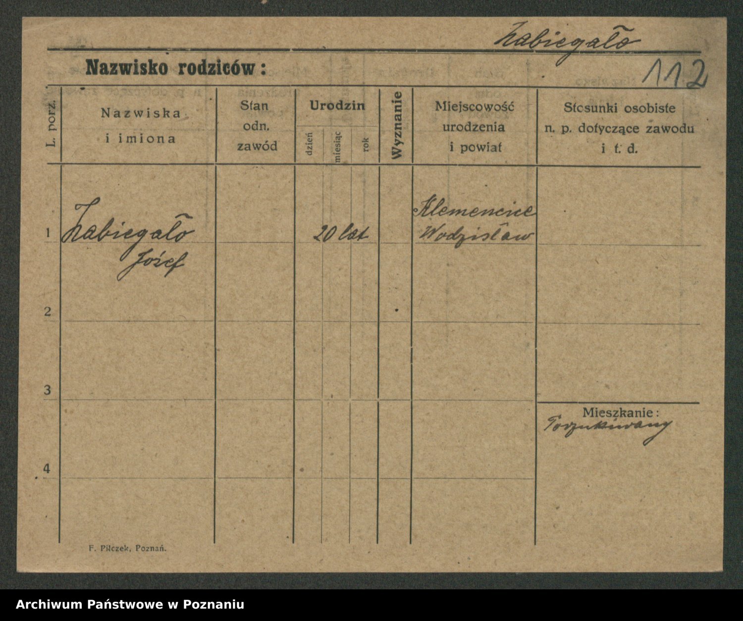 Podgląd karty osobowej dostępny jest po kliknięciu na nazwisko lub ikonkę karty. Można dokonywać powiększenia (ikony na górze) lub przechodzić między kolejnymi skanami (strzałki po bokach).