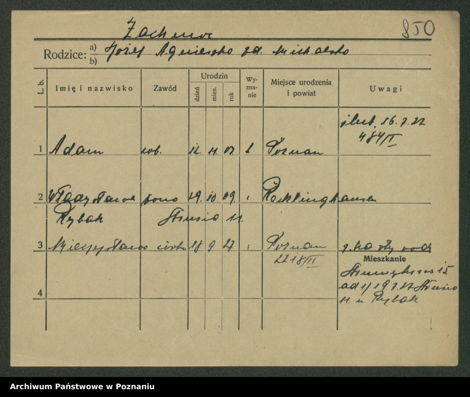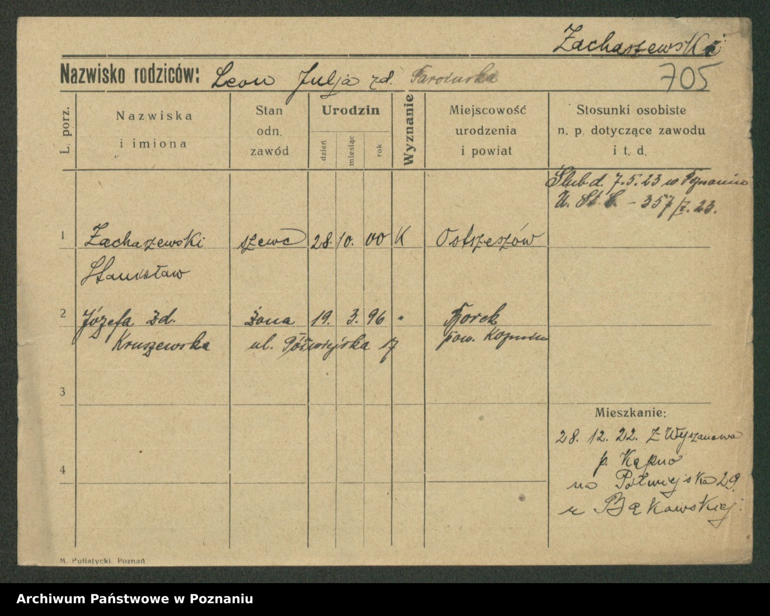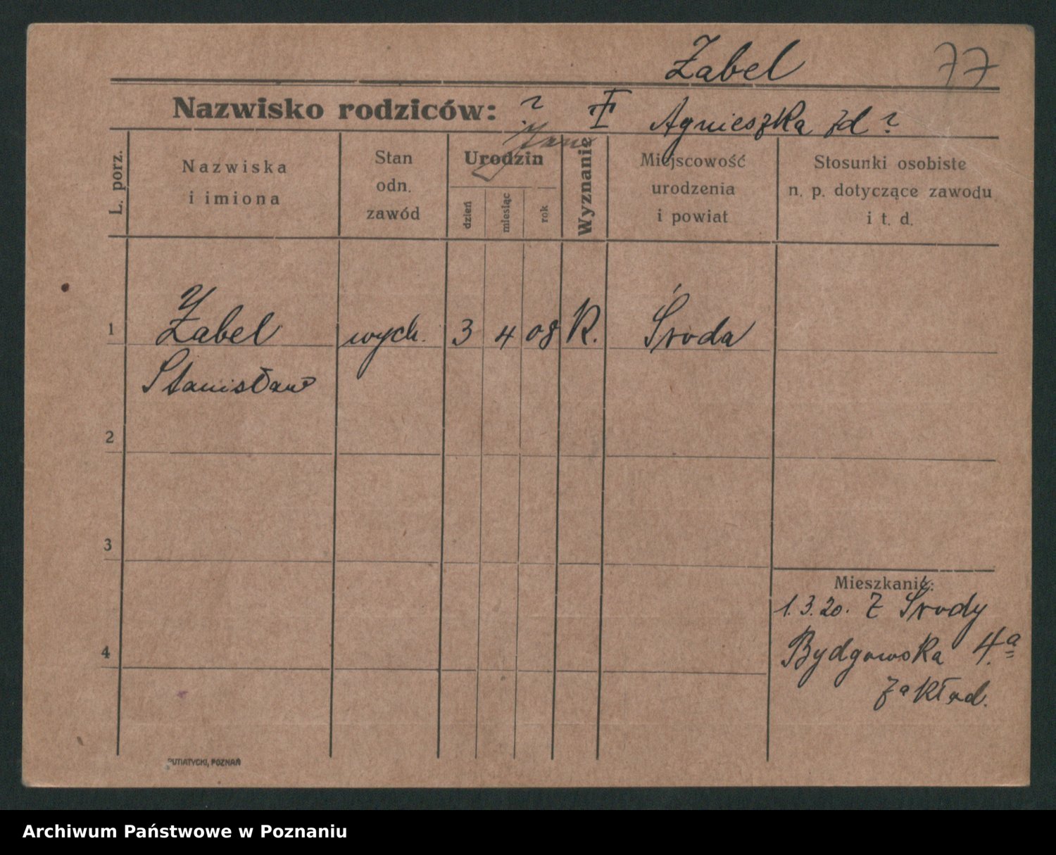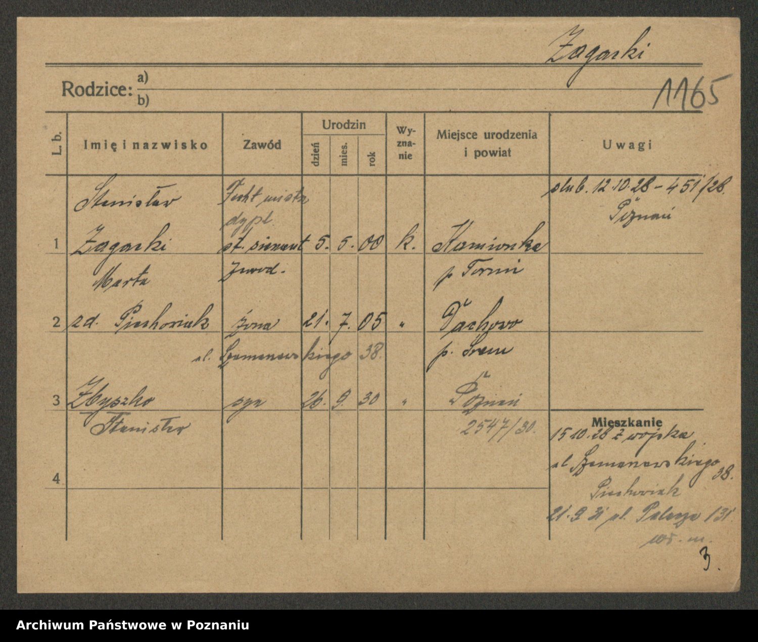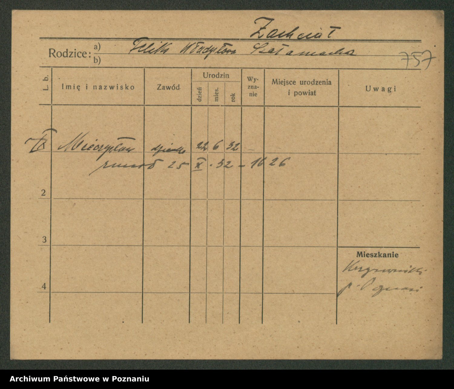 Podgląd karty osobowej dostępny jest po kliknięciu na nazwisko lub ikonkę karty. Można dokonywać powiększenia (ikony na górze) lub przechodzić między kolejnymi skanami (strzałki po bokach).