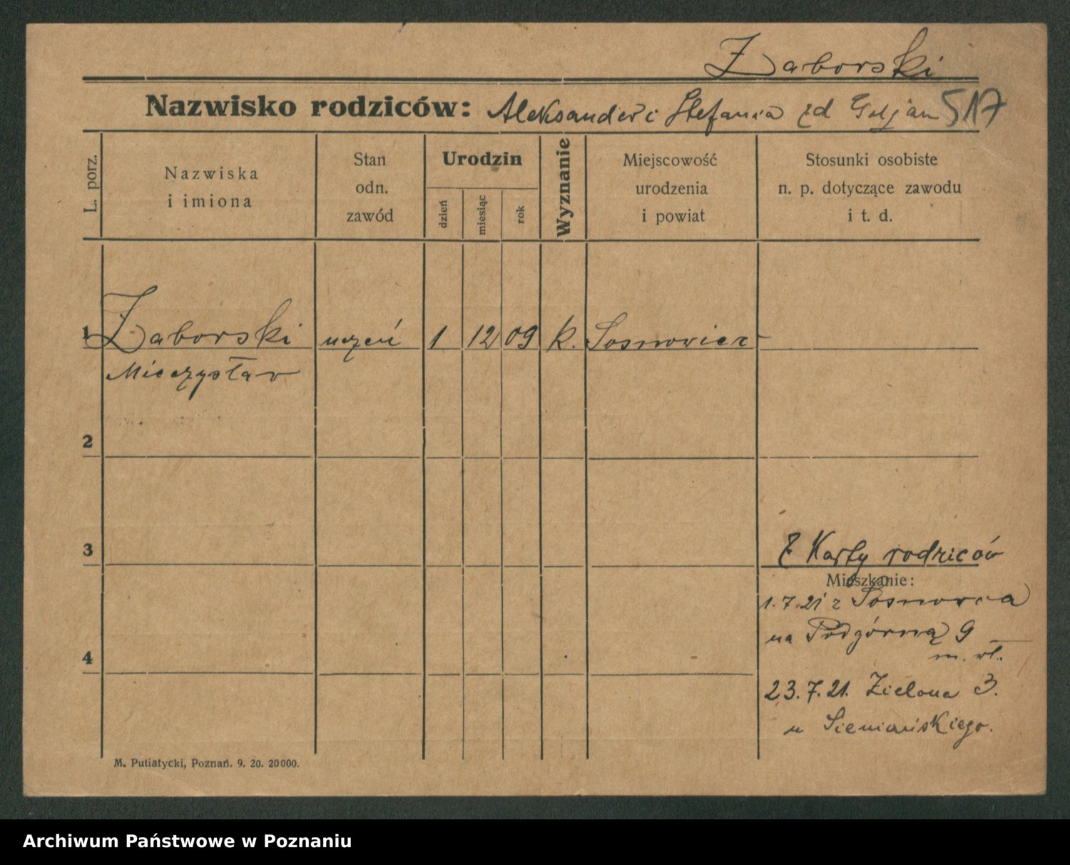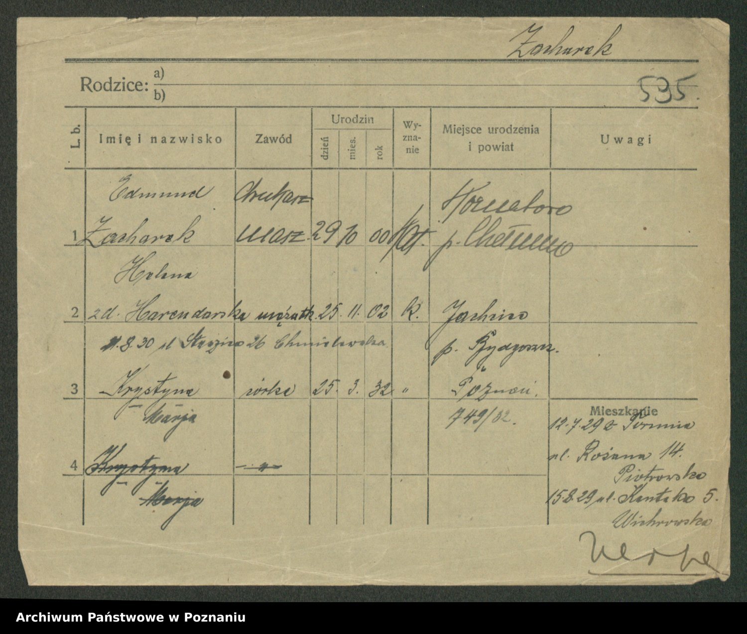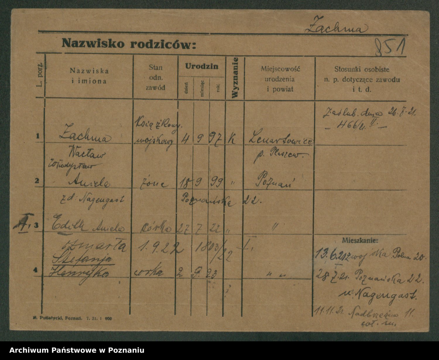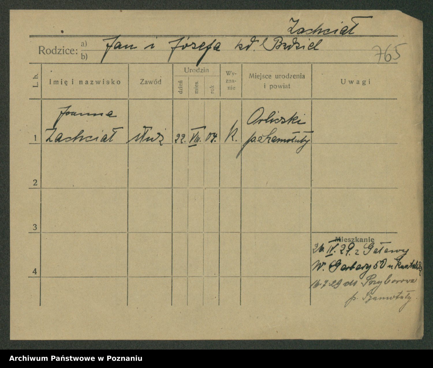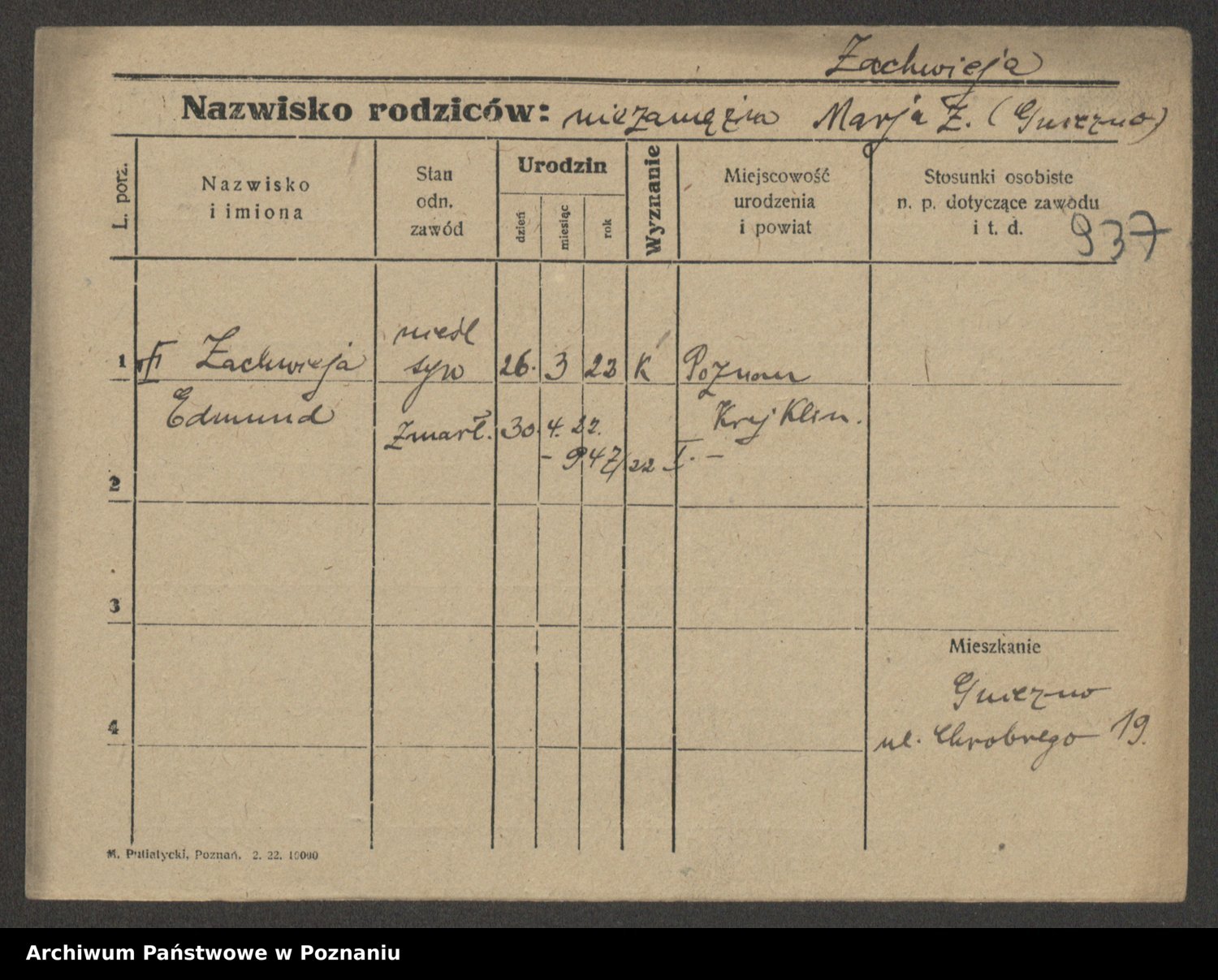 Podgląd karty osobowej dostępny jest po kliknięciu na nazwisko lub ikonkę karty. Można dokonywać powiększenia (ikony na górze) lub przechodzić między kolejnymi skanami (strzałki po bokach).