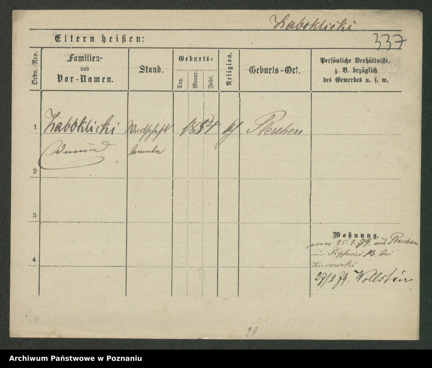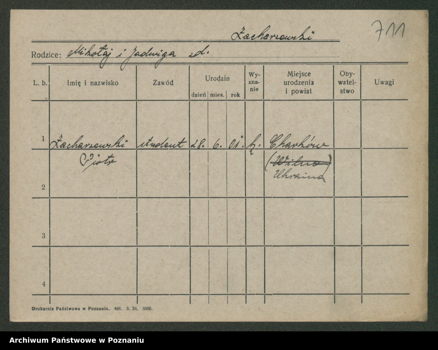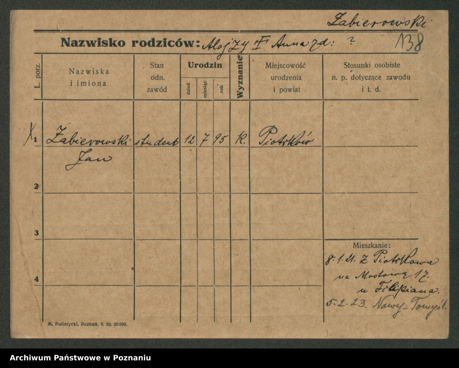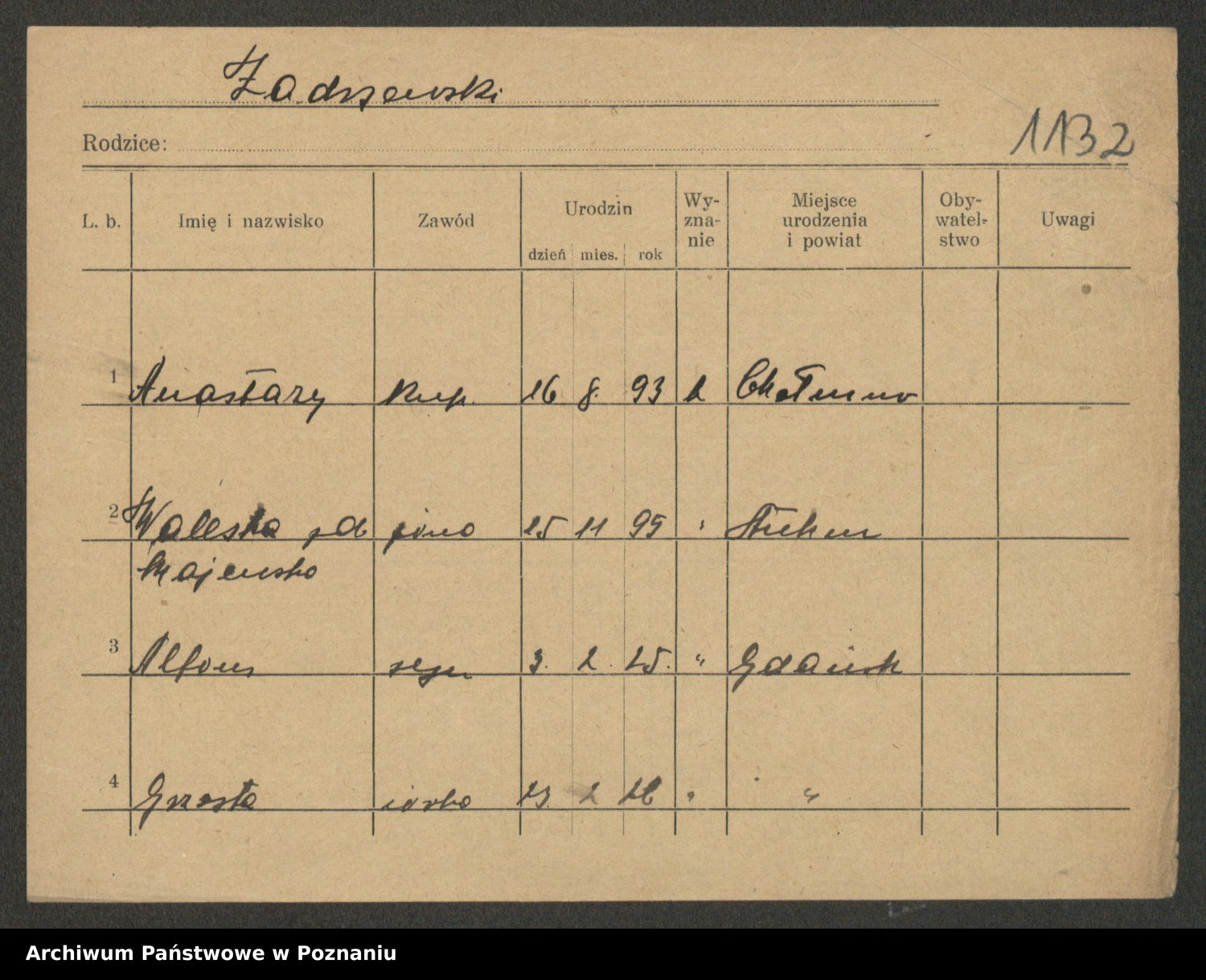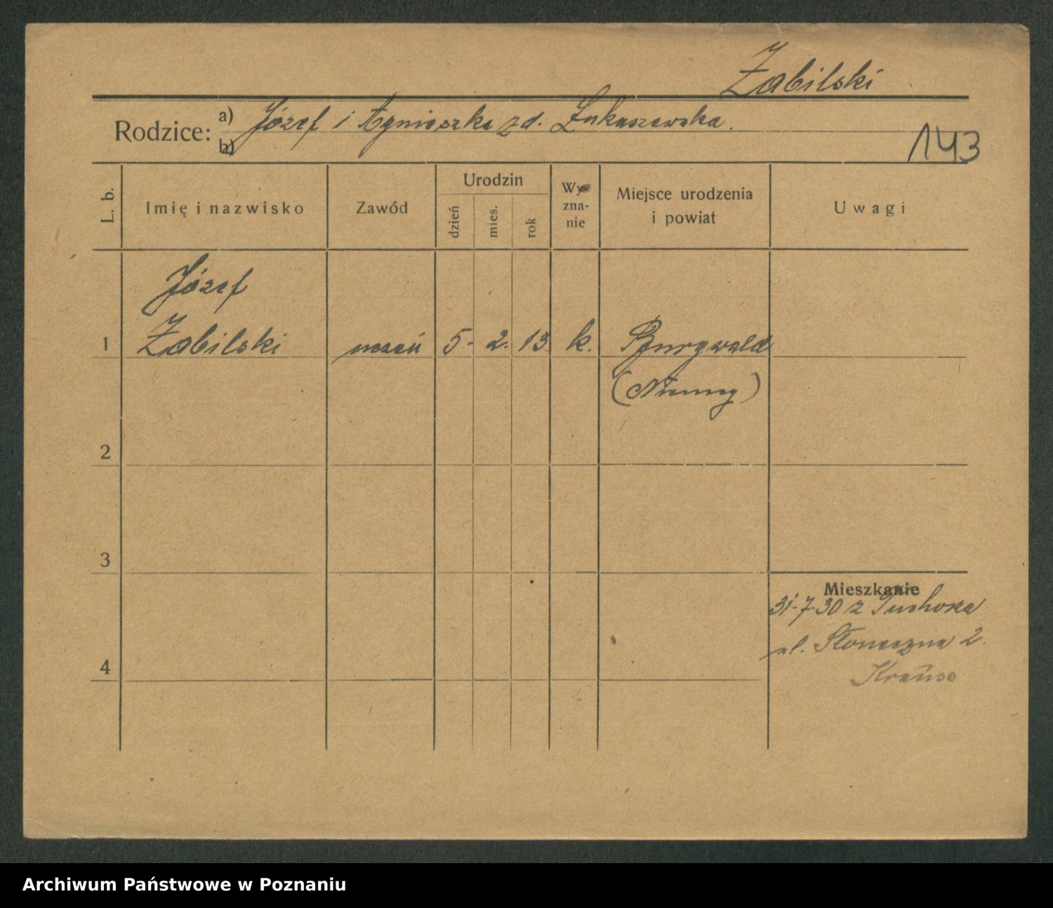 Podgląd karty osobowej dostępny jest po kliknięciu na nazwisko lub ikonkę karty. Można dokonywać powiększenia (ikony na górze) lub przechodzić między kolejnymi skanami (strzałki po bokach).