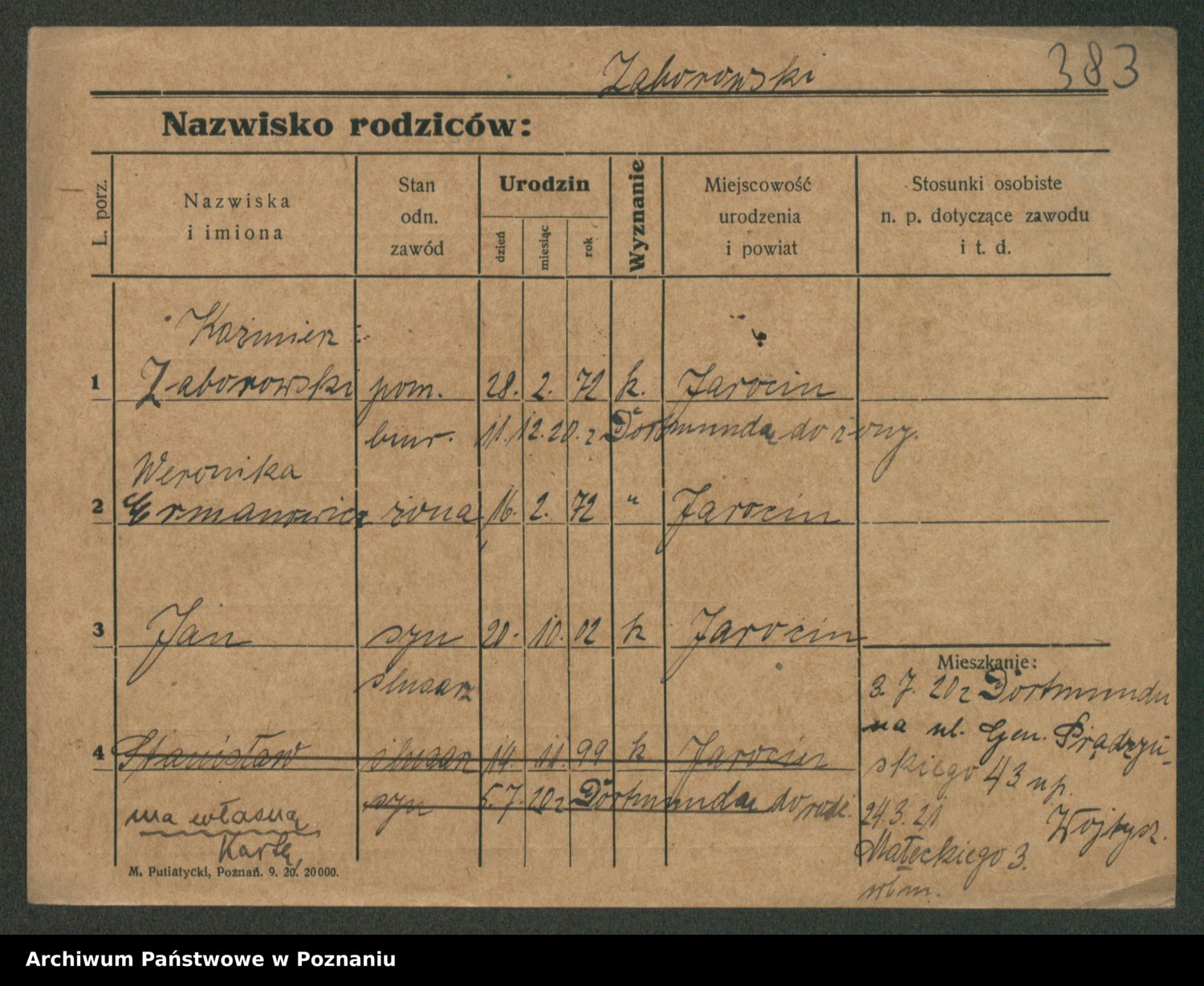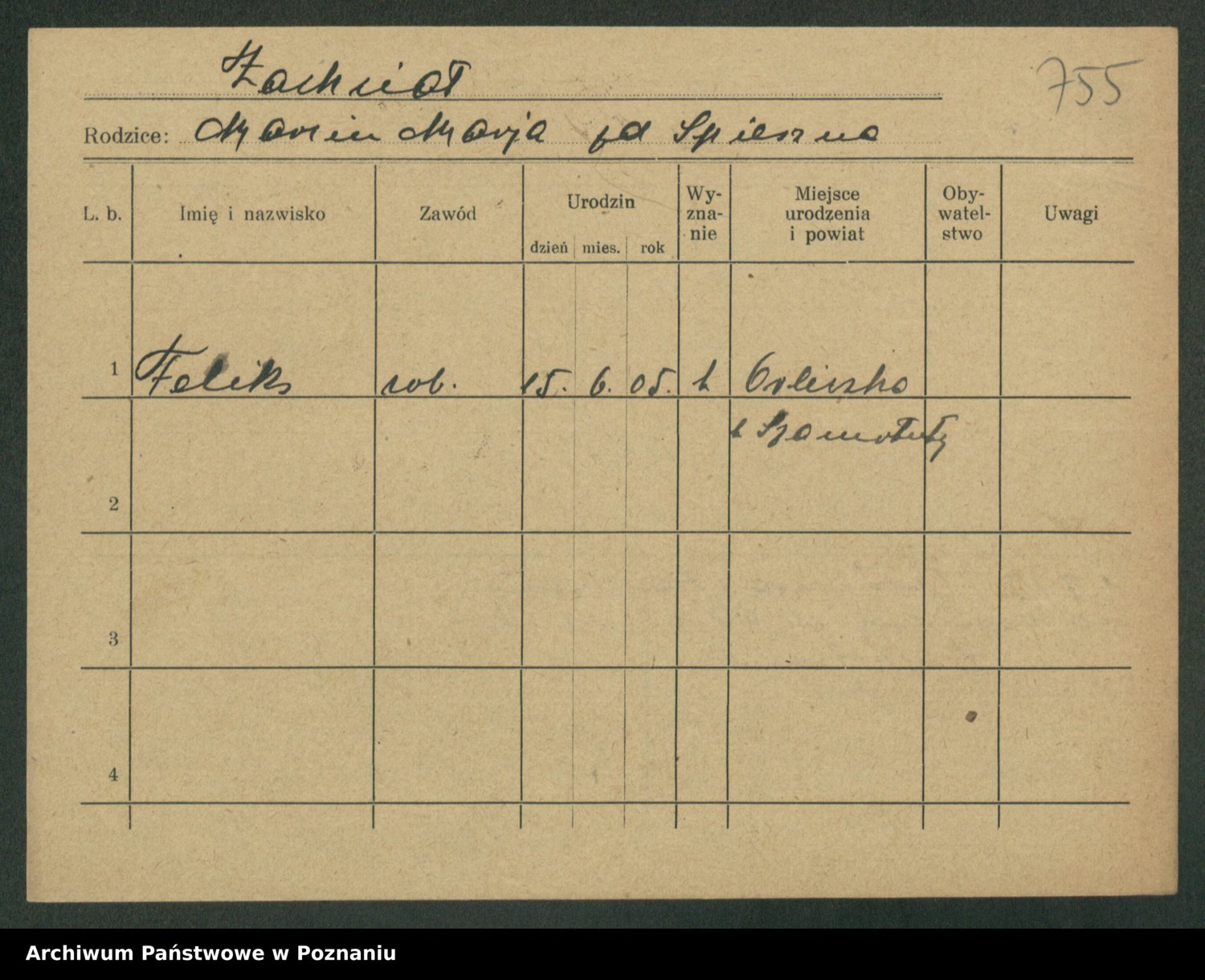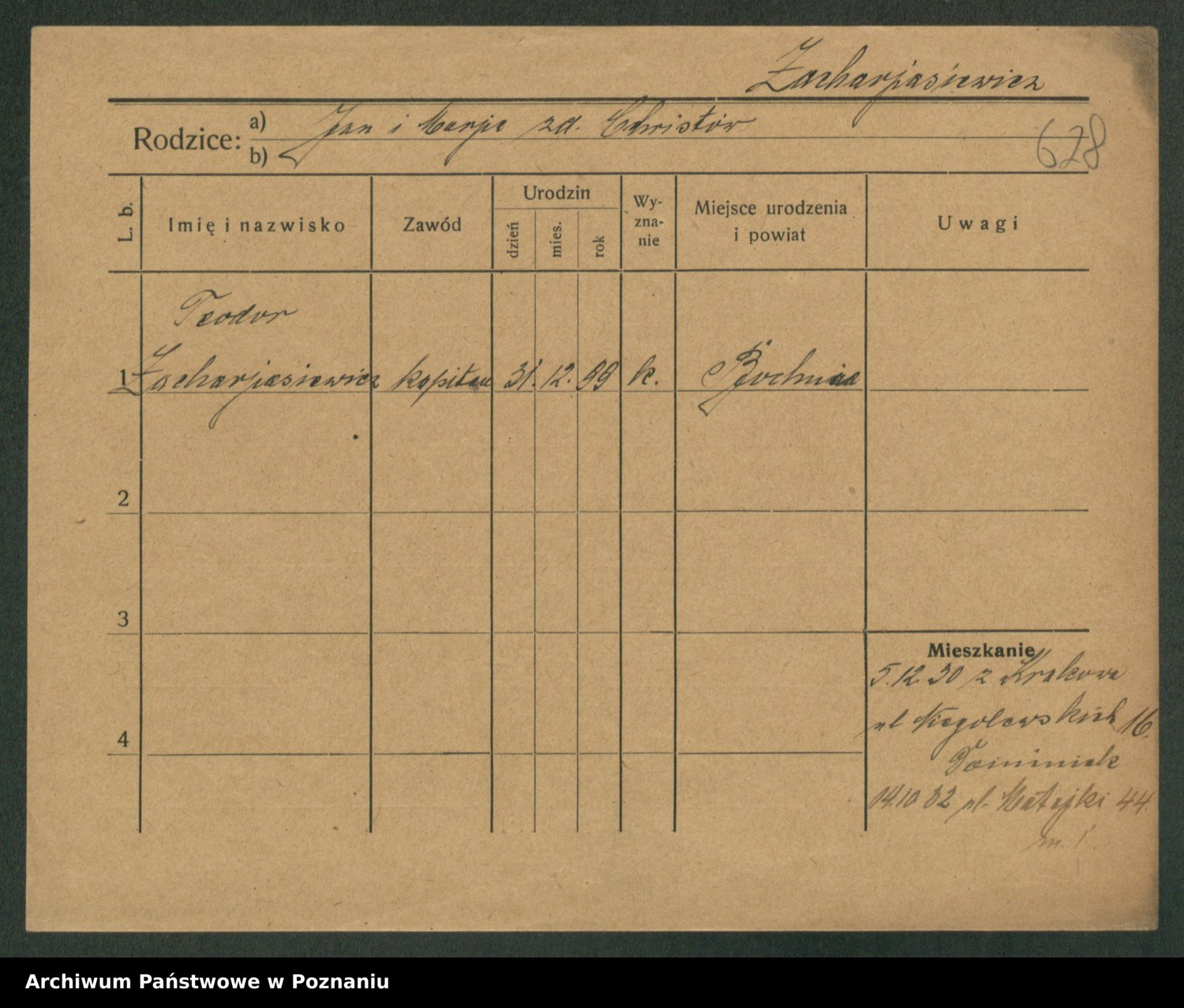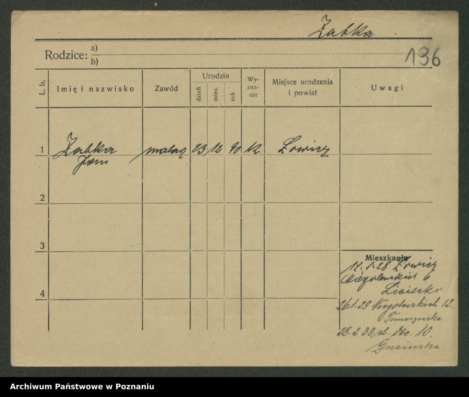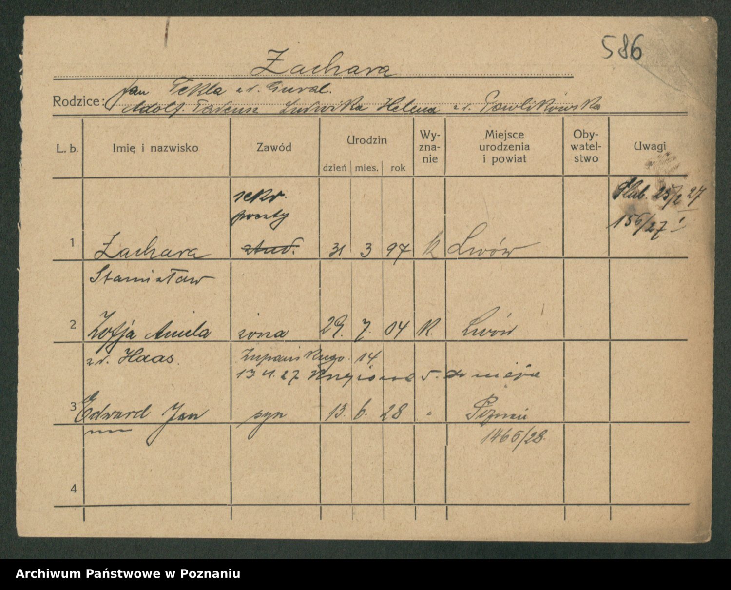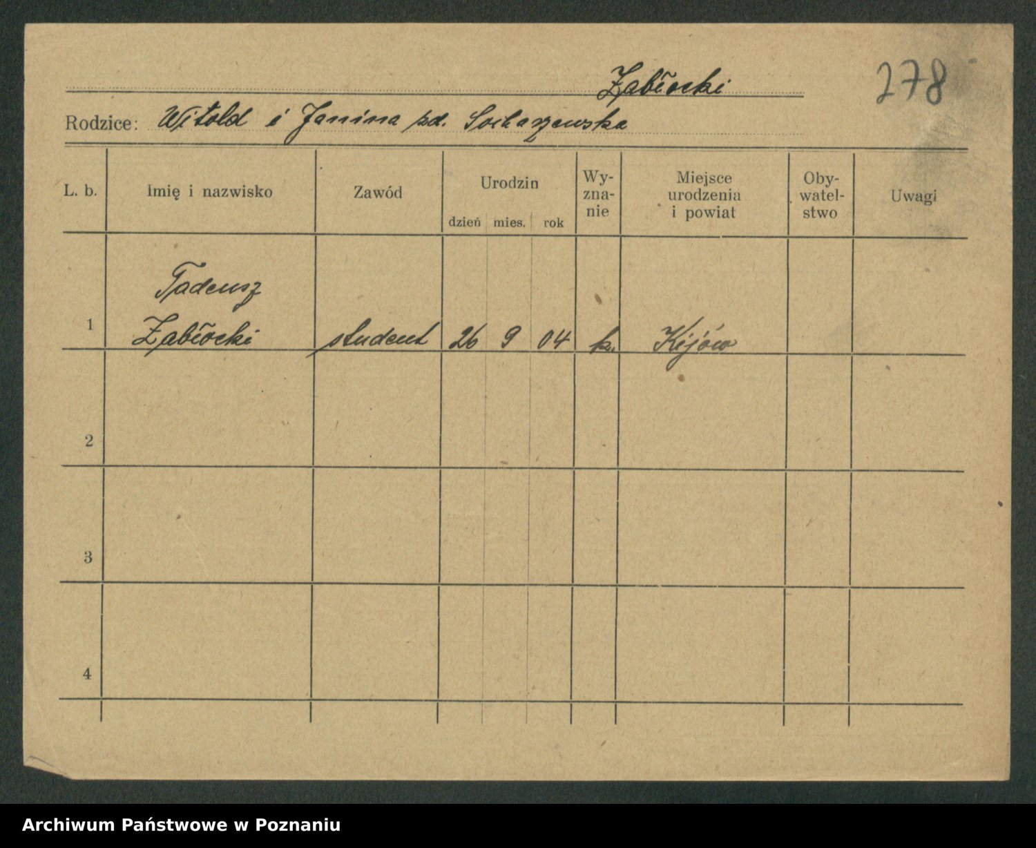 Podgląd karty osobowej dostępny jest po kliknięciu na nazwisko lub ikonkę karty. Można dokonywać powiększenia (ikony na górze) lub przechodzić między kolejnymi skanami (strzałki po bokach).