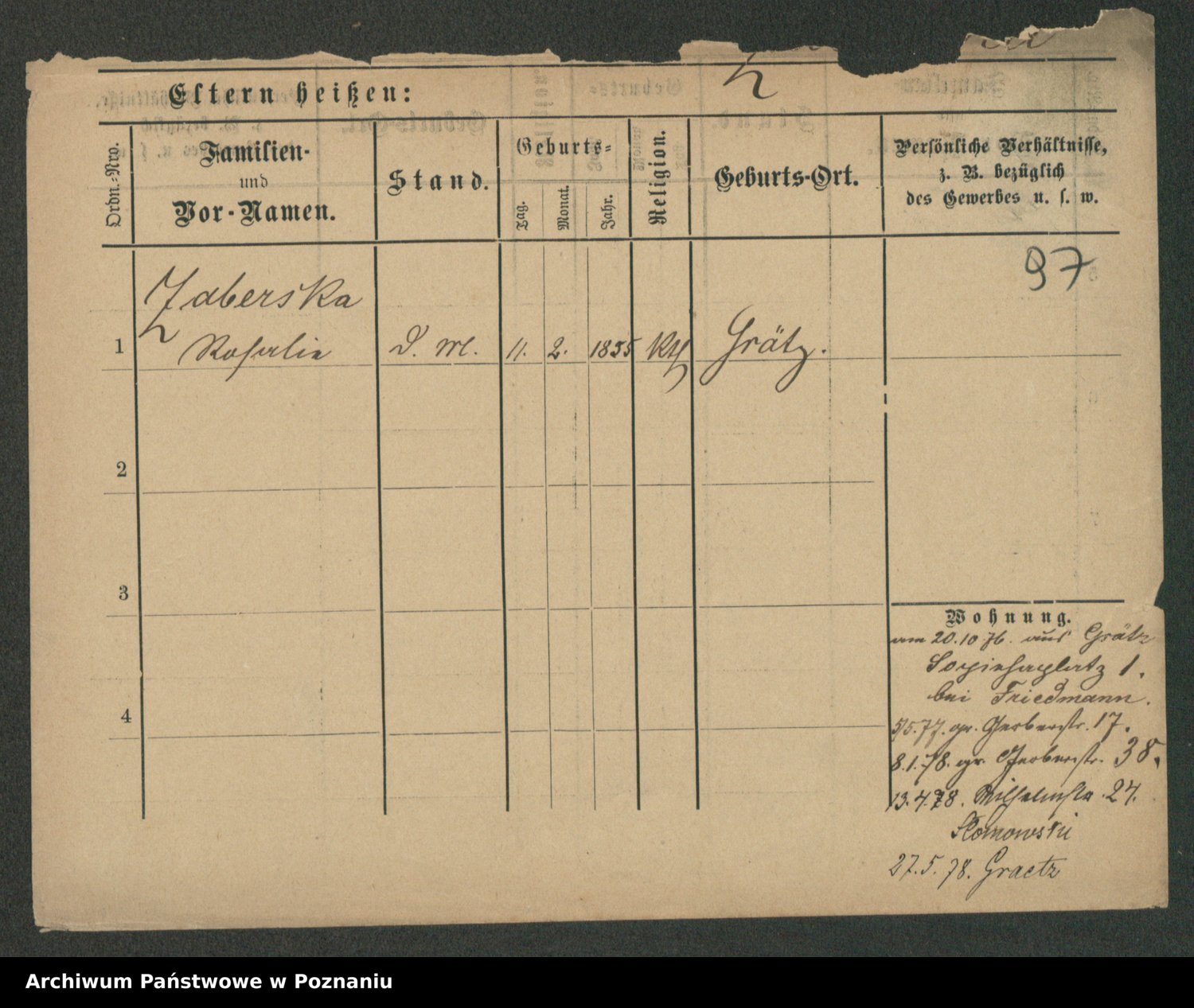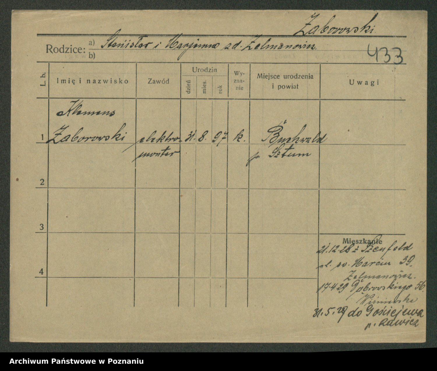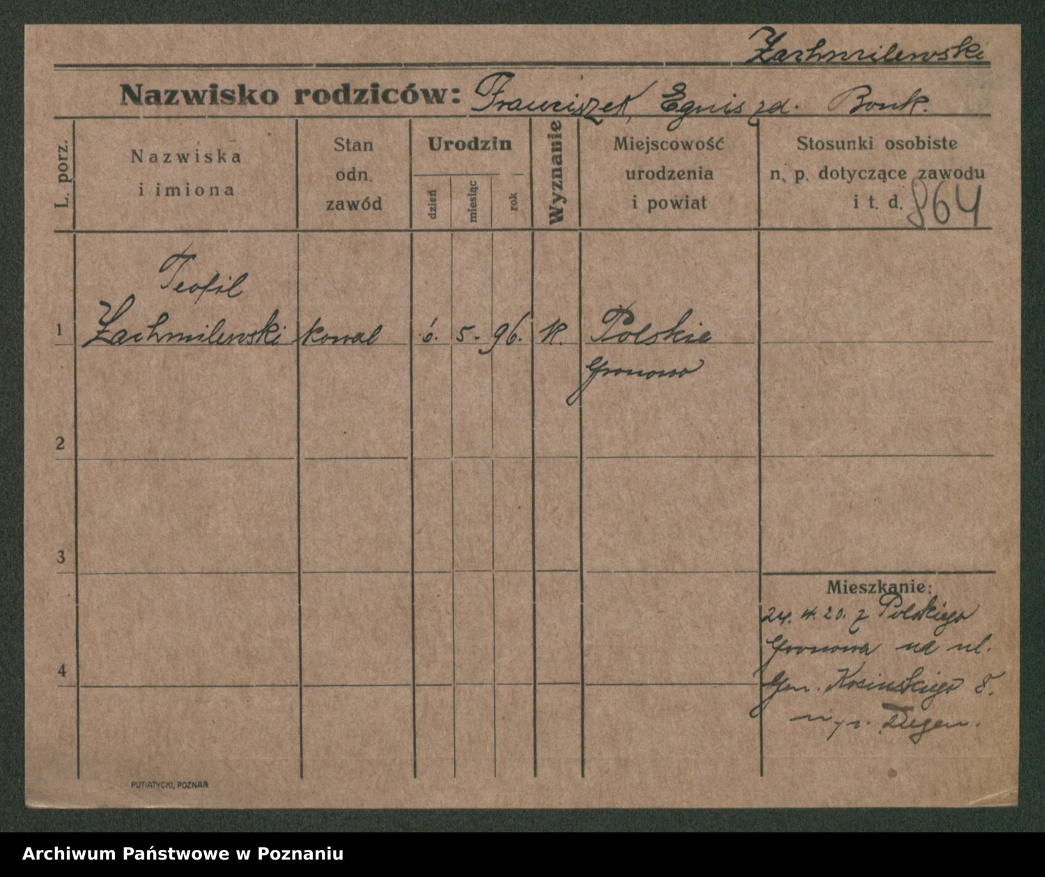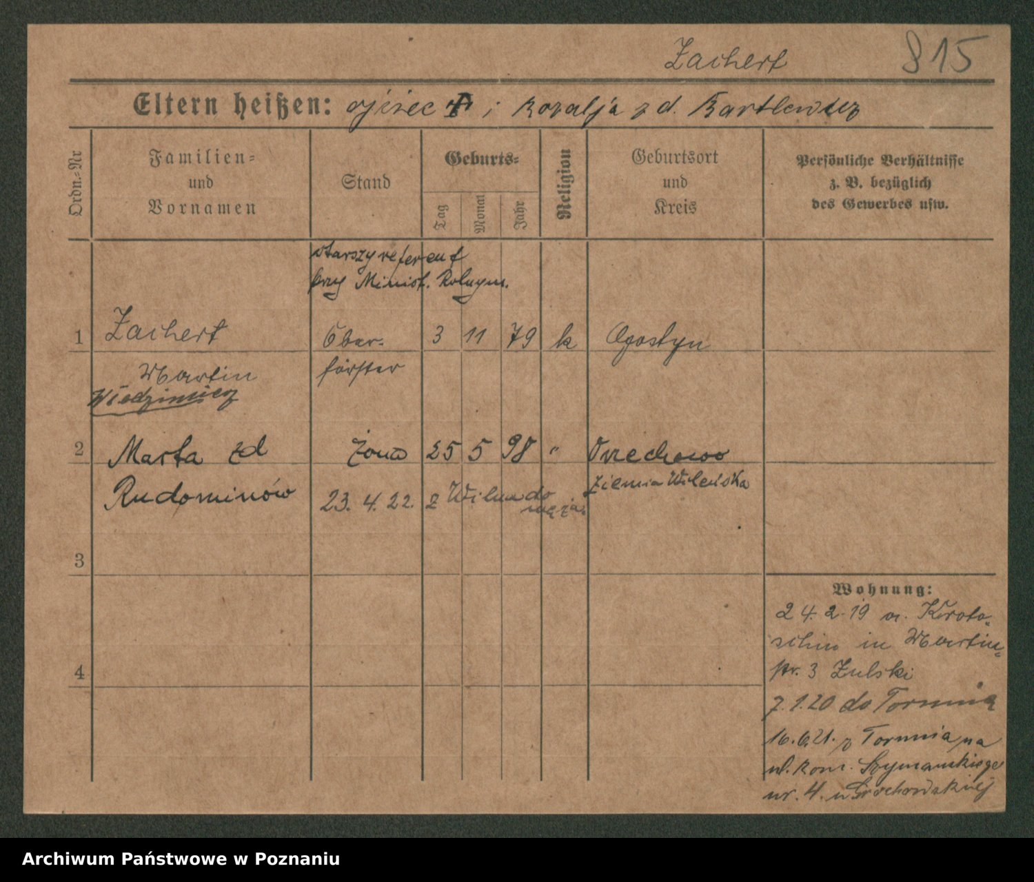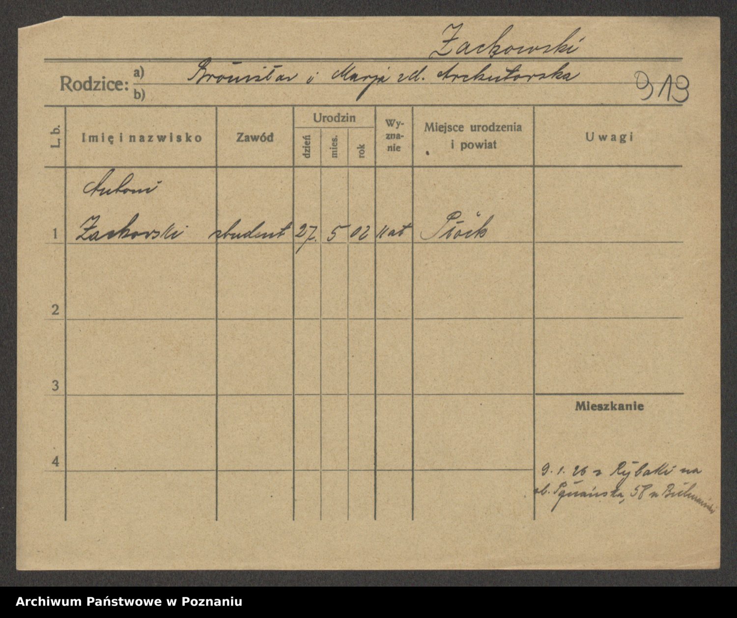 Podgląd karty osobowej dostępny jest po kliknięciu na nazwisko lub ikonkę karty. Można dokonywać powiększenia (ikony na górze) lub przechodzić między kolejnymi skanami (strzałki po bokach).