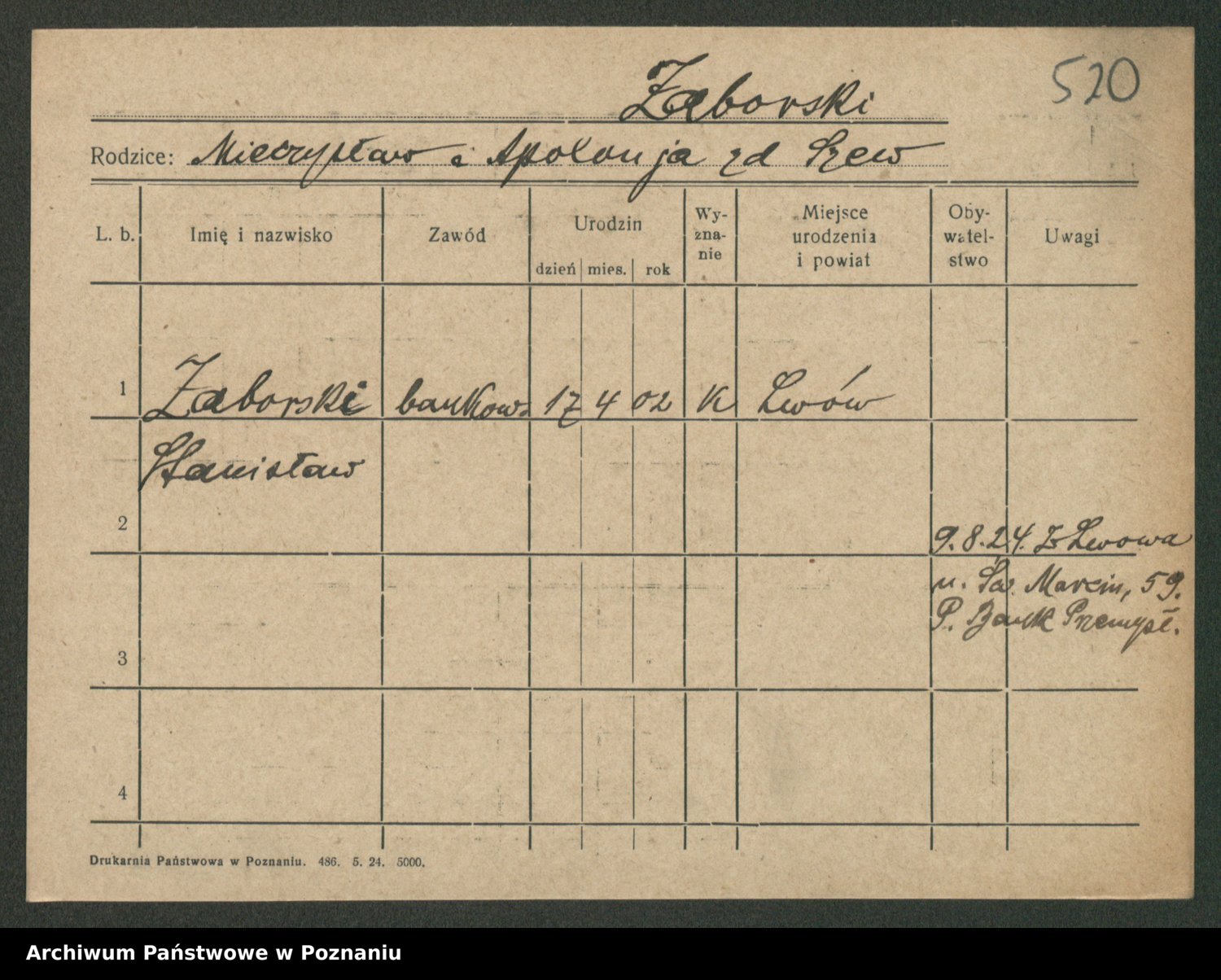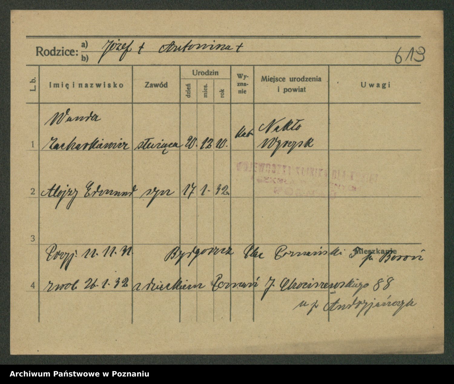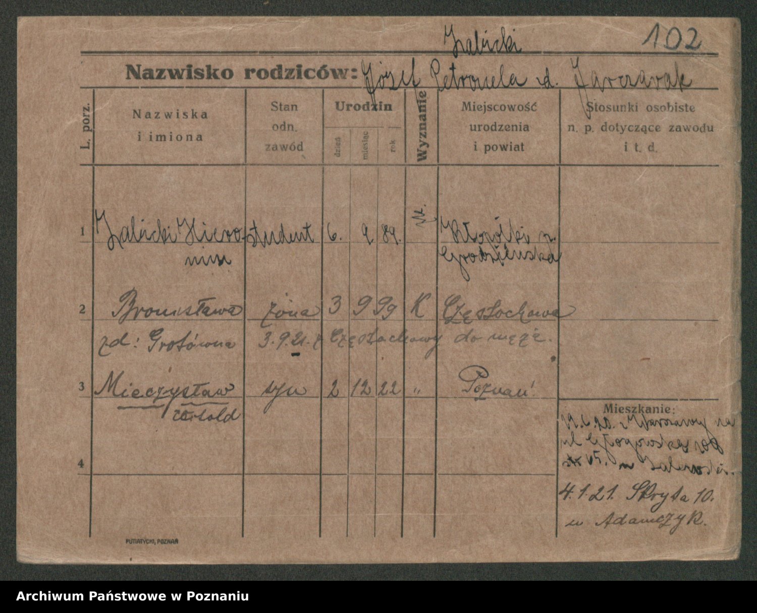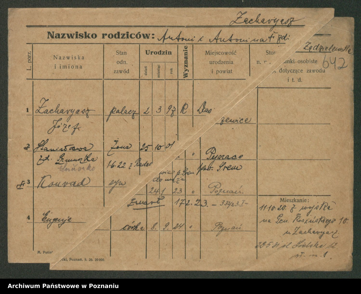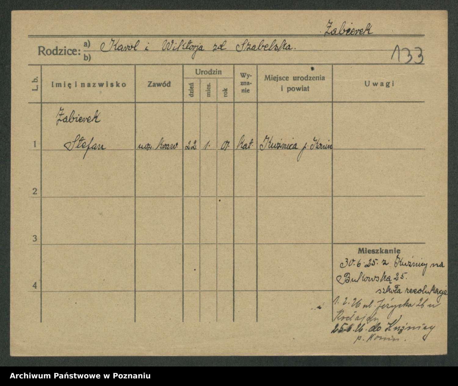 Podgląd karty osobowej dostępny jest po kliknięciu na nazwisko lub ikonkę karty. Można dokonywać powiększenia (ikony na górze) lub przechodzić między kolejnymi skanami (strzałki po bokach).