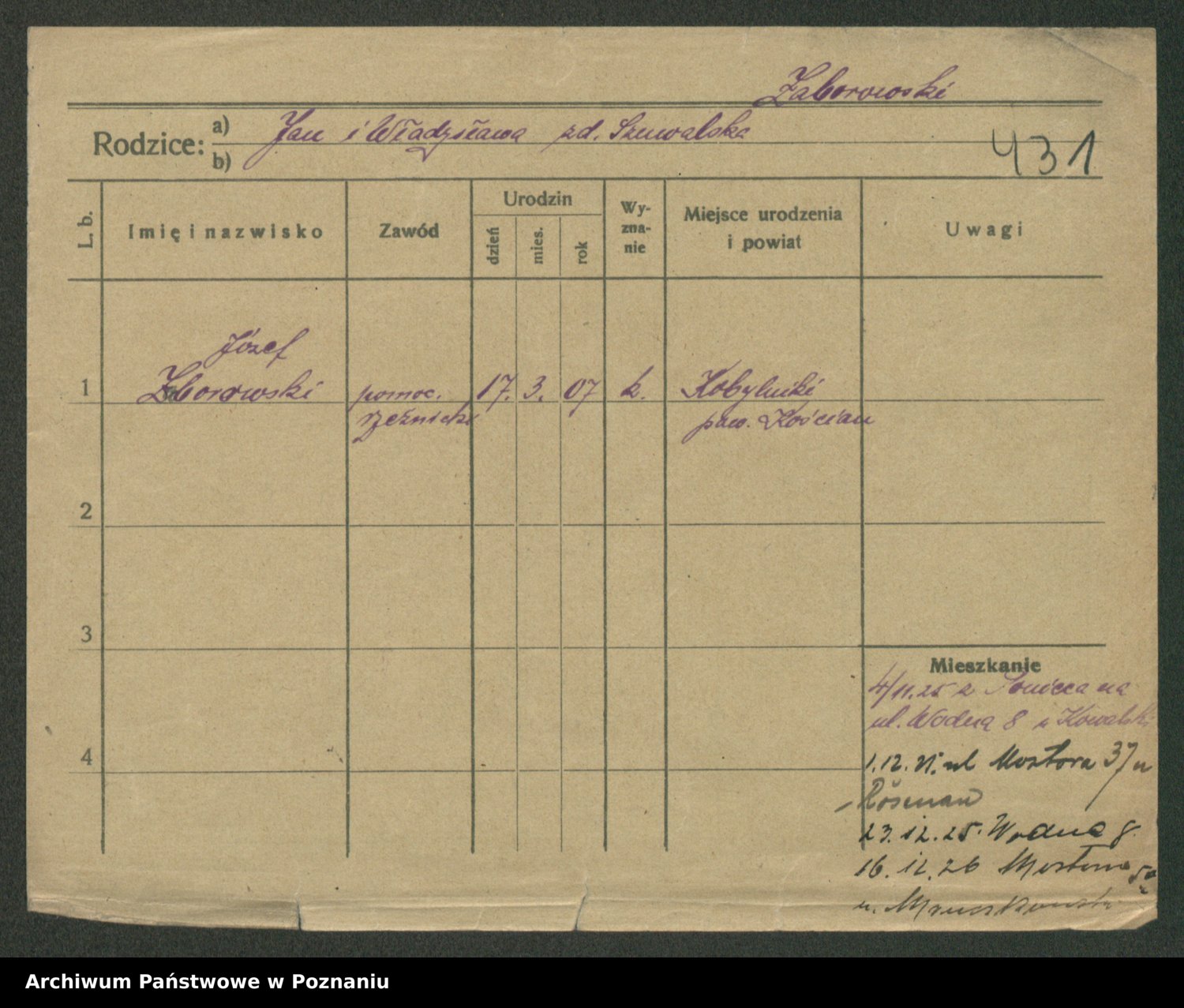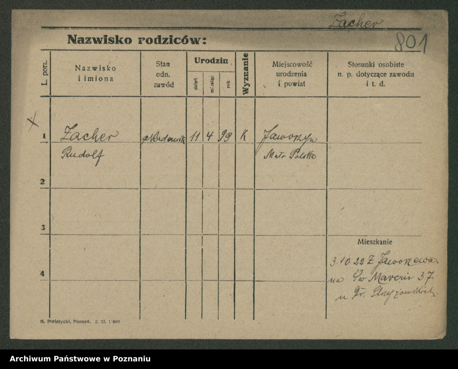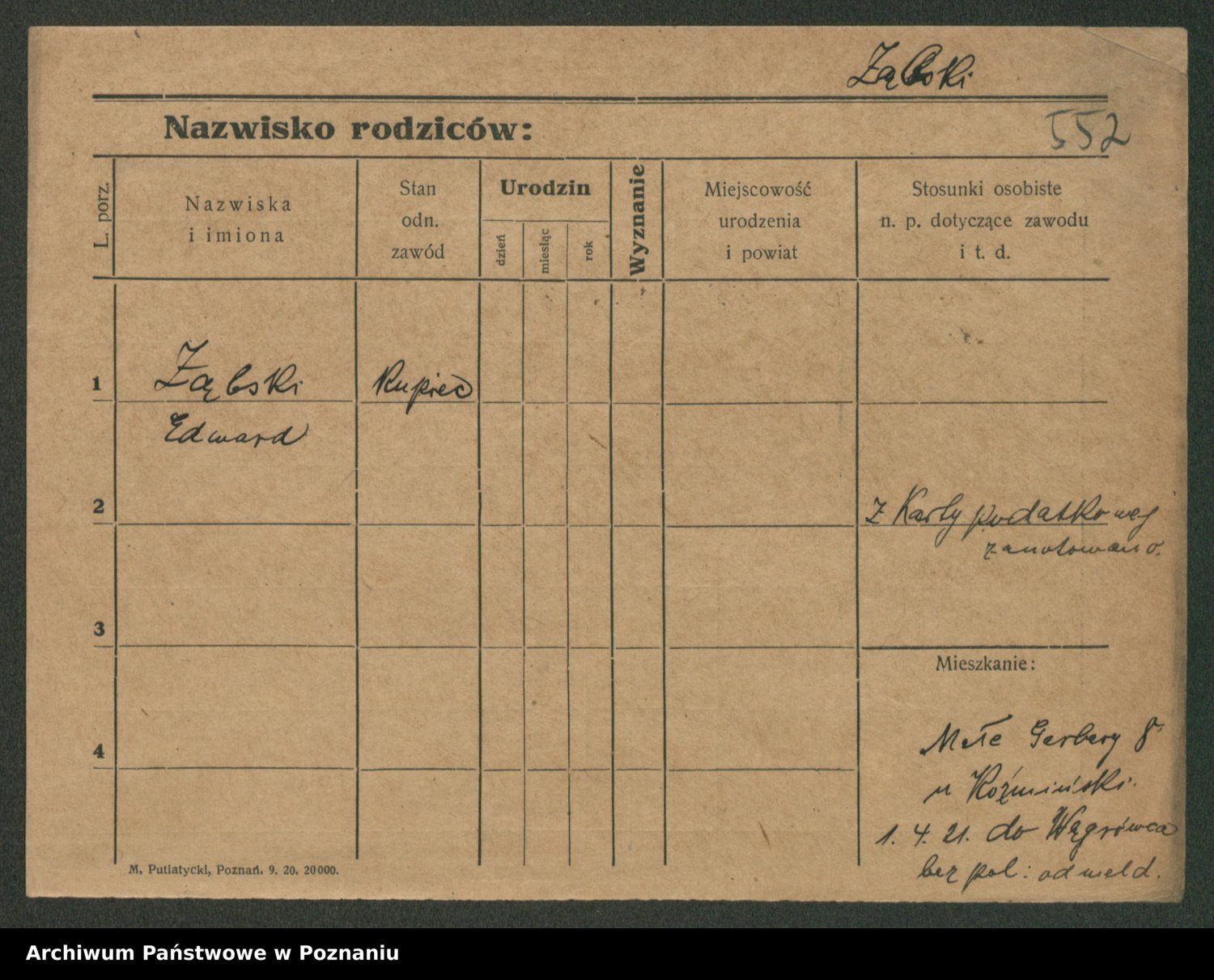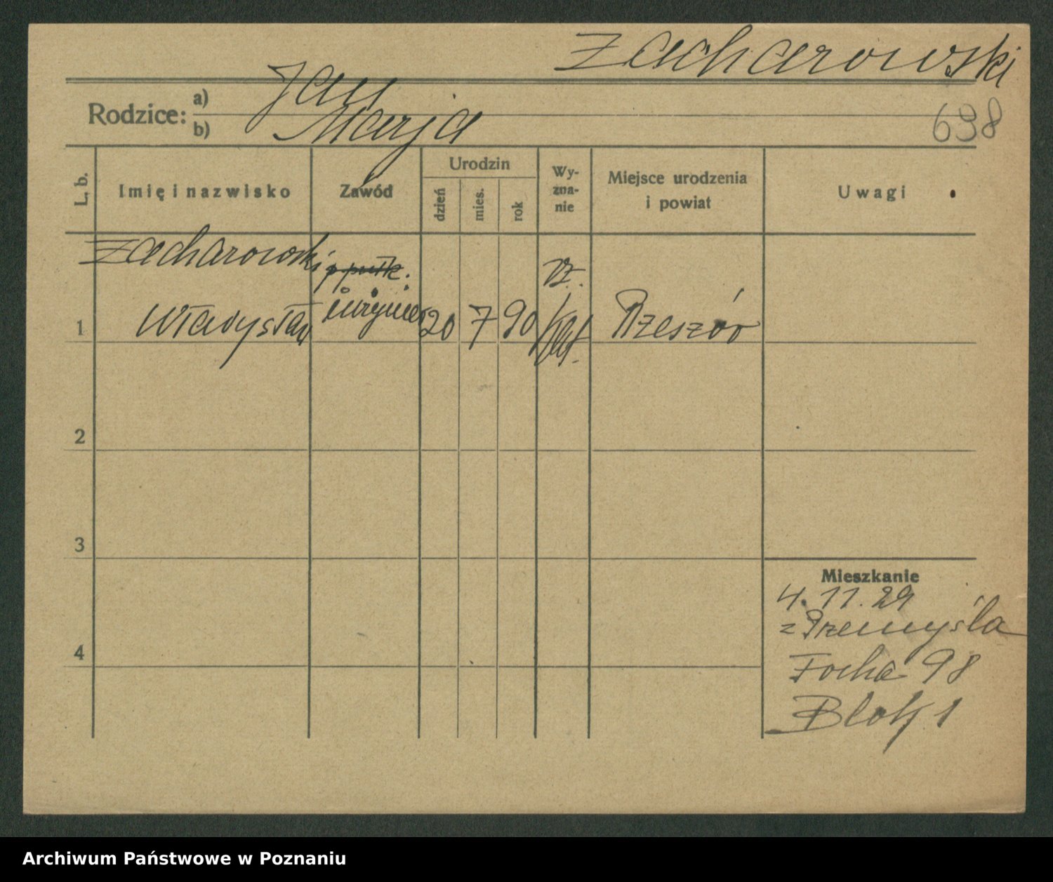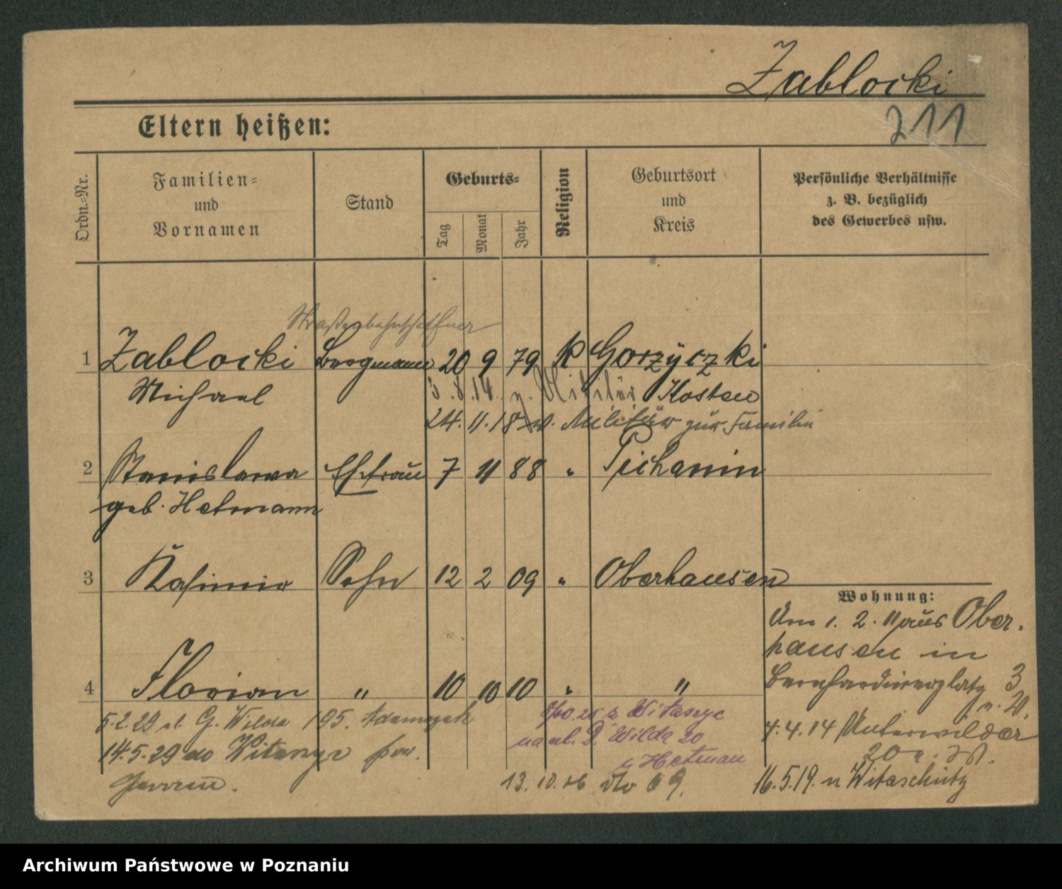 Podgląd karty osobowej dostępny jest po kliknięciu na nazwisko lub ikonkę karty. Można dokonywać powiększenia (ikony na górze) lub przechodzić między kolejnymi skanami (strzałki po bokach).
