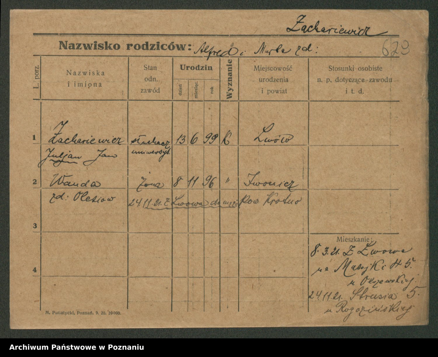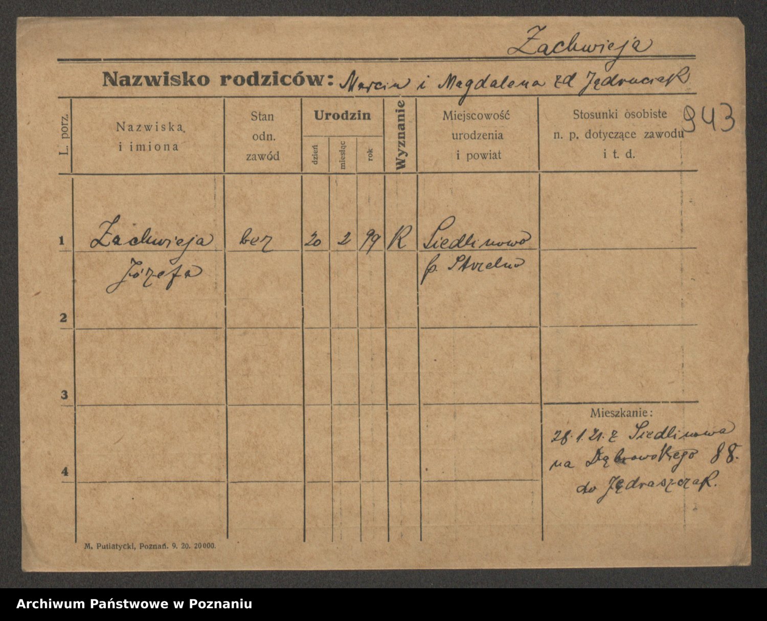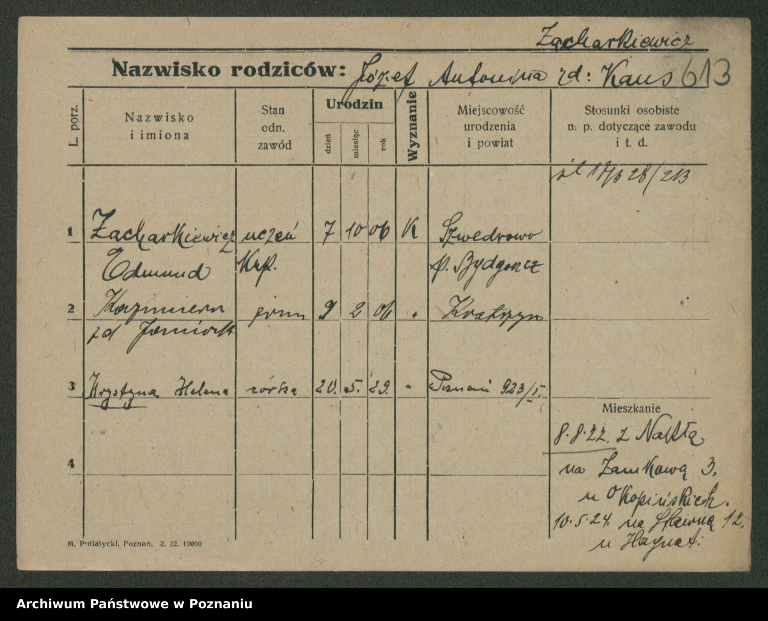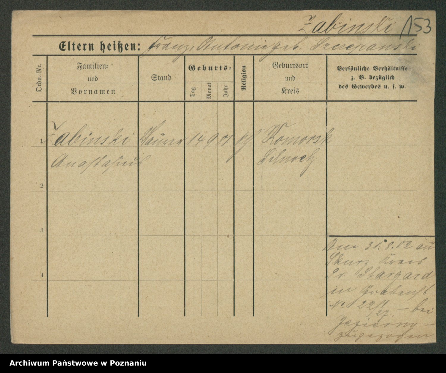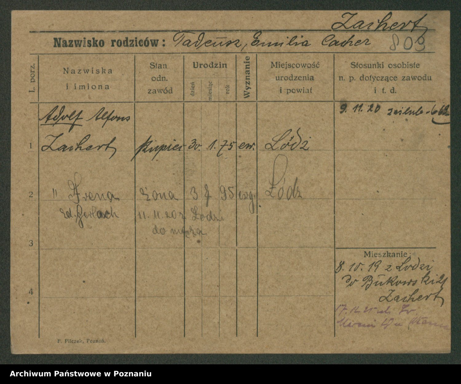 Podgląd karty osobowej dostępny jest po kliknięciu na nazwisko lub ikonkę karty. Można dokonywać powiększenia (ikony na górze) lub przechodzić między kolejnymi skanami (strzałki po bokach).