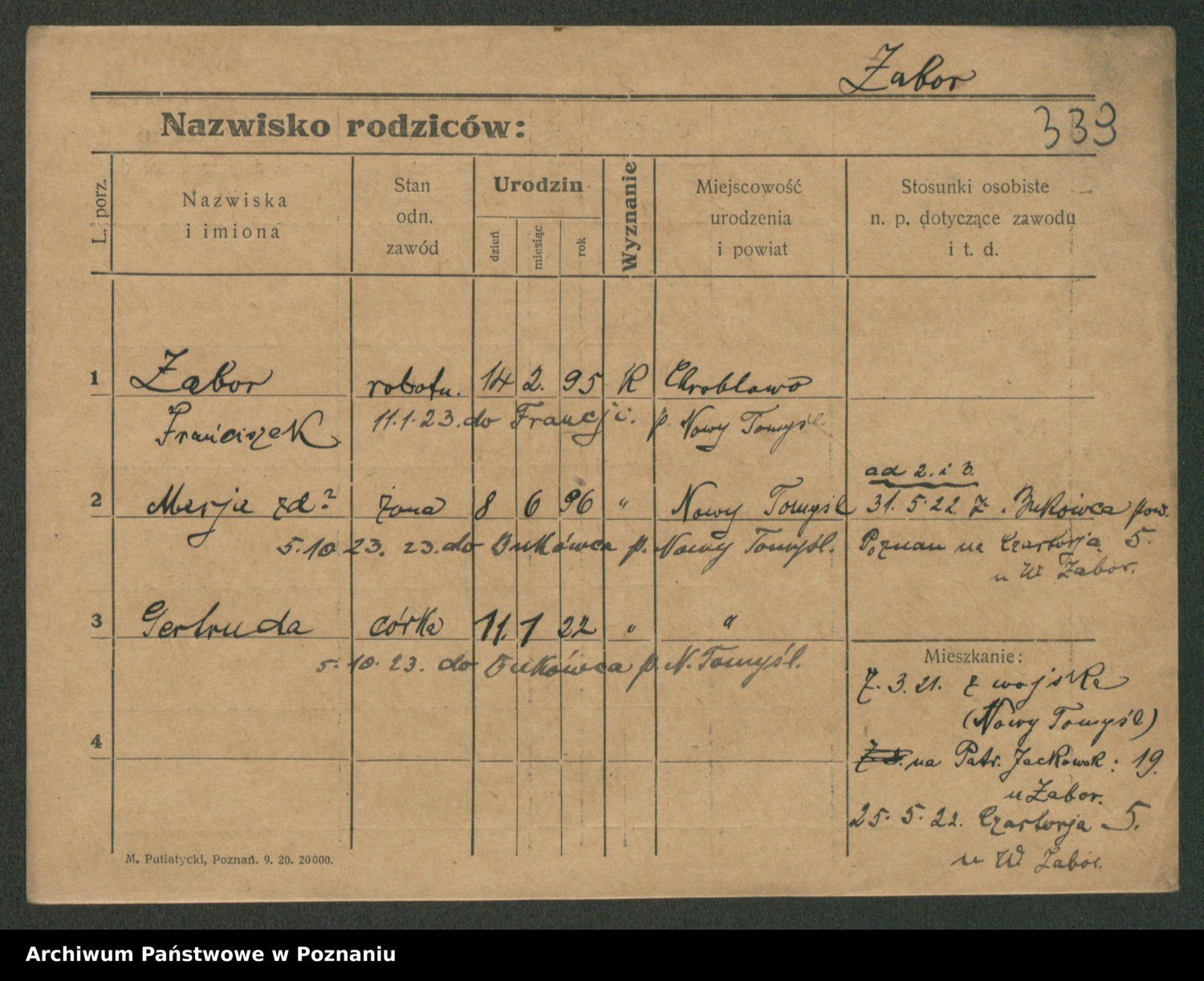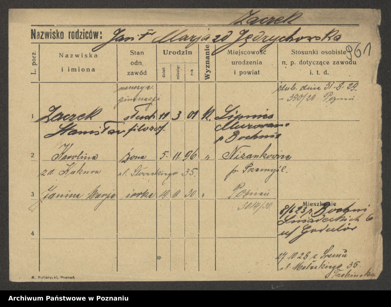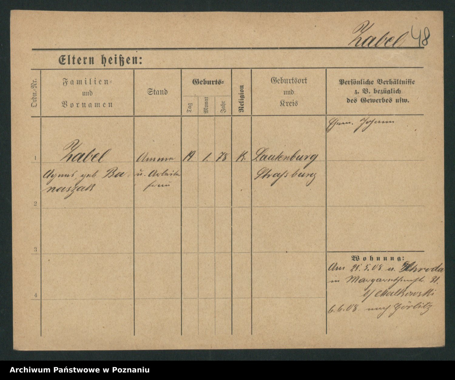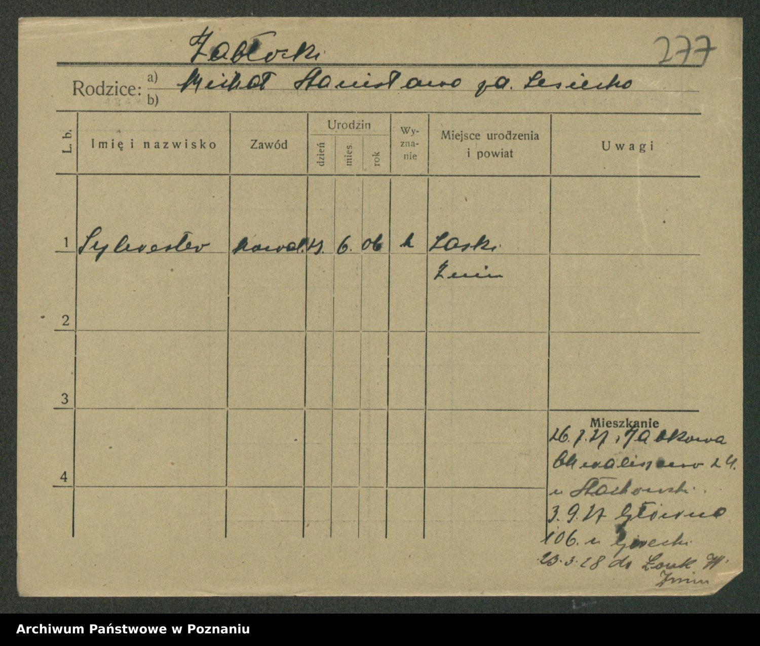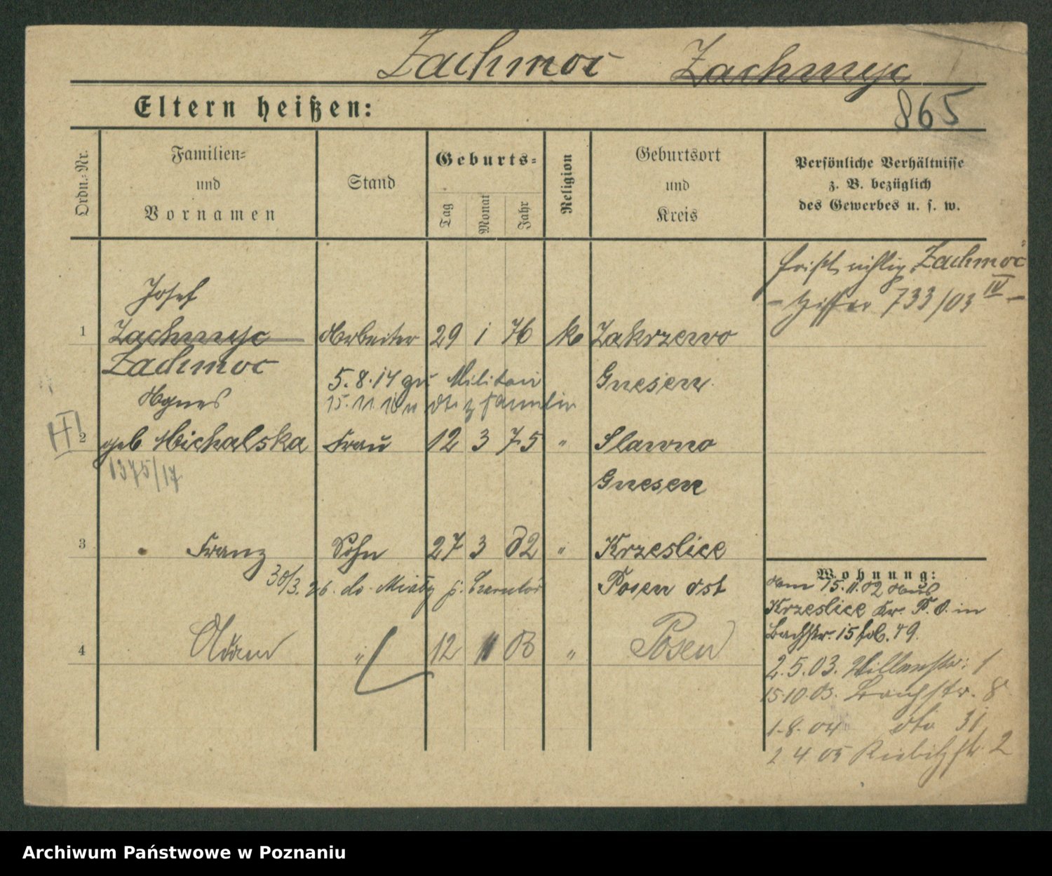 Podgląd karty osobowej dostępny jest po kliknięciu na nazwisko lub ikonkę karty. Można dokonywać powiększenia (ikony na górze) lub przechodzić między kolejnymi skanami (strzałki po bokach).