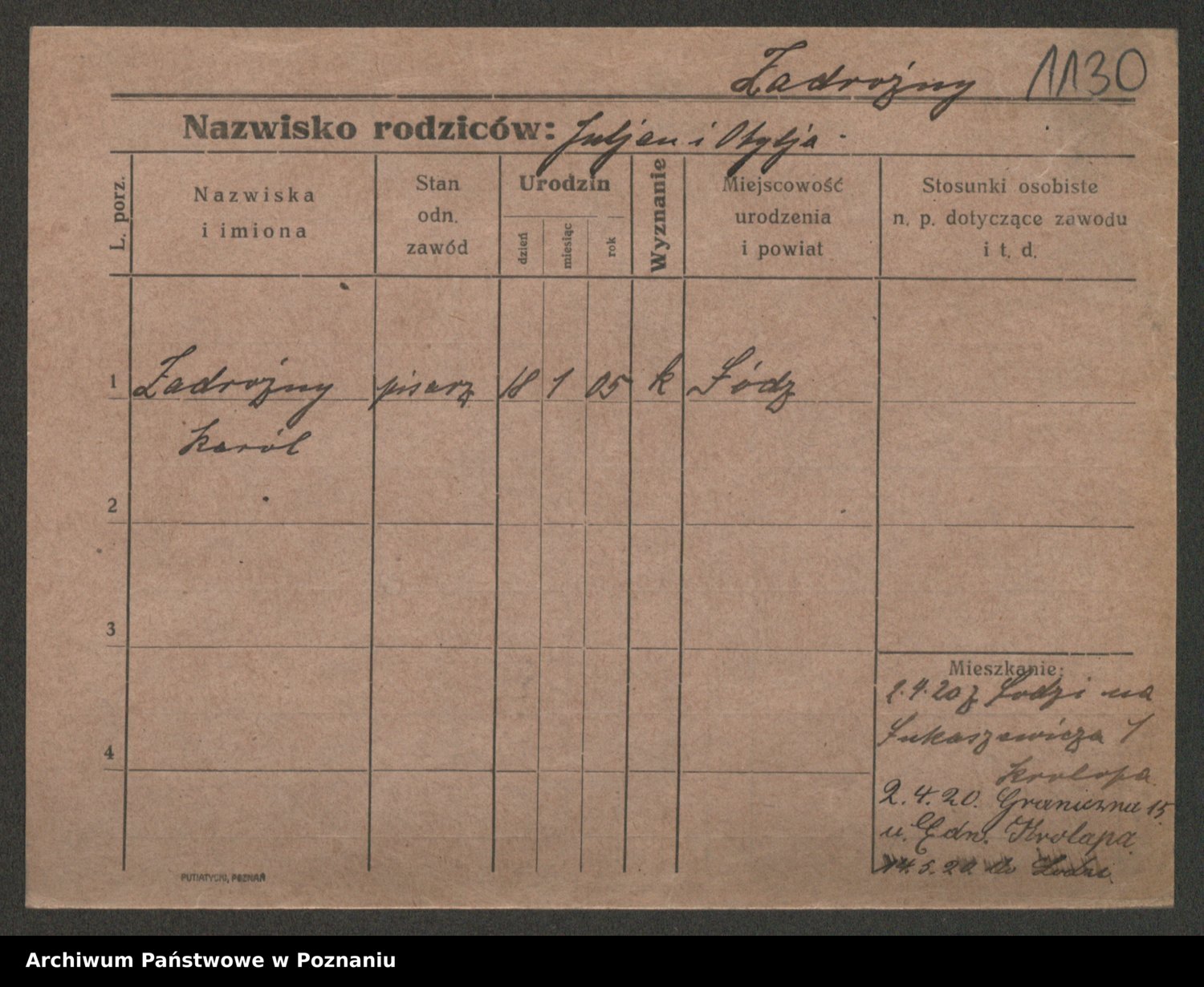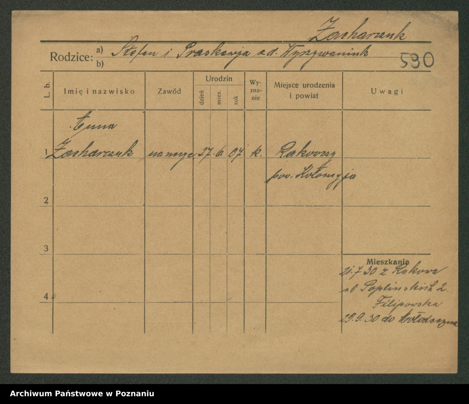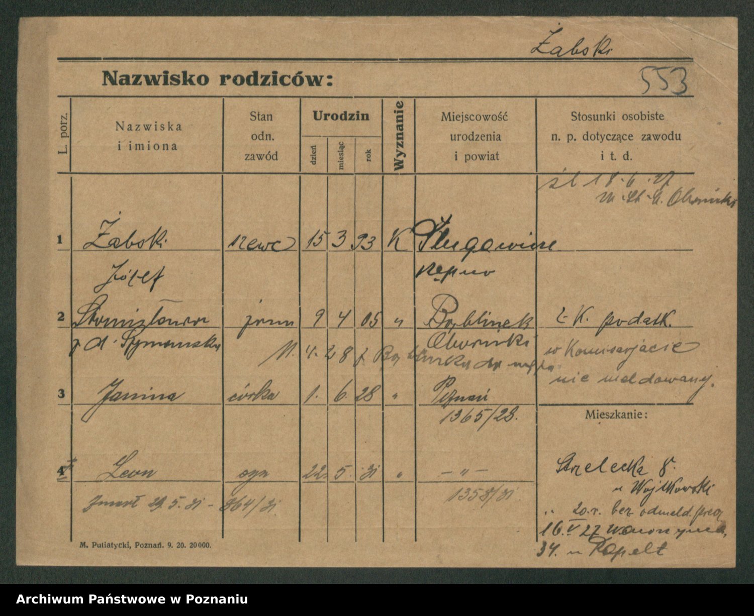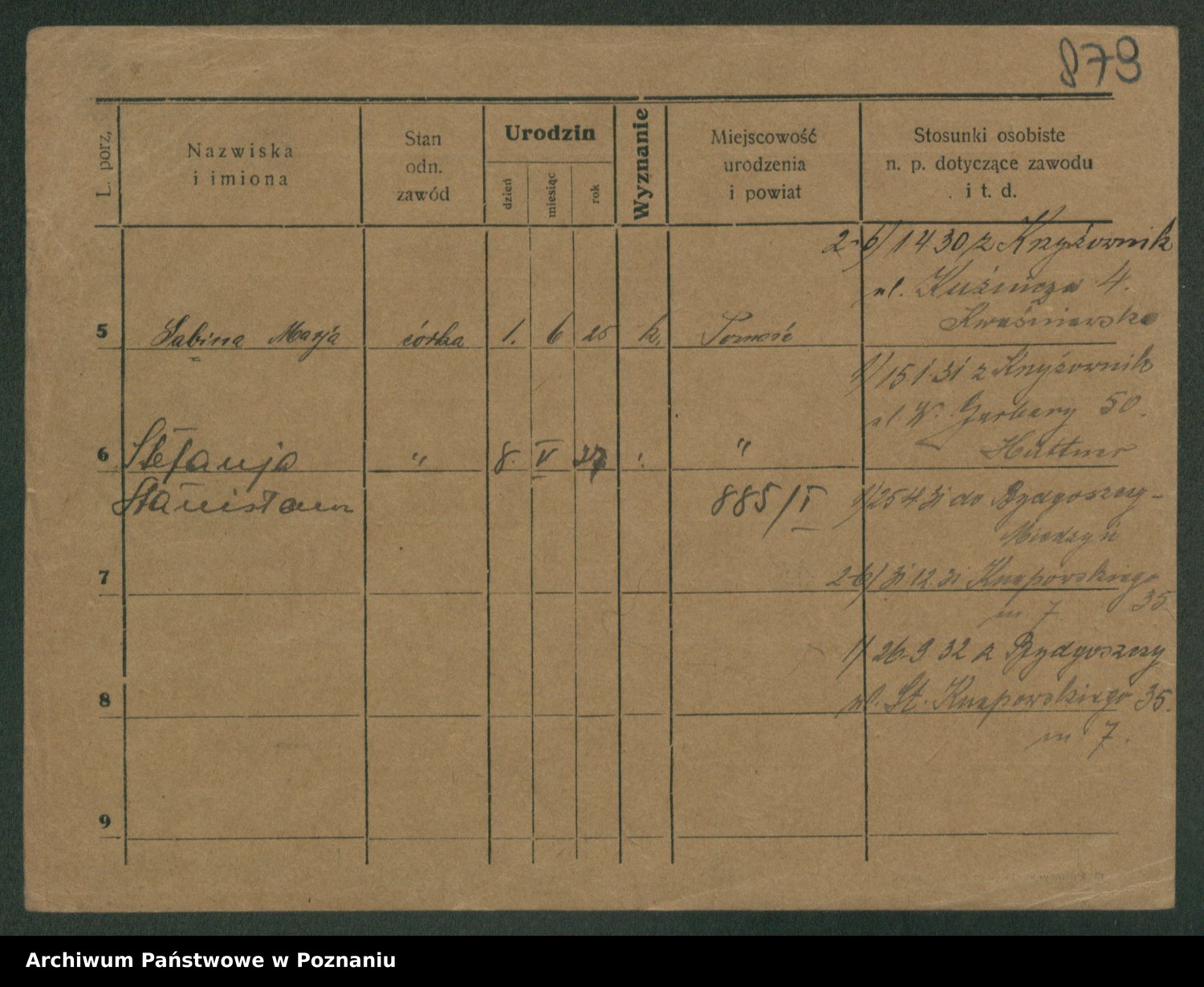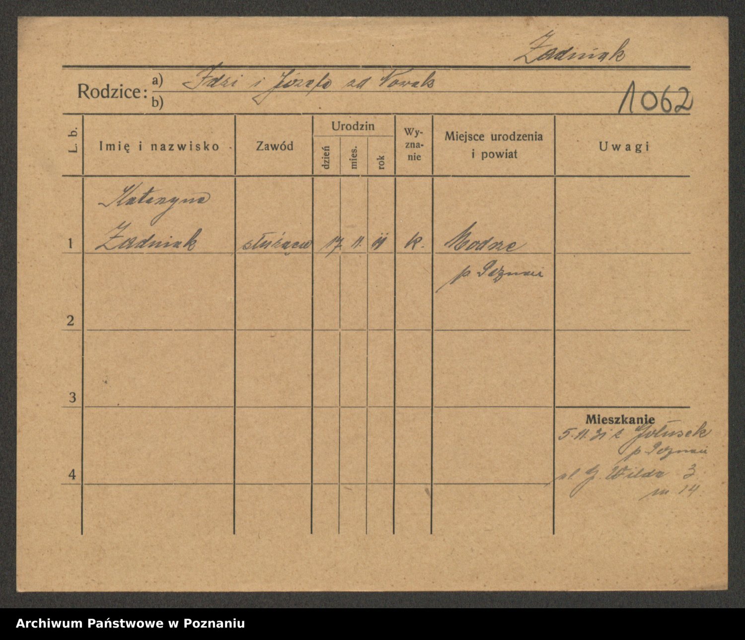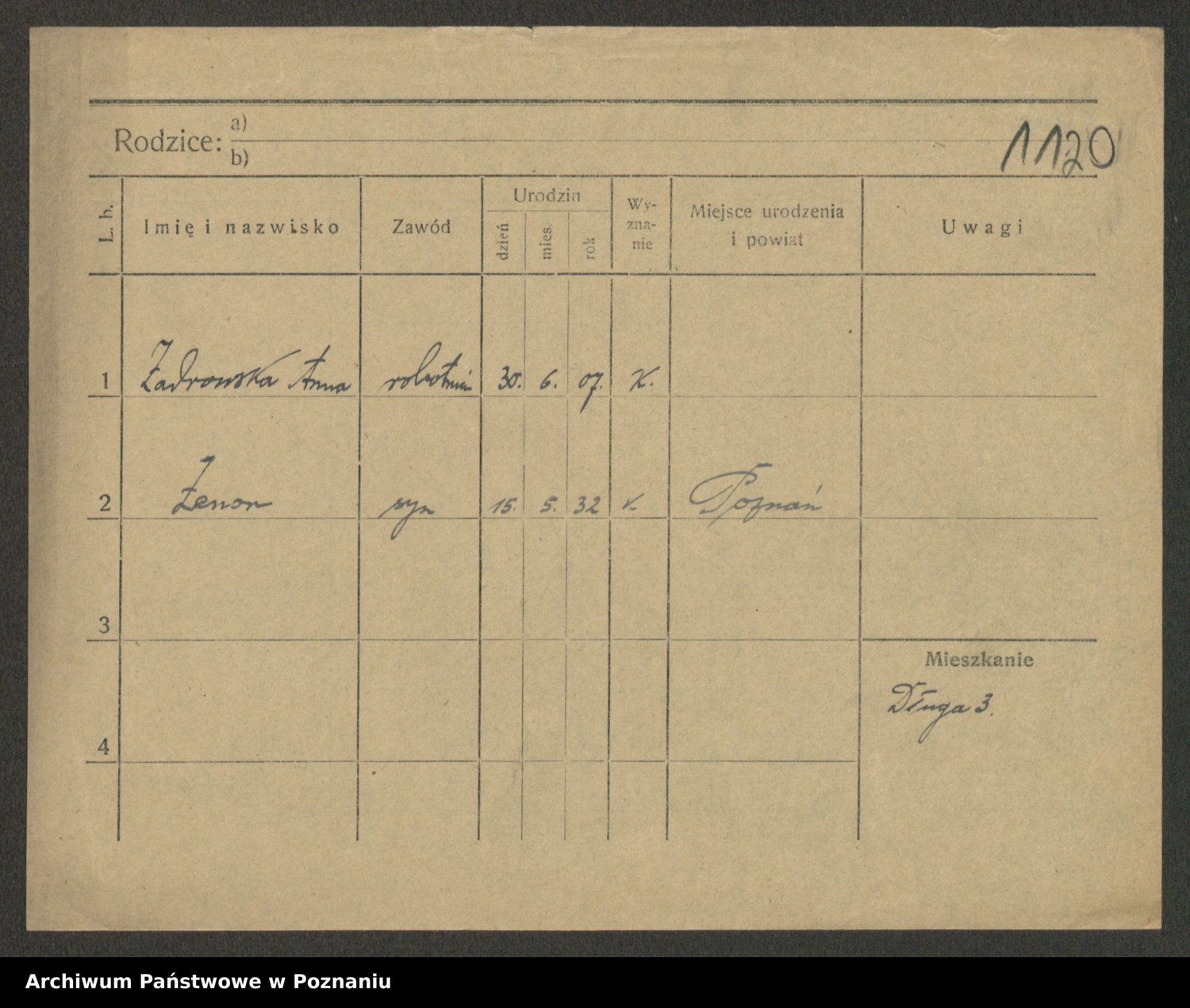 Podgląd karty osobowej dostępny jest po kliknięciu na nazwisko lub ikonkę karty. Można dokonywać powiększenia (ikony na górze) lub przechodzić między kolejnymi skanami (strzałki po bokach).