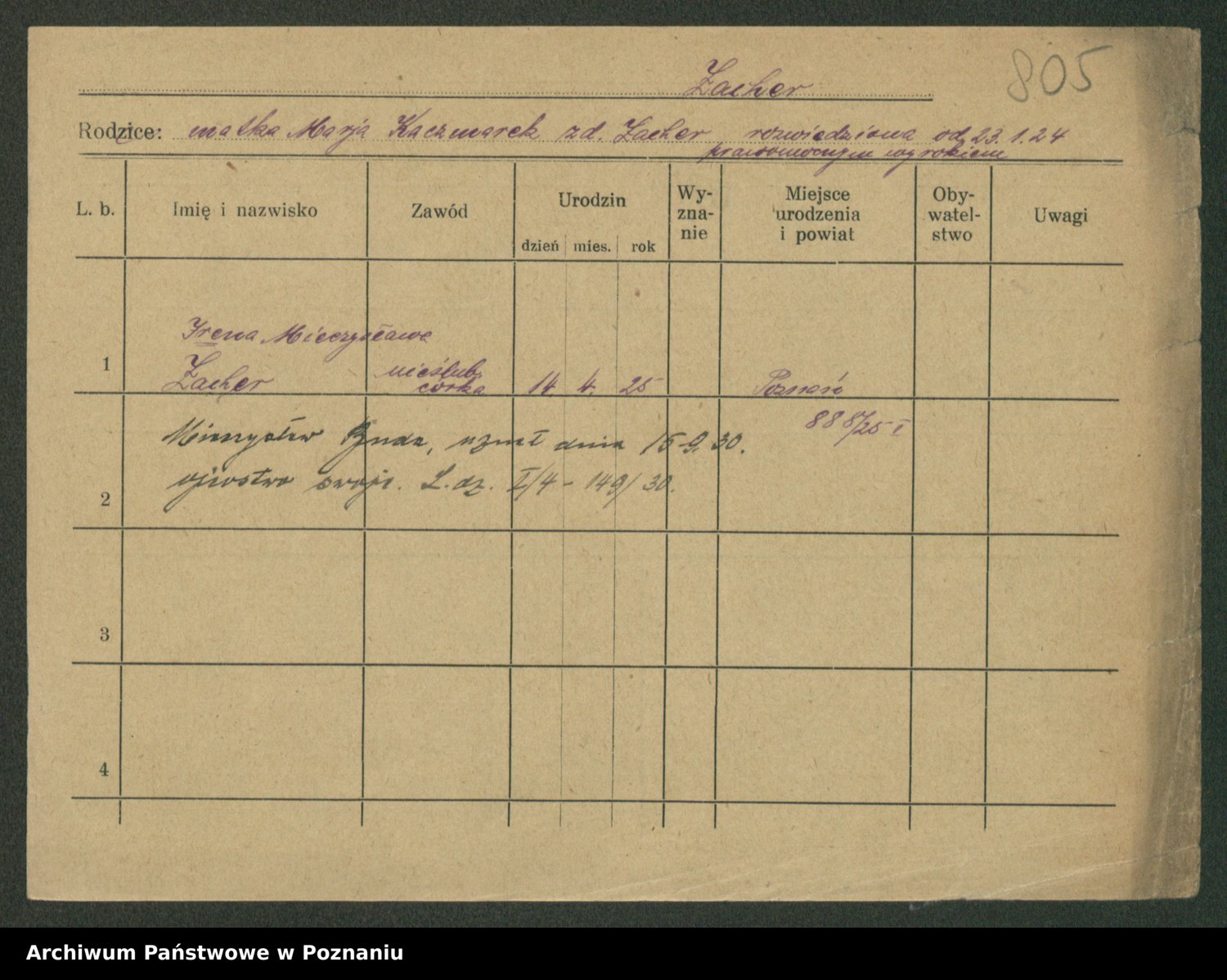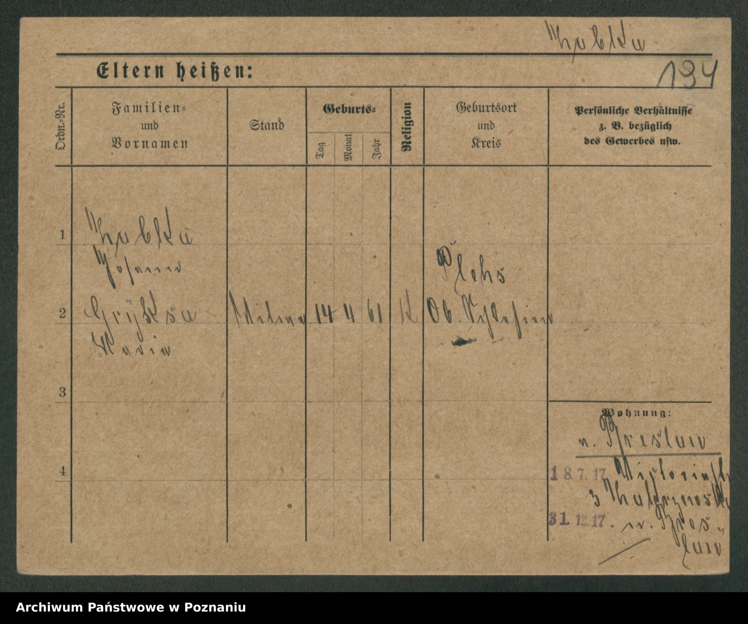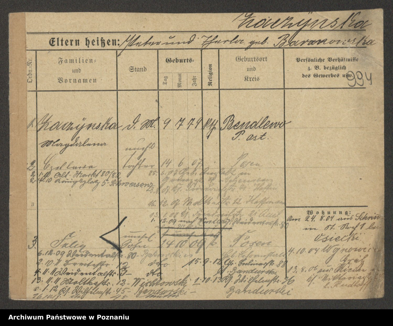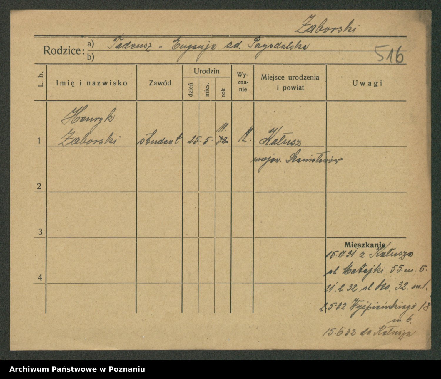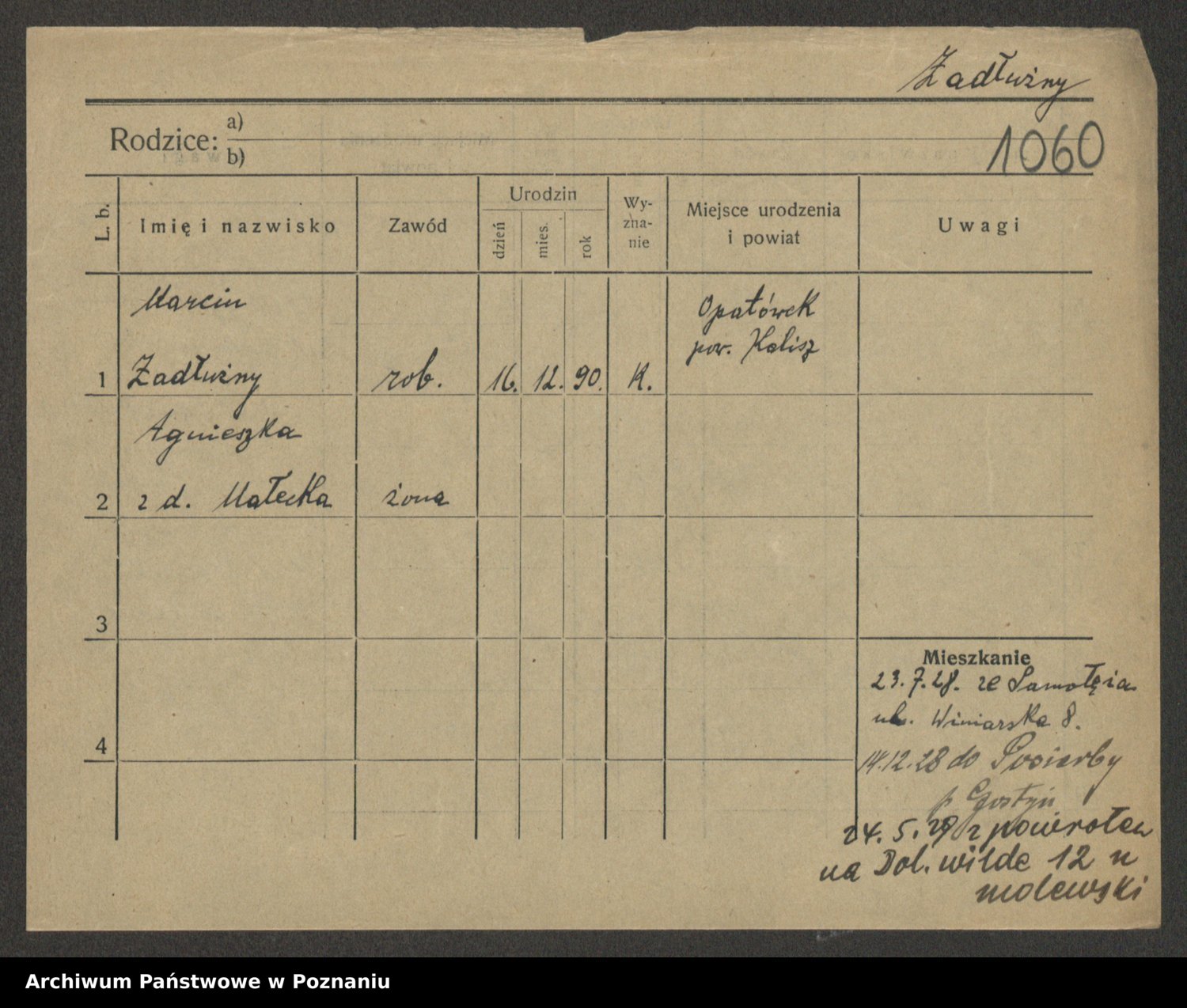 Podgląd karty osobowej dostępny jest po kliknięciu na nazwisko lub ikonkę karty. Można dokonywać powiększenia (ikony na górze) lub przechodzić między kolejnymi skanami (strzałki po bokach).