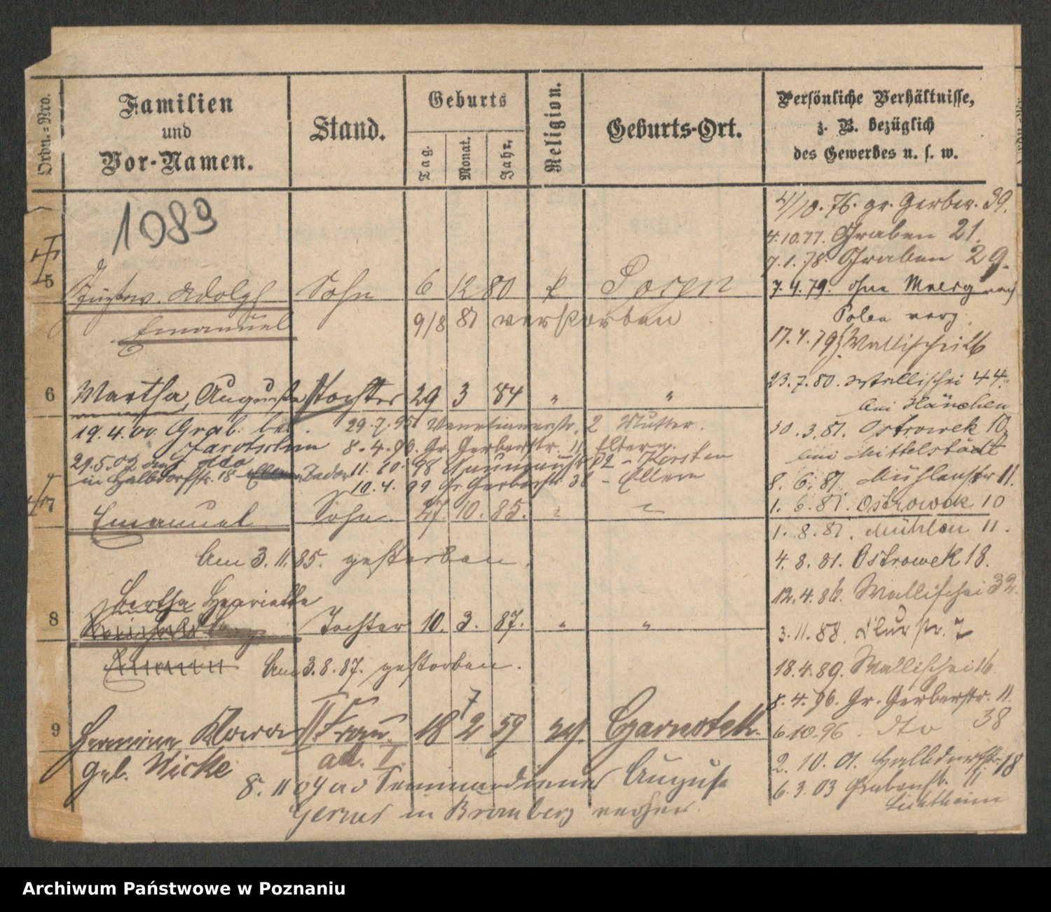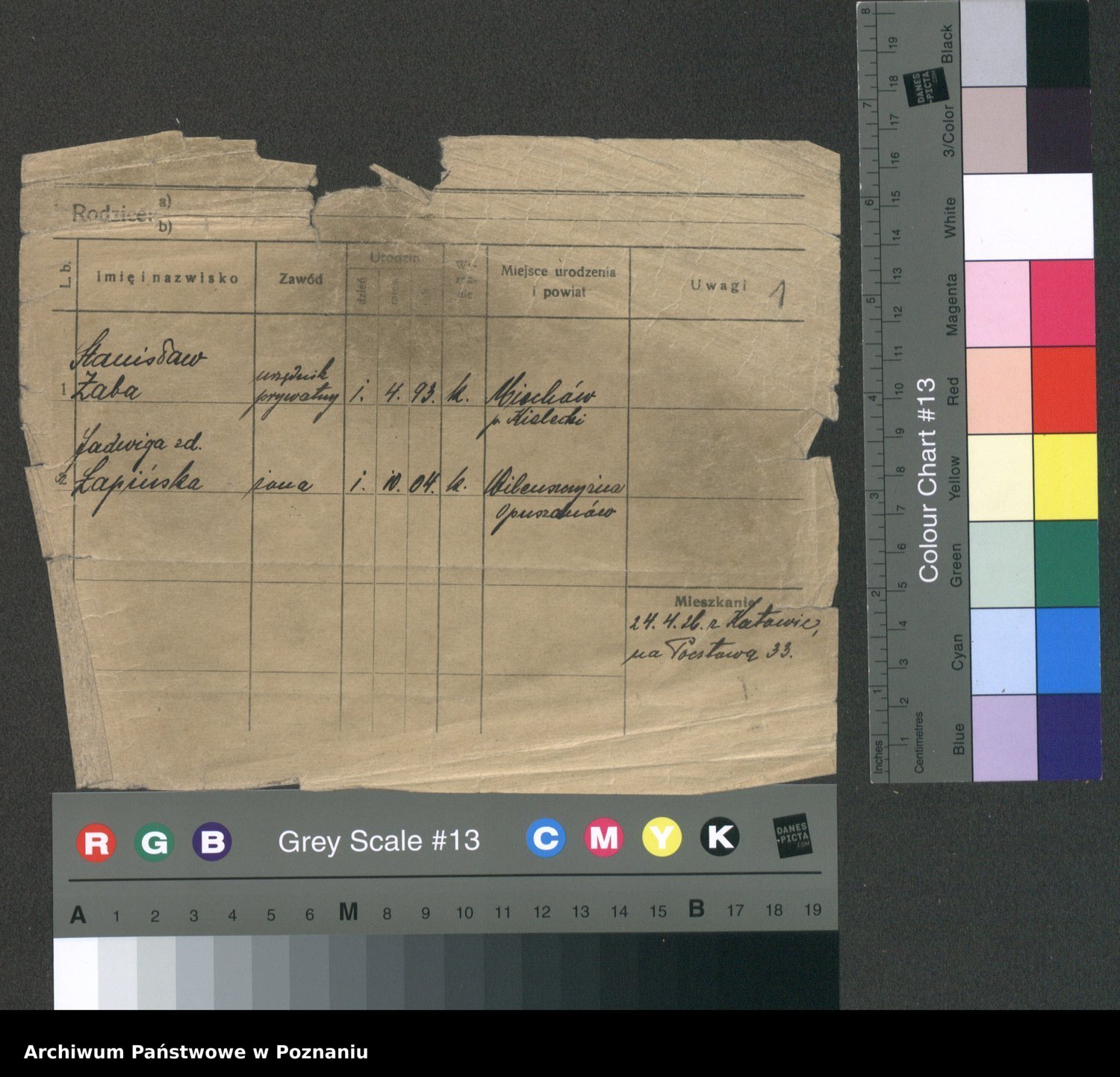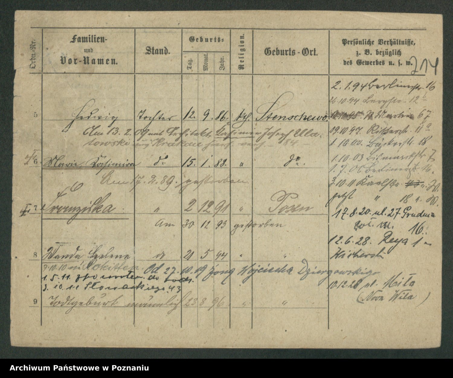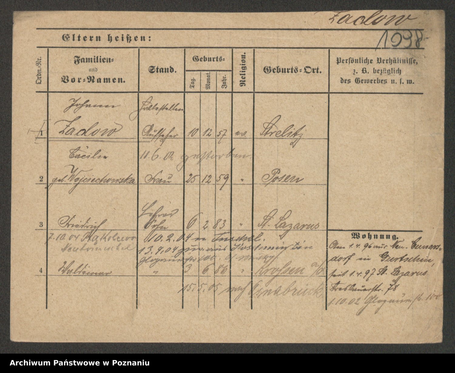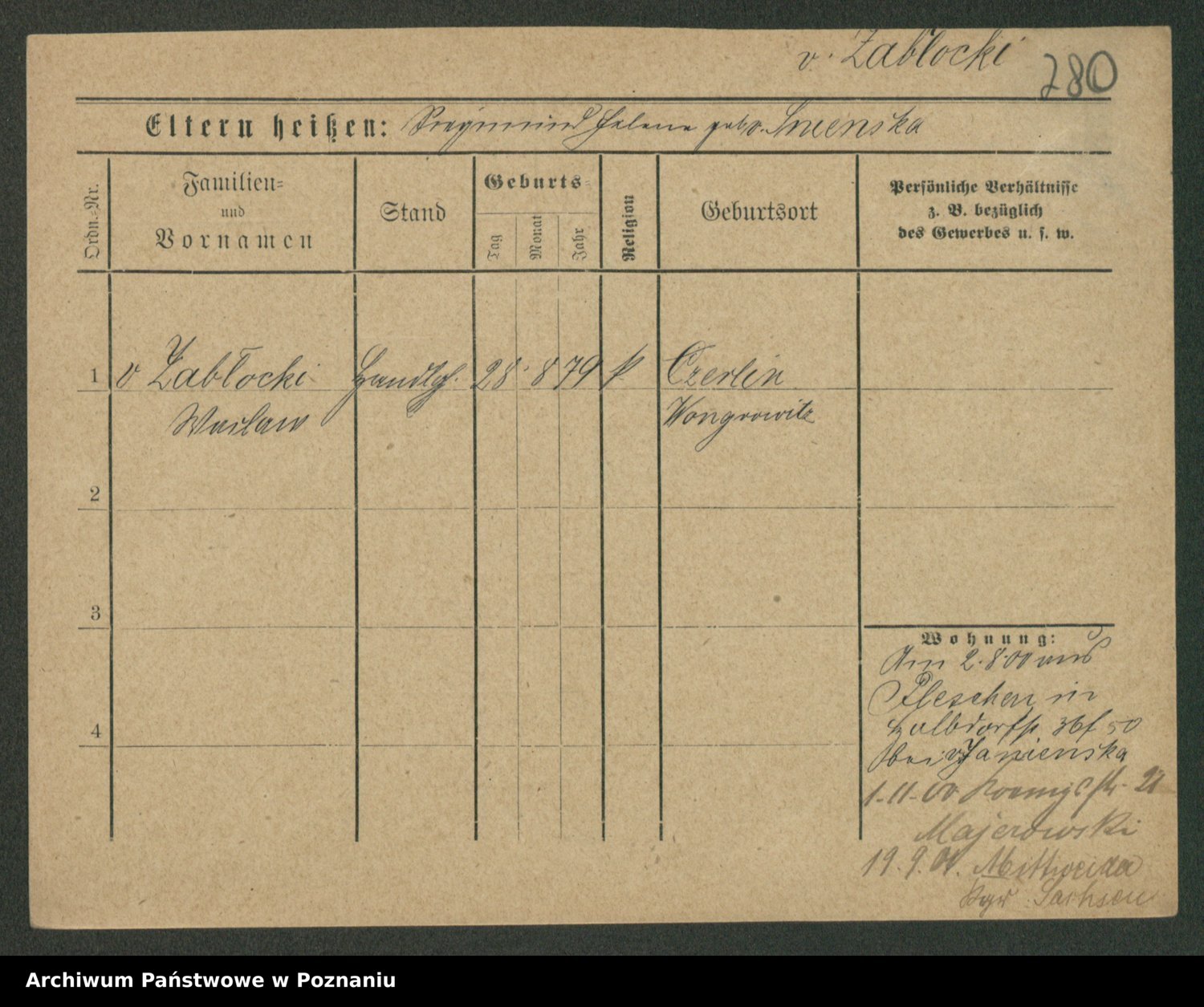 Podgląd karty osobowej dostępny jest po kliknięciu na nazwisko lub ikonkę karty. Można dokonywać powiększenia (ikony na górze) lub przechodzić między kolejnymi skanami (strzałki po bokach).