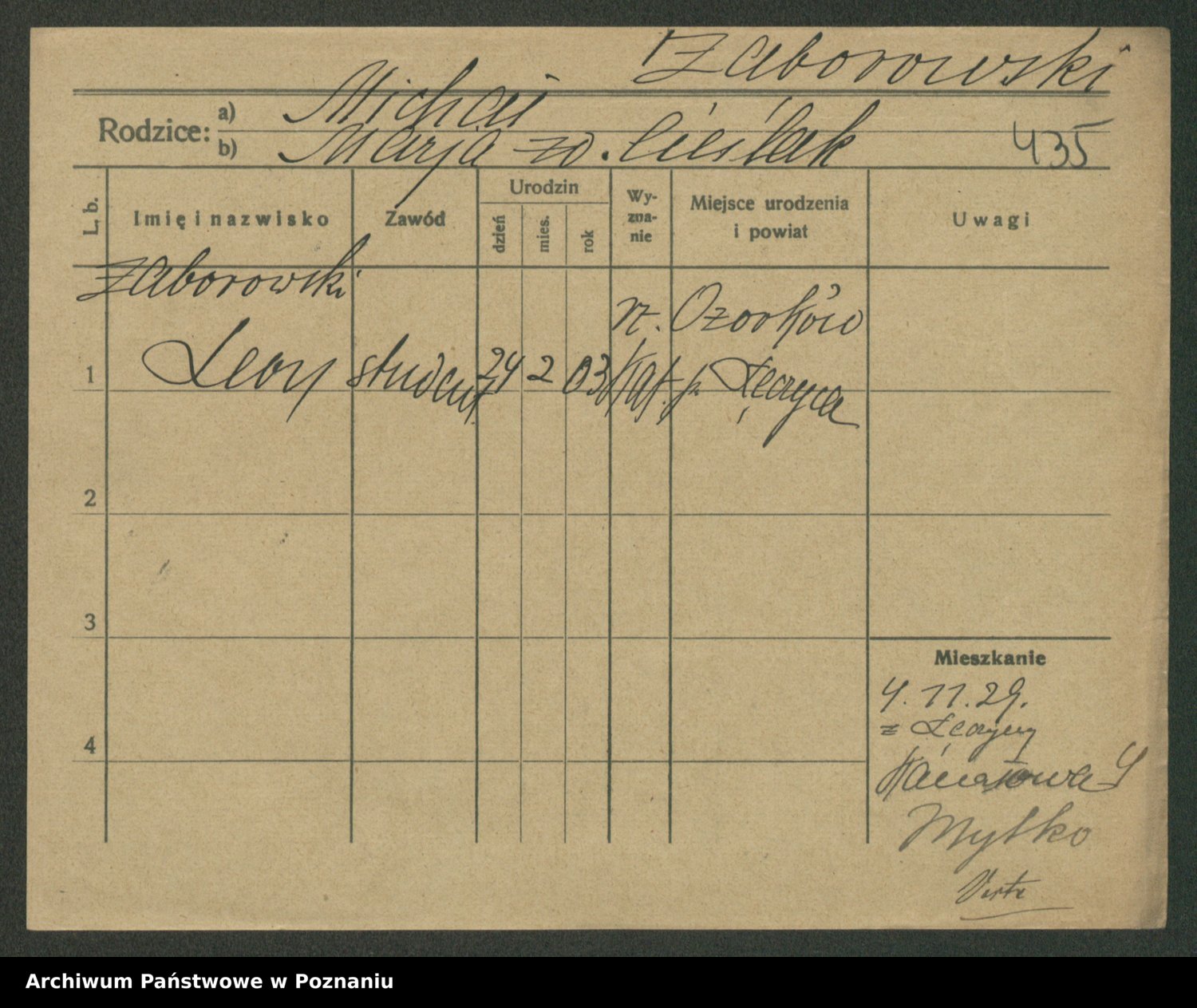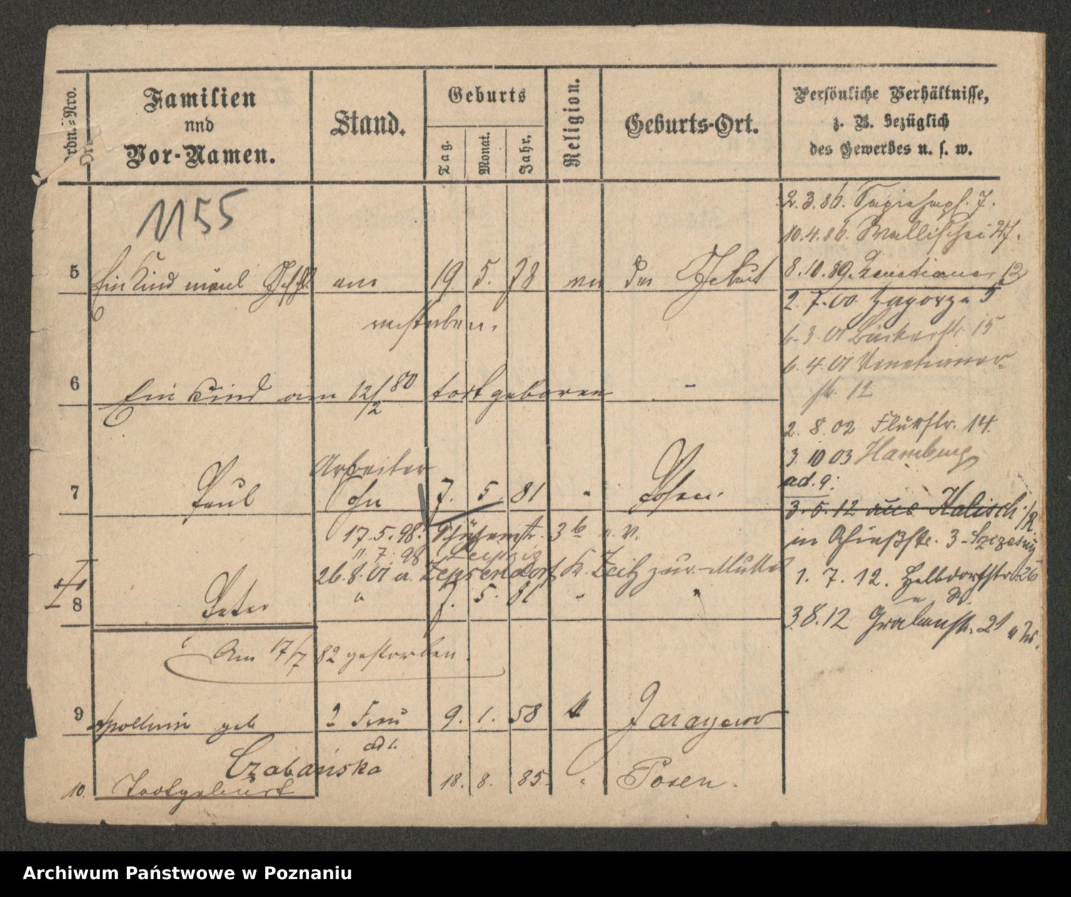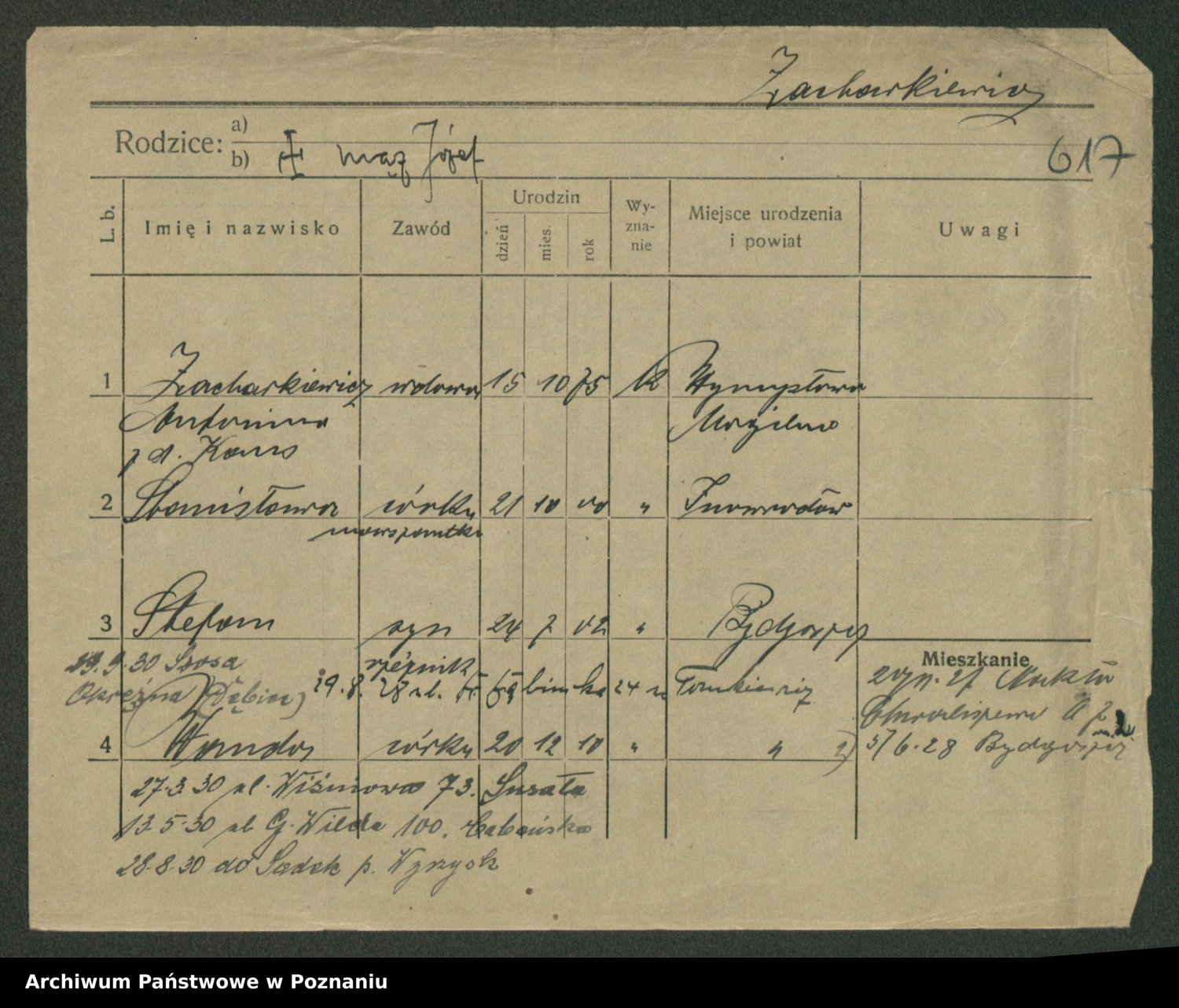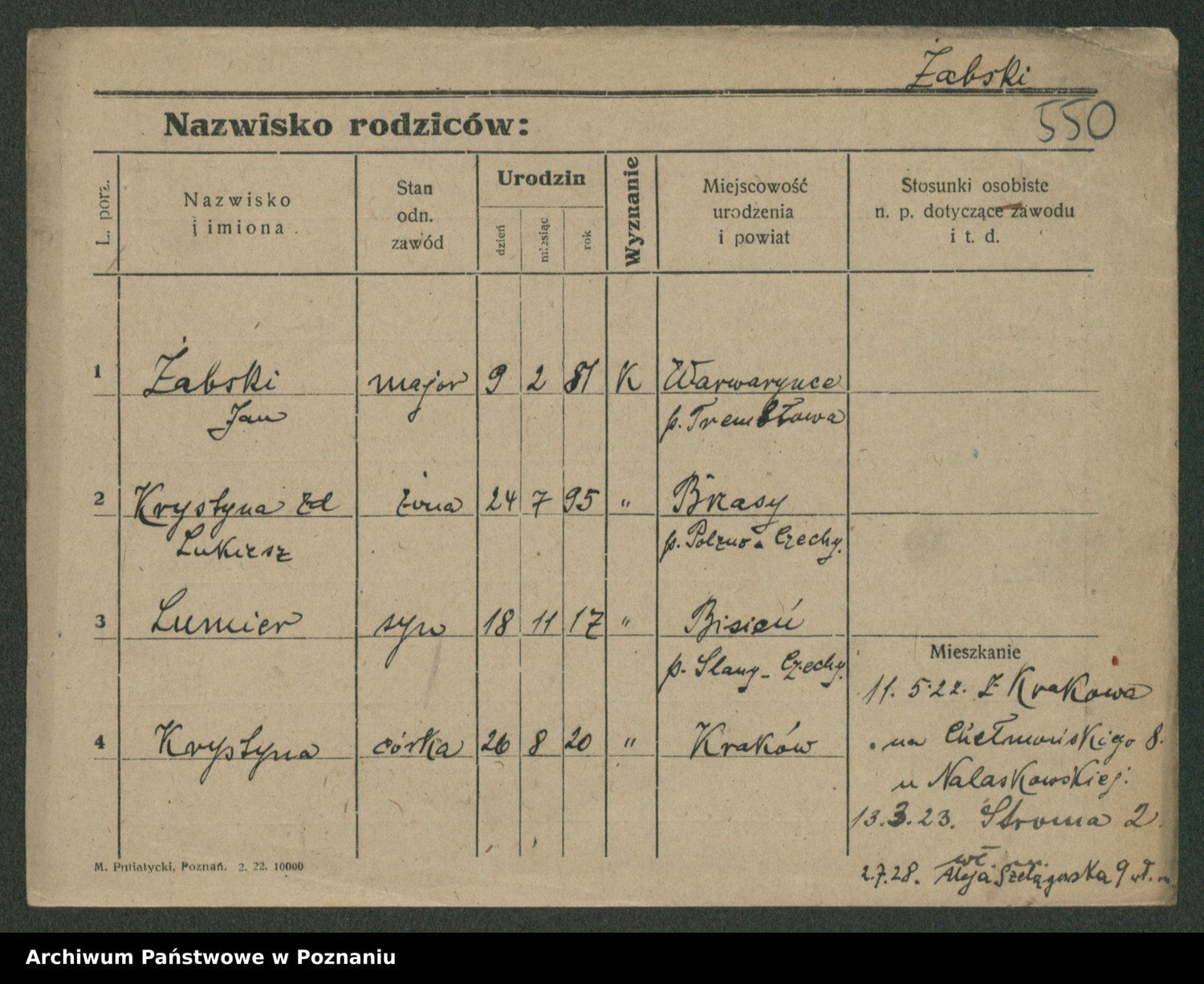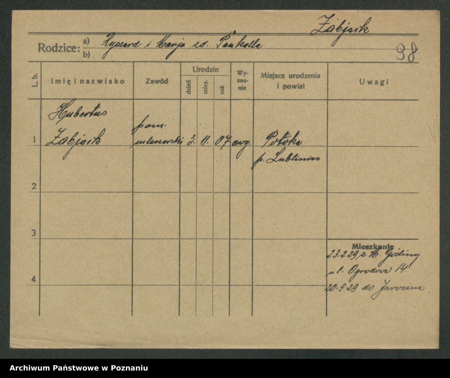 Podgląd karty osobowej dostępny jest po kliknięciu na nazwisko lub ikonkę karty. Można dokonywać powiększenia (ikony na górze) lub przechodzić między kolejnymi skanami (strzałki po bokach).