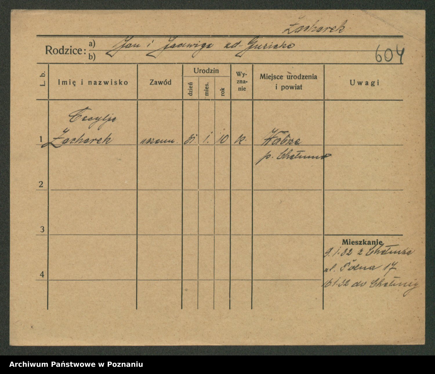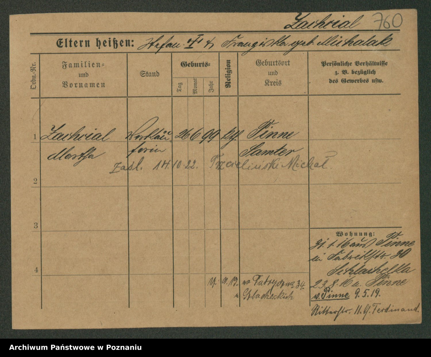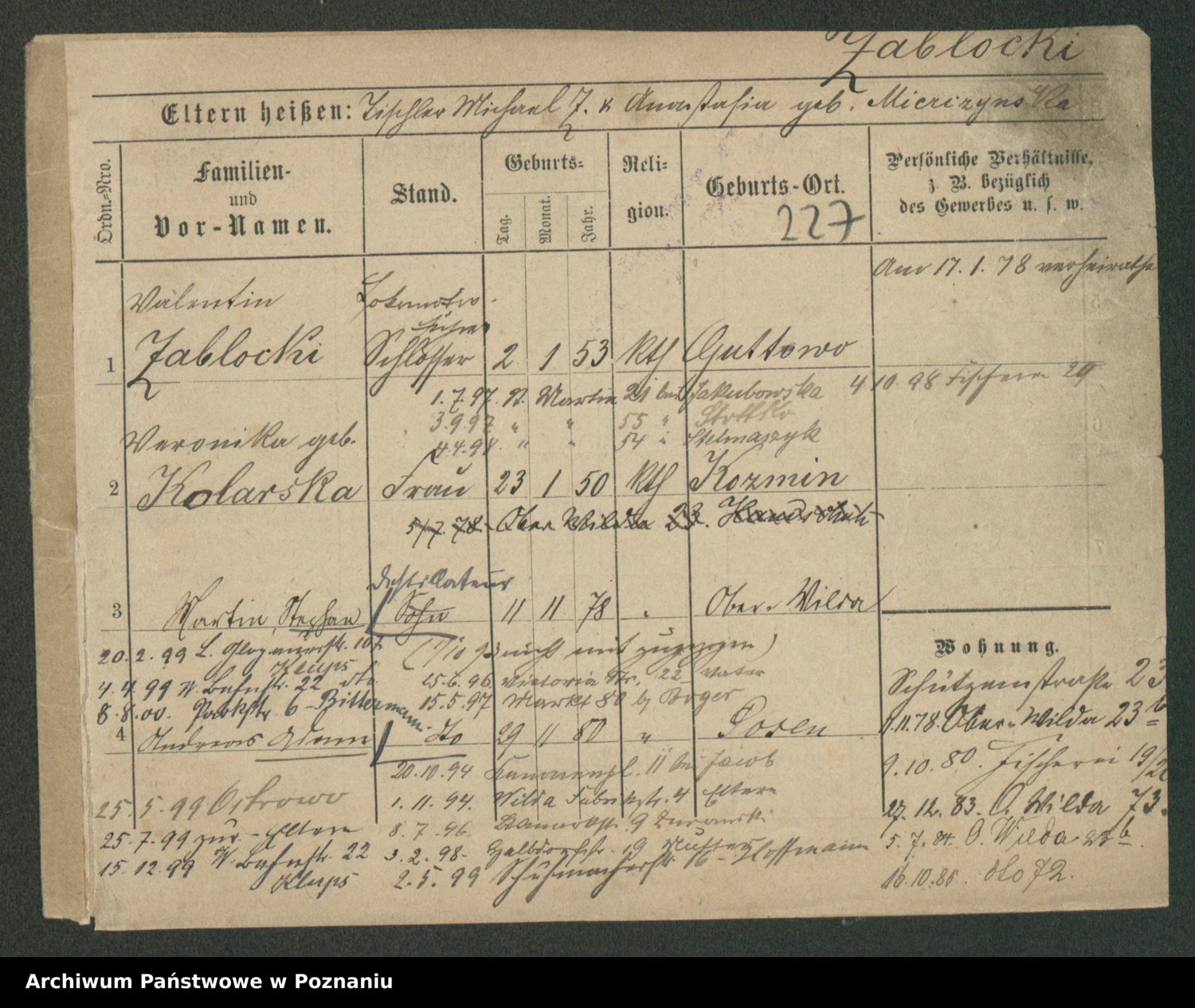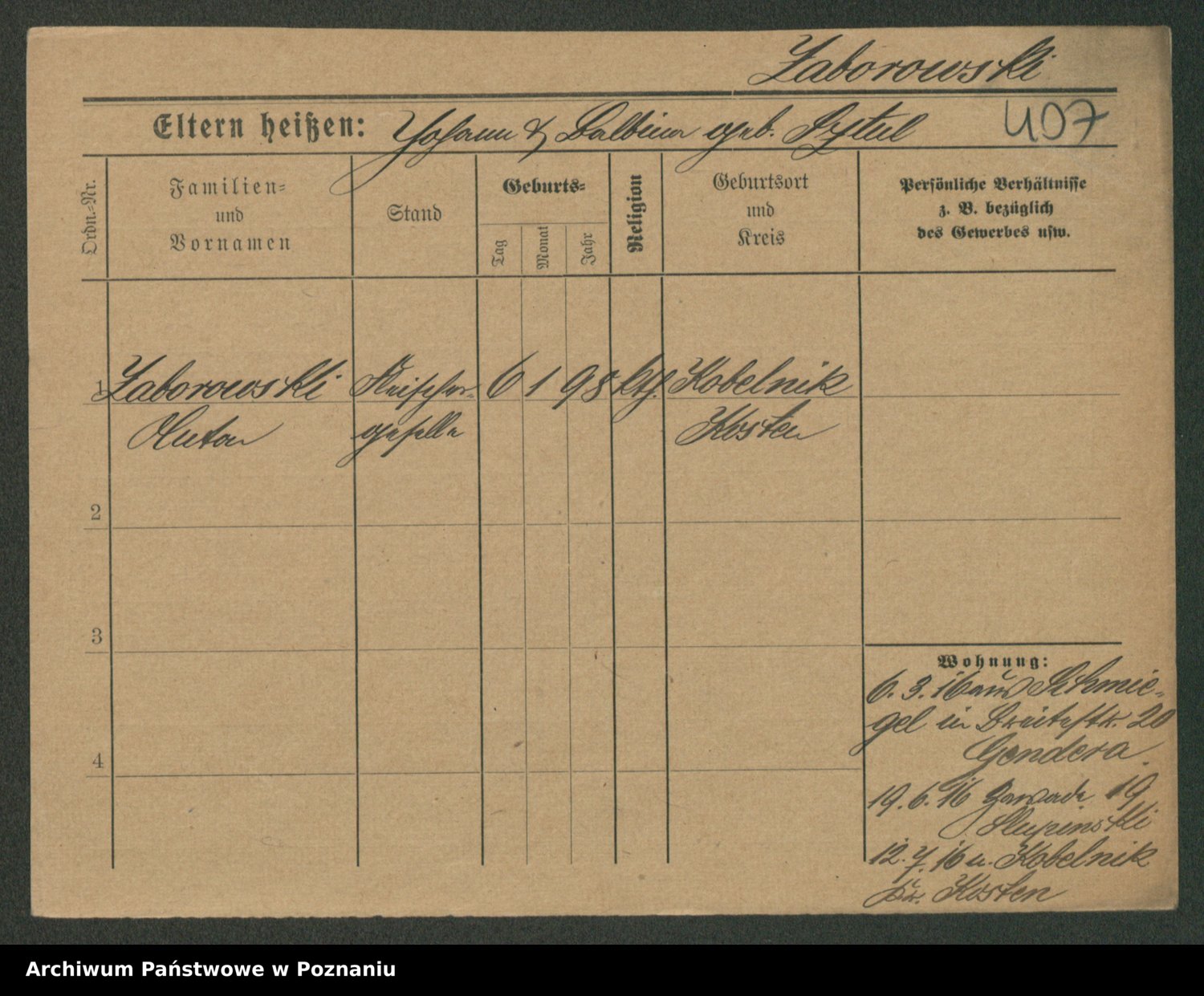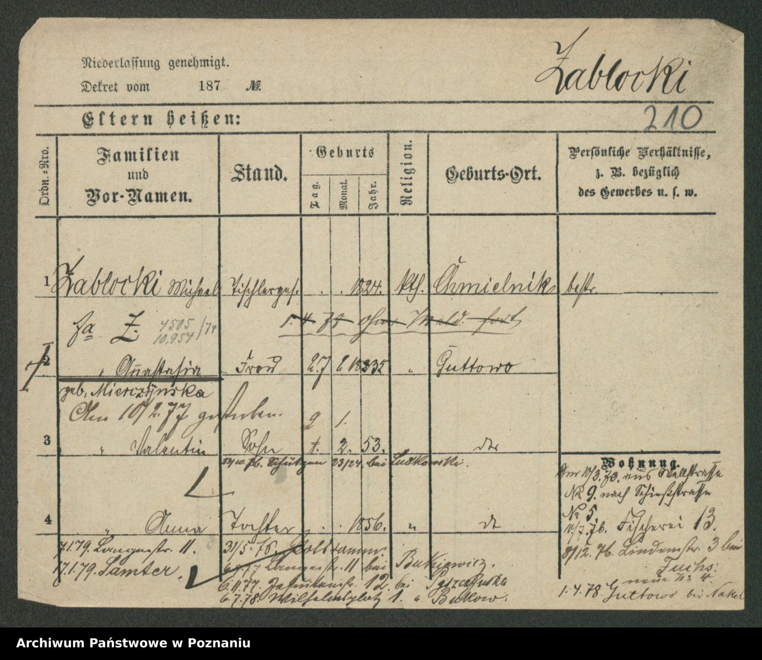 Podgląd karty osobowej dostępny jest po kliknięciu na nazwisko lub ikonkę karty. Można dokonywać powiększenia (ikony na górze) lub przechodzić między kolejnymi skanami (strzałki po bokach).