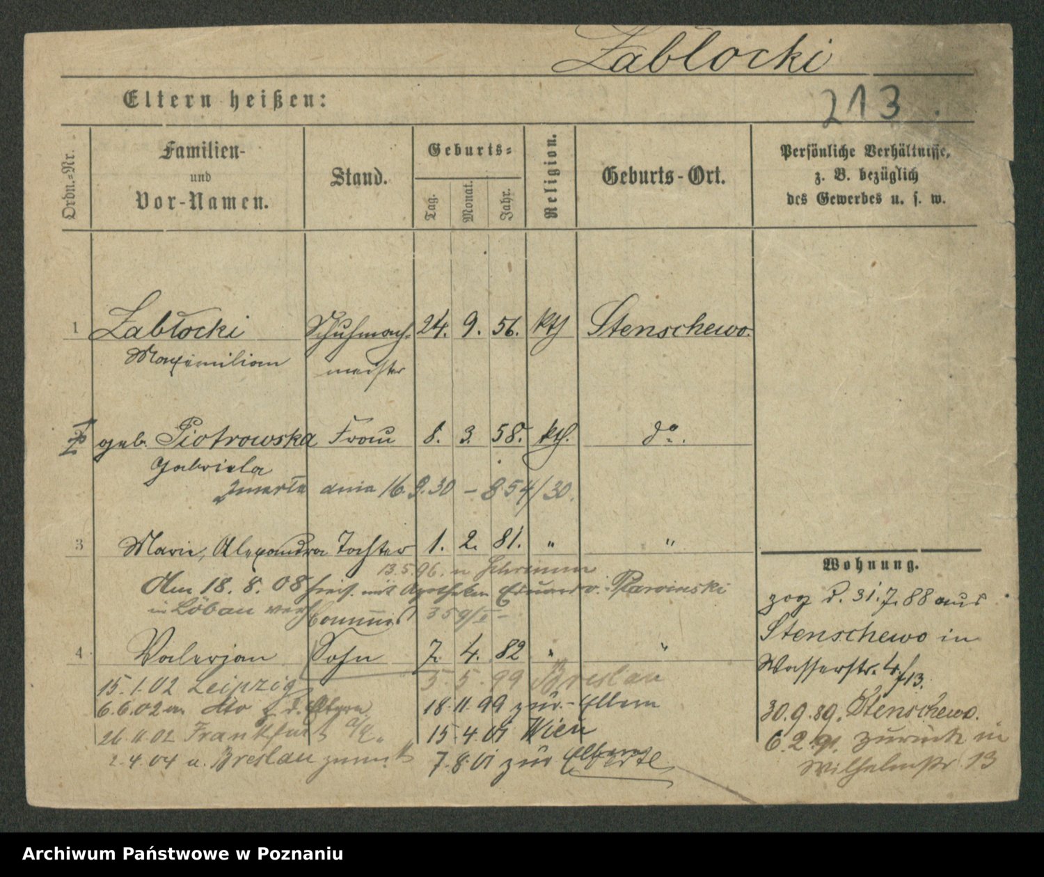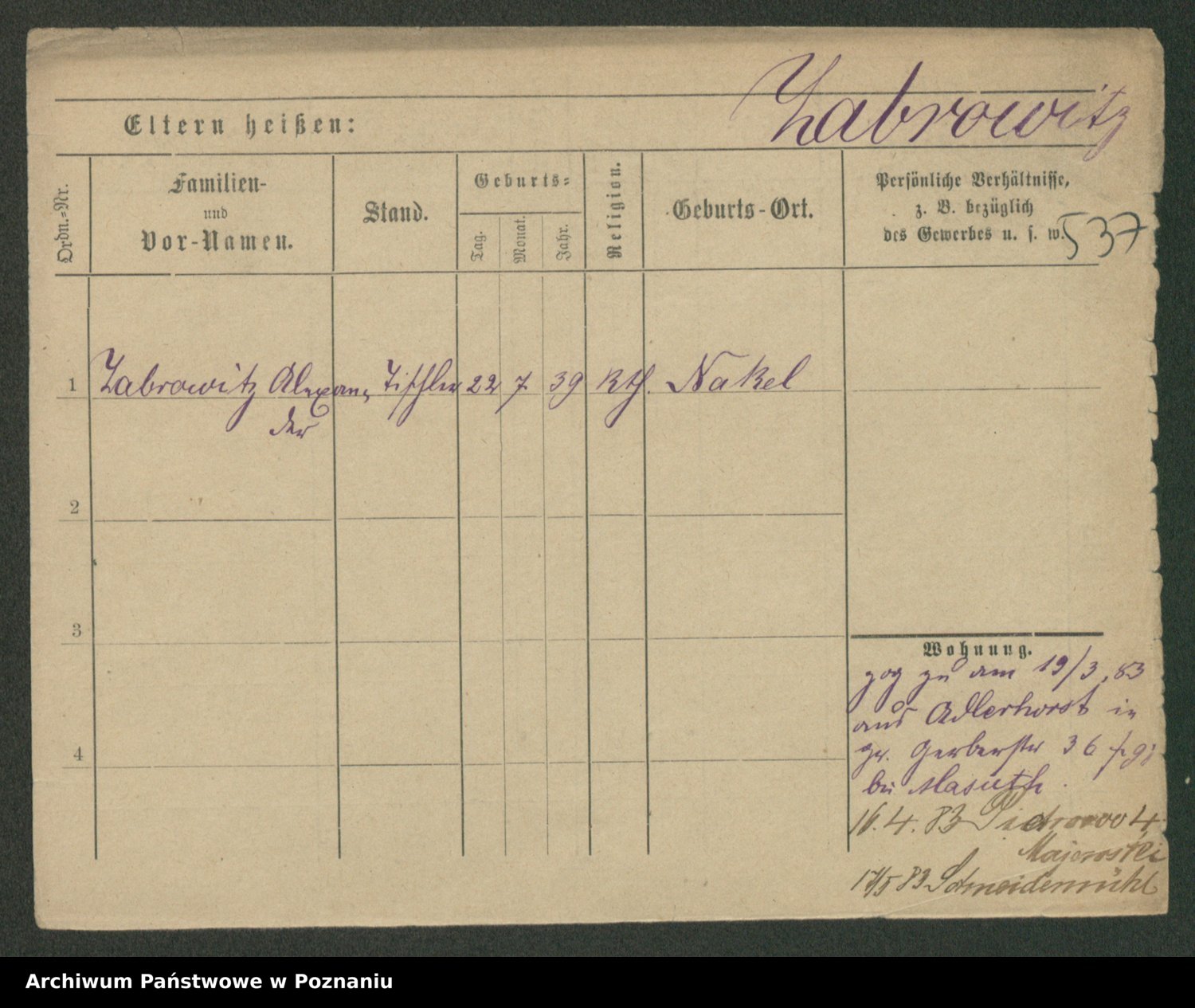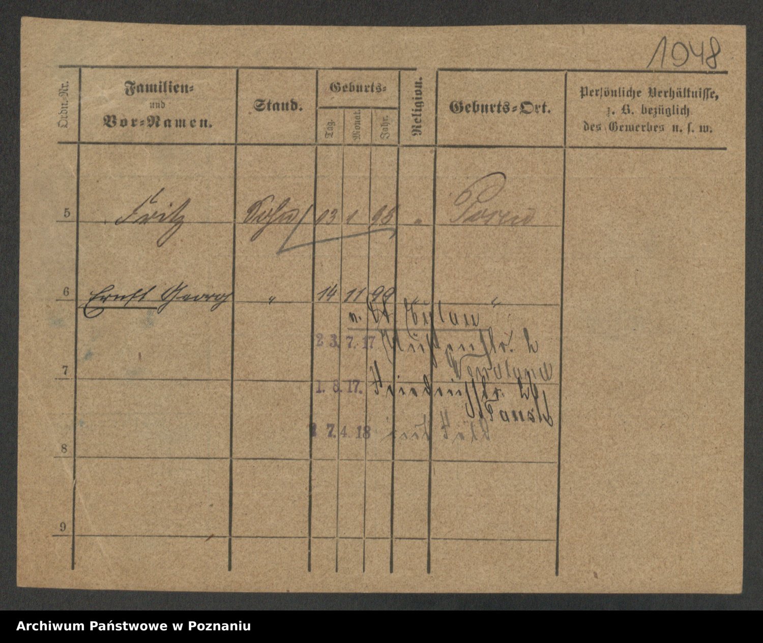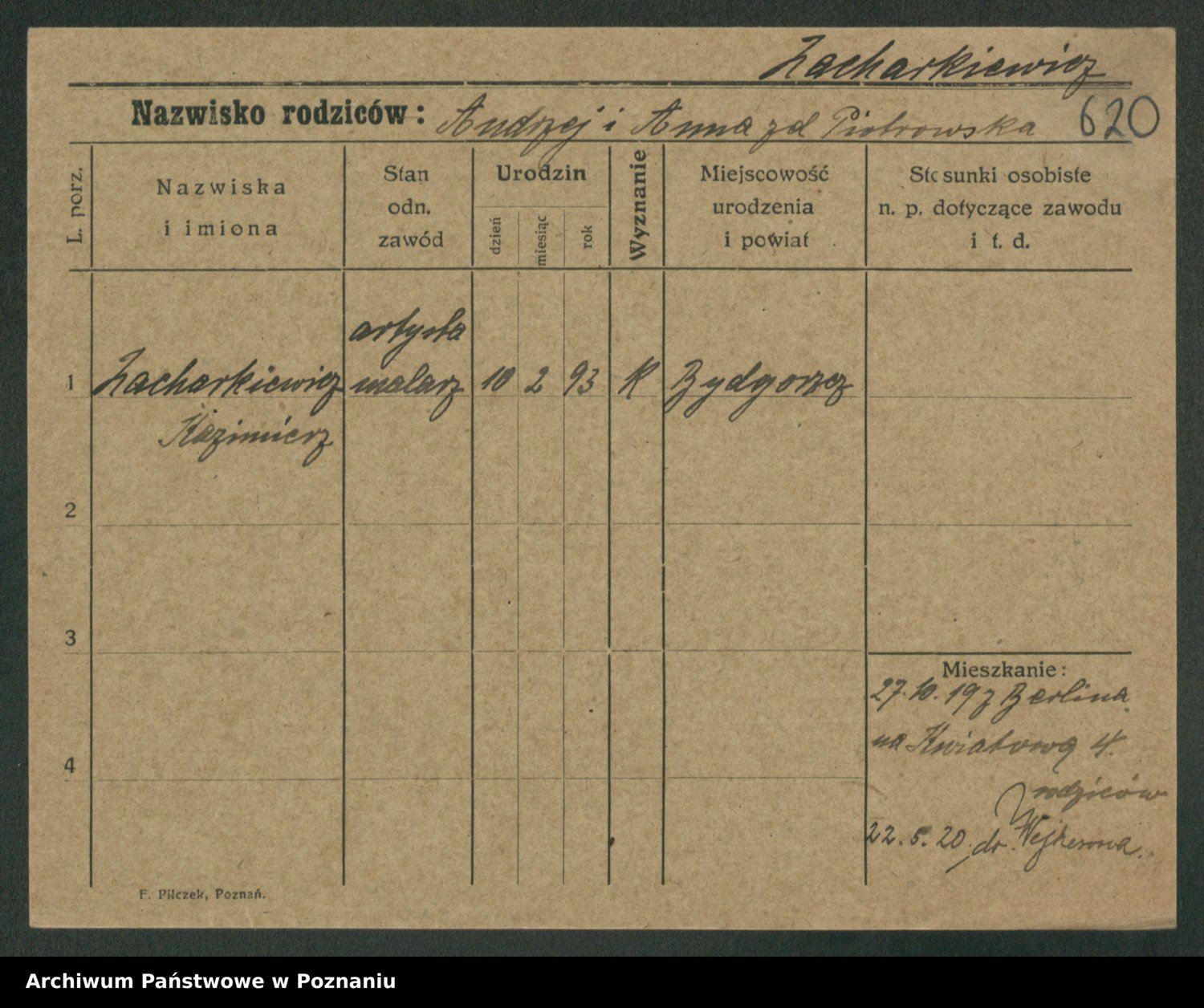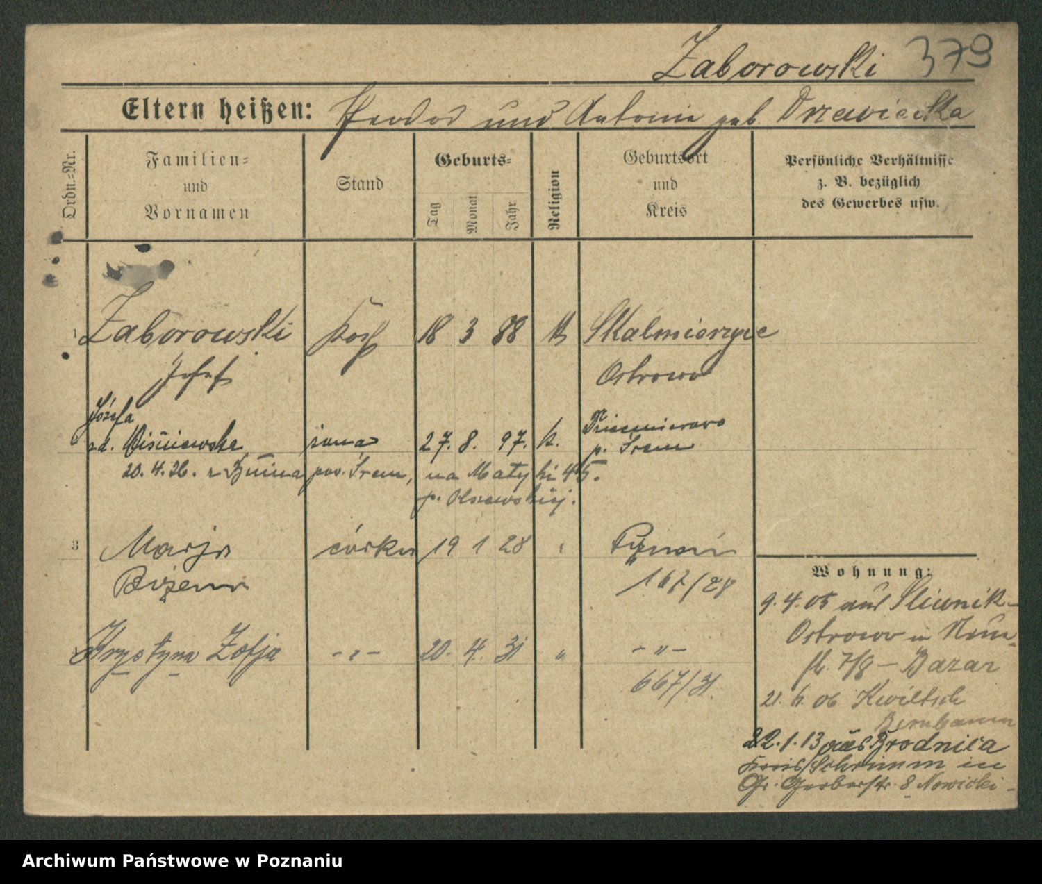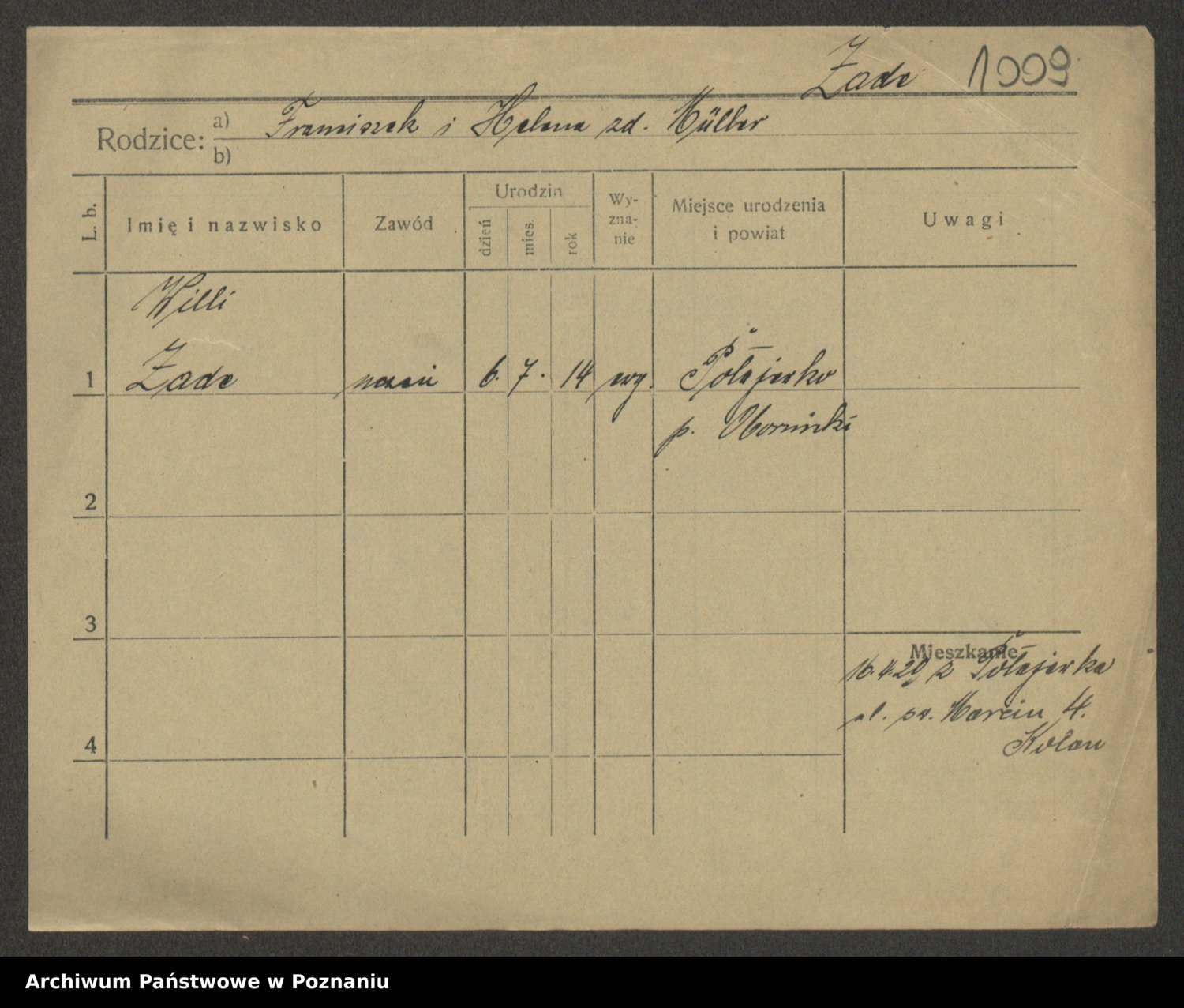 Podgląd karty osobowej dostępny jest po kliknięciu na nazwisko lub ikonkę karty. Można dokonywać powiększenia (ikony na górze) lub przechodzić między kolejnymi skanami (strzałki po bokach).