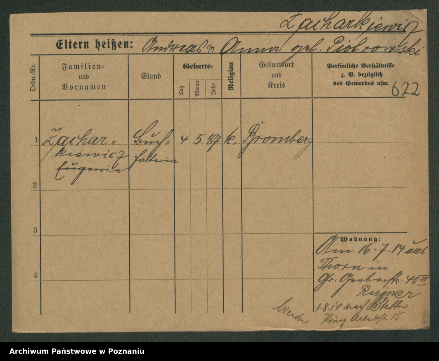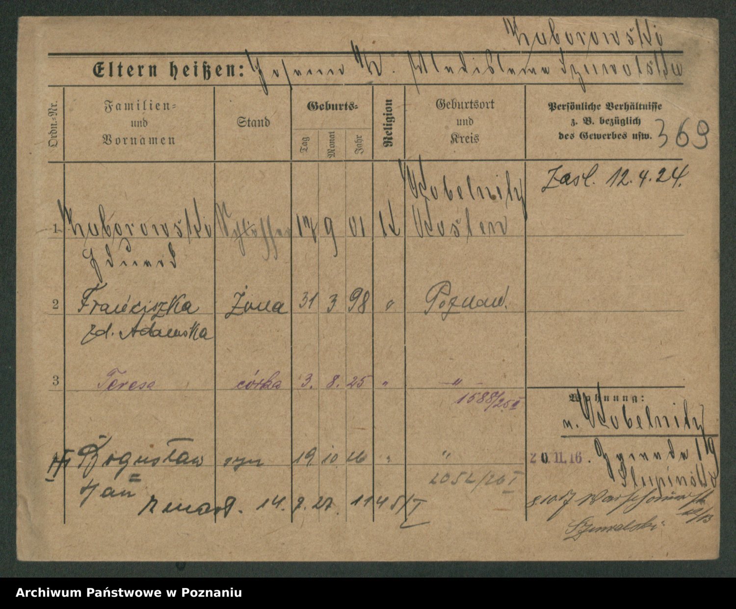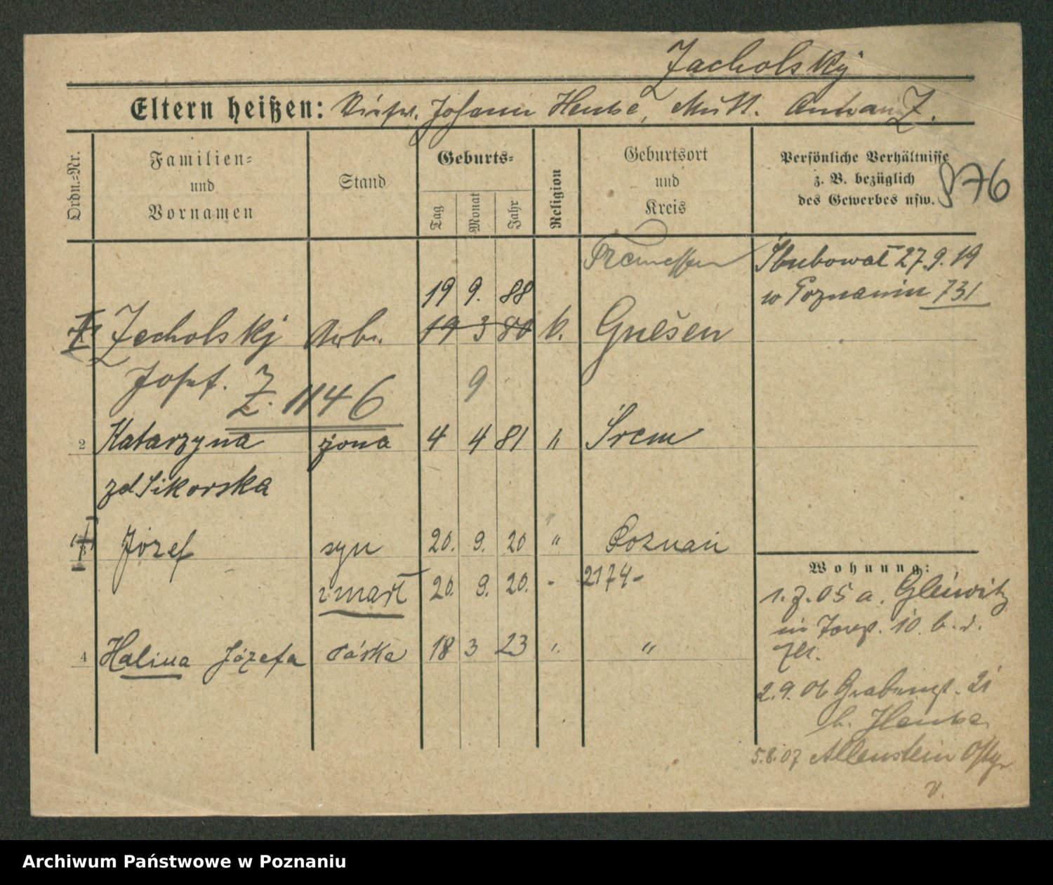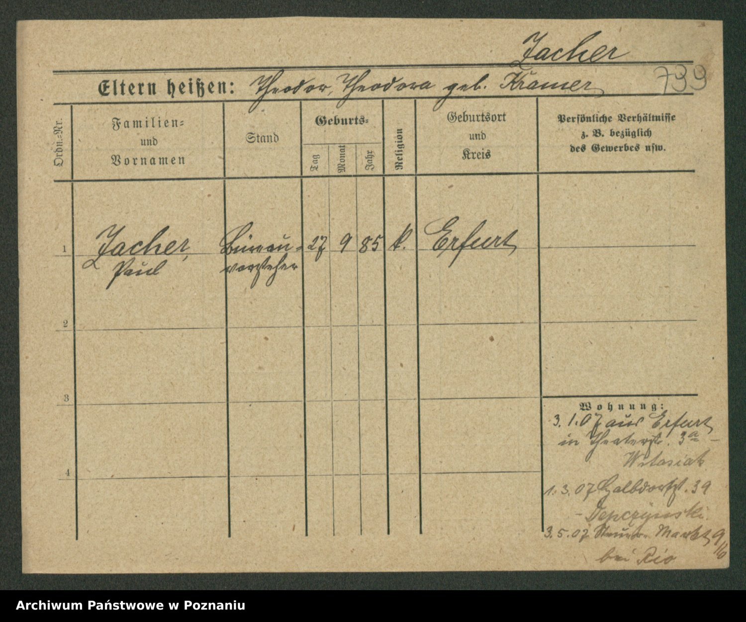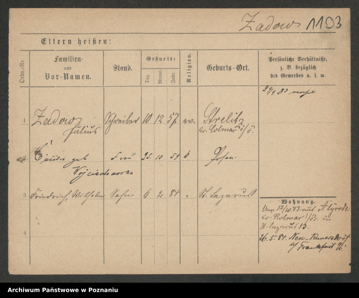 Podgląd karty osobowej dostępny jest po kliknięciu na nazwisko lub ikonkę karty. Można dokonywać powiększenia (ikony na górze) lub przechodzić między kolejnymi skanami (strzałki po bokach).