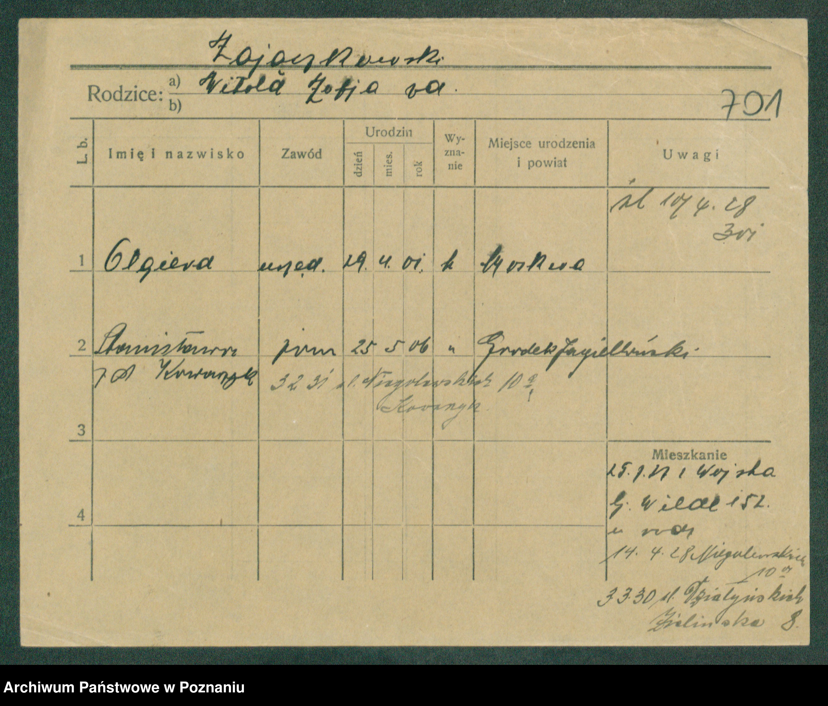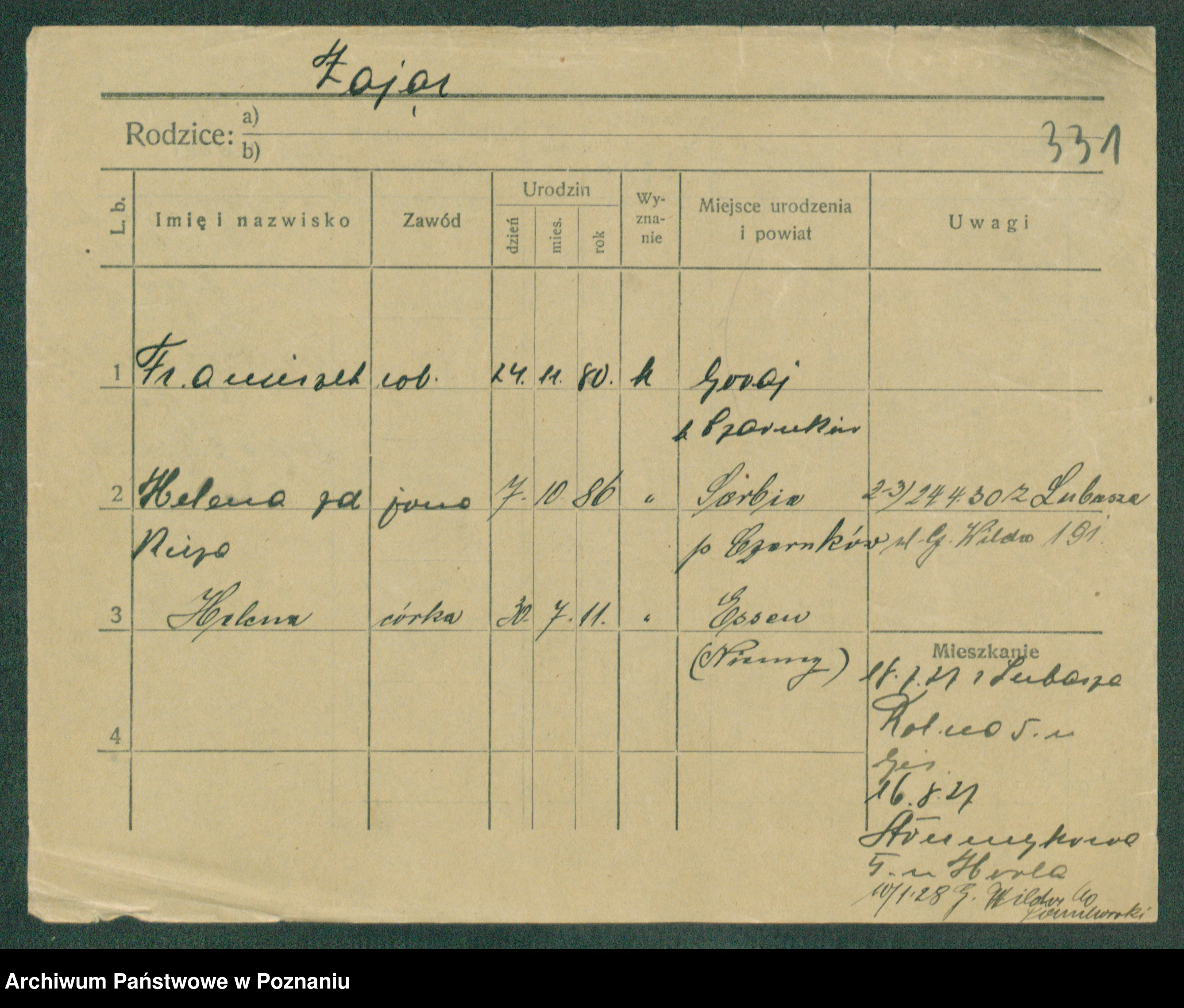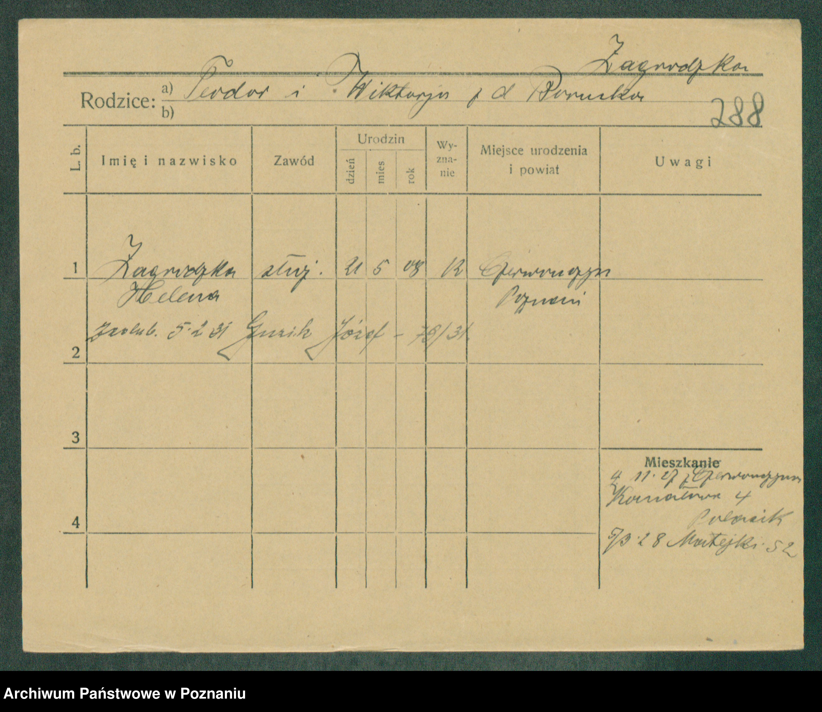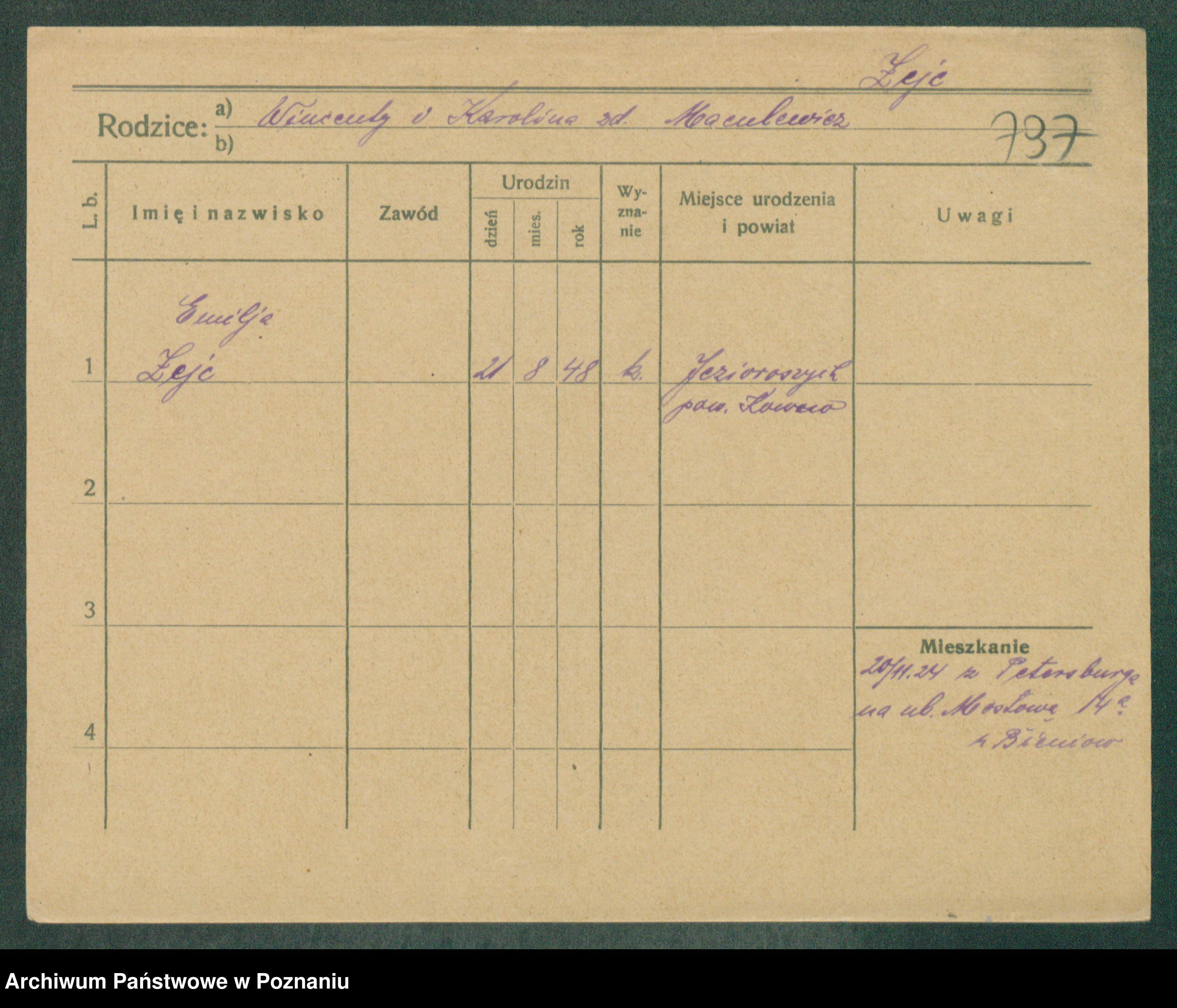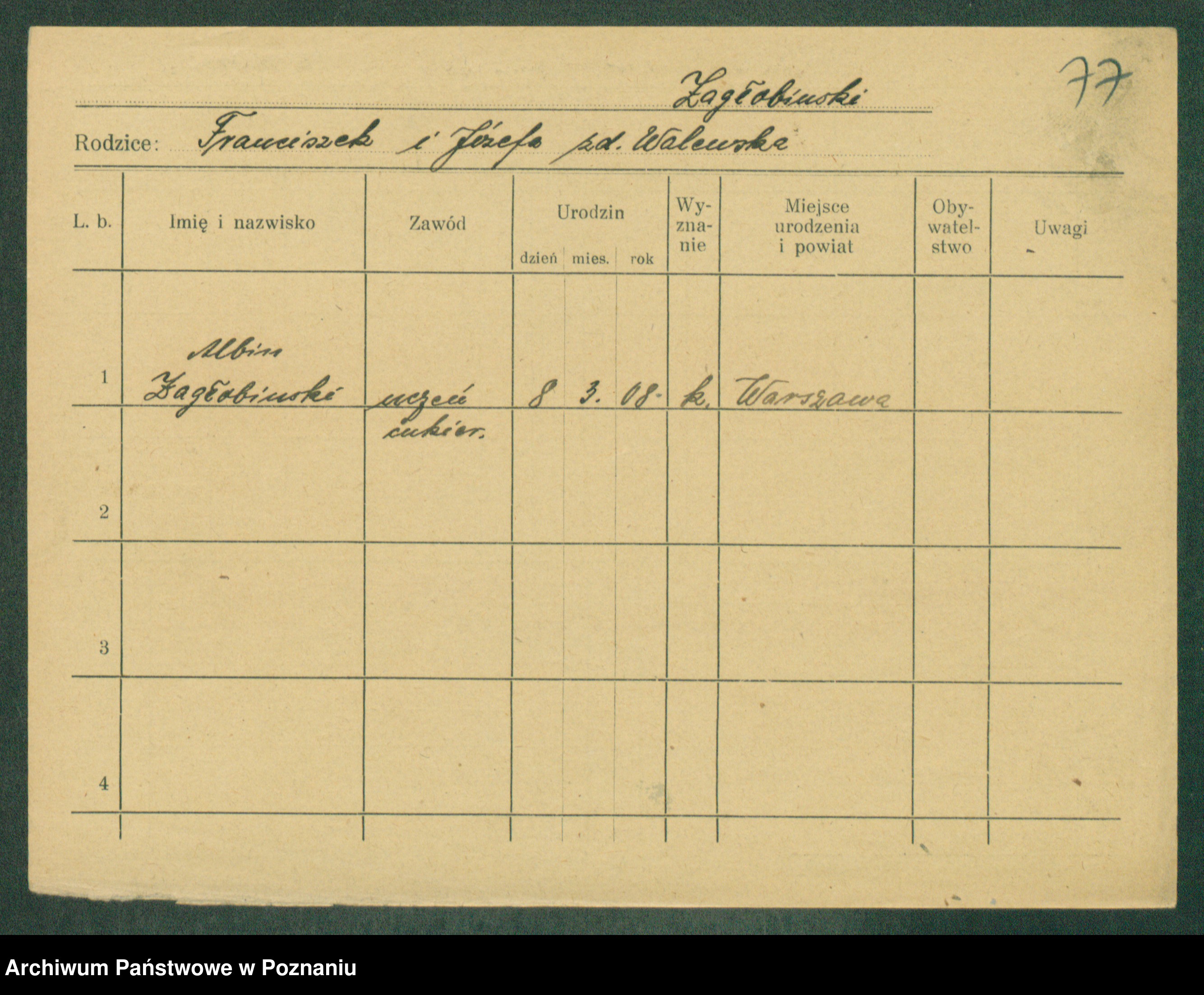 Podgląd karty osobowej dostępny jest po kliknięciu na nazwisko lub ikonkę karty. Można dokonywać powiększenia (ikony na górze) lub przechodzić między kolejnymi skanami (strzałki po bokach).