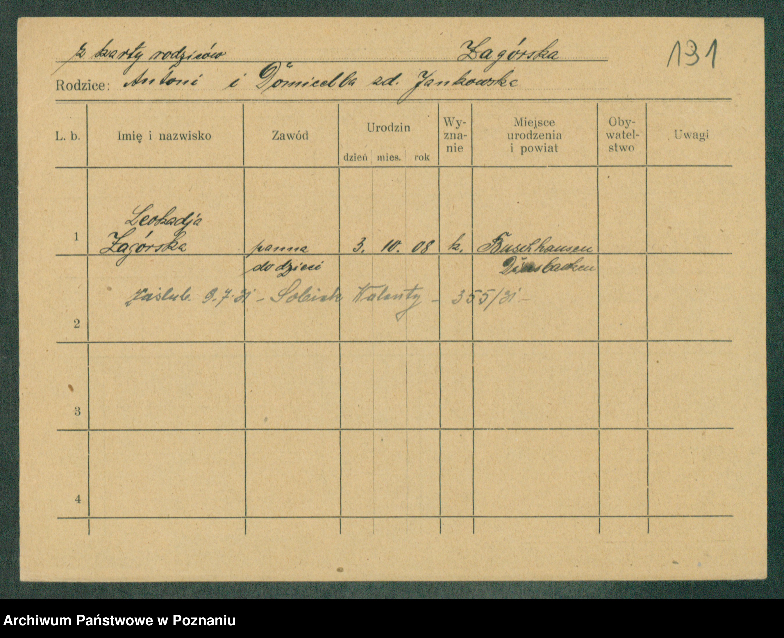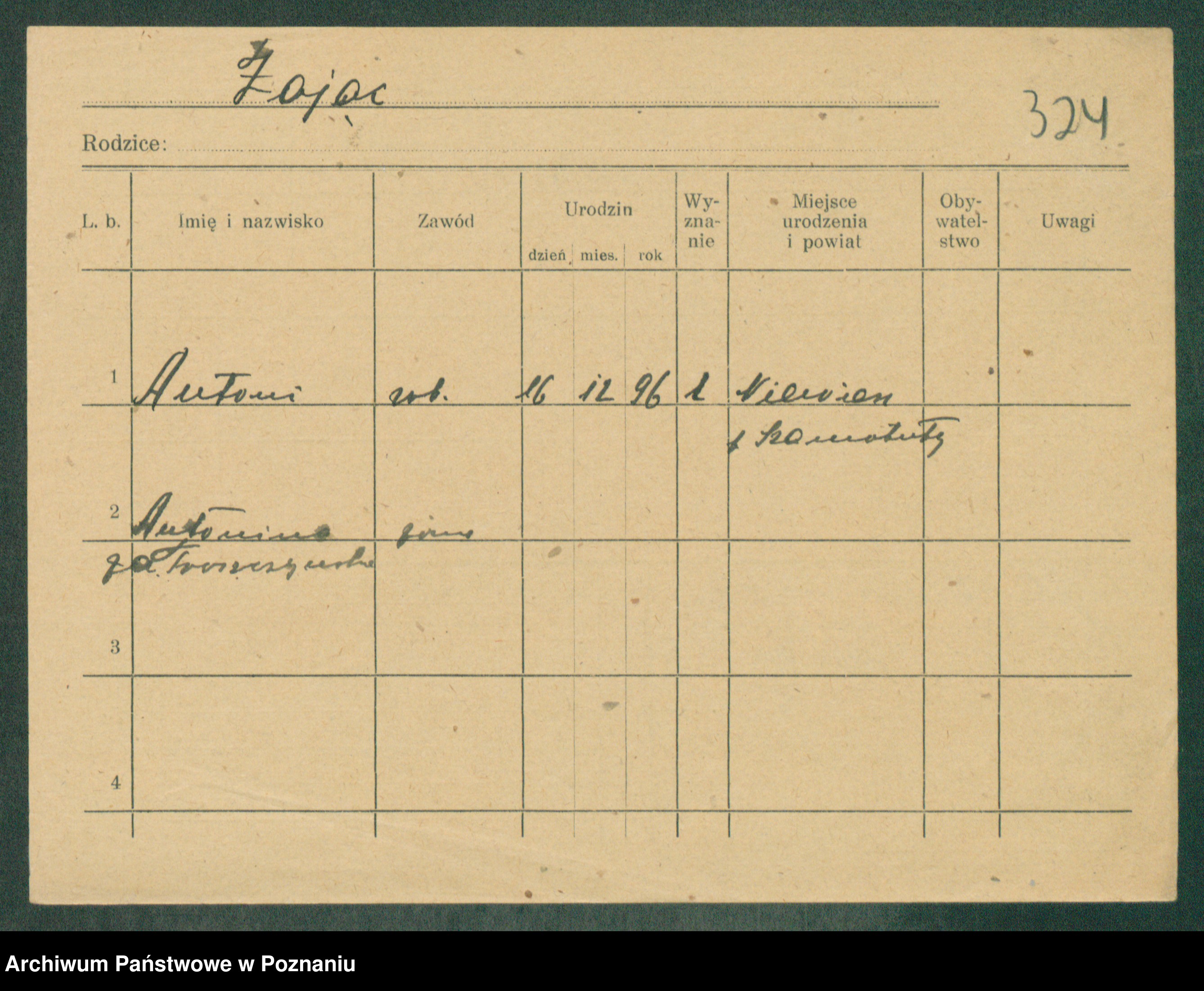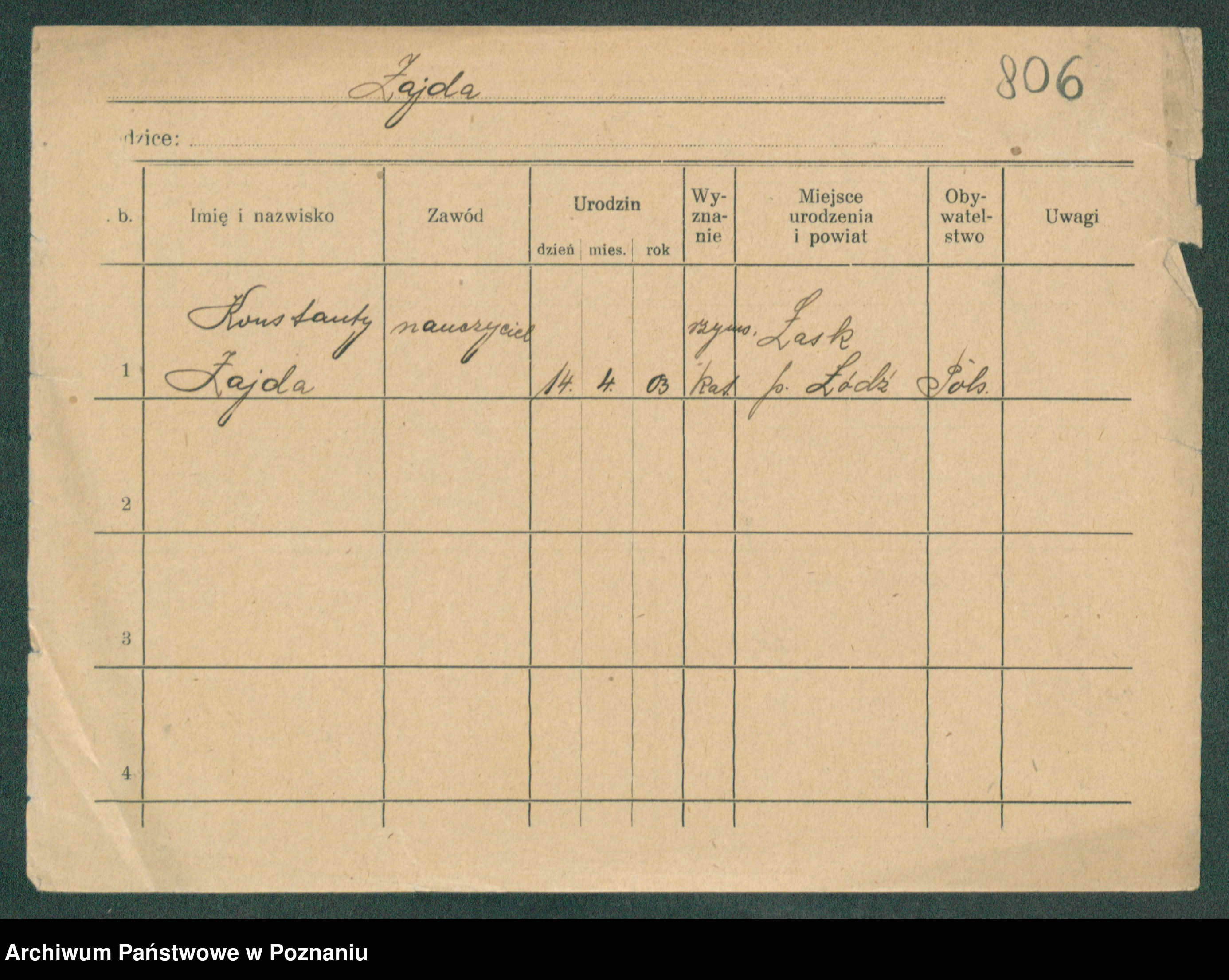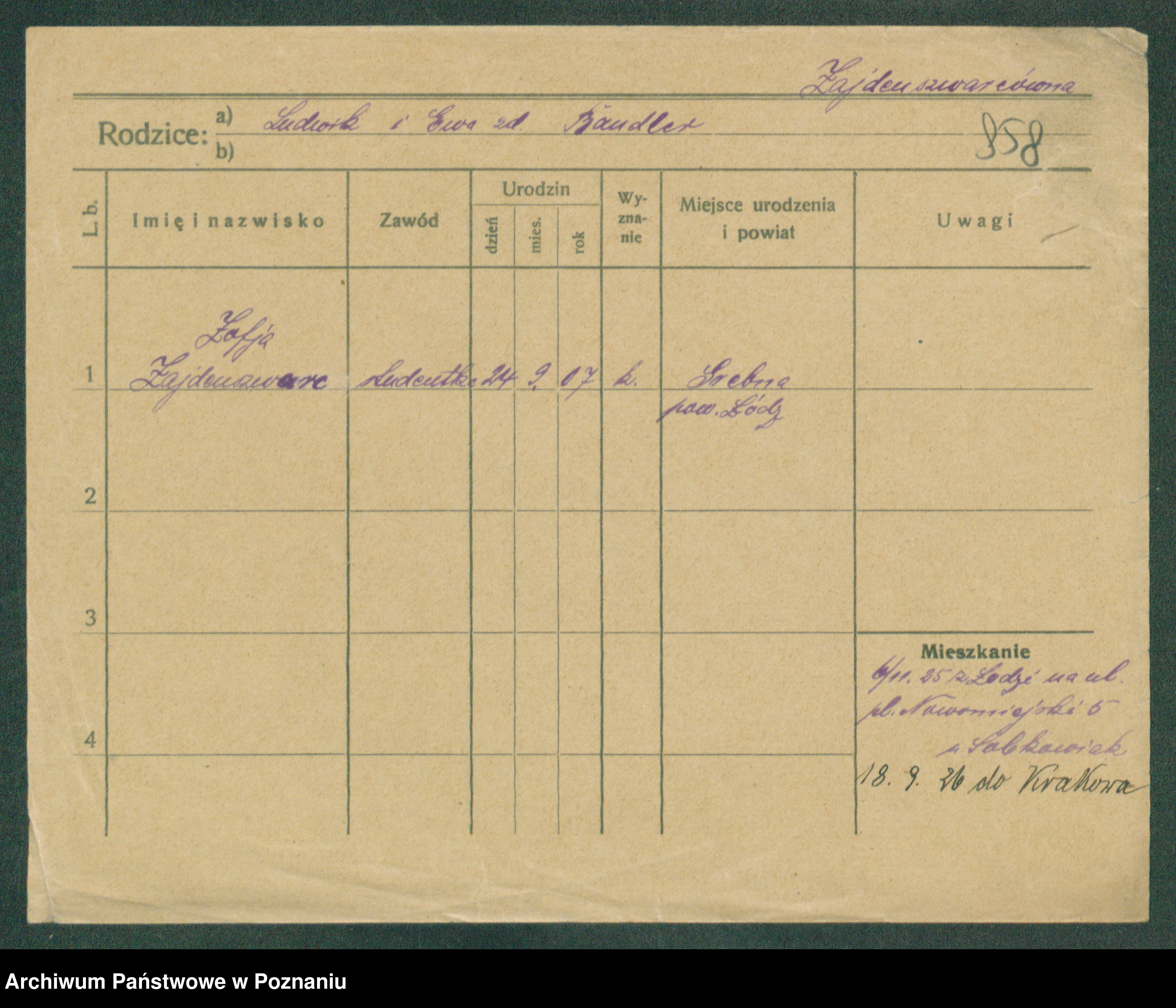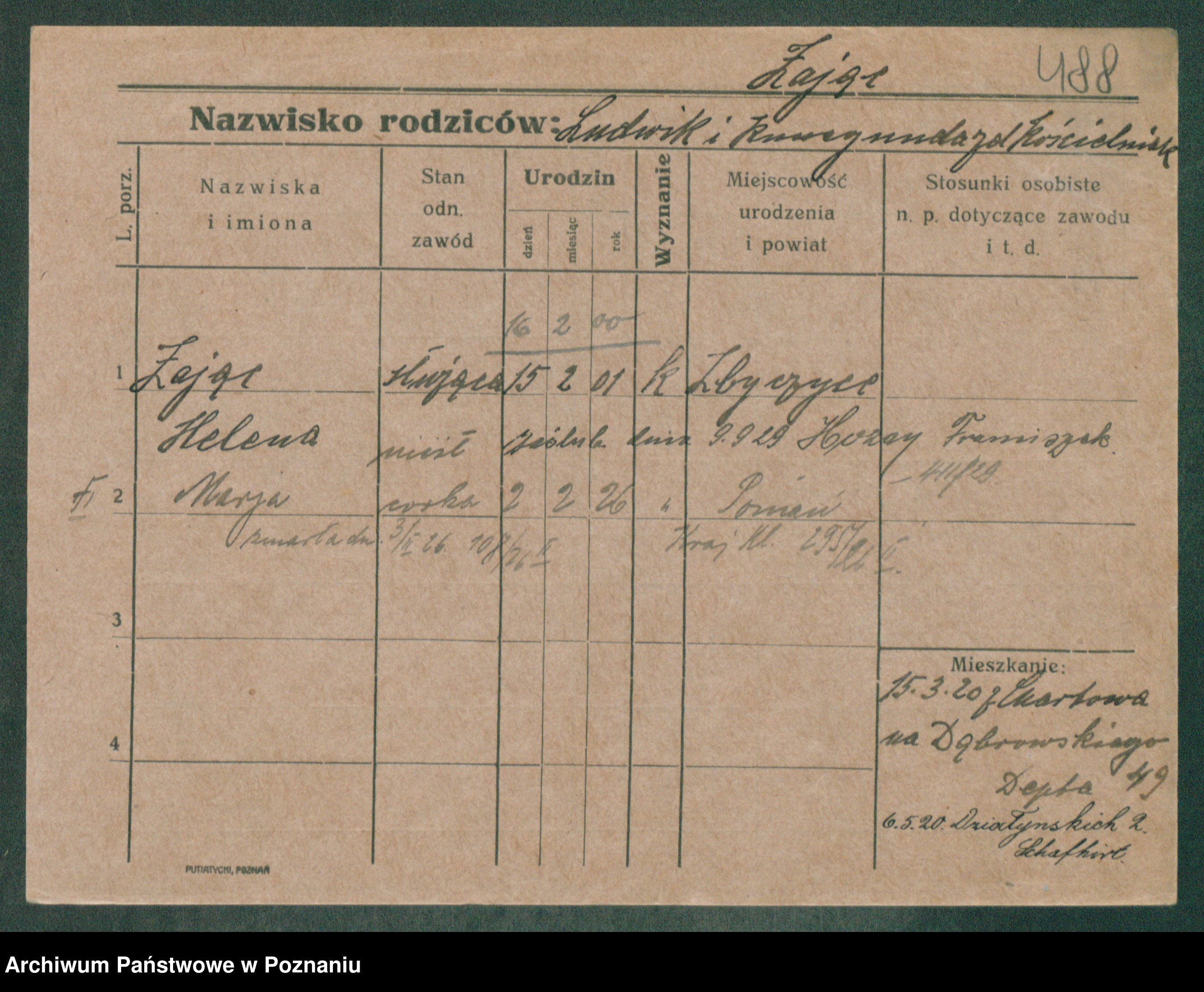 Podgląd karty osobowej dostępny jest po kliknięciu na nazwisko lub ikonkę karty. Można dokonywać powiększenia (ikony na górze) lub przechodzić między kolejnymi skanami (strzałki po bokach).