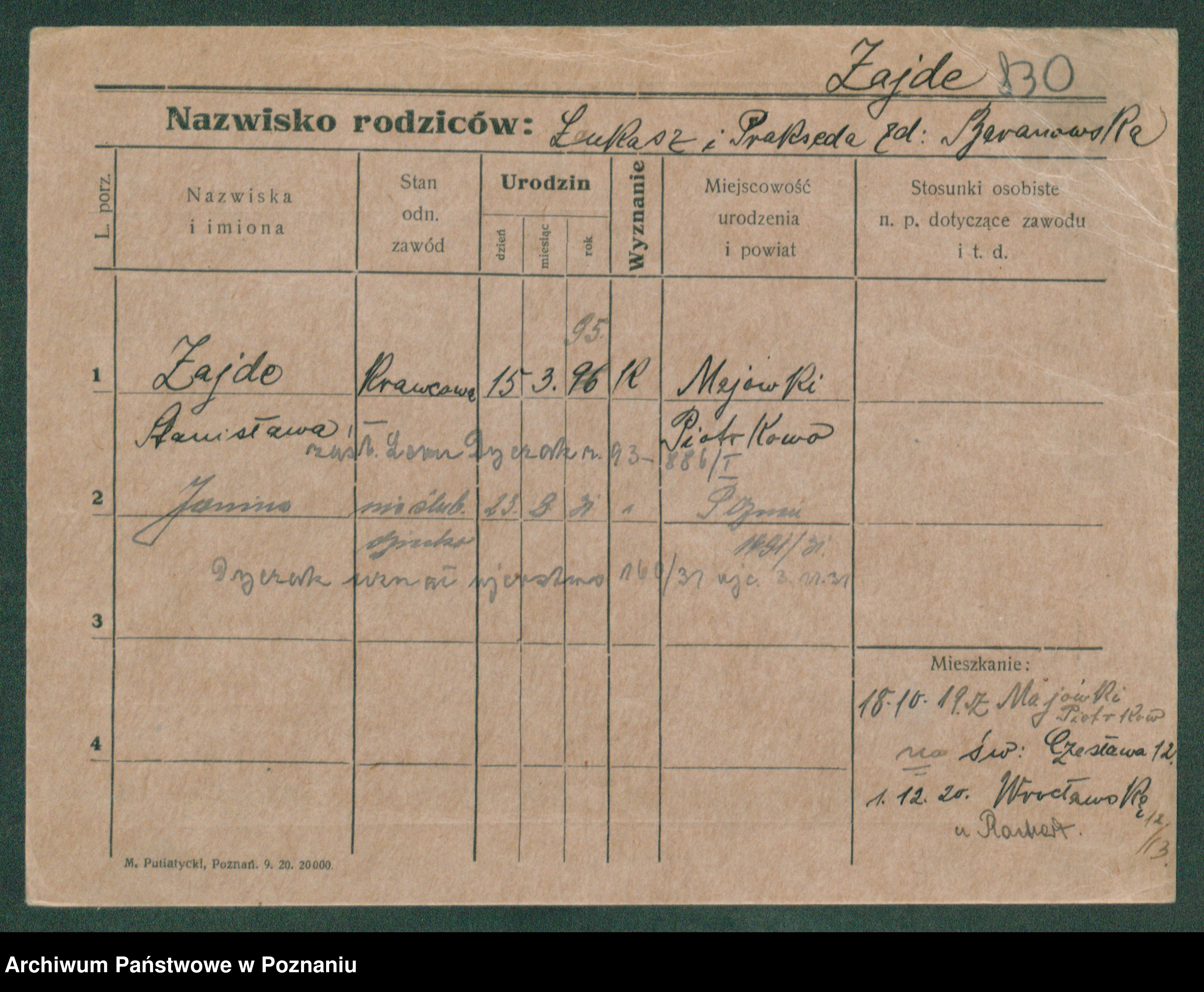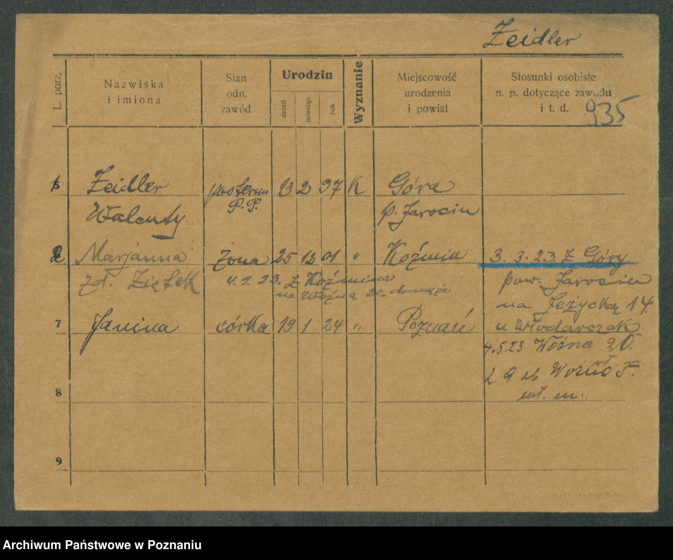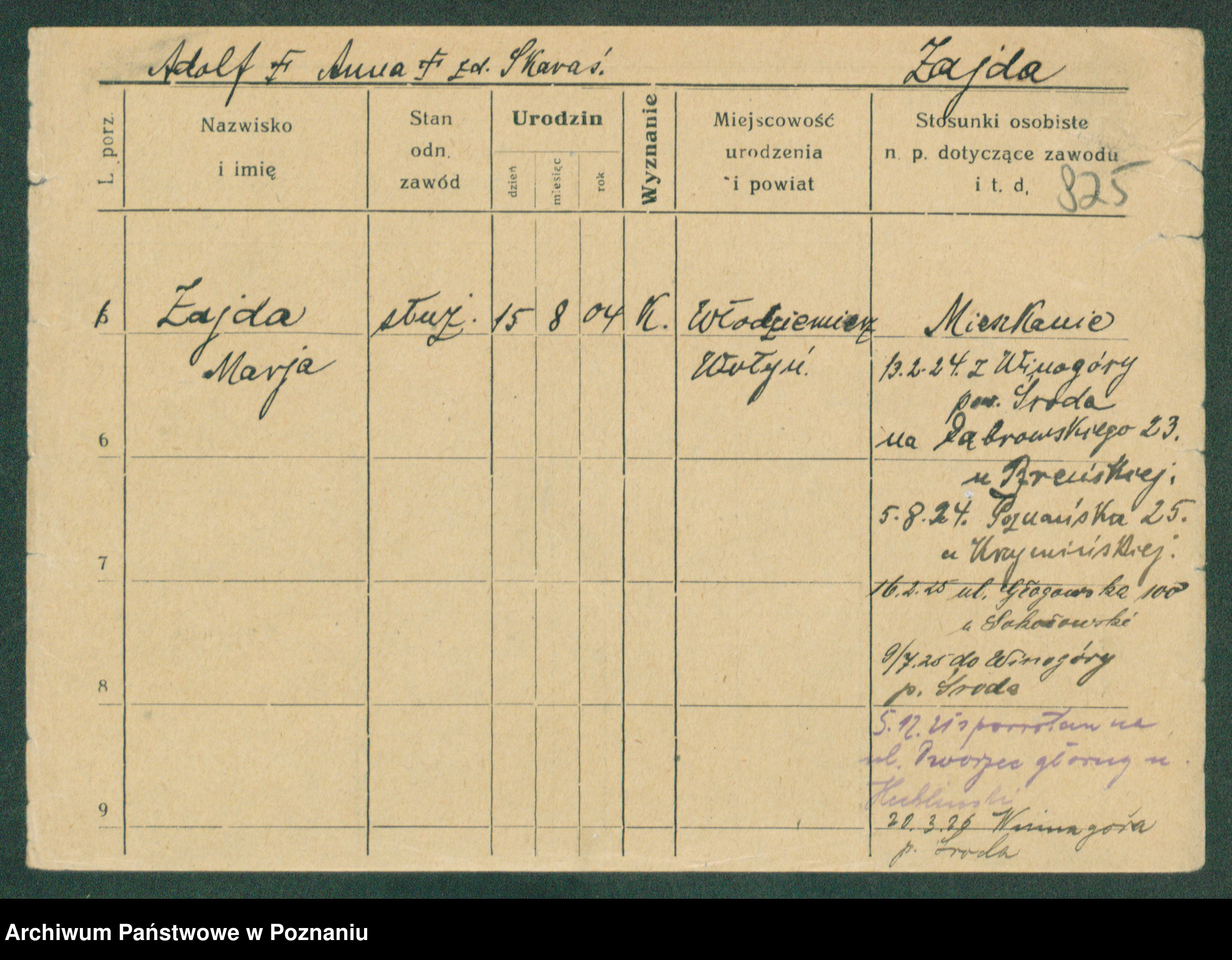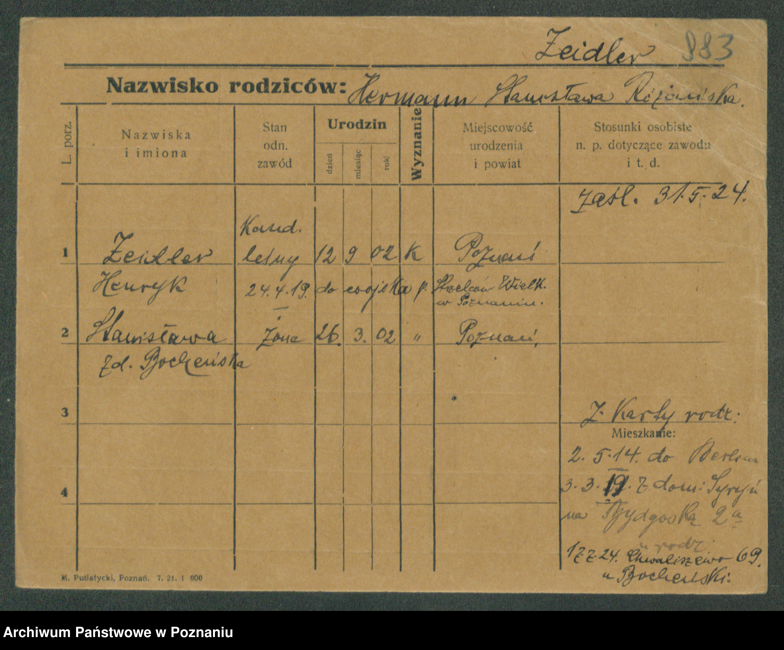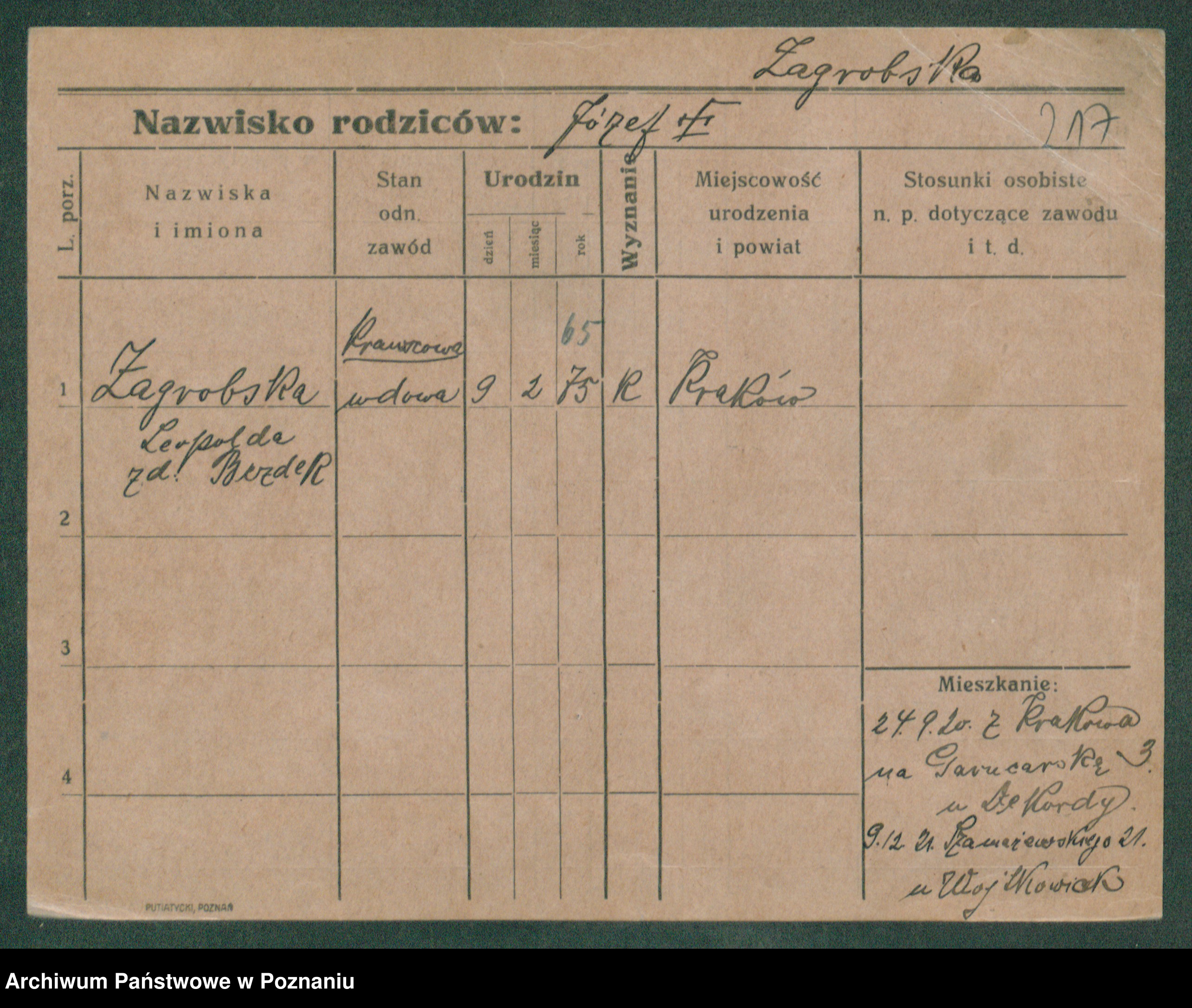 Podgląd karty osobowej dostępny jest po kliknięciu na nazwisko lub ikonkę karty. Można dokonywać powiększenia (ikony na górze) lub przechodzić między kolejnymi skanami (strzałki po bokach).