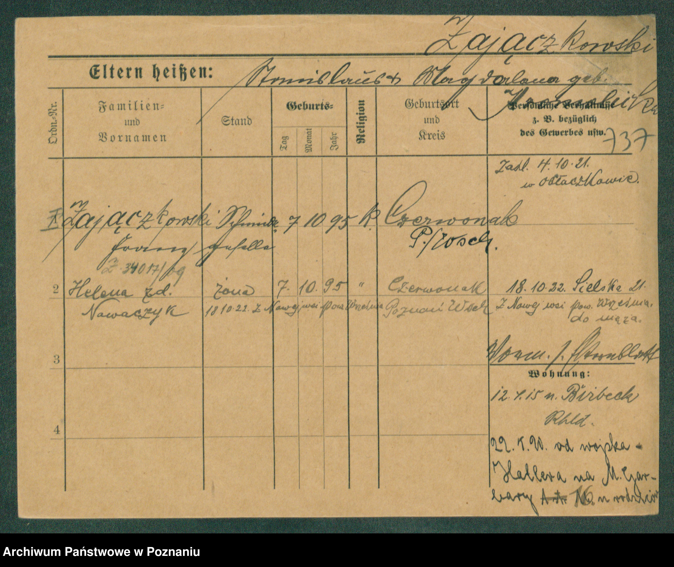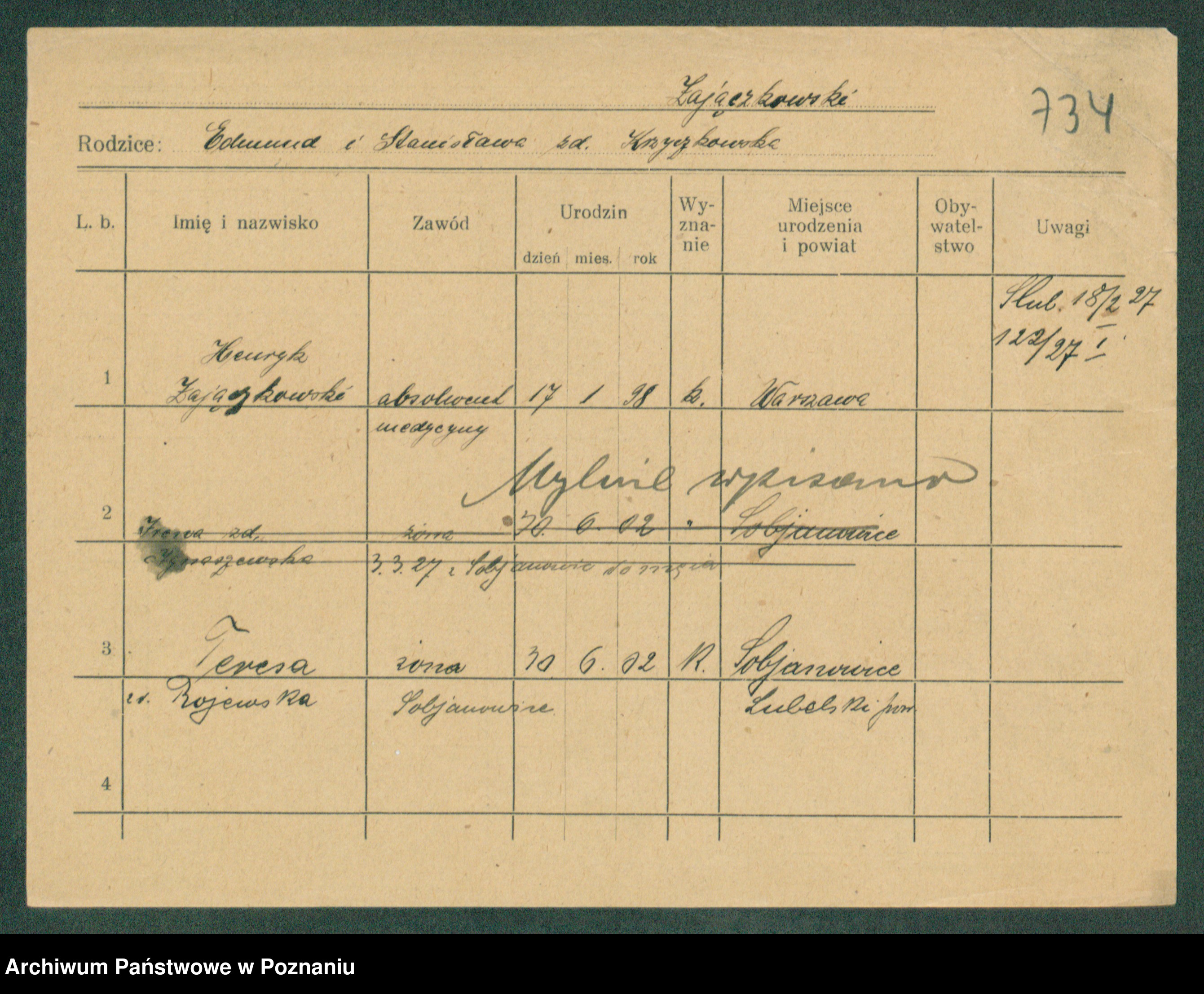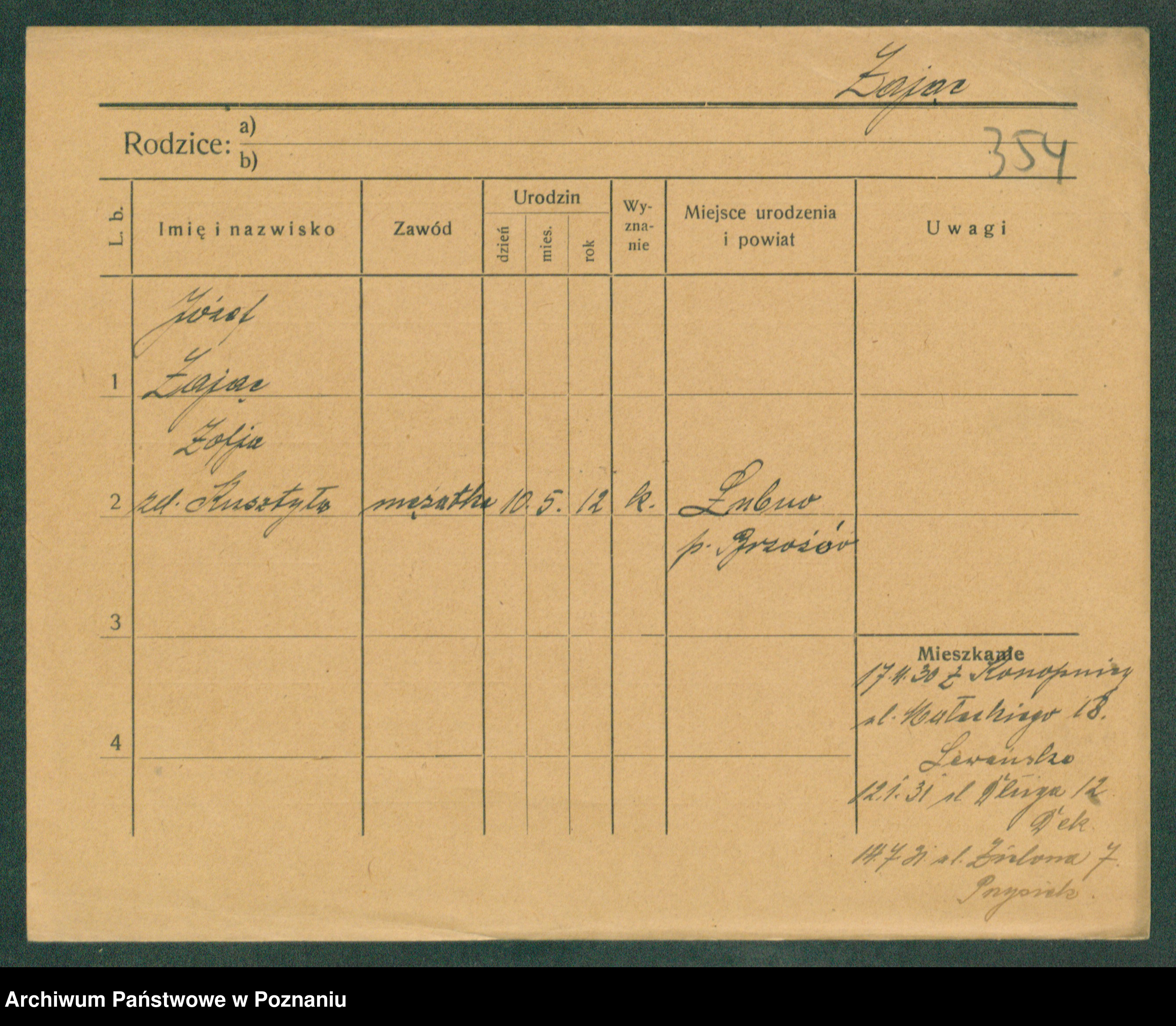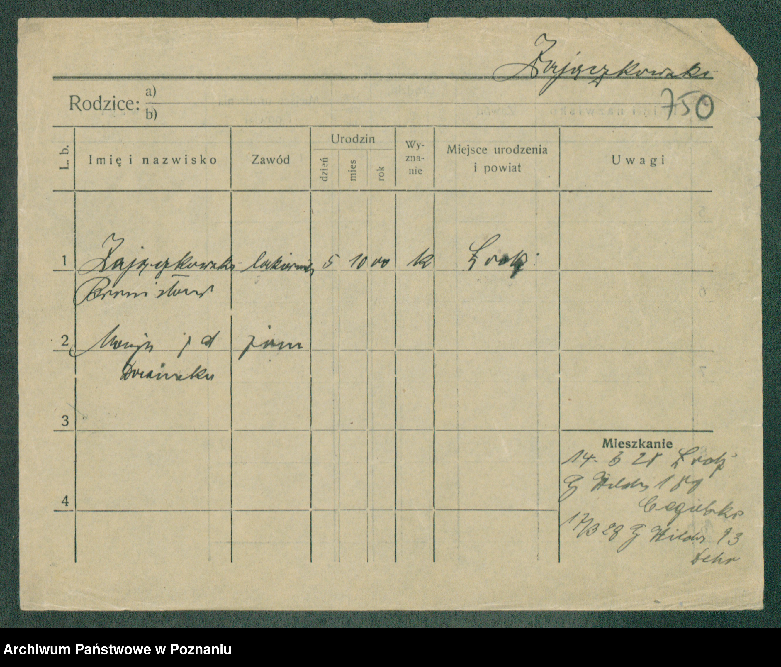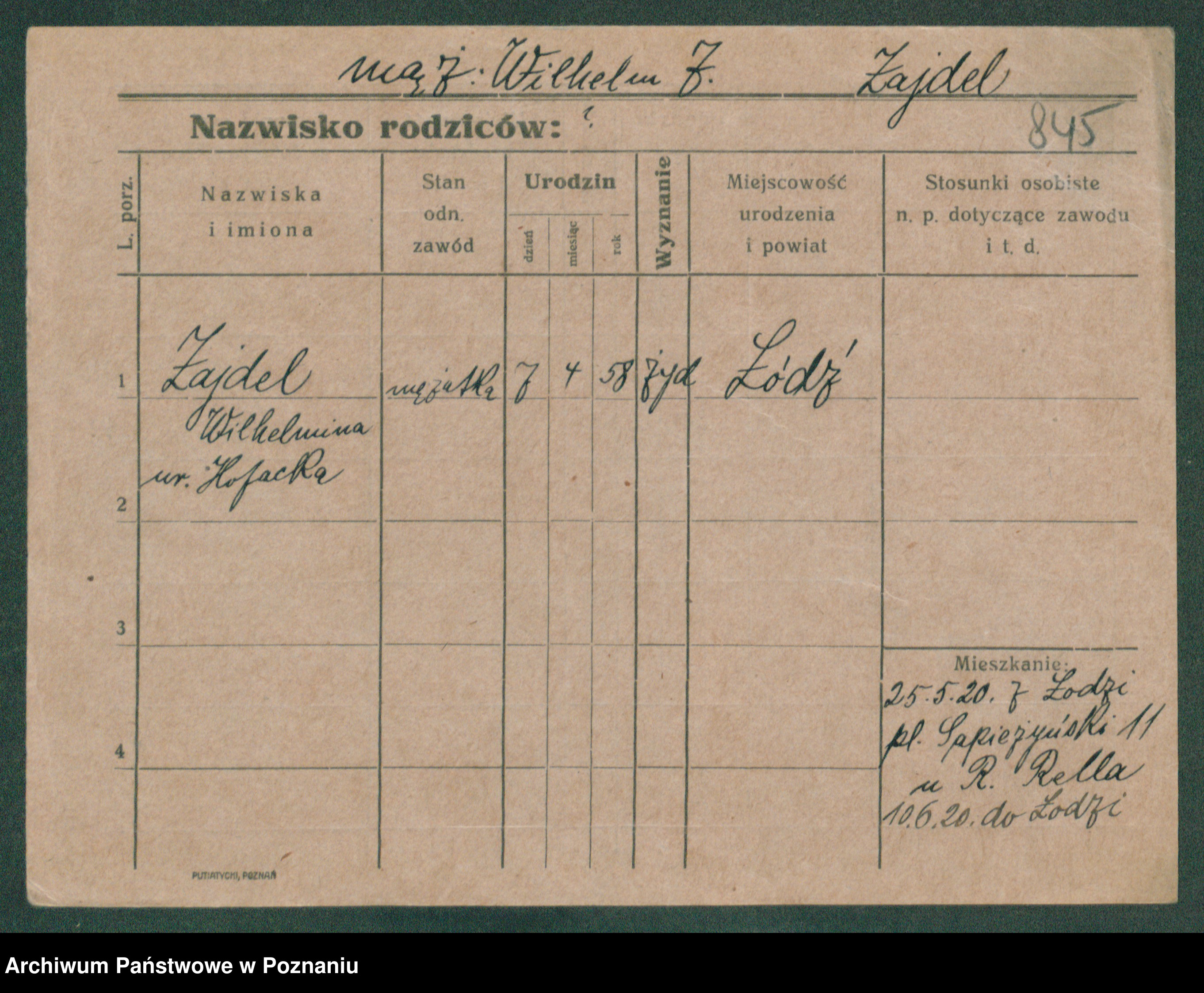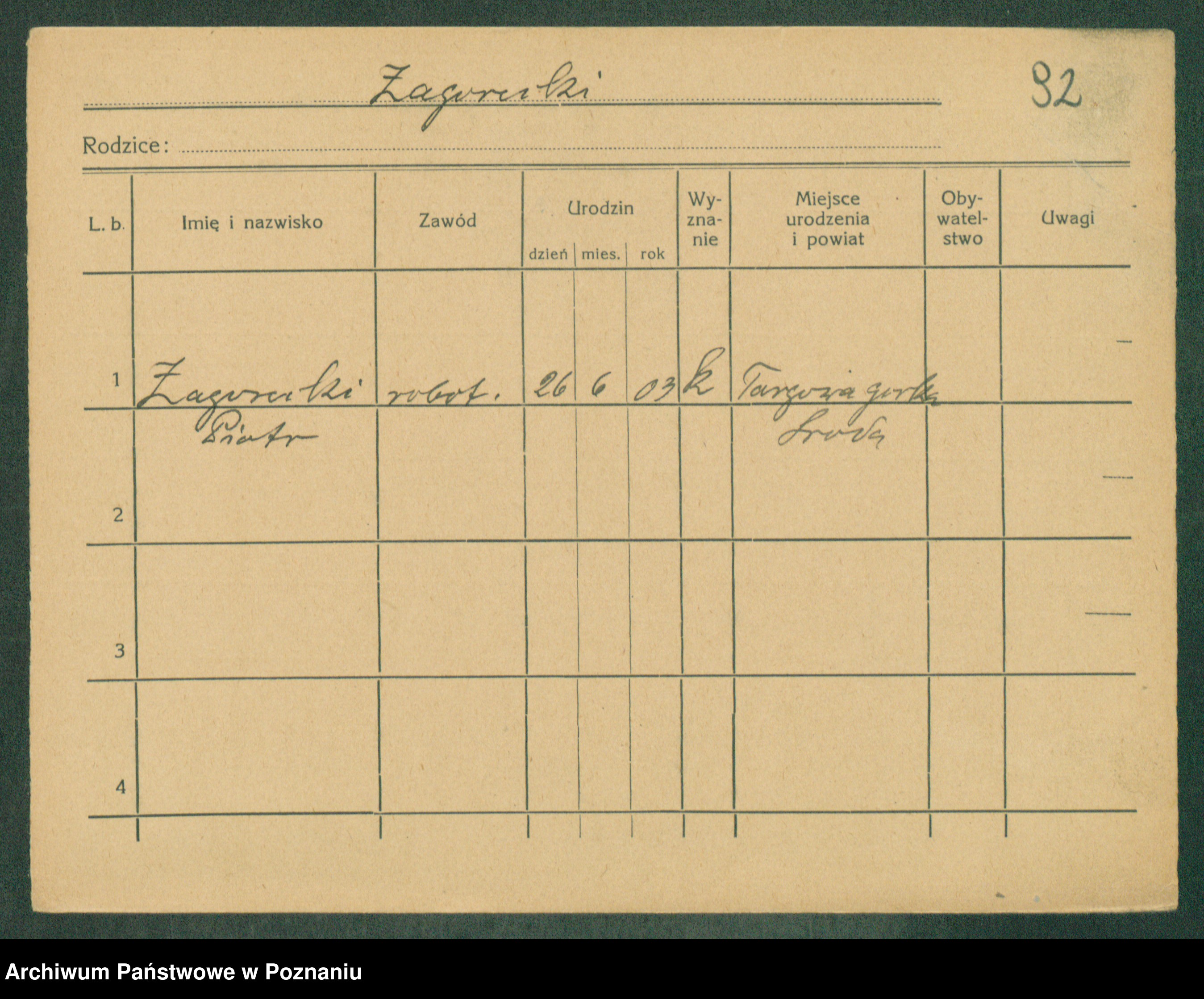 Podgląd karty osobowej dostępny jest po kliknięciu na nazwisko lub ikonkę karty. Można dokonywać powiększenia (ikony na górze) lub przechodzić między kolejnymi skanami (strzałki po bokach).