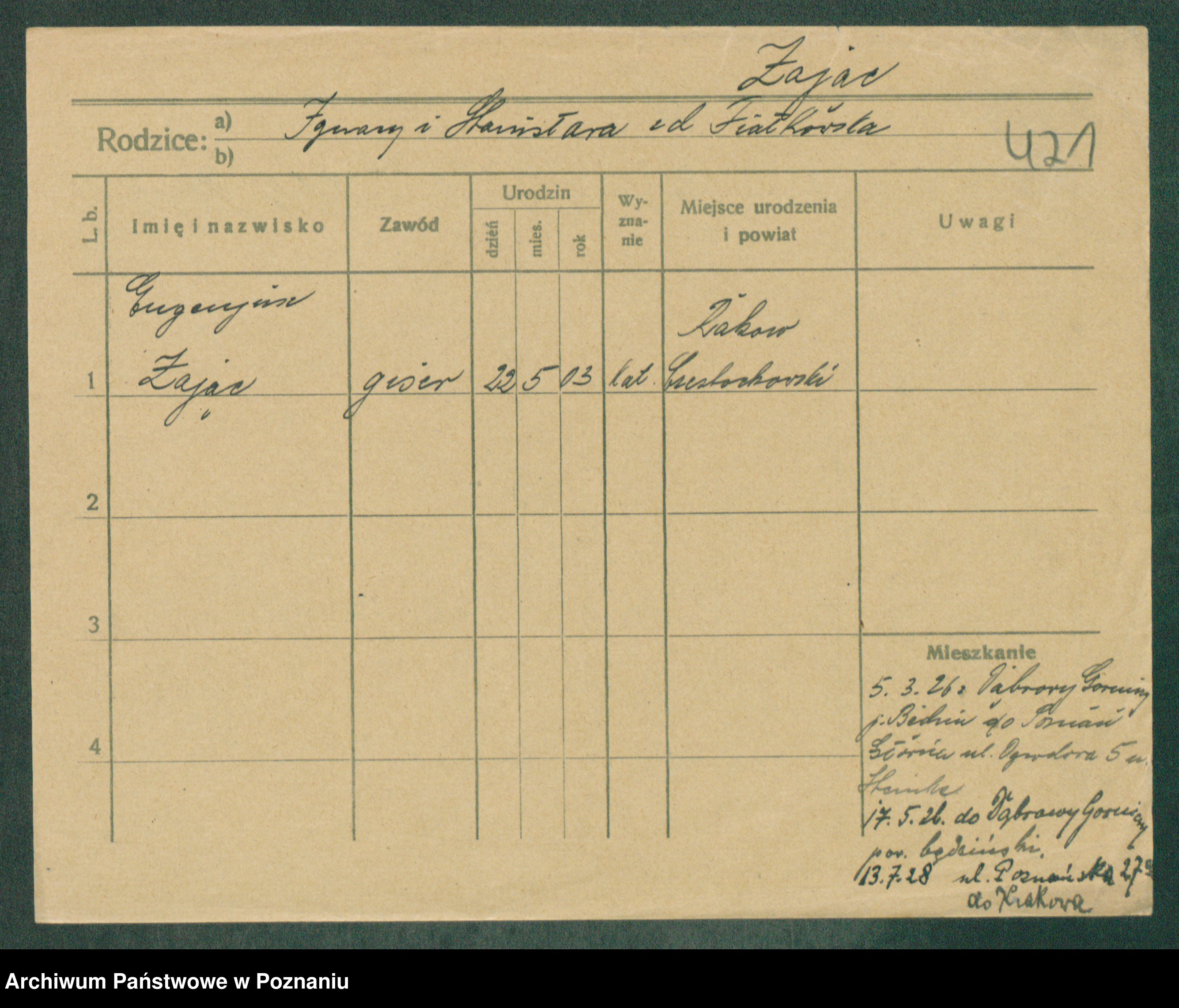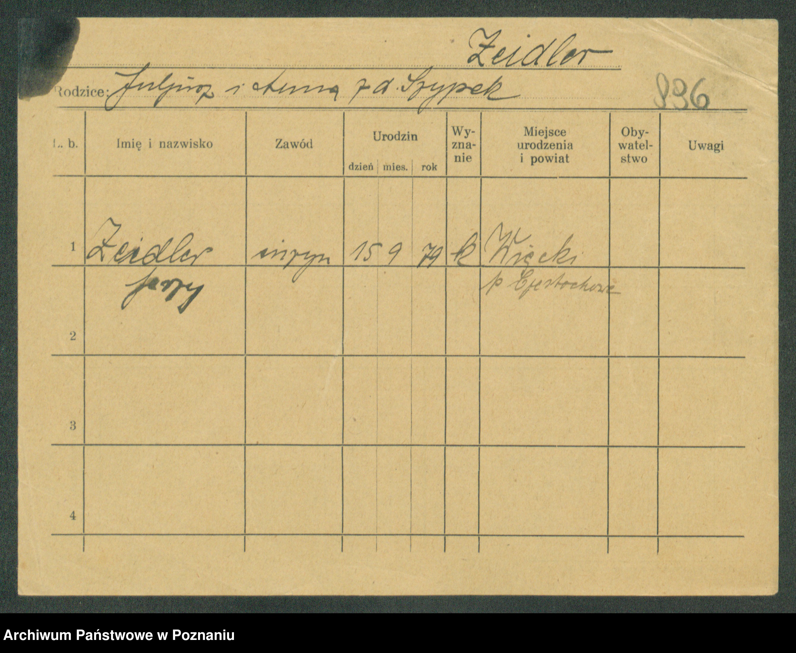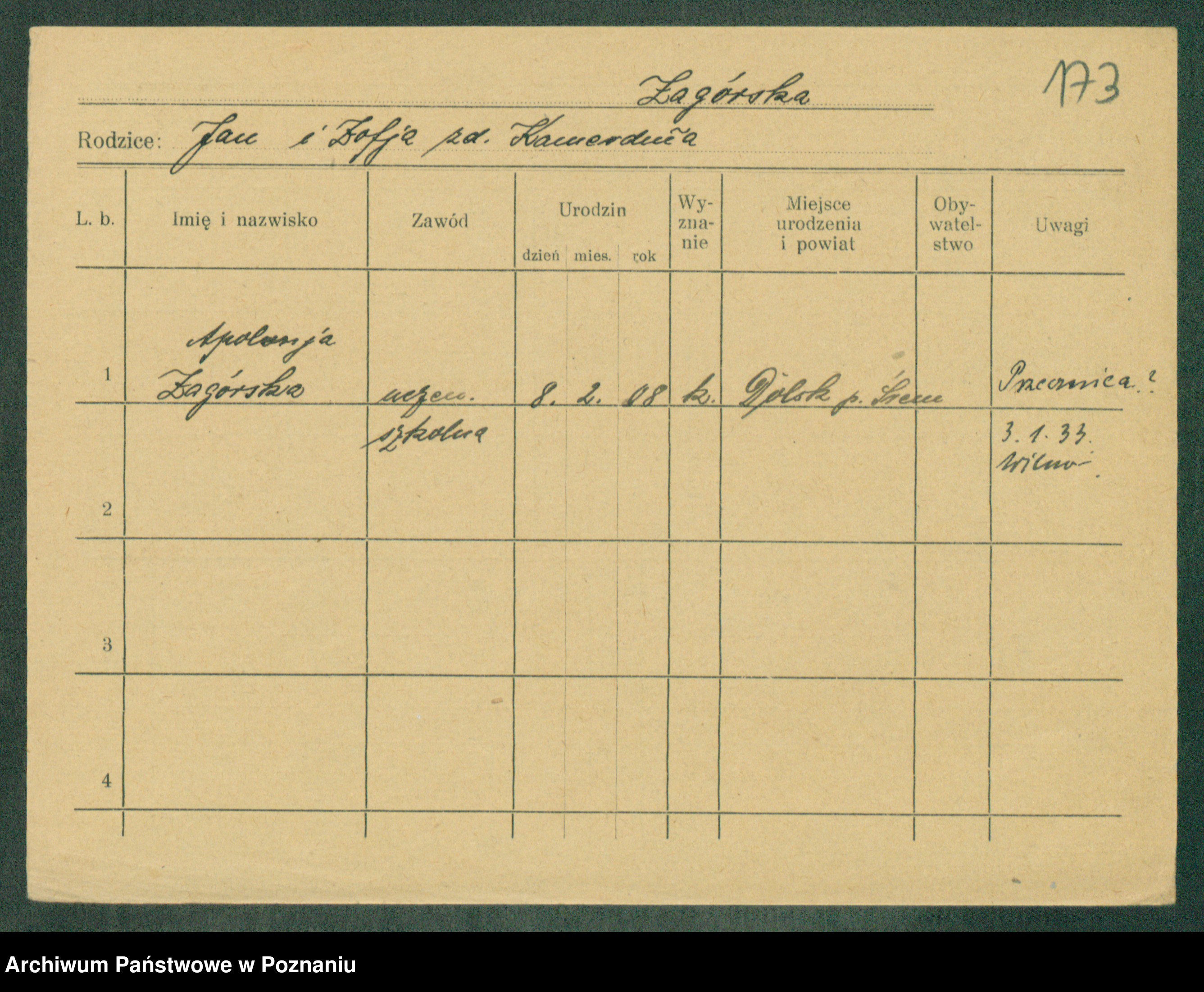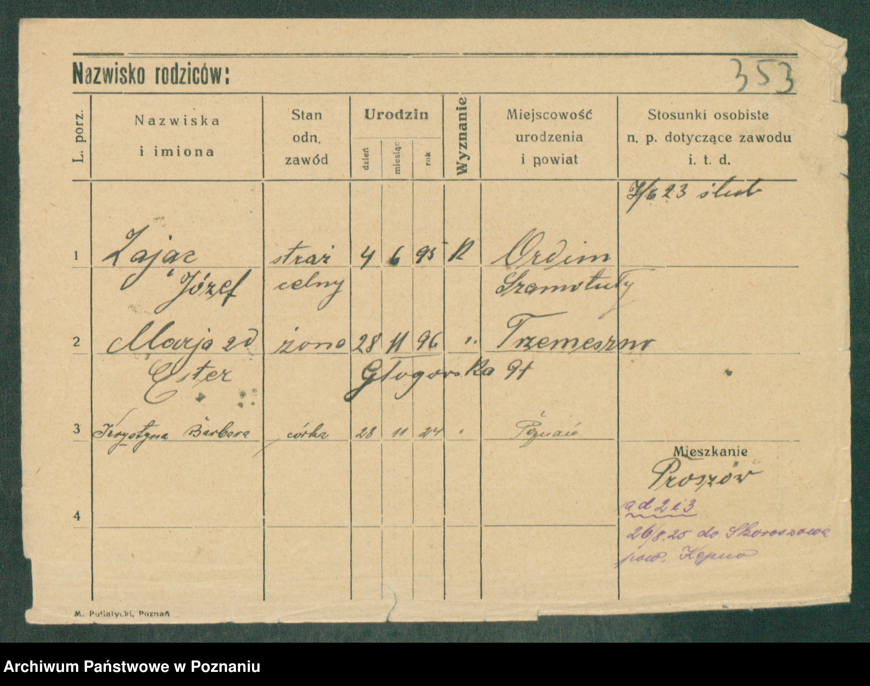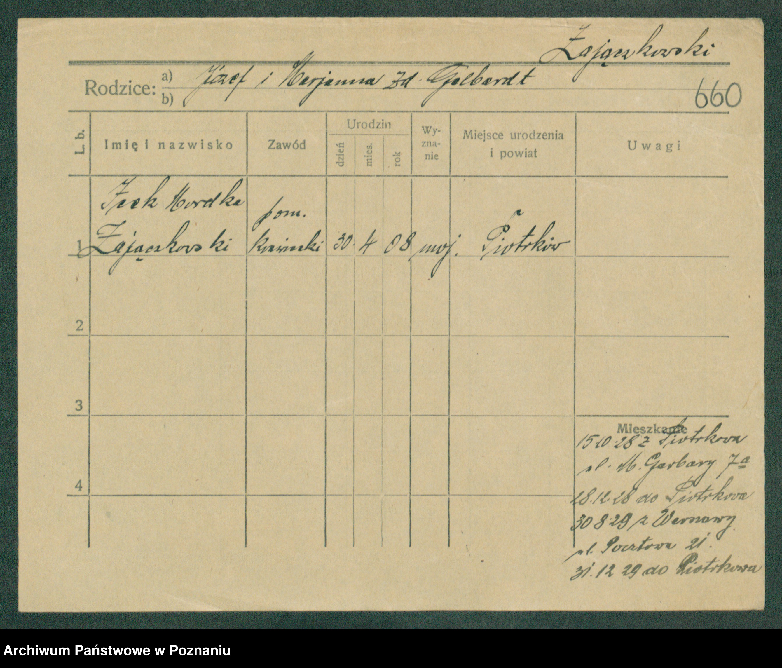 Podgląd karty osobowej dostępny jest po kliknięciu na nazwisko lub ikonkę karty. Można dokonywać powiększenia (ikony na górze) lub przechodzić między kolejnymi skanami (strzałki po bokach).