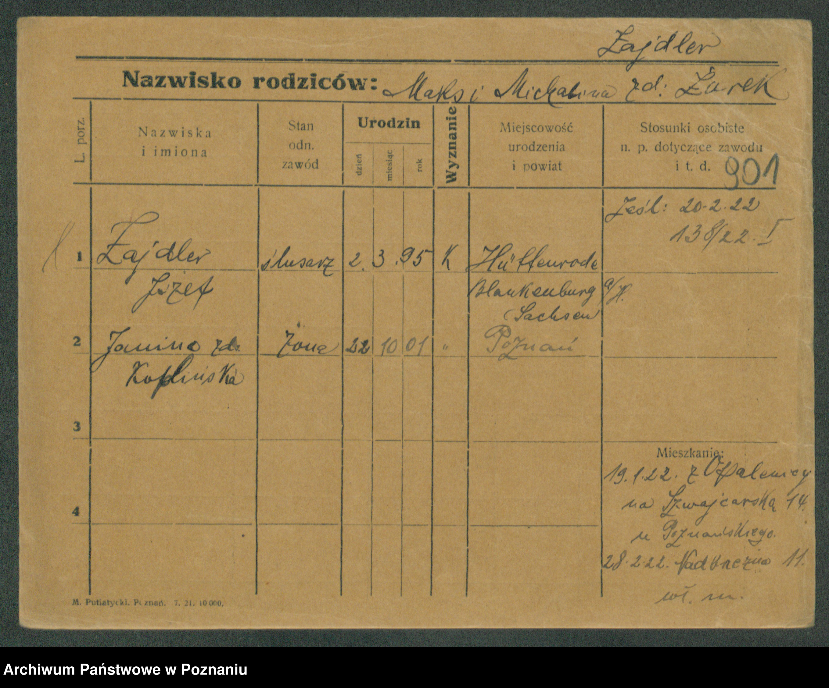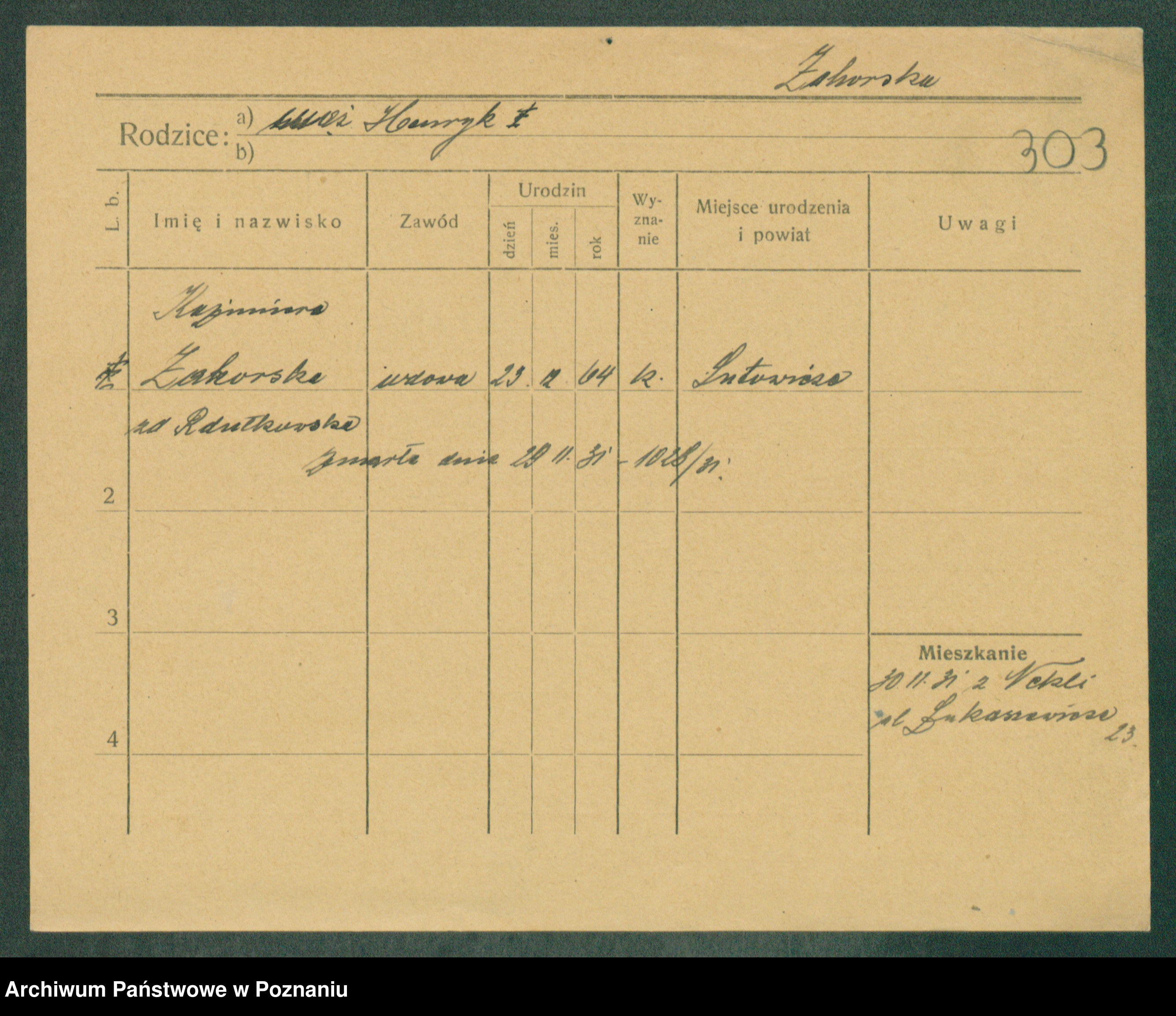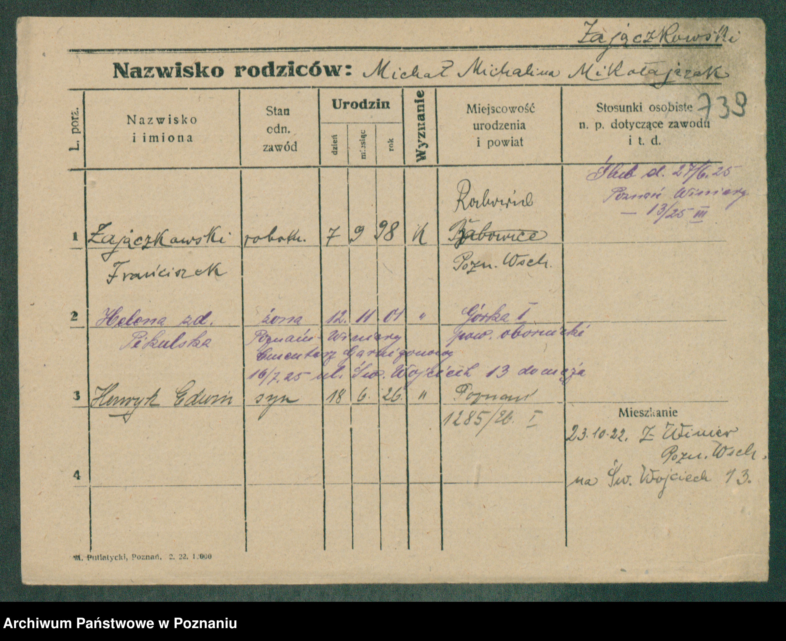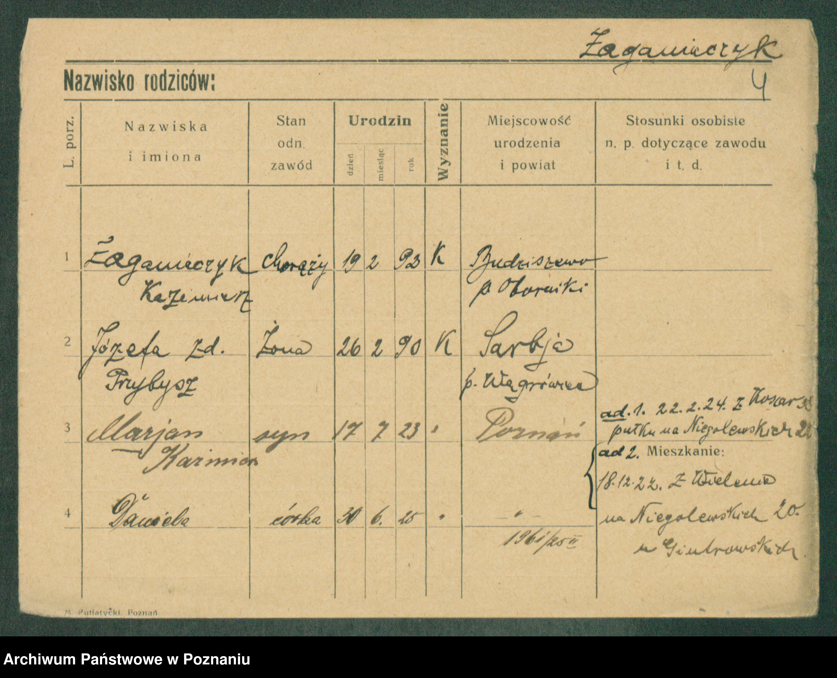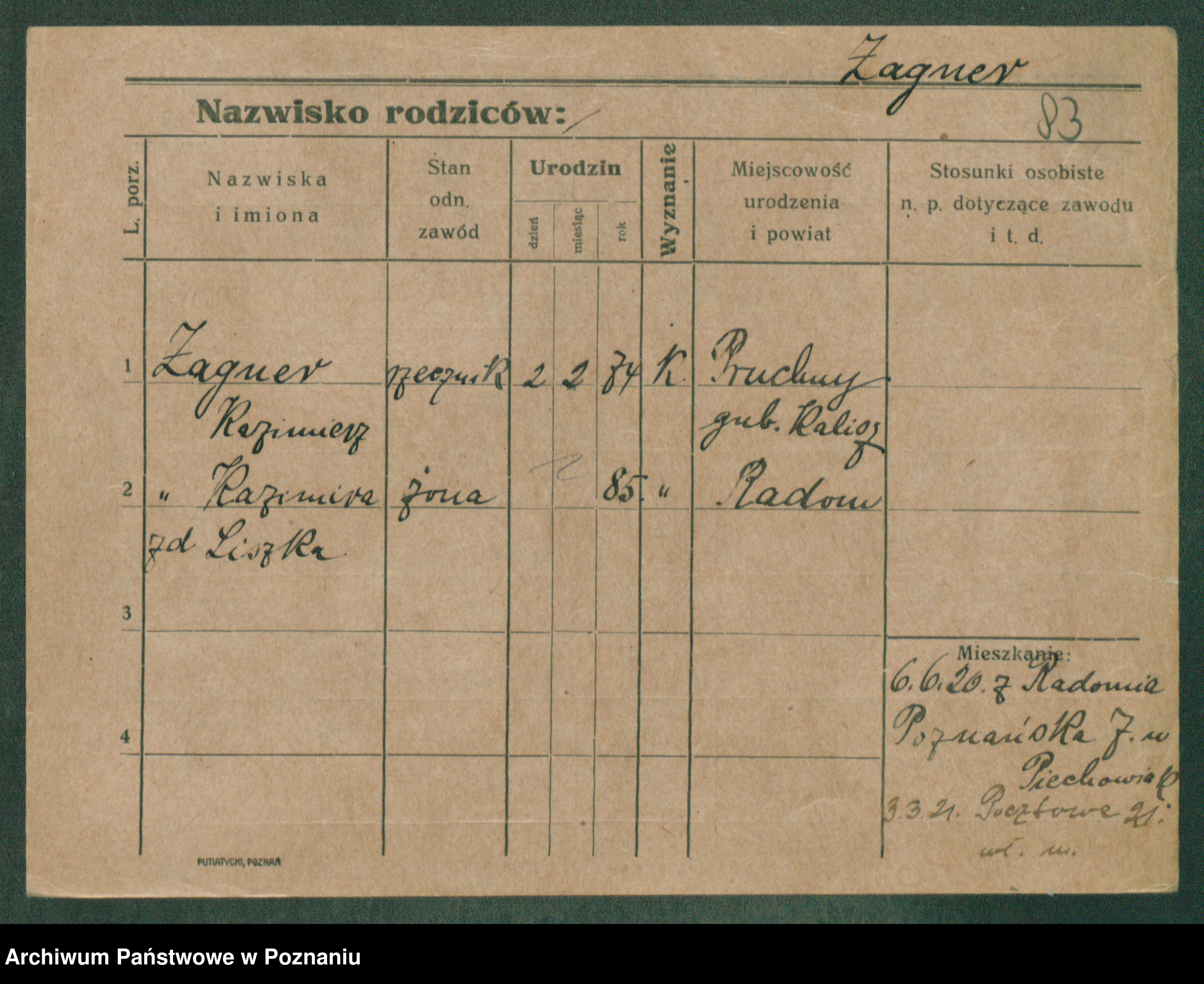 Podgląd karty osobowej dostępny jest po kliknięciu na nazwisko lub ikonkę karty. Można dokonywać powiększenia (ikony na górze) lub przechodzić między kolejnymi skanami (strzałki po bokach).