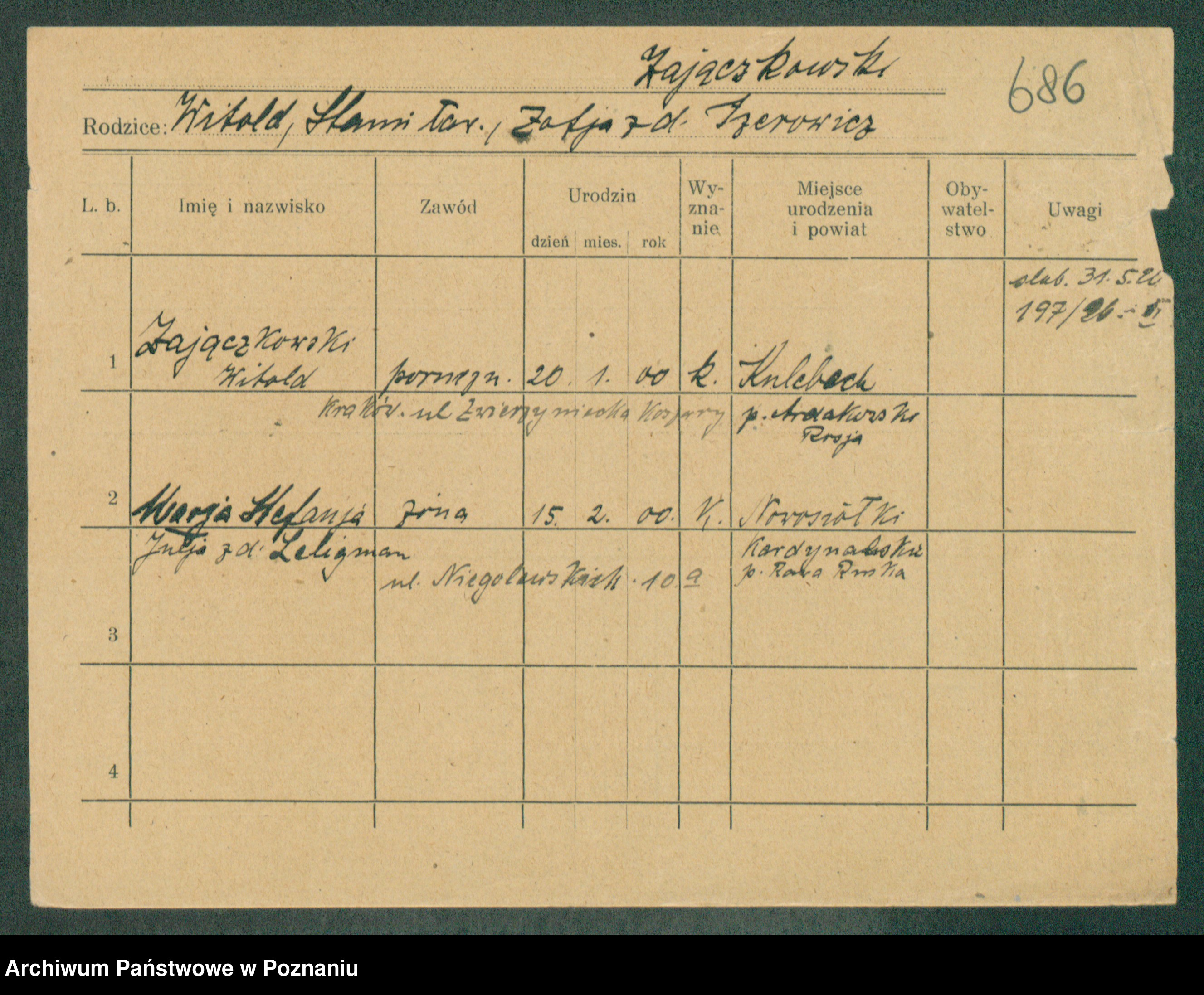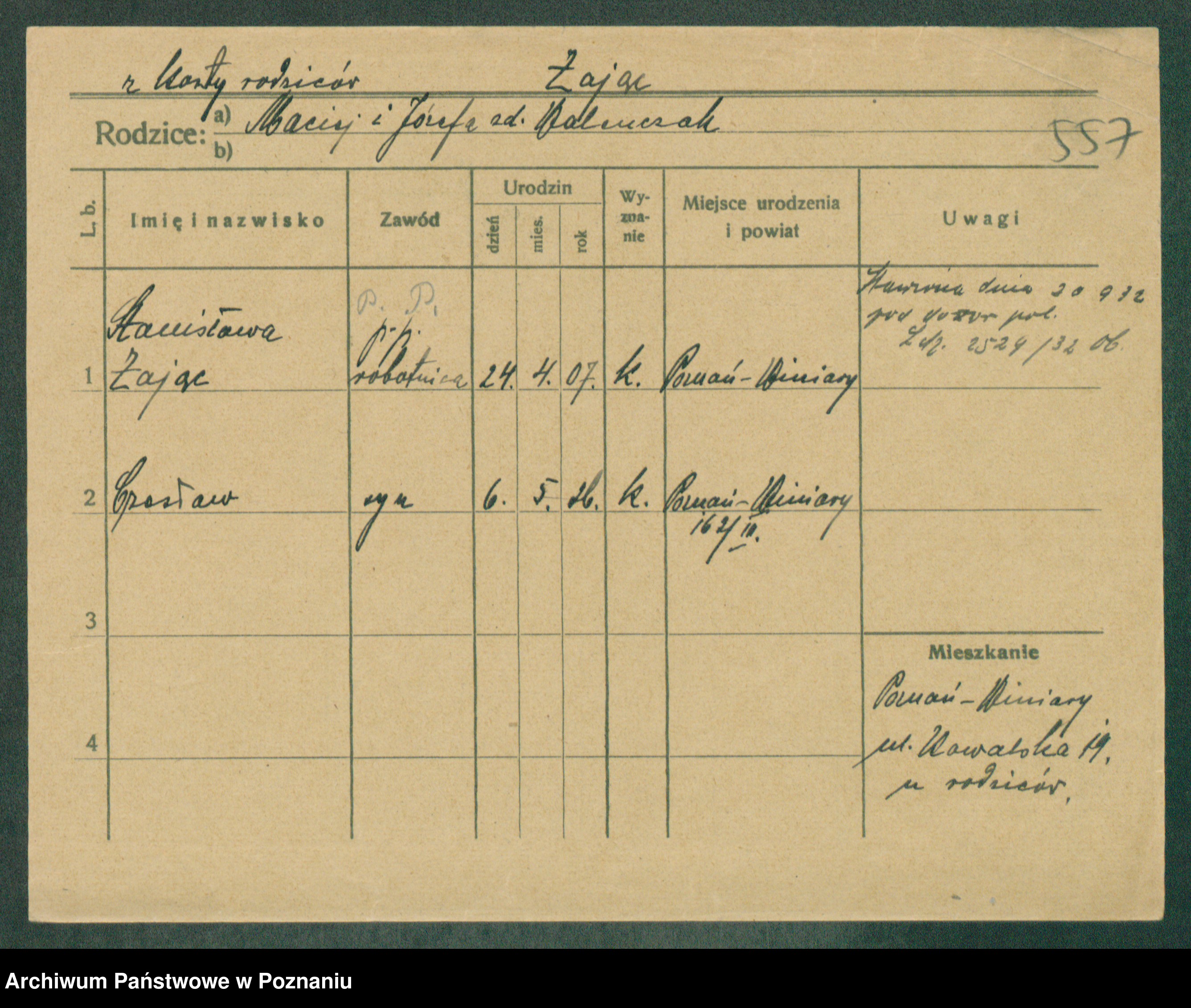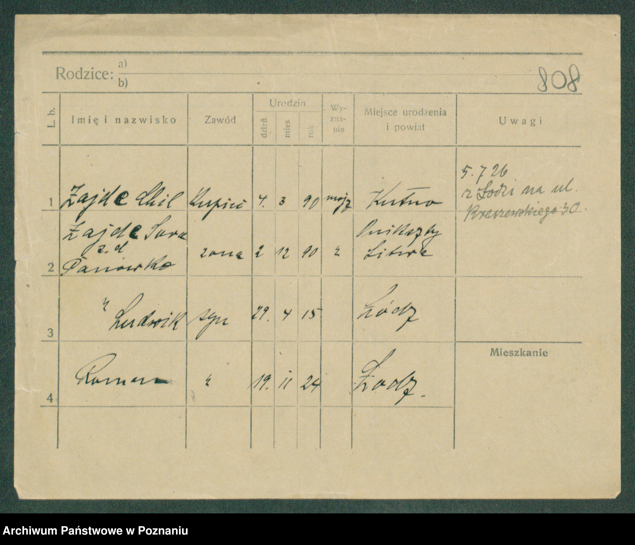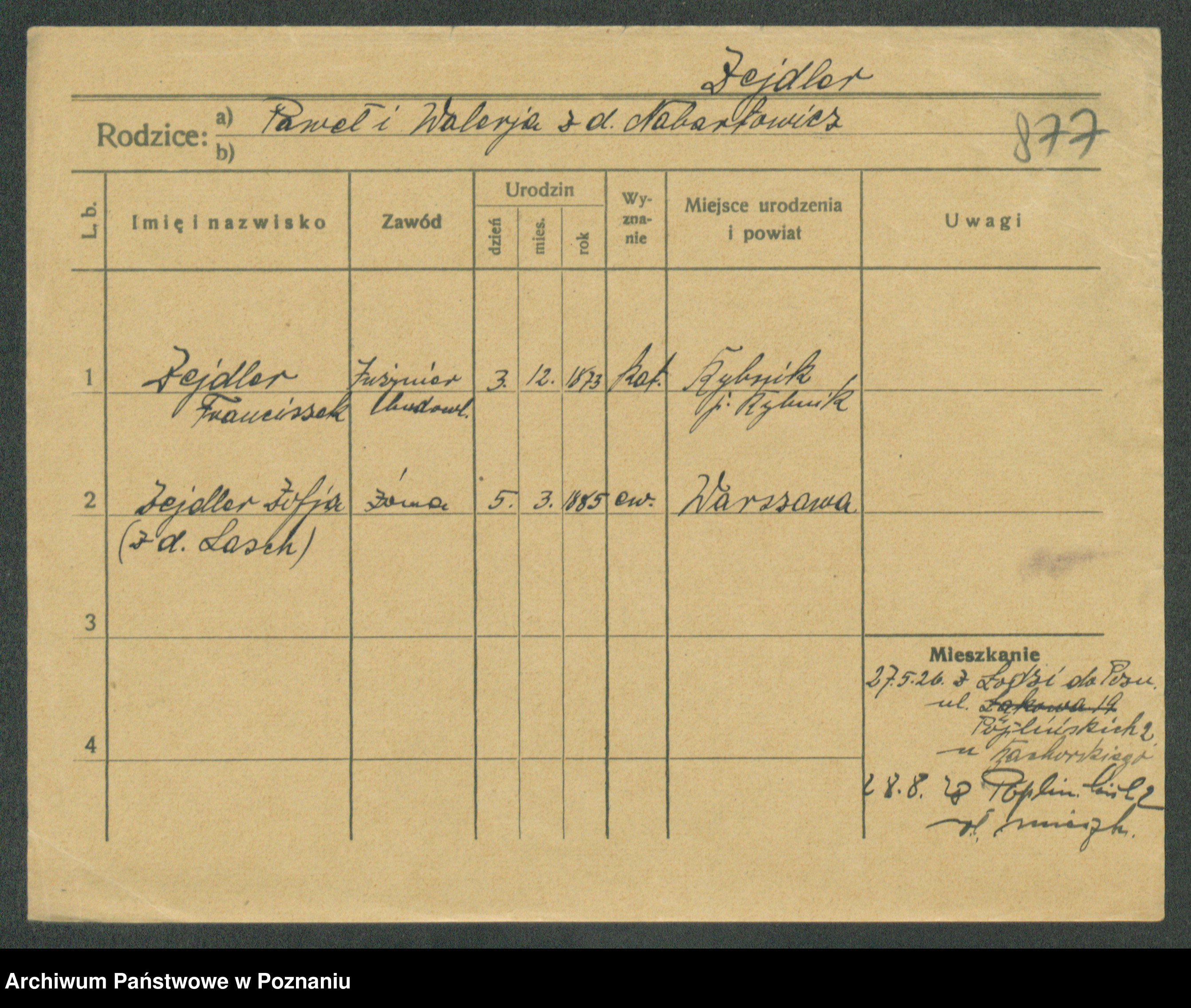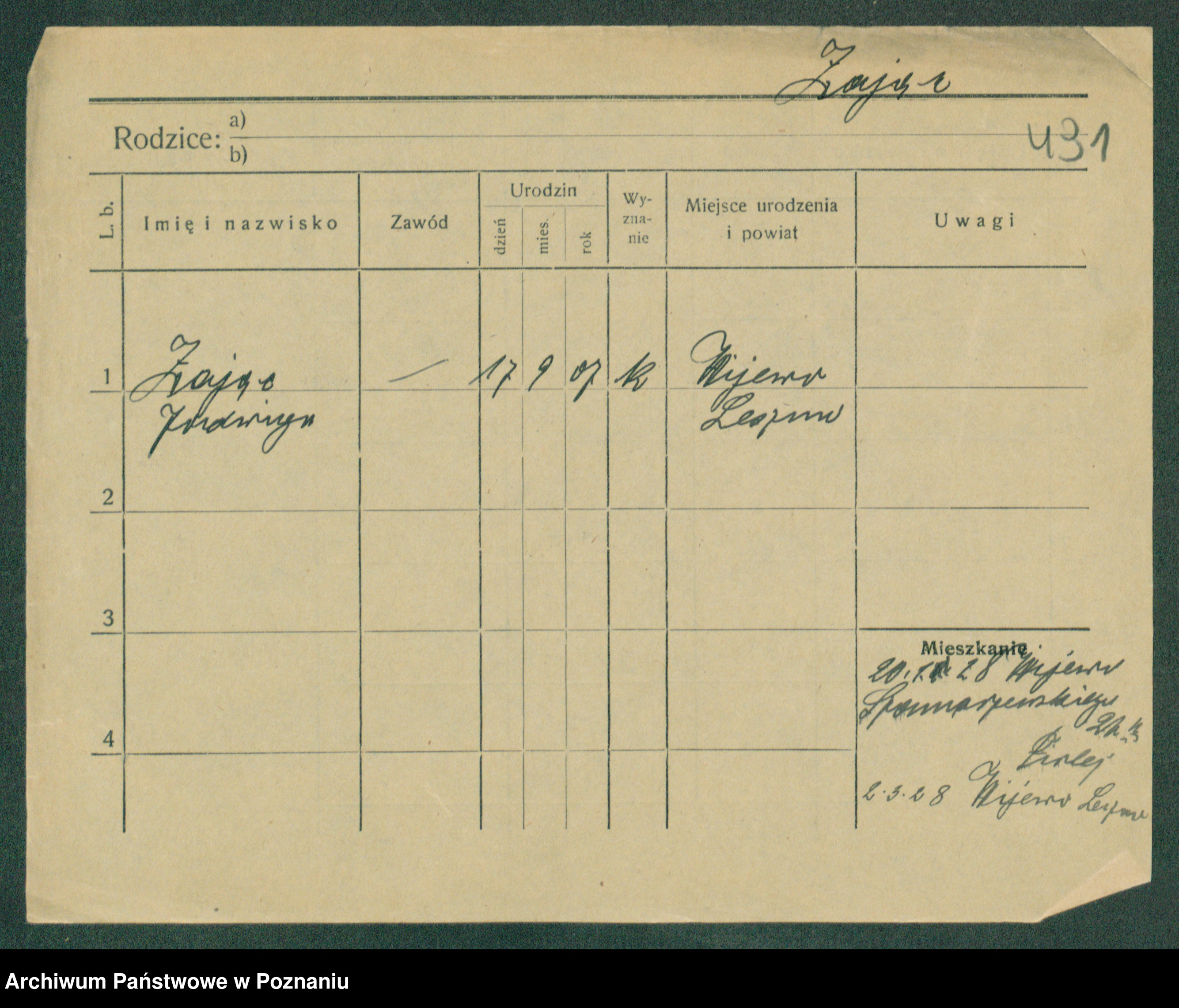 Podgląd karty osobowej dostępny jest po kliknięciu na nazwisko lub ikonkę karty. Można dokonywać powiększenia (ikony na górze) lub przechodzić między kolejnymi skanami (strzałki po bokach).