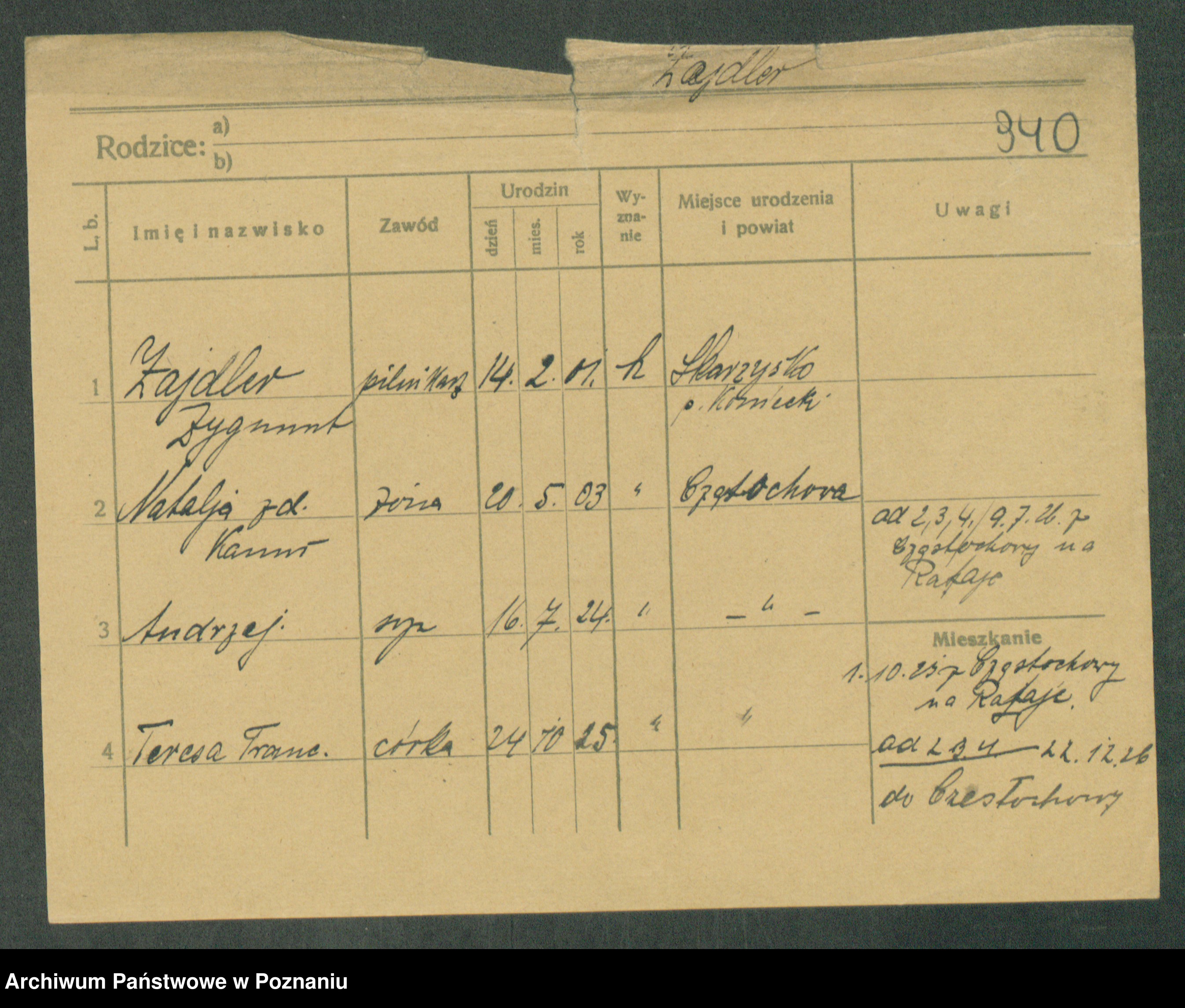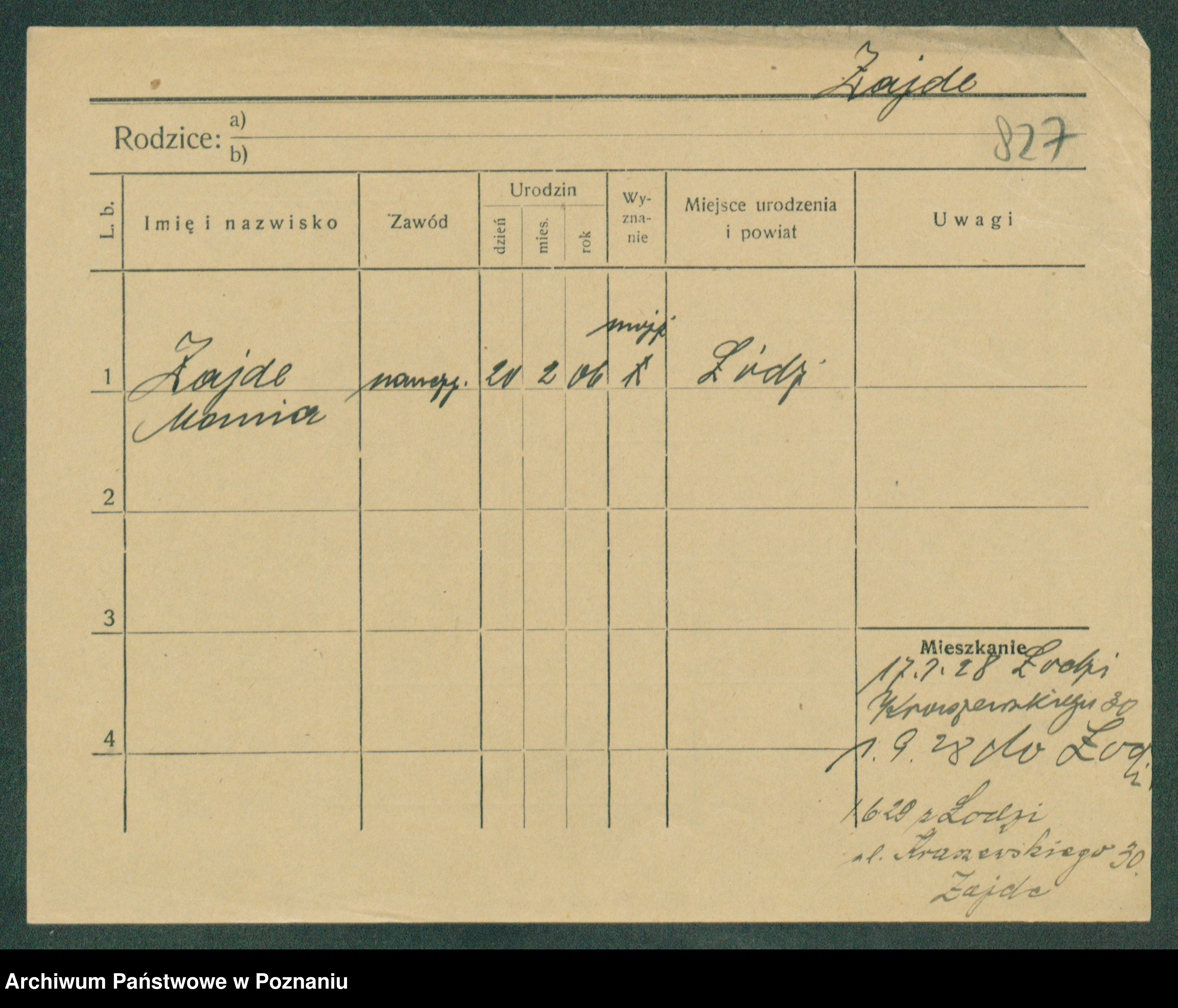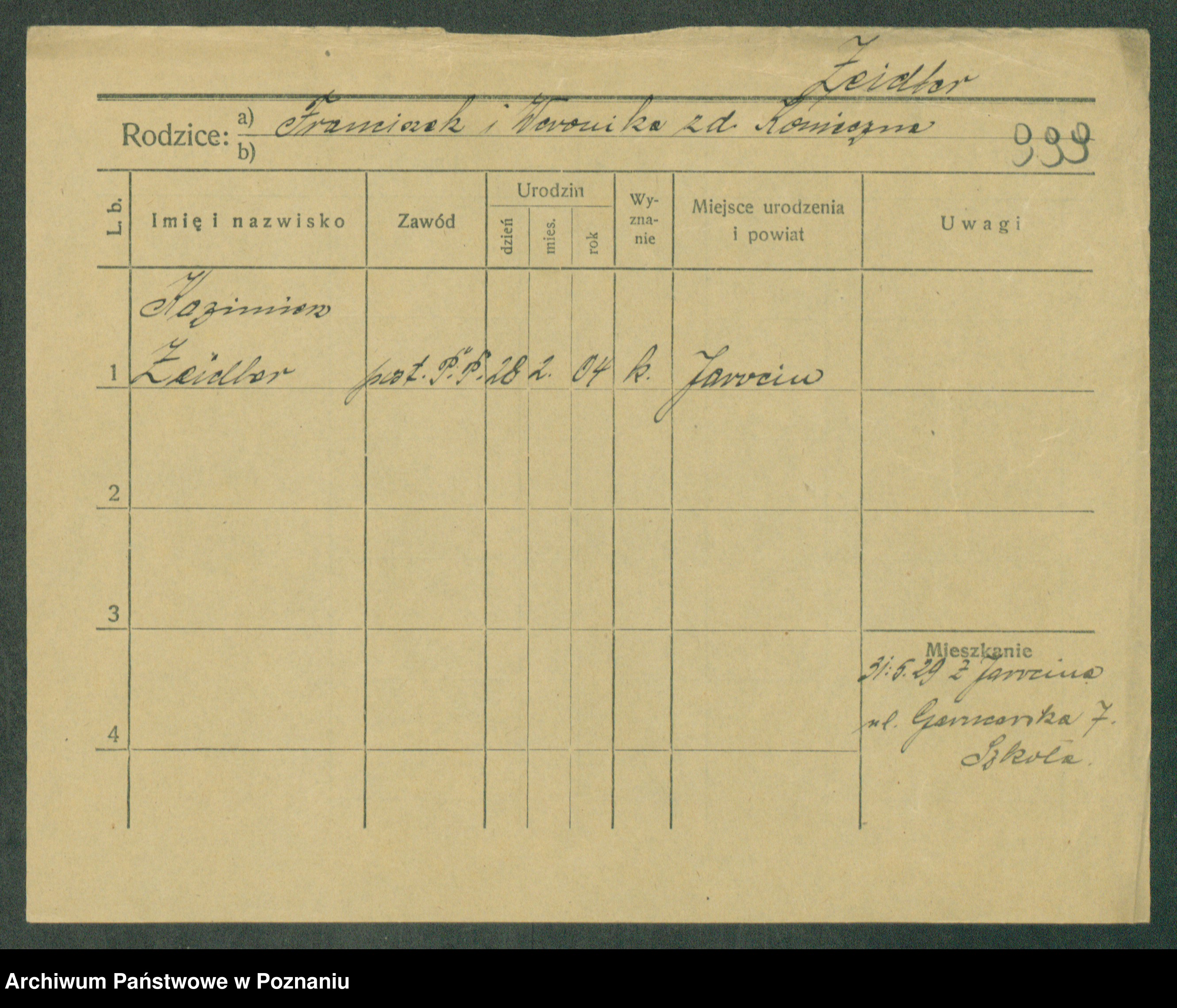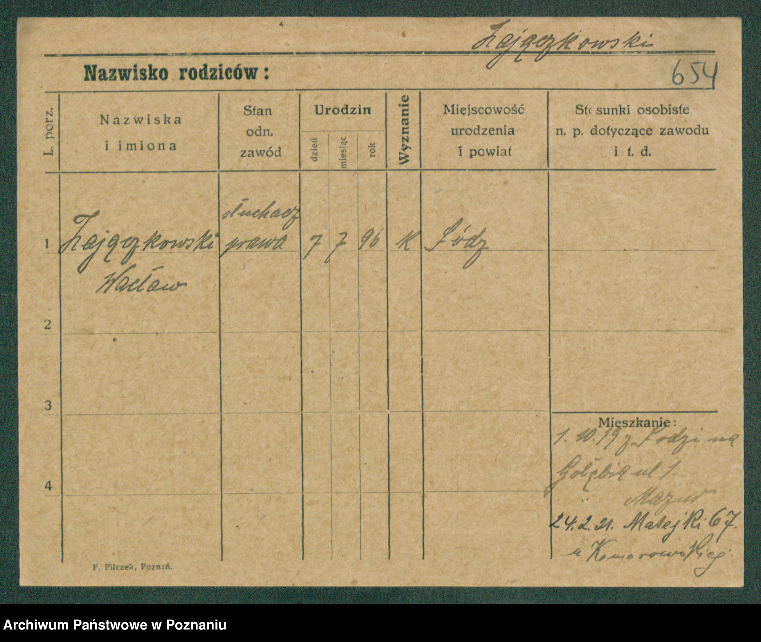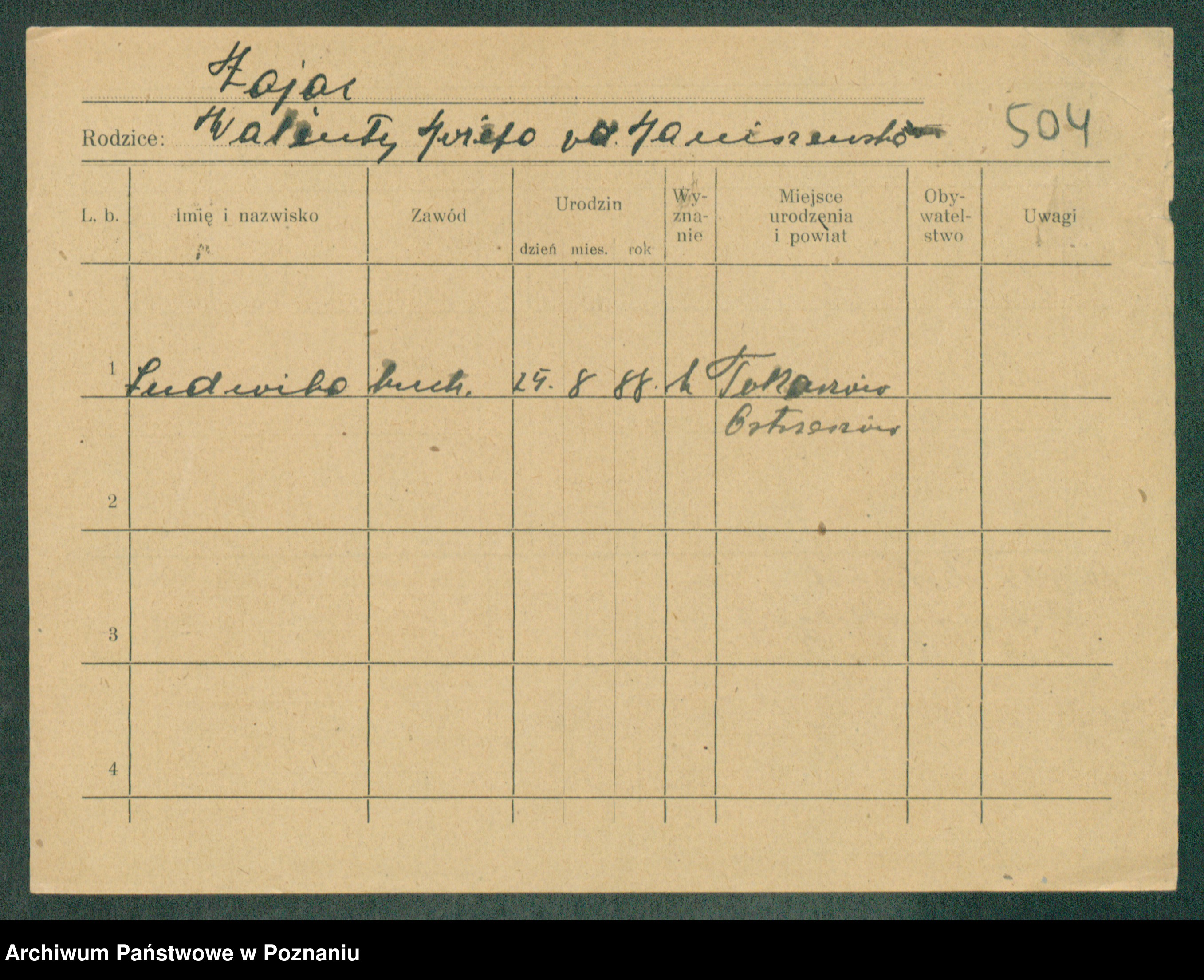 Podgląd karty osobowej dostępny jest po kliknięciu na nazwisko lub ikonkę karty. Można dokonywać powiększenia (ikony na górze) lub przechodzić między kolejnymi skanami (strzałki po bokach).
