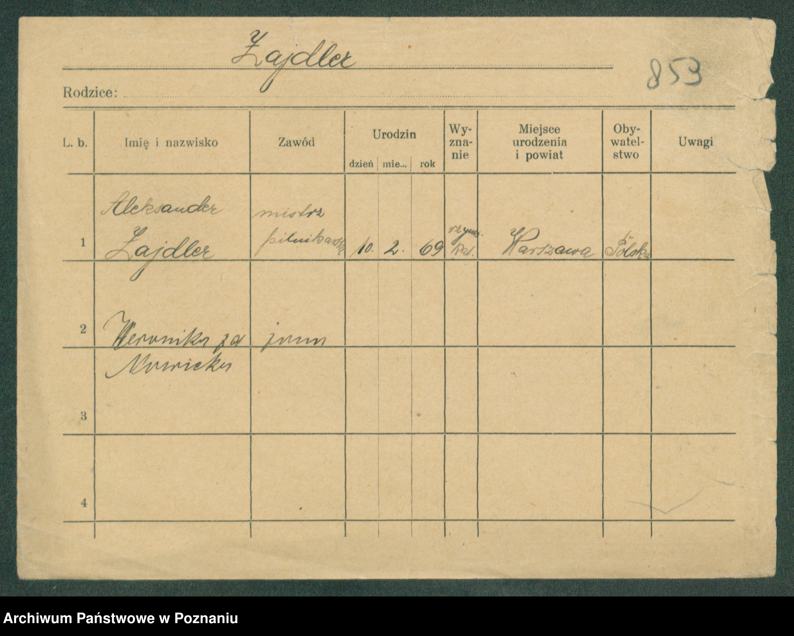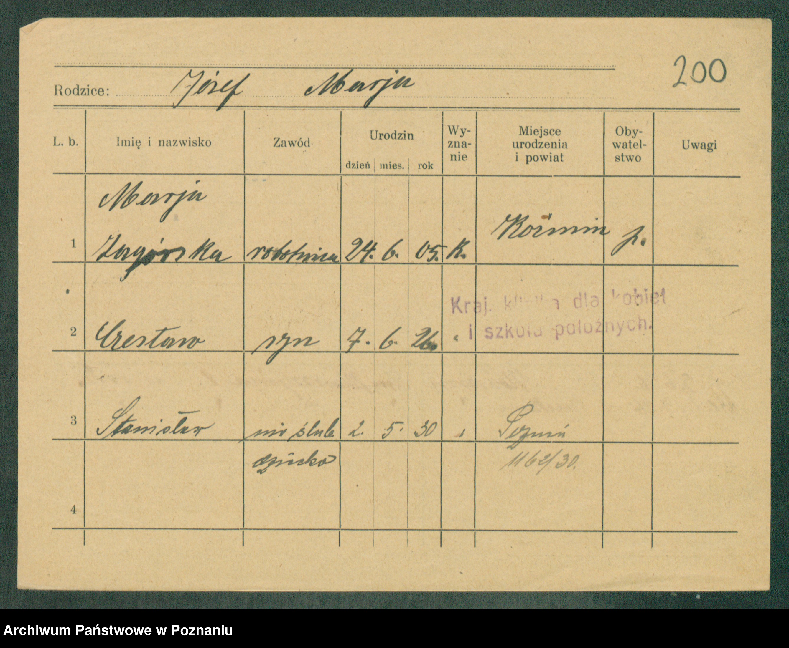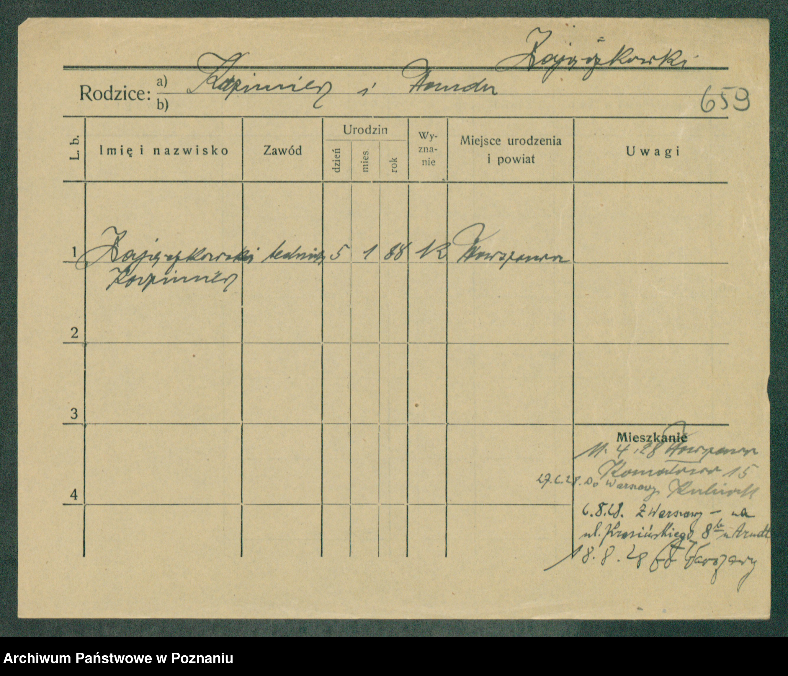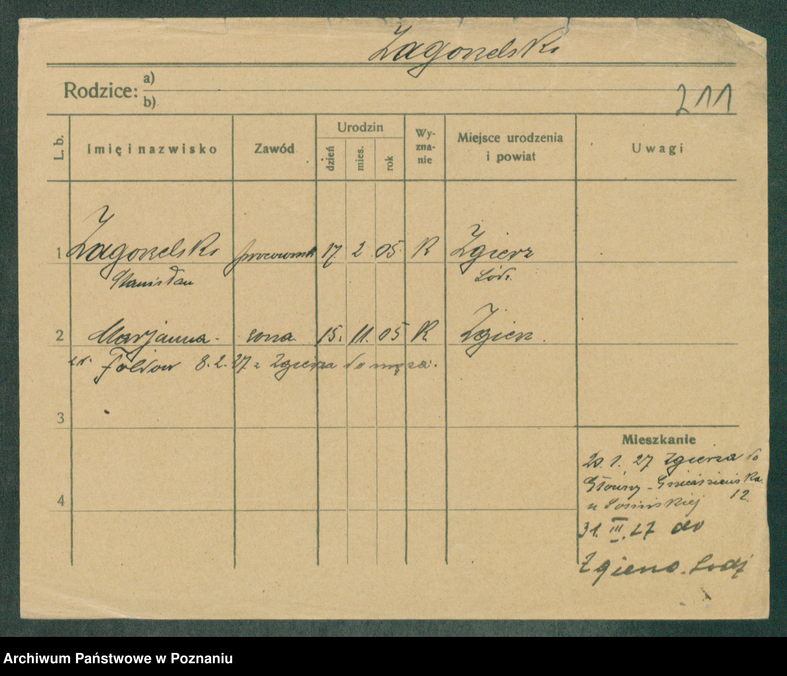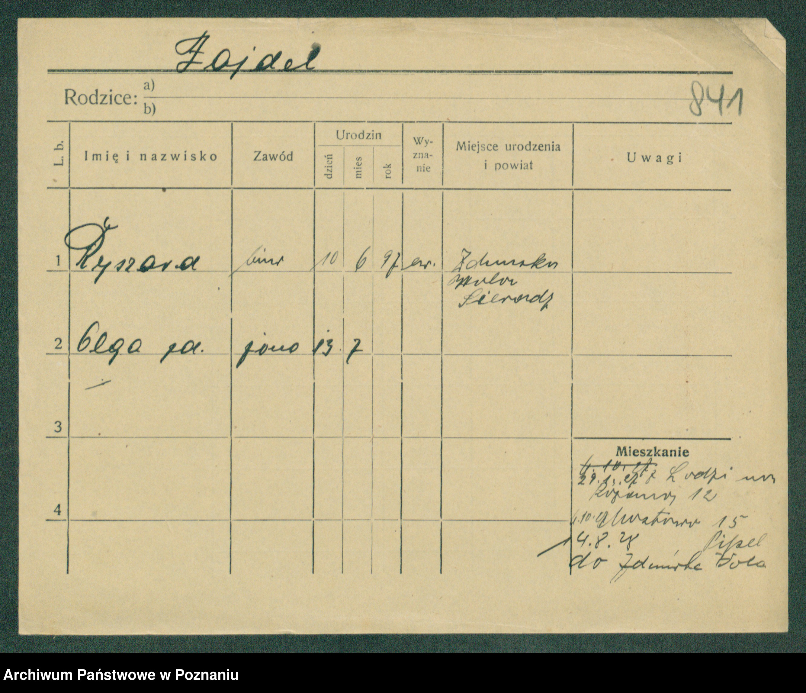 Podgląd karty osobowej dostępny jest po kliknięciu na nazwisko lub ikonkę karty. Można dokonywać powiększenia (ikony na górze) lub przechodzić między kolejnymi skanami (strzałki po bokach).