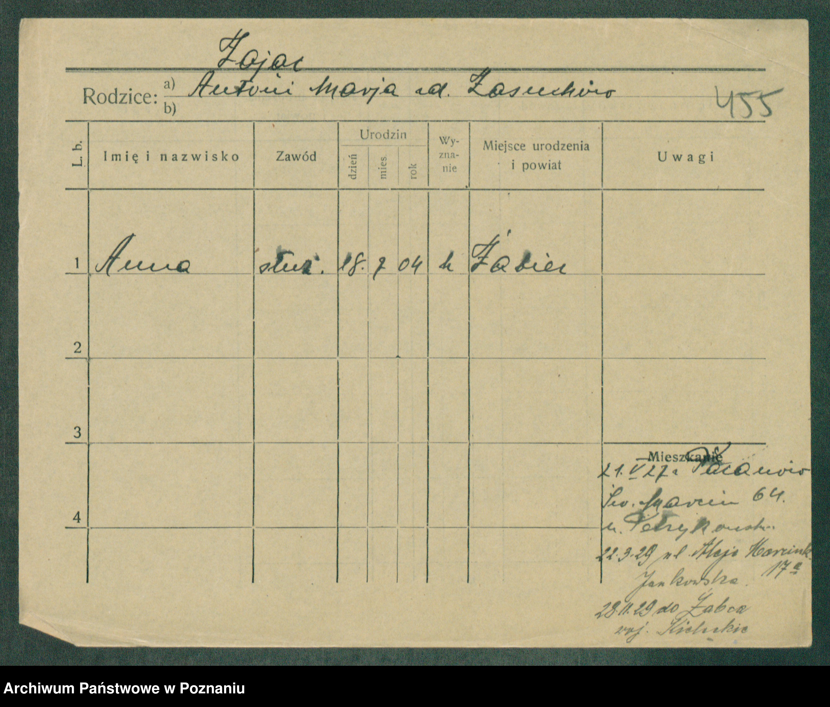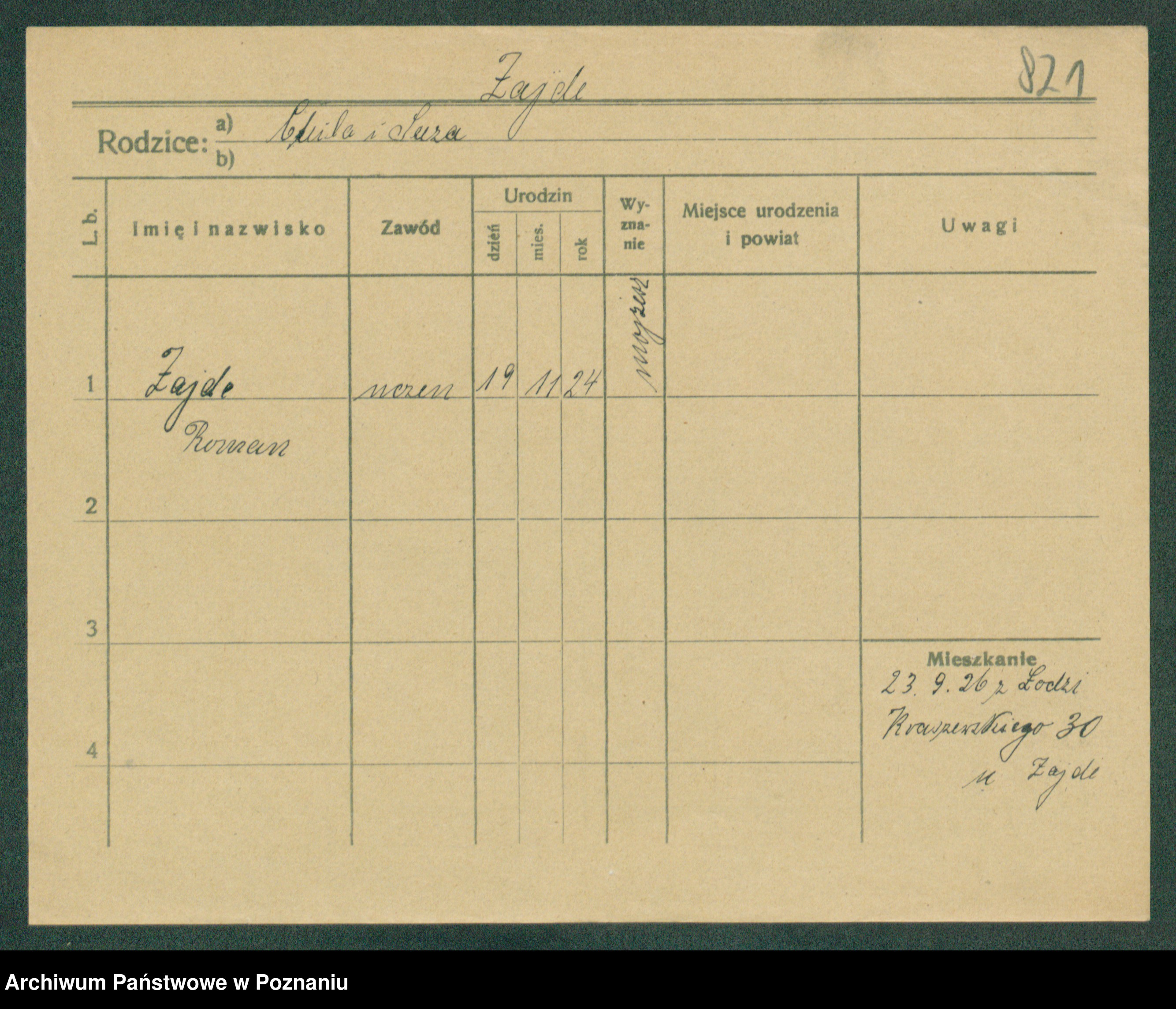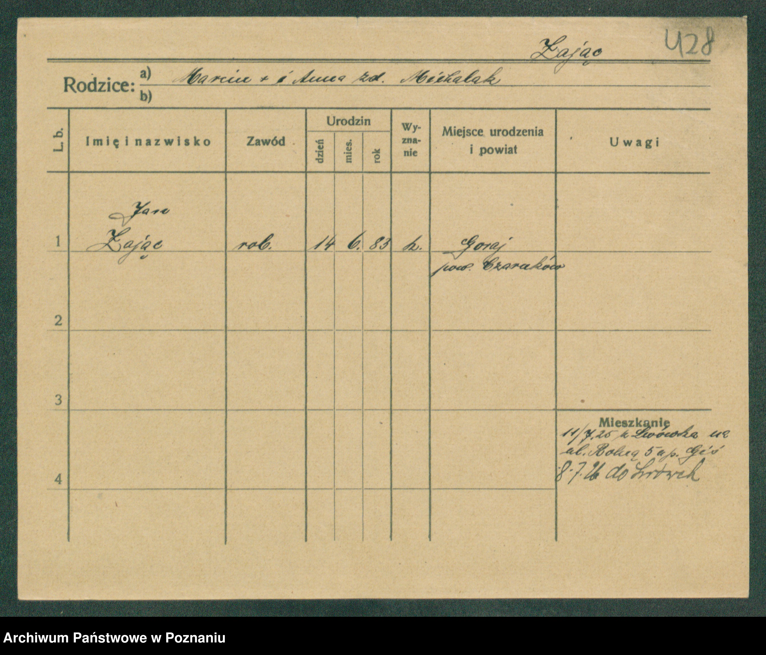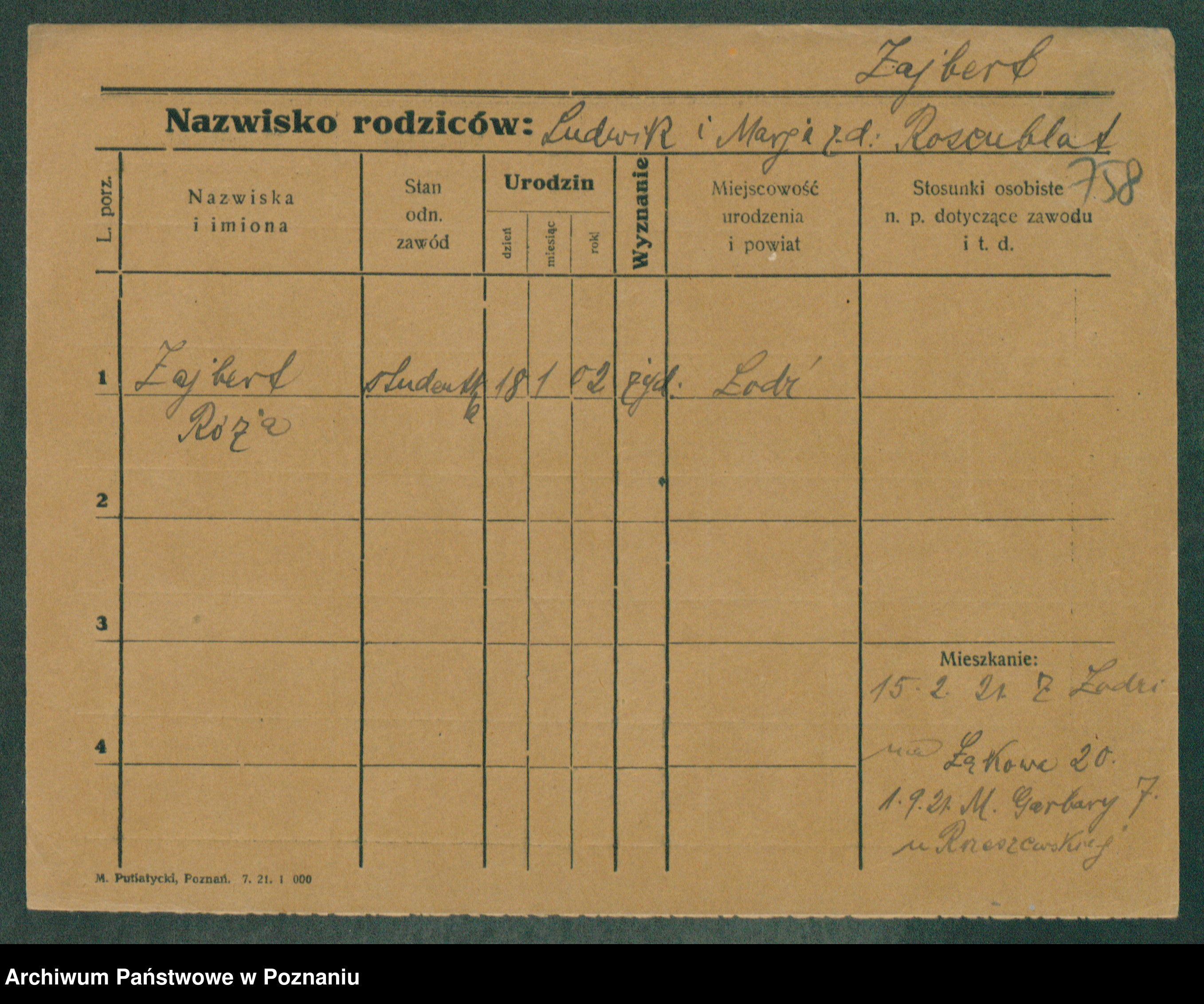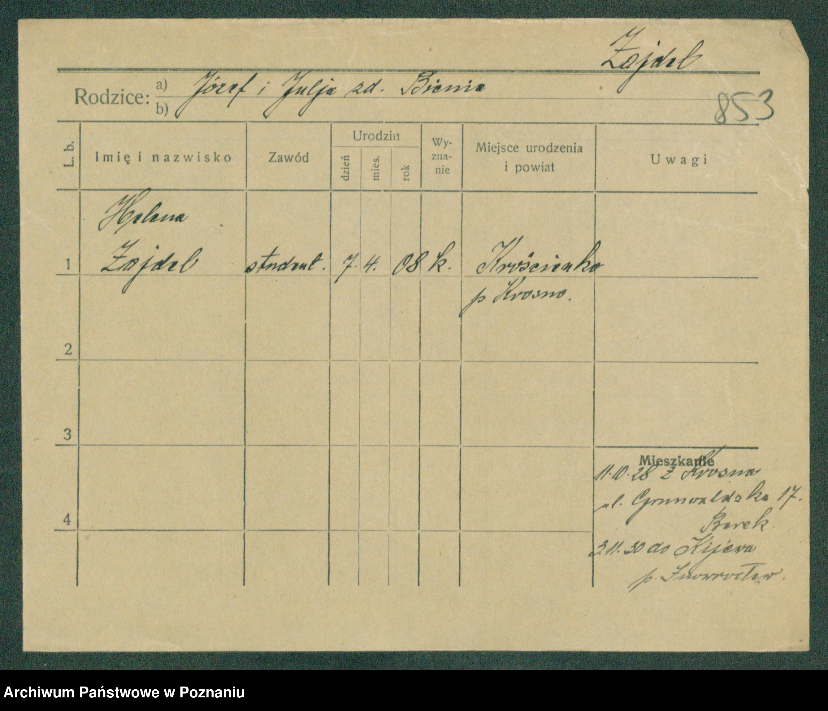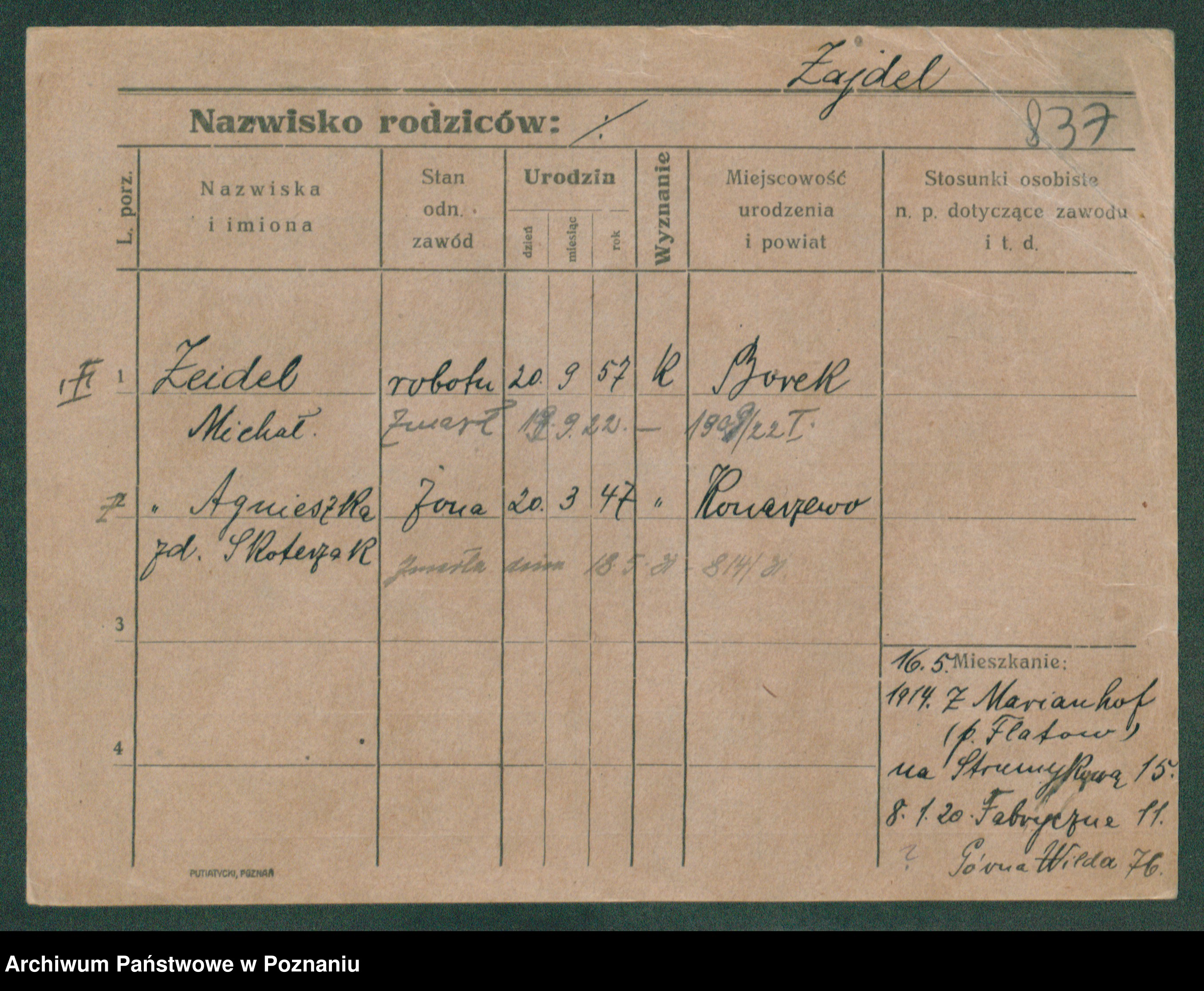 Podgląd karty osobowej dostępny jest po kliknięciu na nazwisko lub ikonkę karty. Można dokonywać powiększenia (ikony na górze) lub przechodzić między kolejnymi skanami (strzałki po bokach).