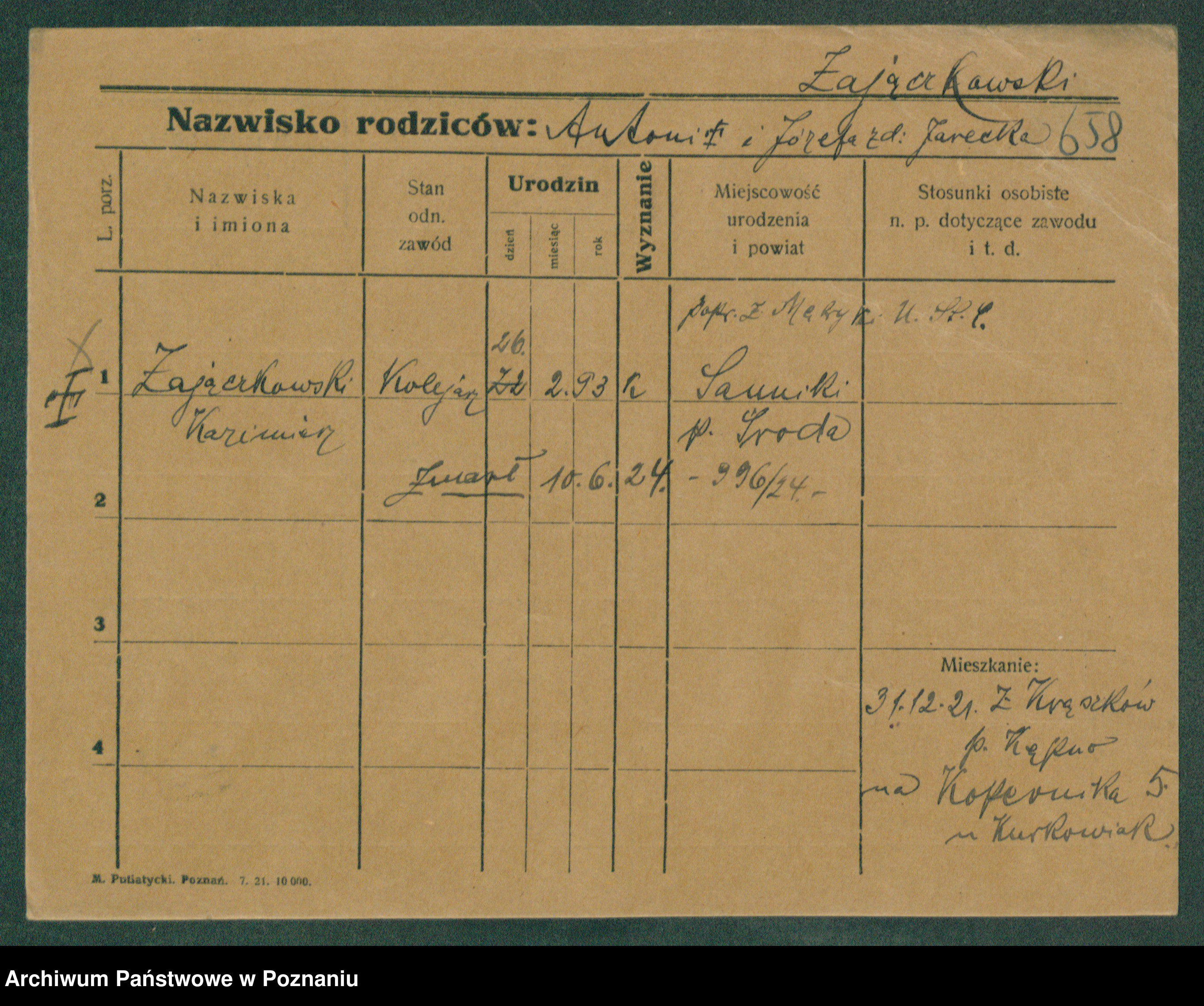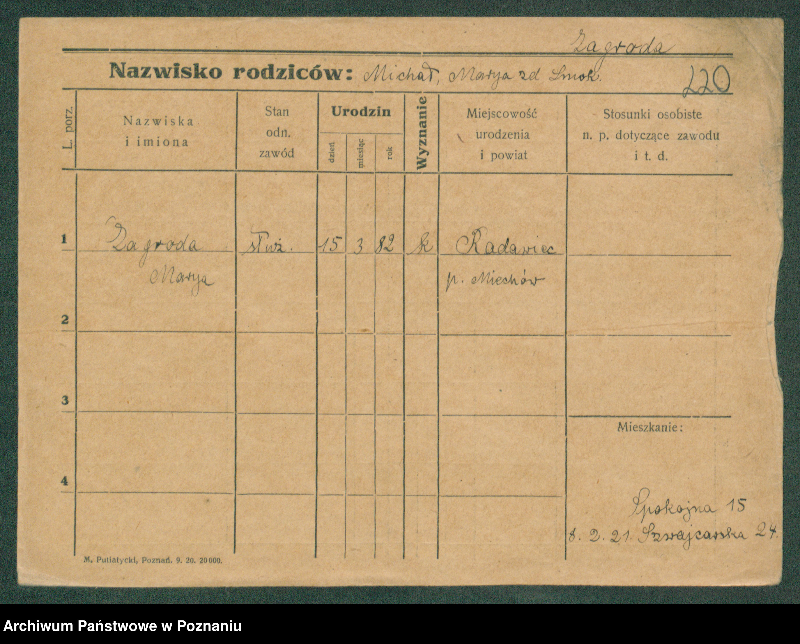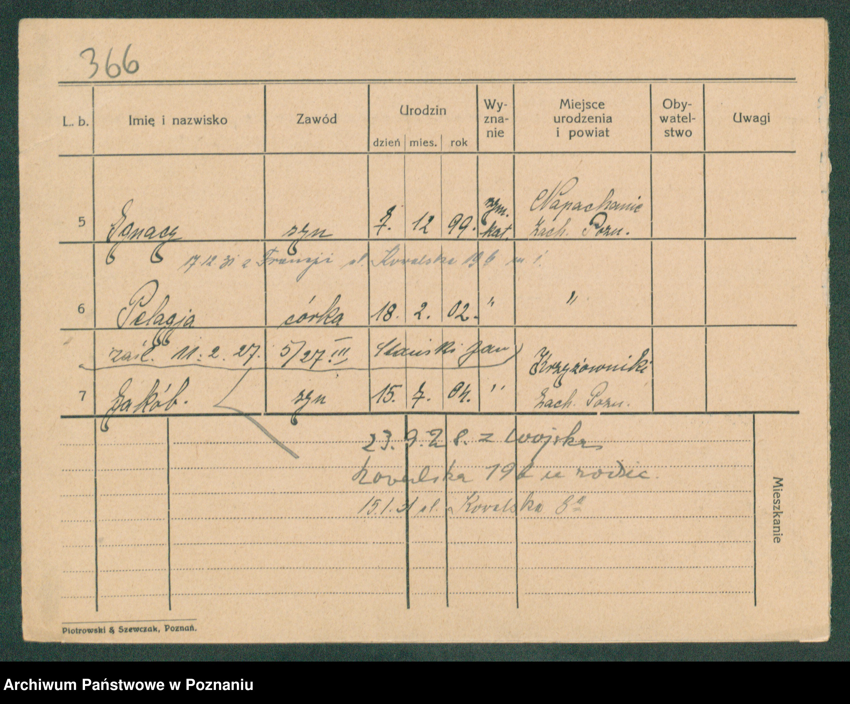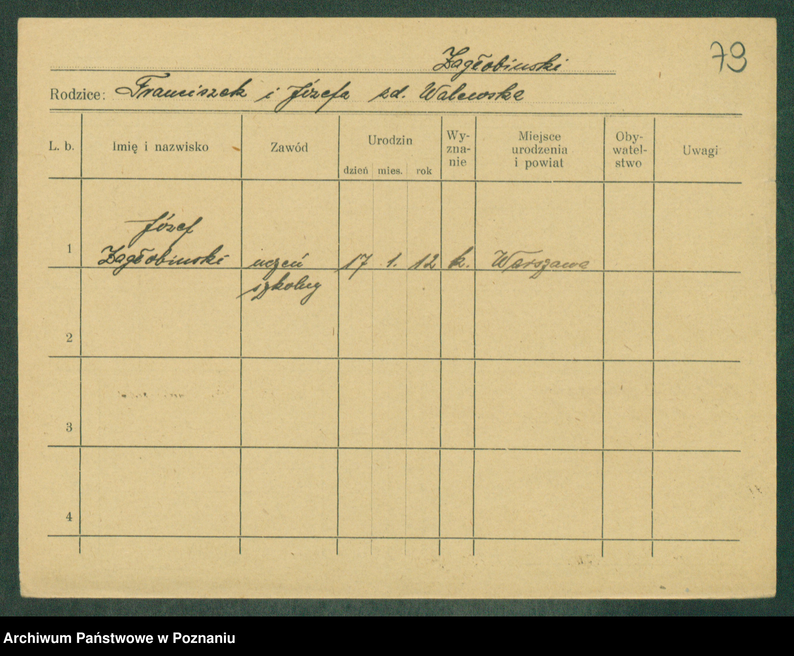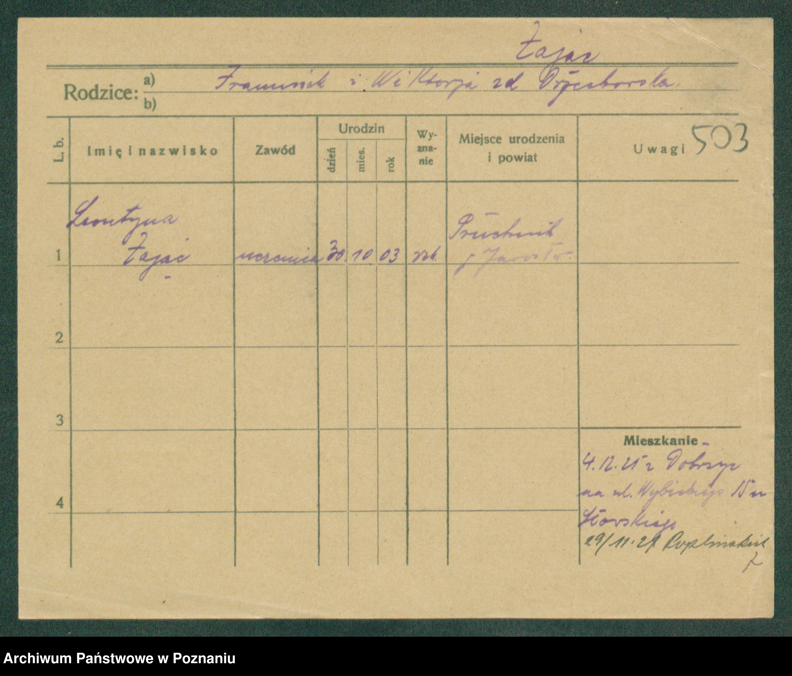 Podgląd karty osobowej dostępny jest po kliknięciu na nazwisko lub ikonkę karty. Można dokonywać powiększenia (ikony na górze) lub przechodzić między kolejnymi skanami (strzałki po bokach).