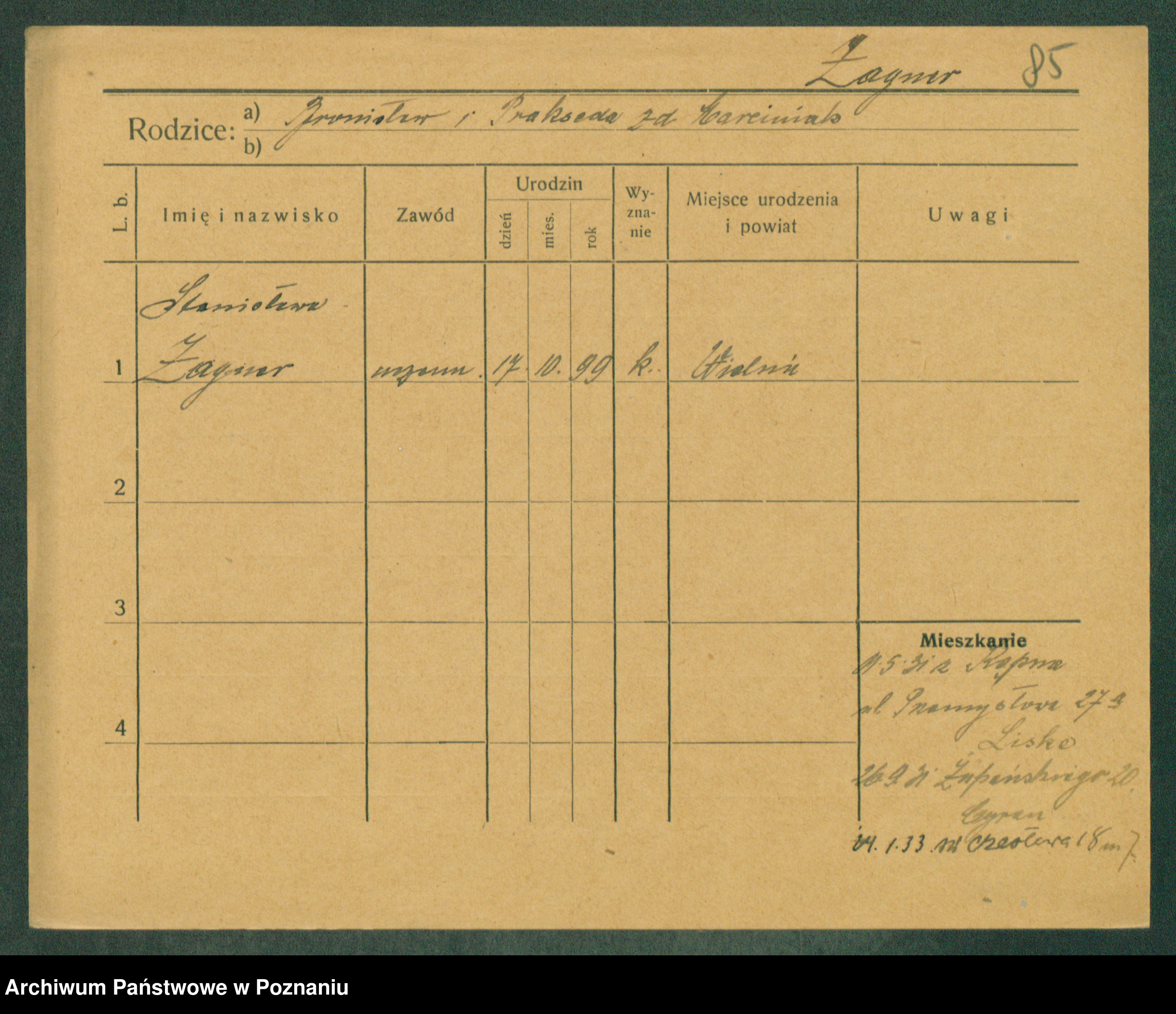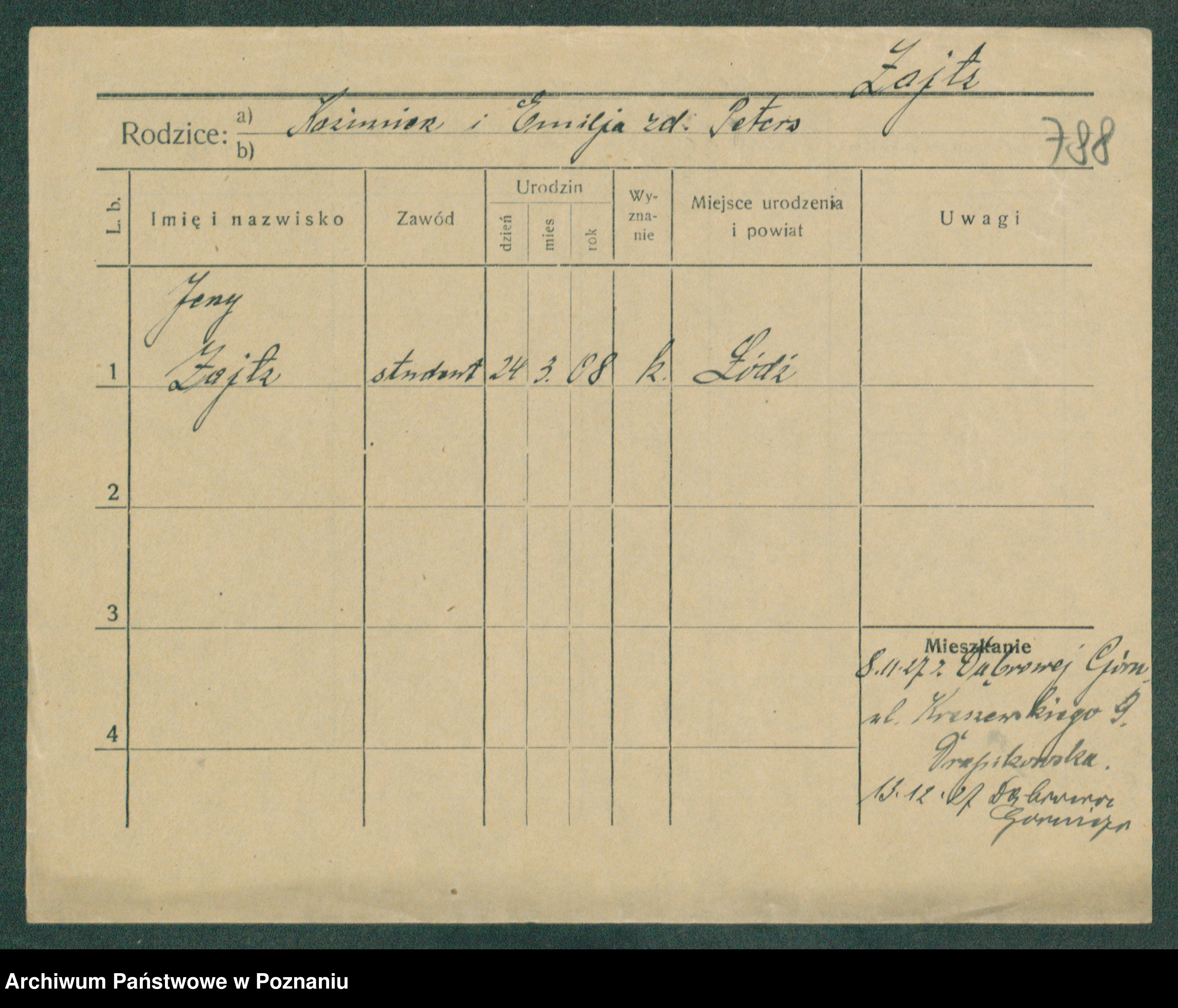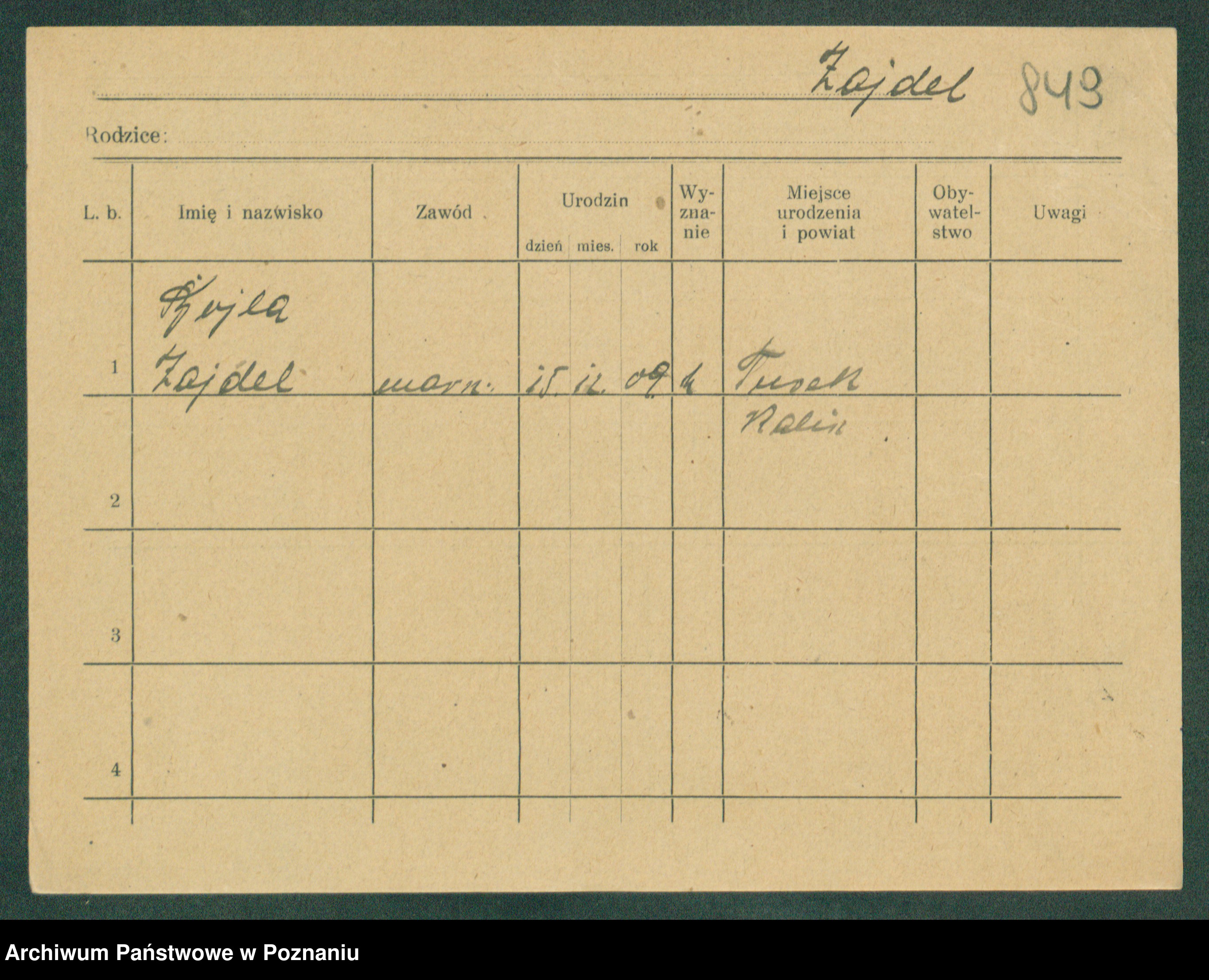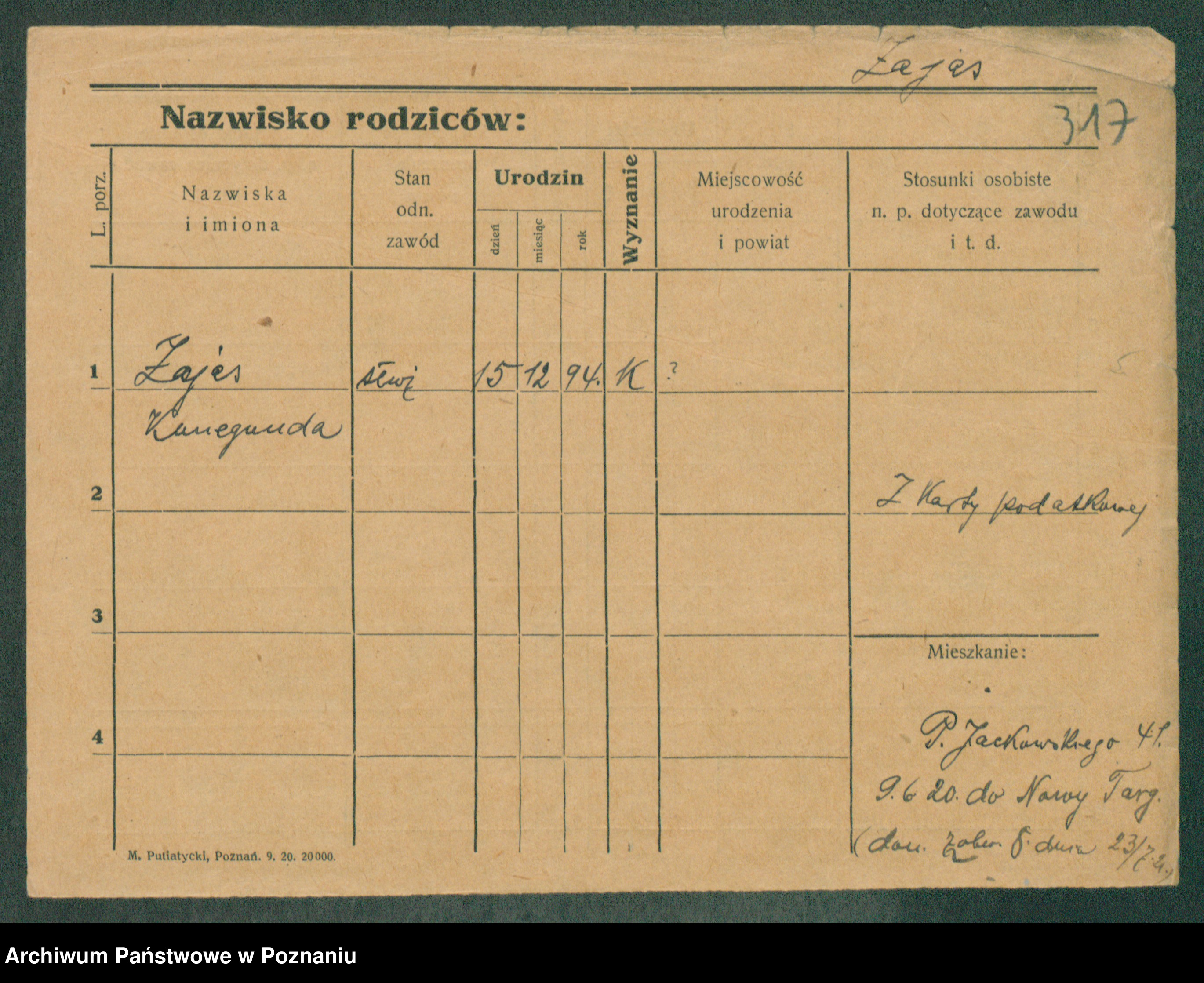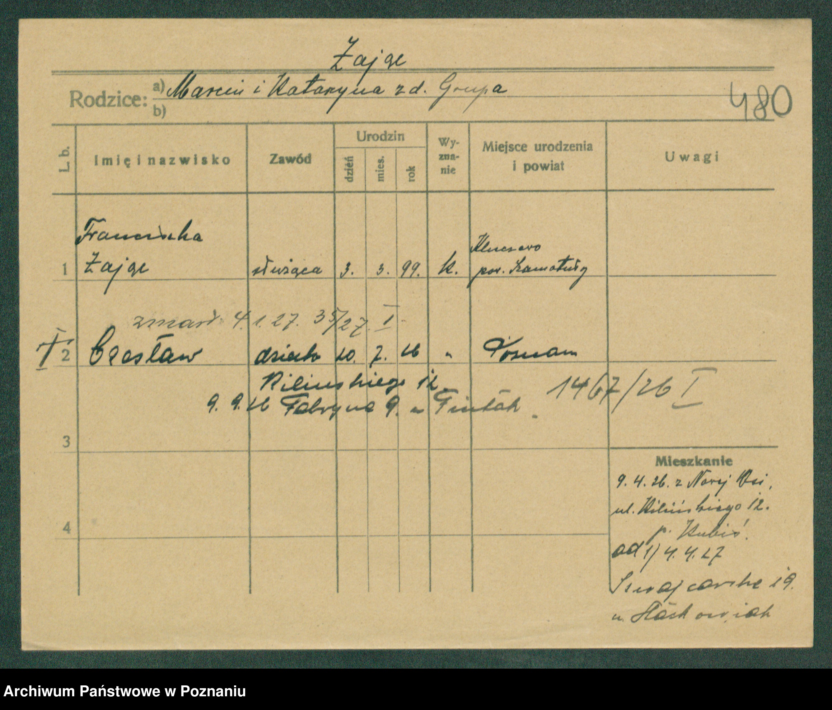 Podgląd karty osobowej dostępny jest po kliknięciu na nazwisko lub ikonkę karty. Można dokonywać powiększenia (ikony na górze) lub przechodzić między kolejnymi skanami (strzałki po bokach).