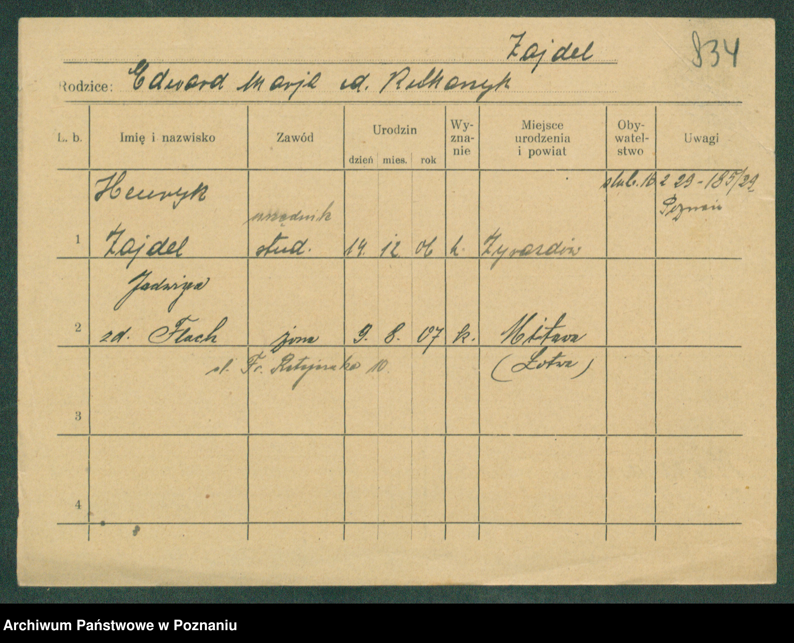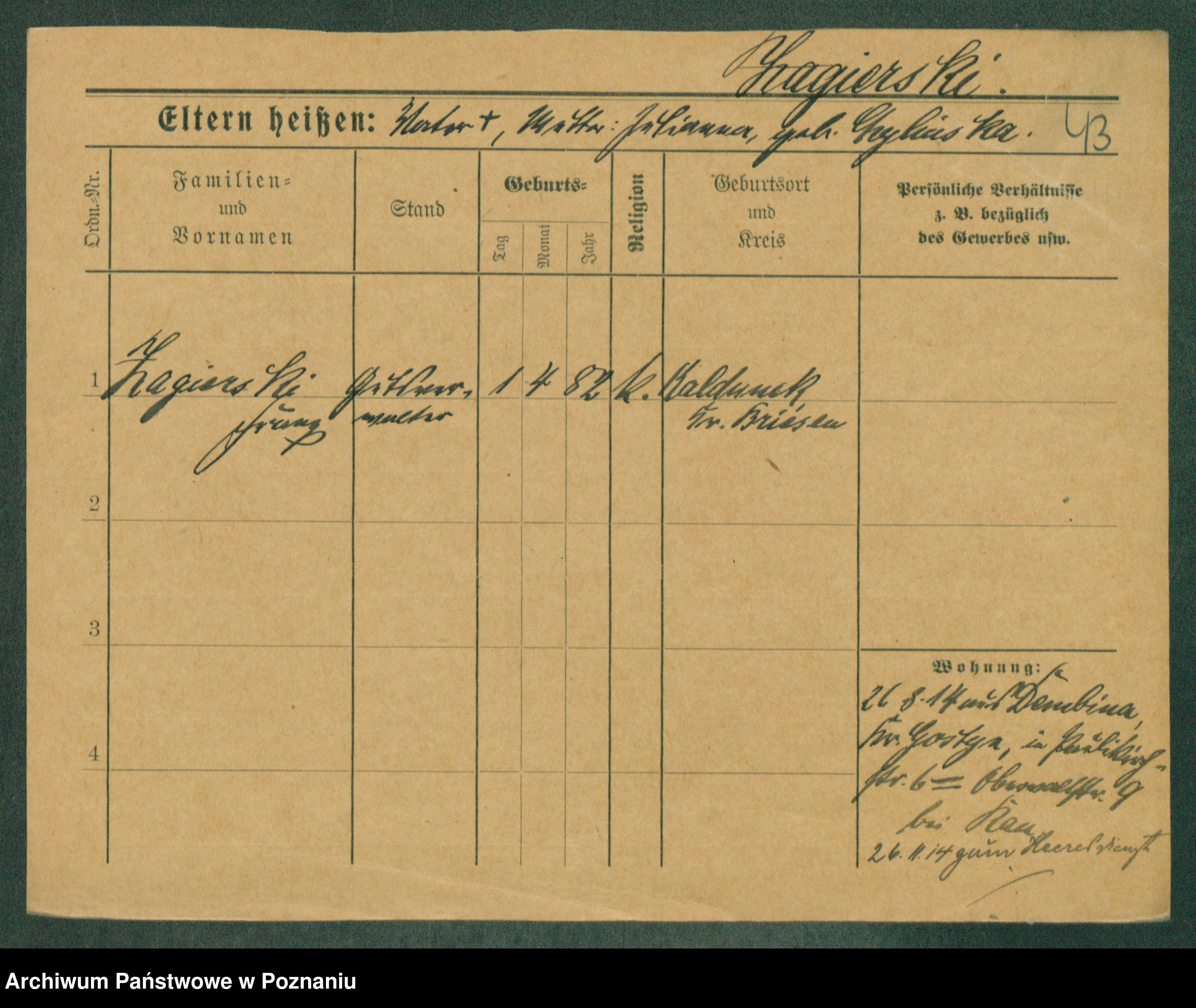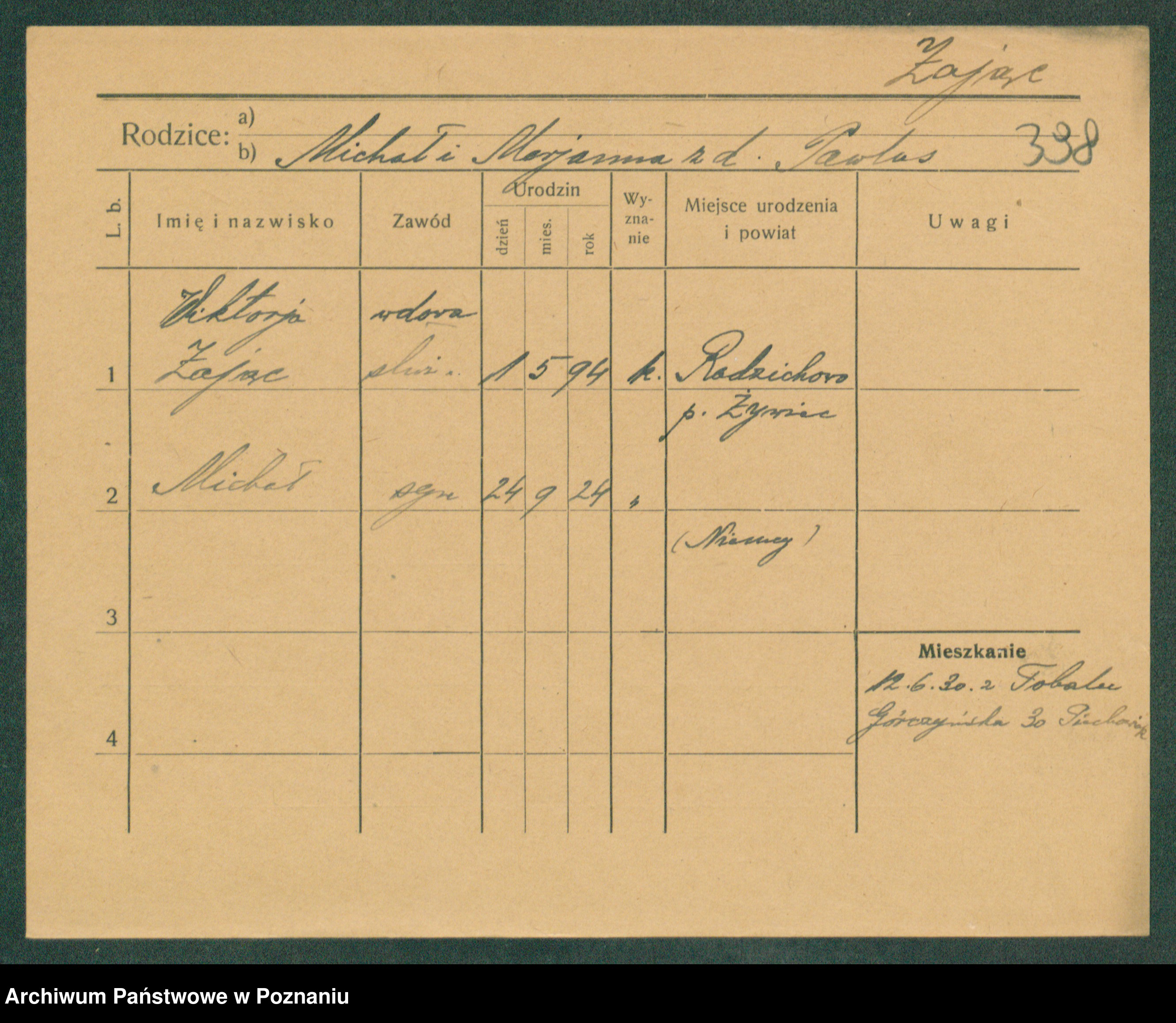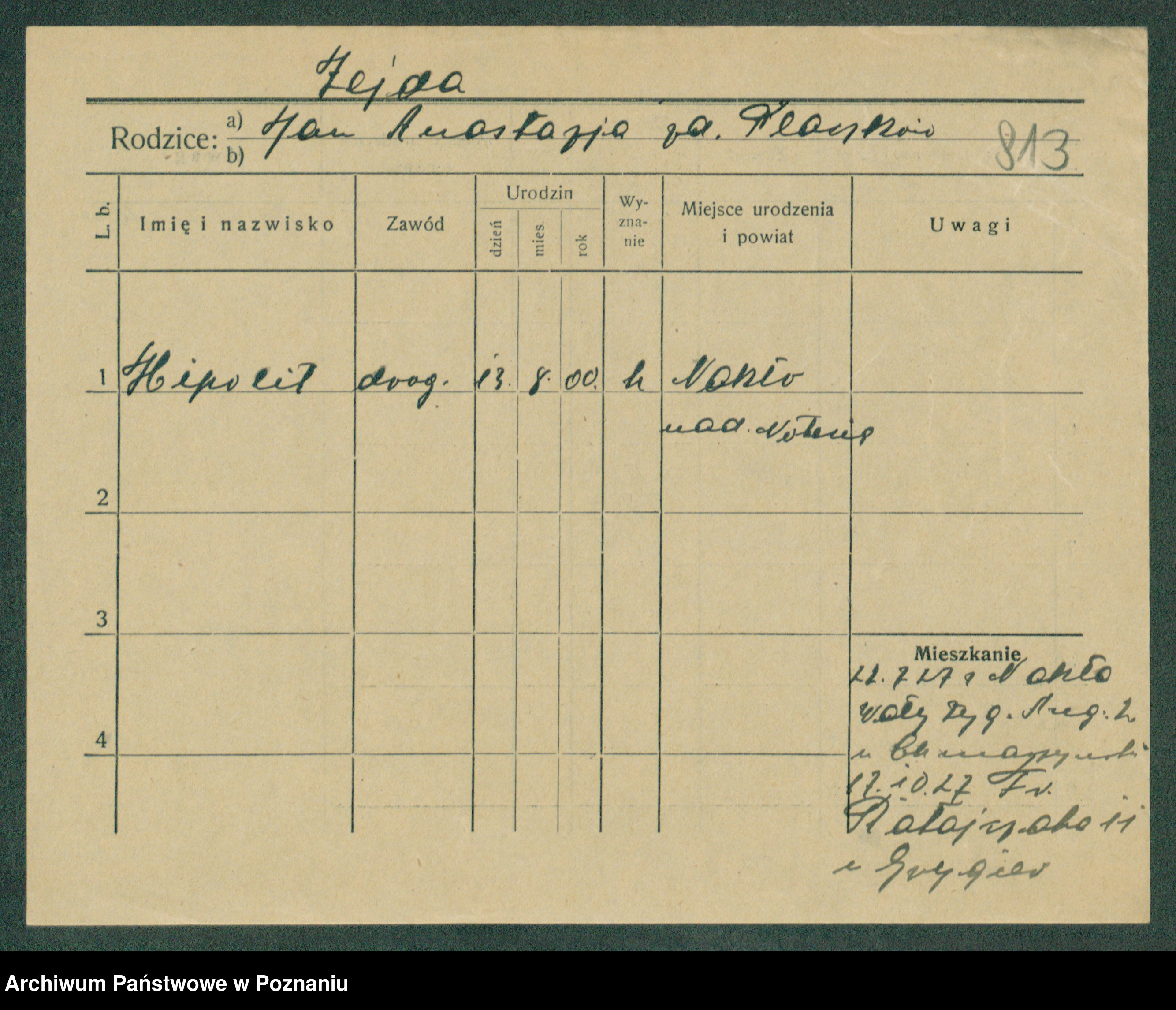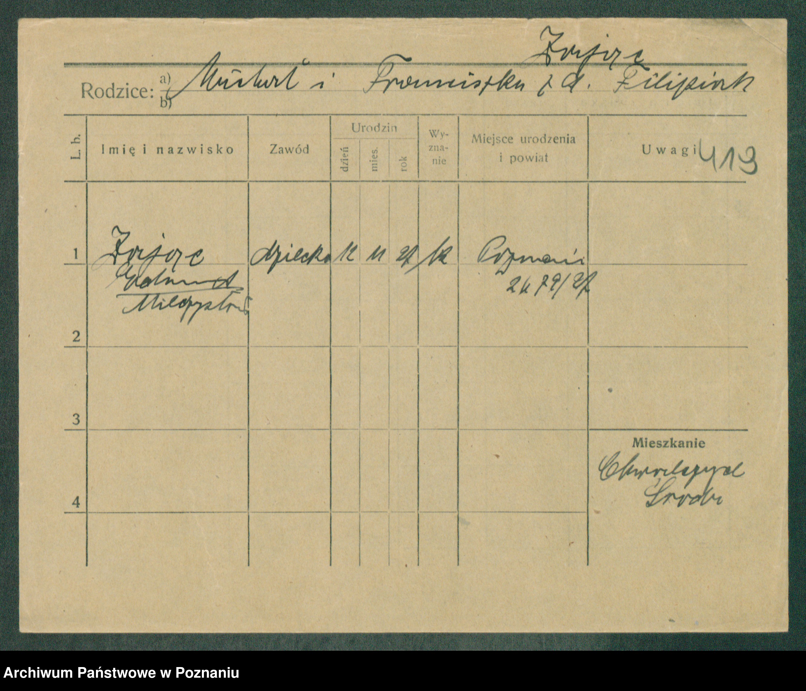 Podgląd karty osobowej dostępny jest po kliknięciu na nazwisko lub ikonkę karty. Można dokonywać powiększenia (ikony na górze) lub przechodzić między kolejnymi skanami (strzałki po bokach).