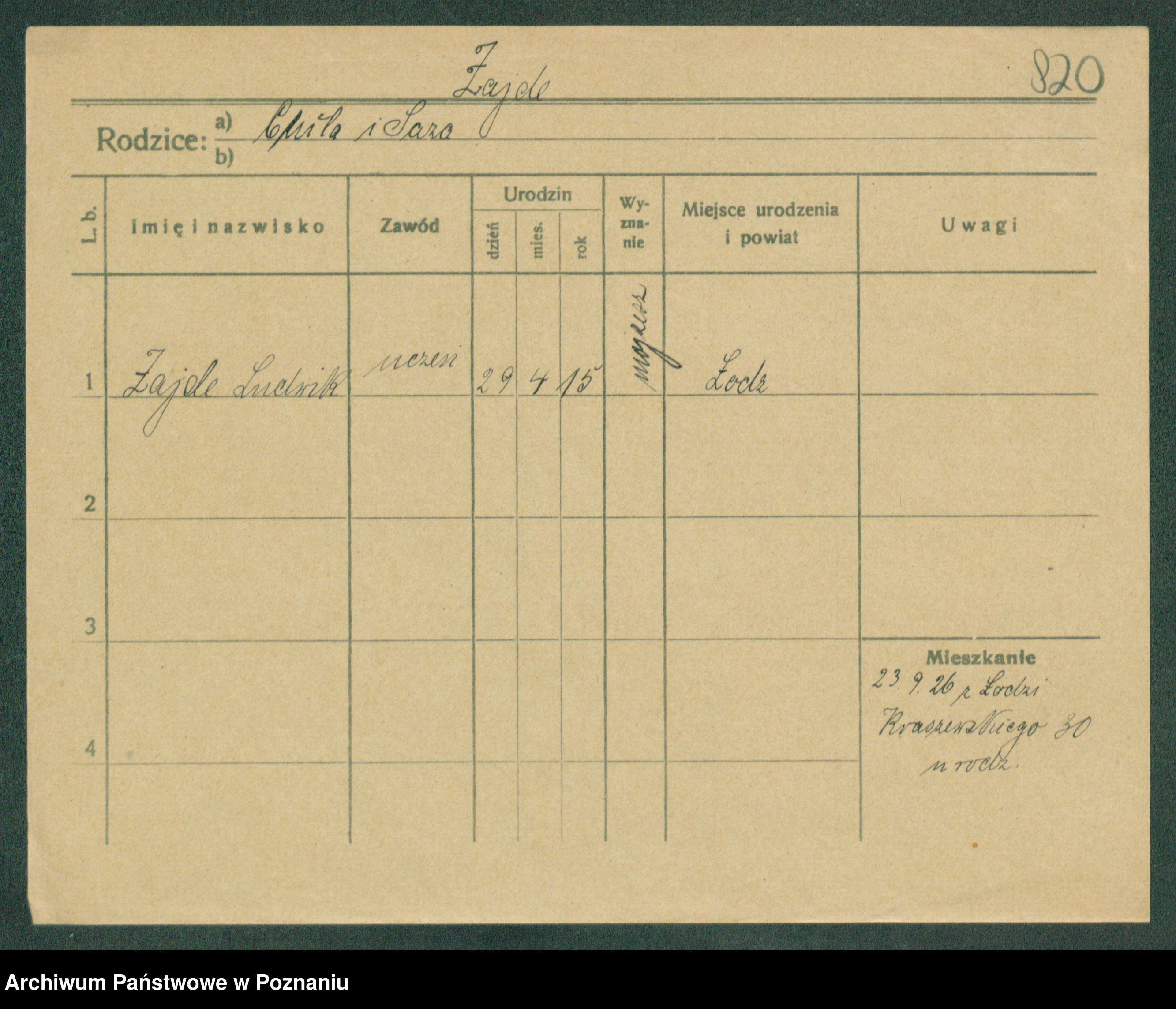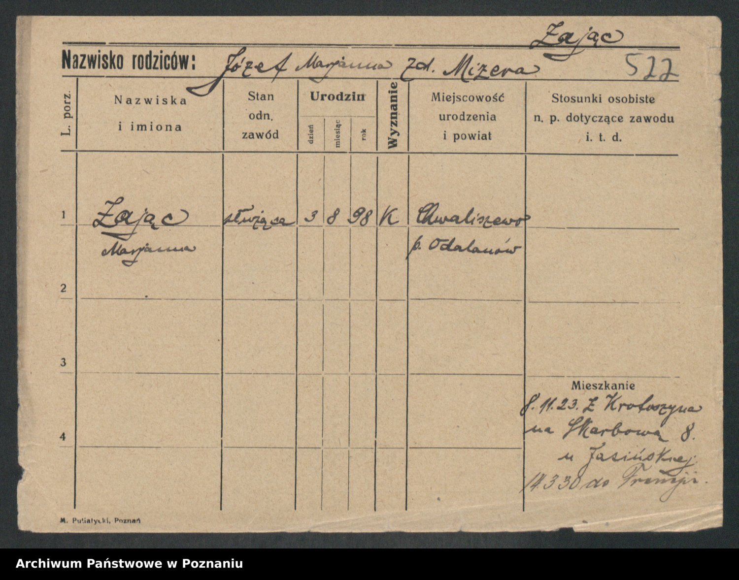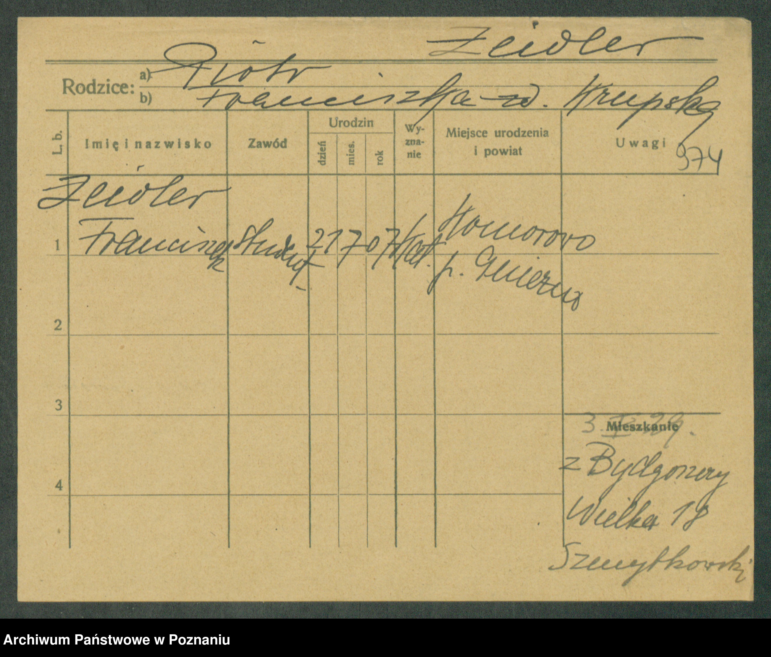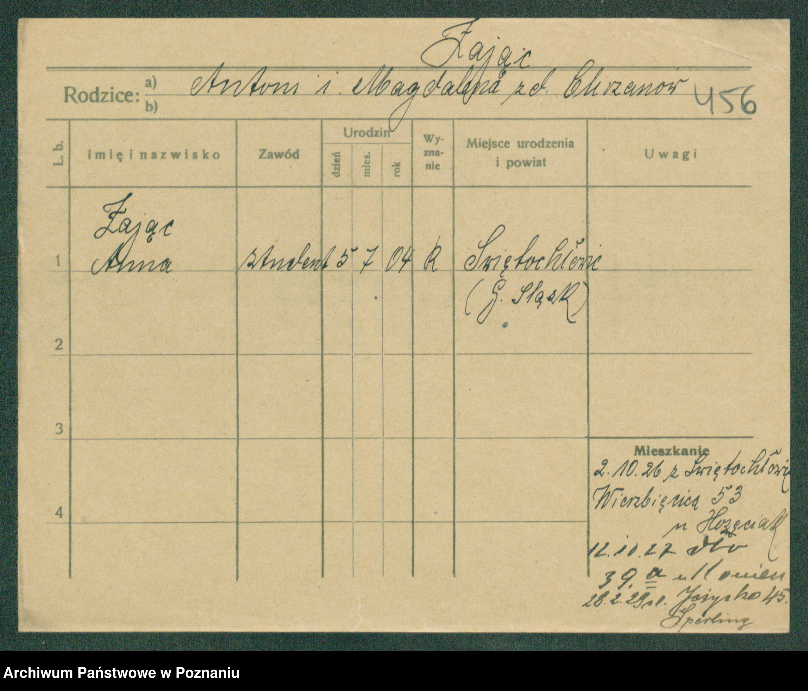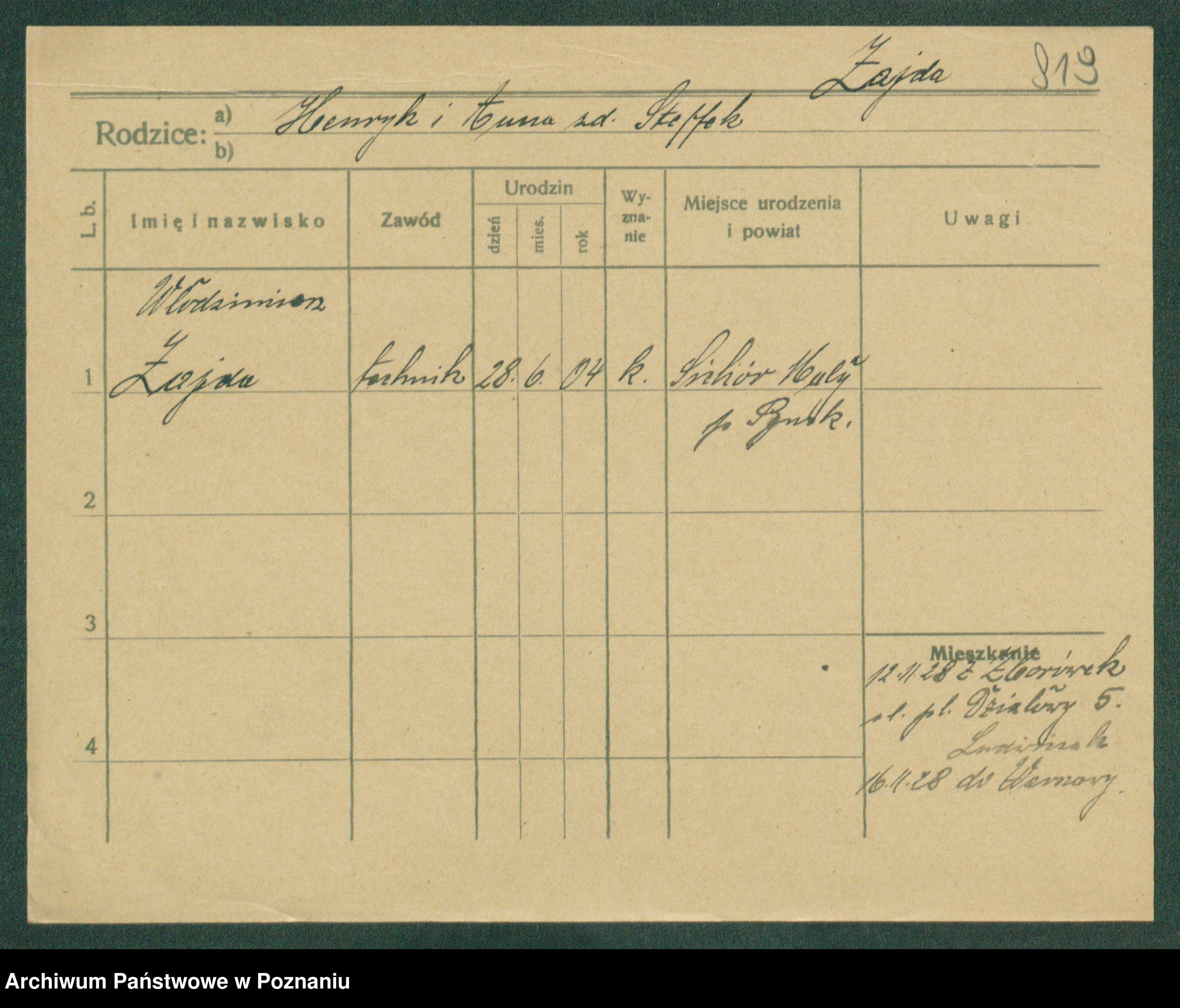 Podgląd karty osobowej dostępny jest po kliknięciu na nazwisko lub ikonkę karty. Można dokonywać powiększenia (ikony na górze) lub przechodzić między kolejnymi skanami (strzałki po bokach).