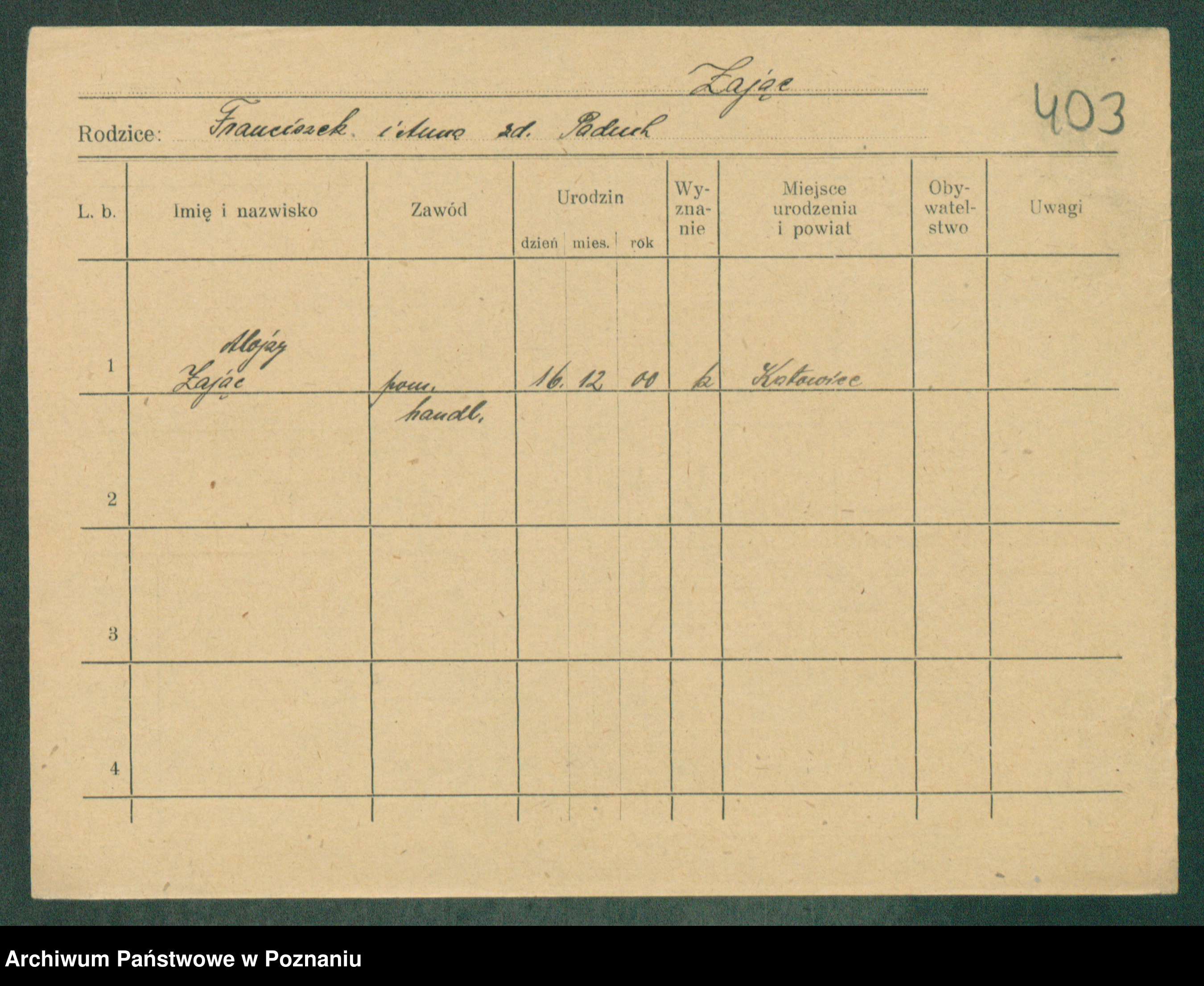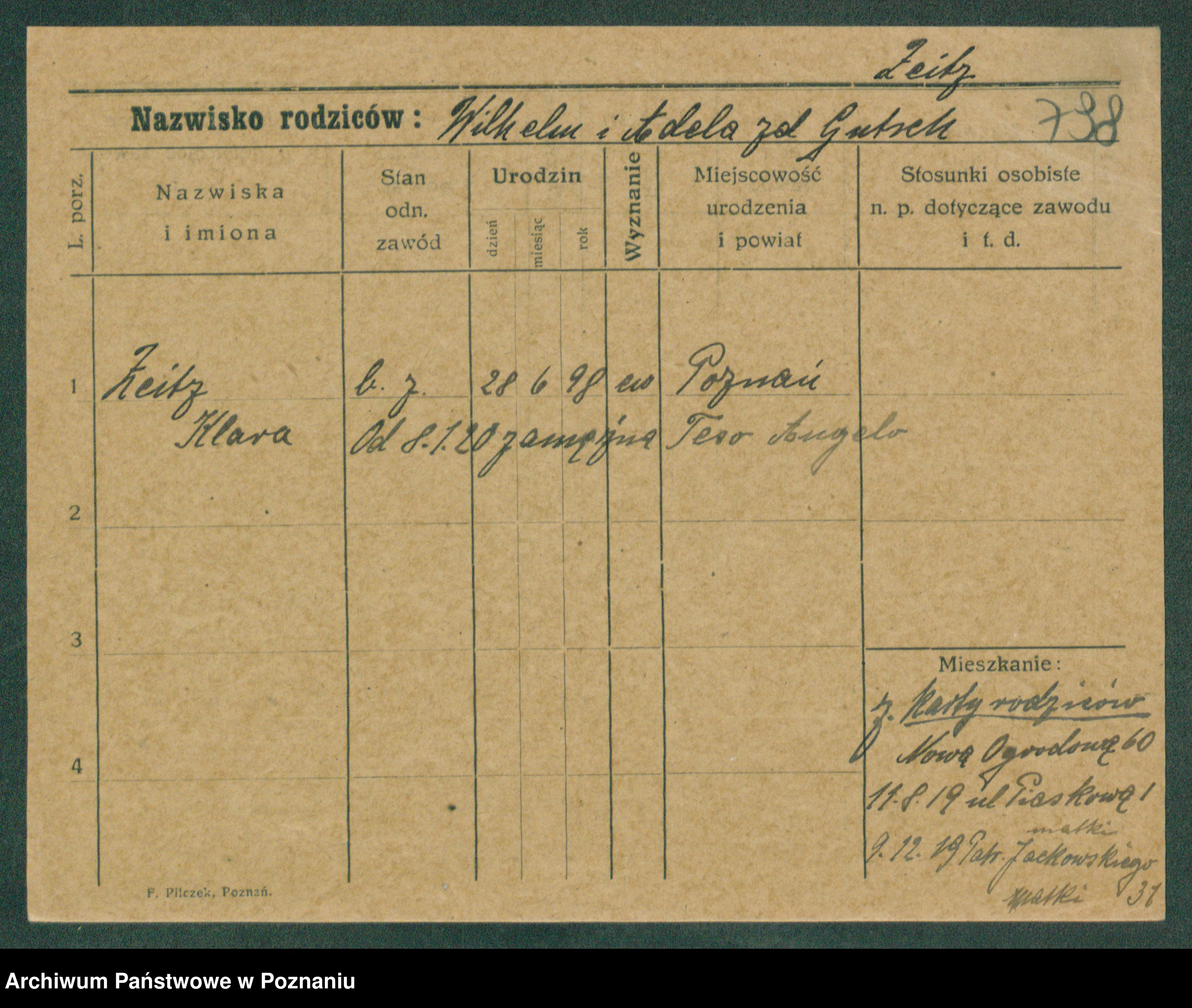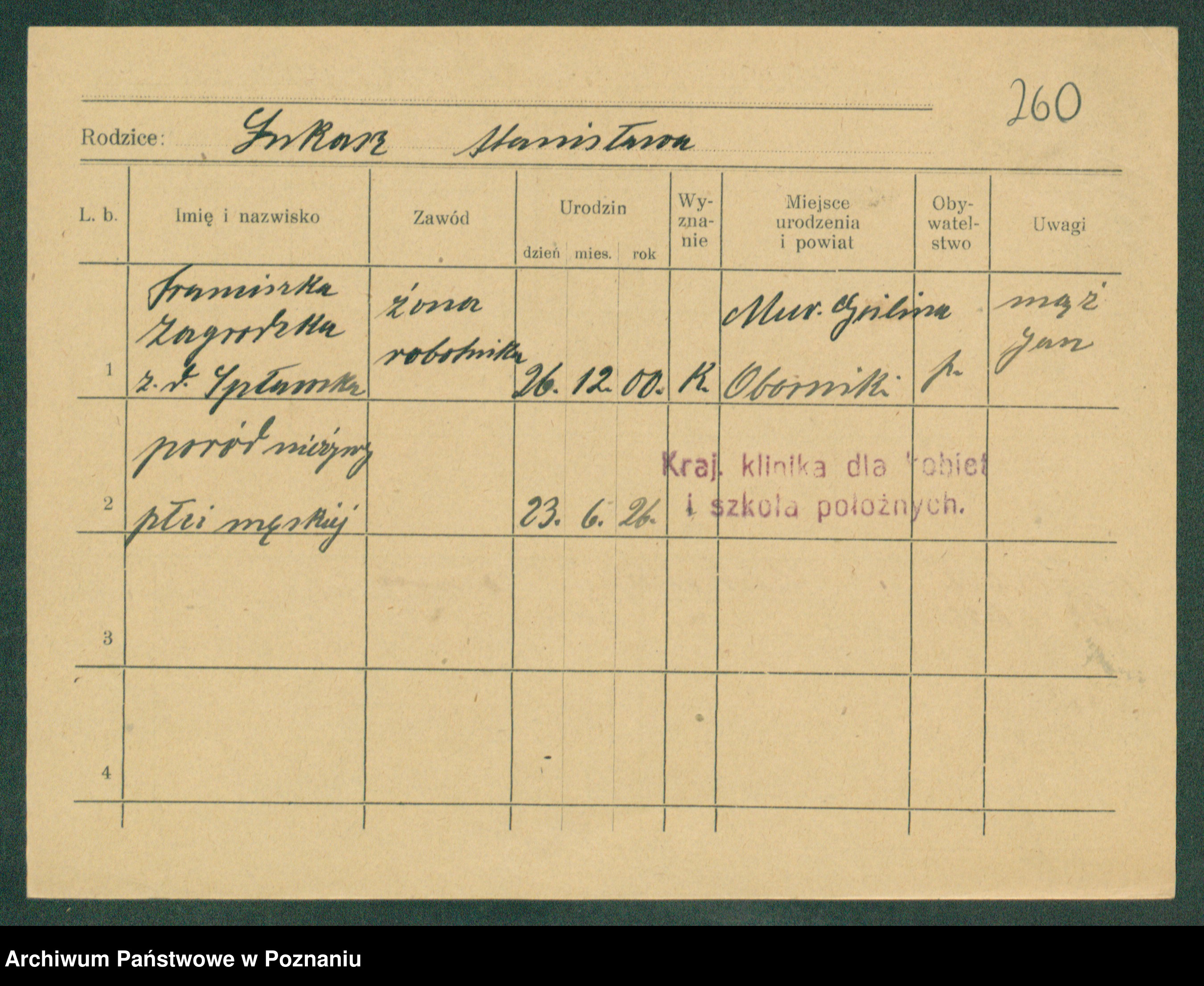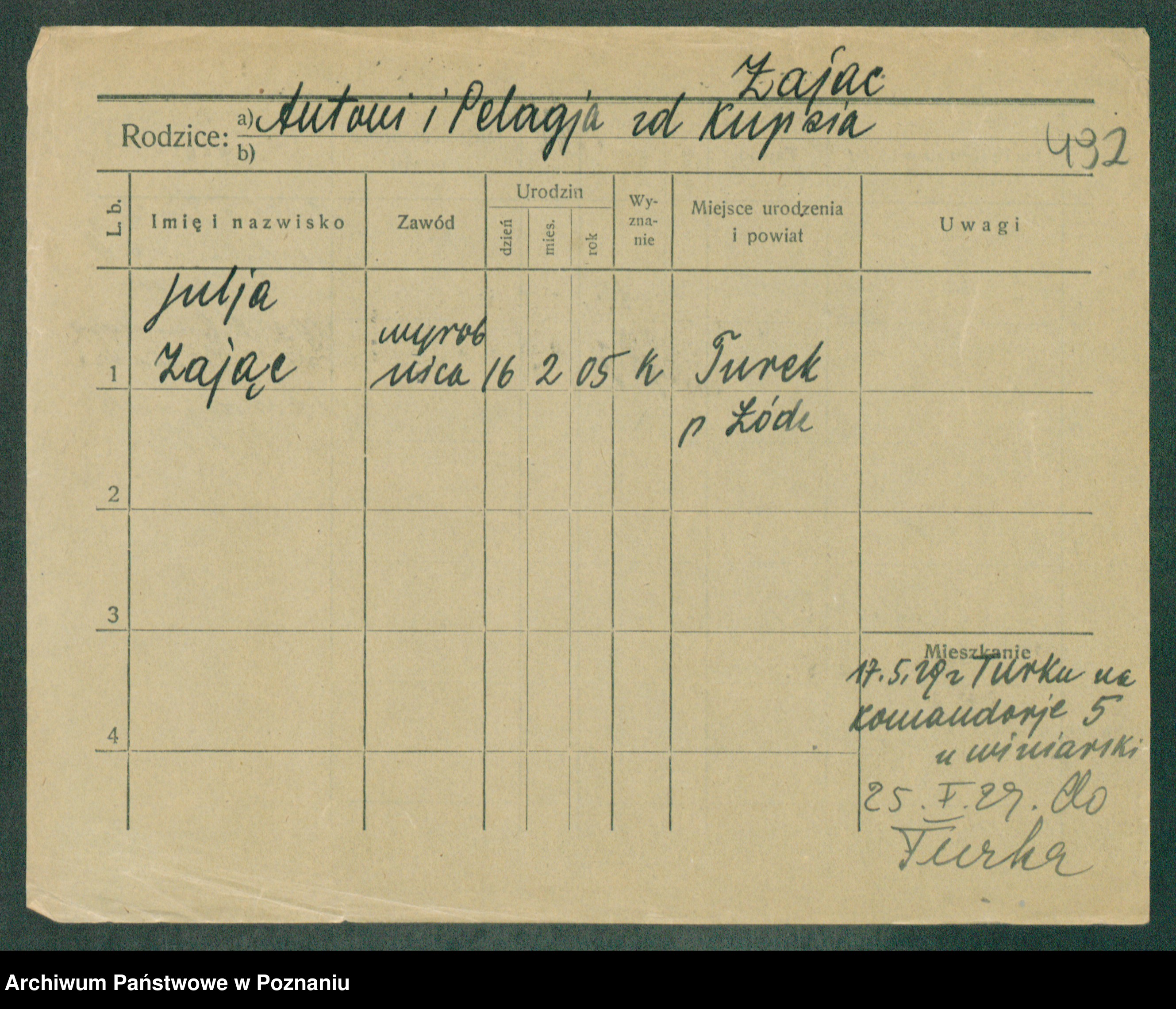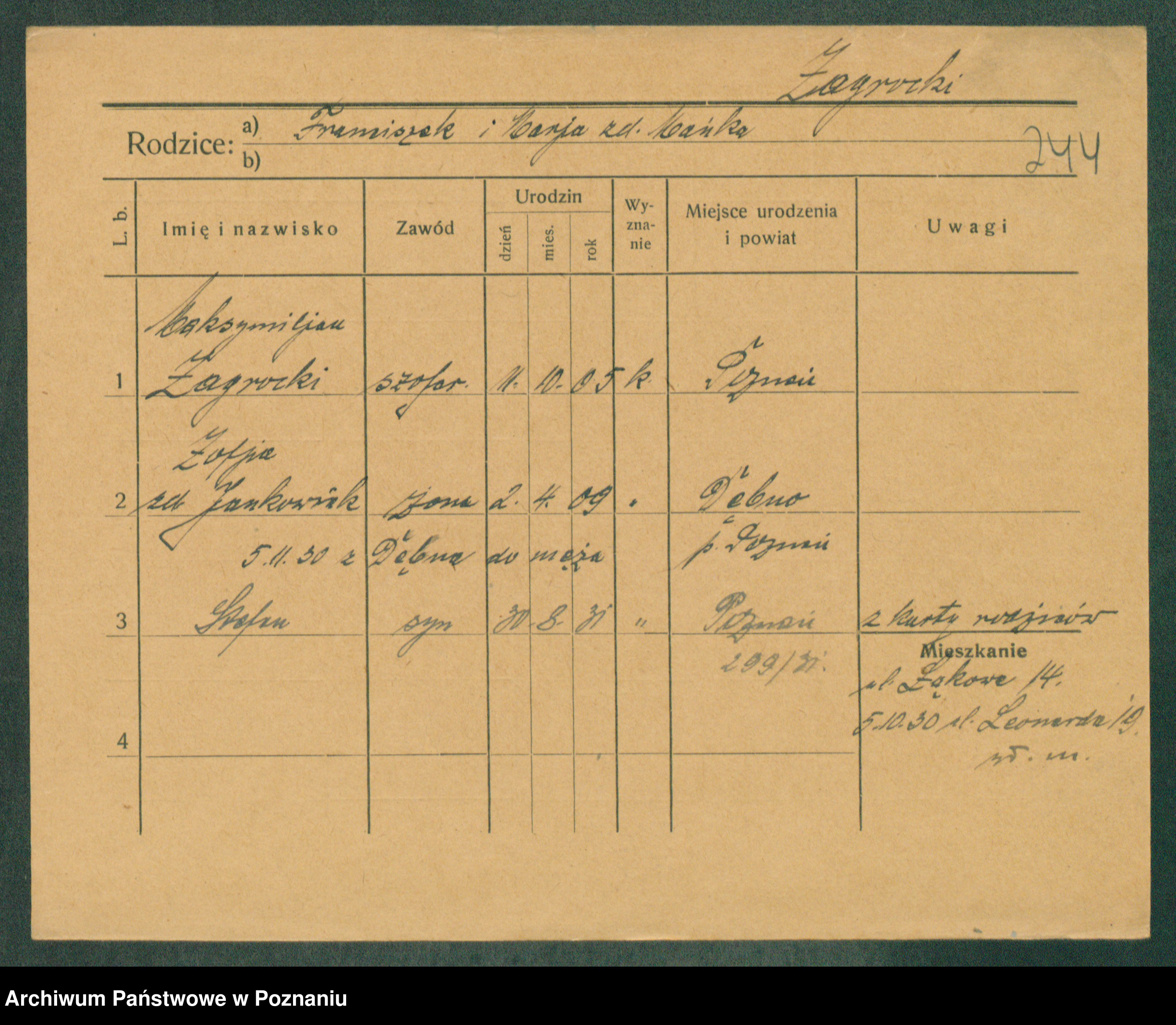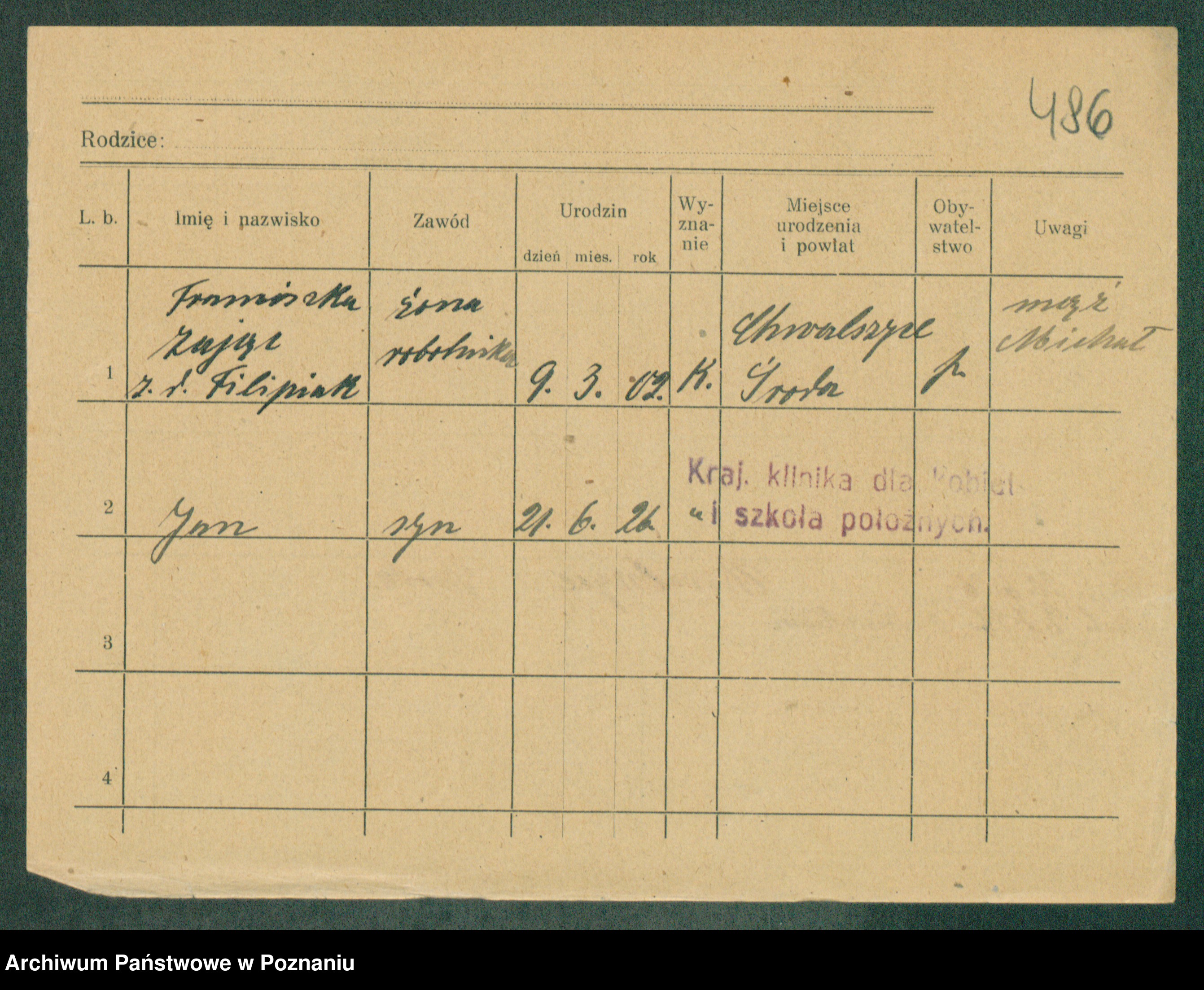 Podgląd karty osobowej dostępny jest po kliknięciu na nazwisko lub ikonkę karty. Można dokonywać powiększenia (ikony na górze) lub przechodzić między kolejnymi skanami (strzałki po bokach).