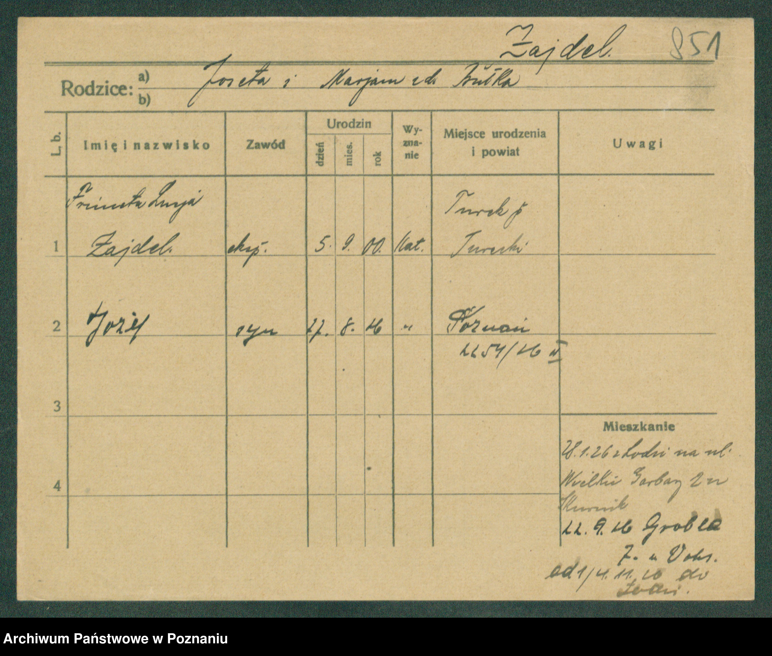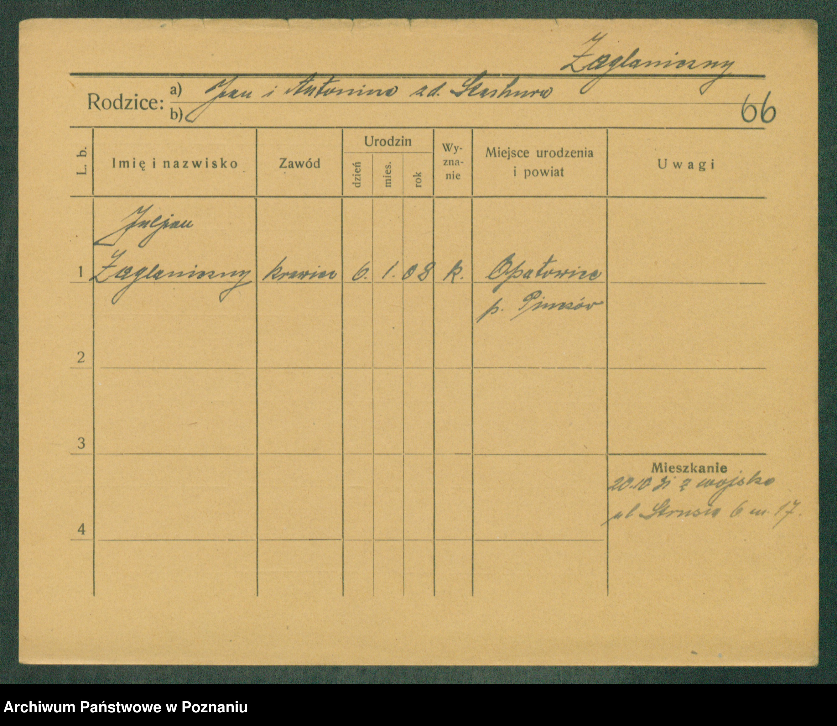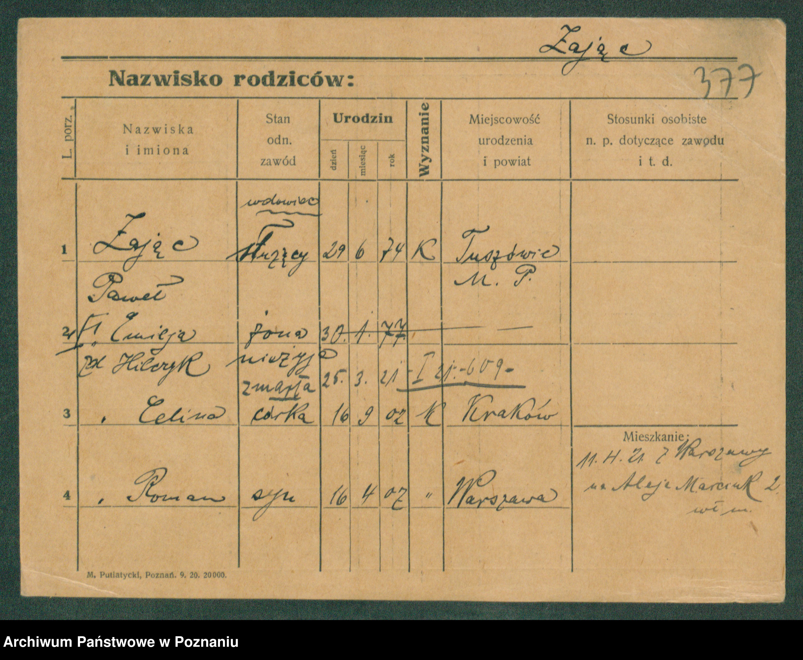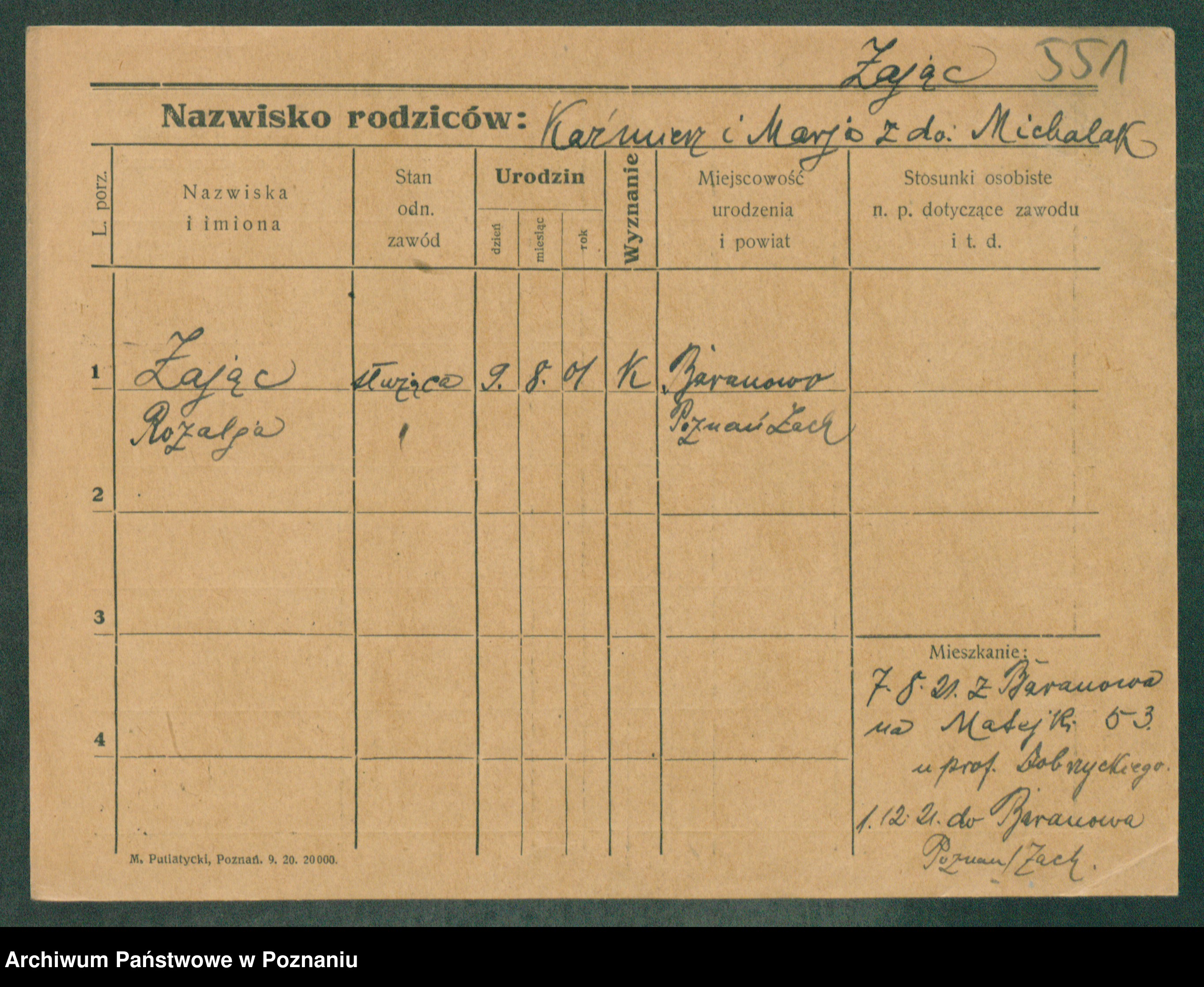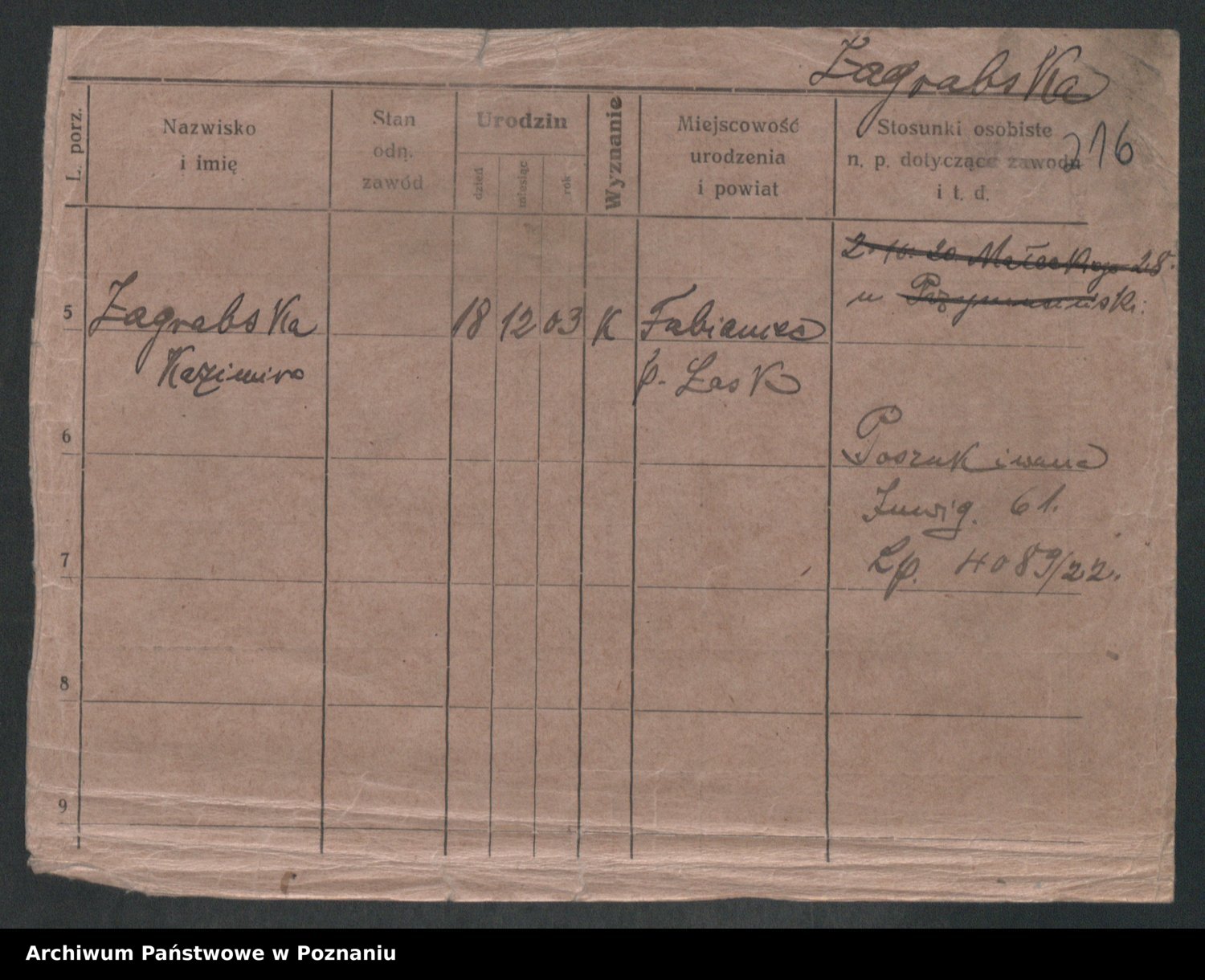 Podgląd karty osobowej dostępny jest po kliknięciu na nazwisko lub ikonkę karty. Można dokonywać powiększenia (ikony na górze) lub przechodzić między kolejnymi skanami (strzałki po bokach).