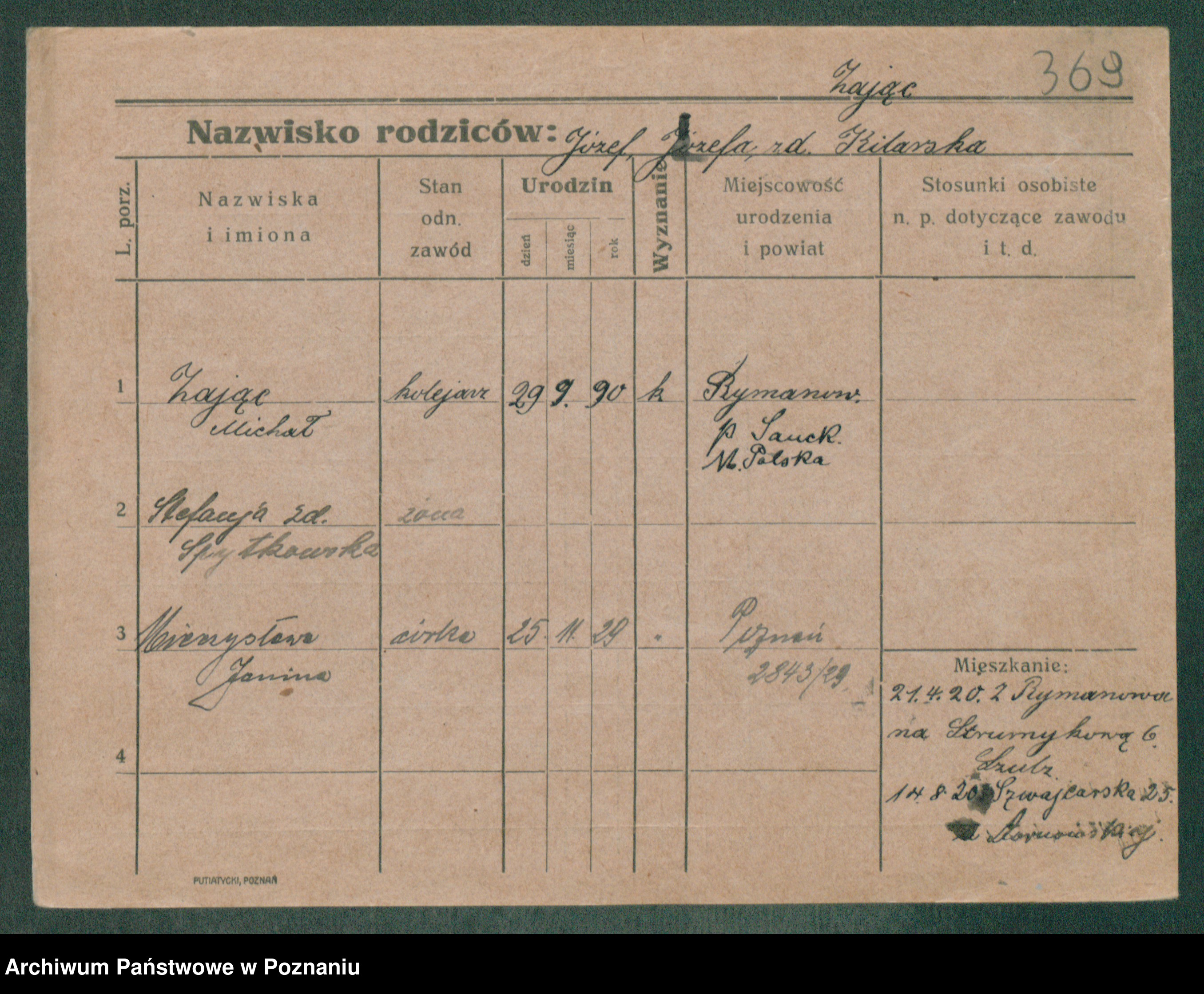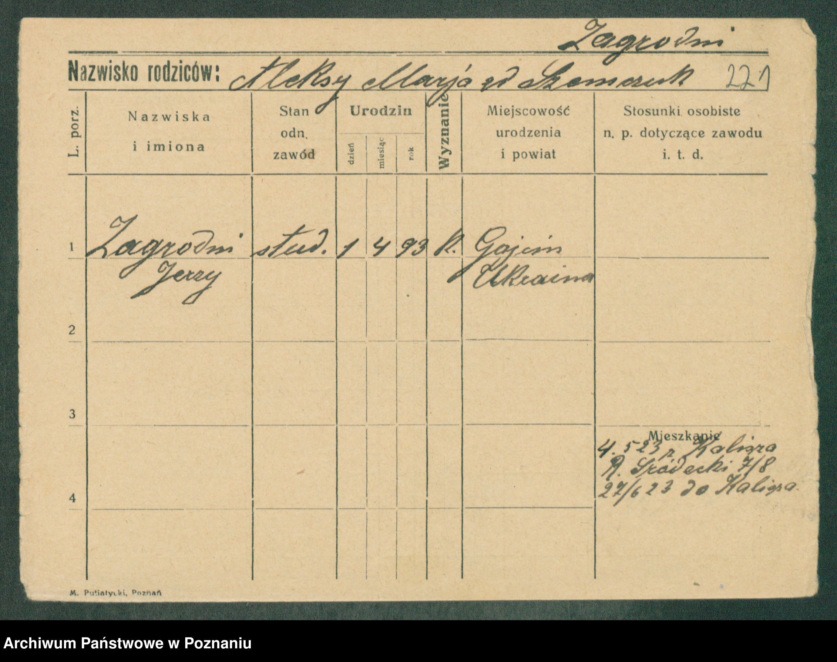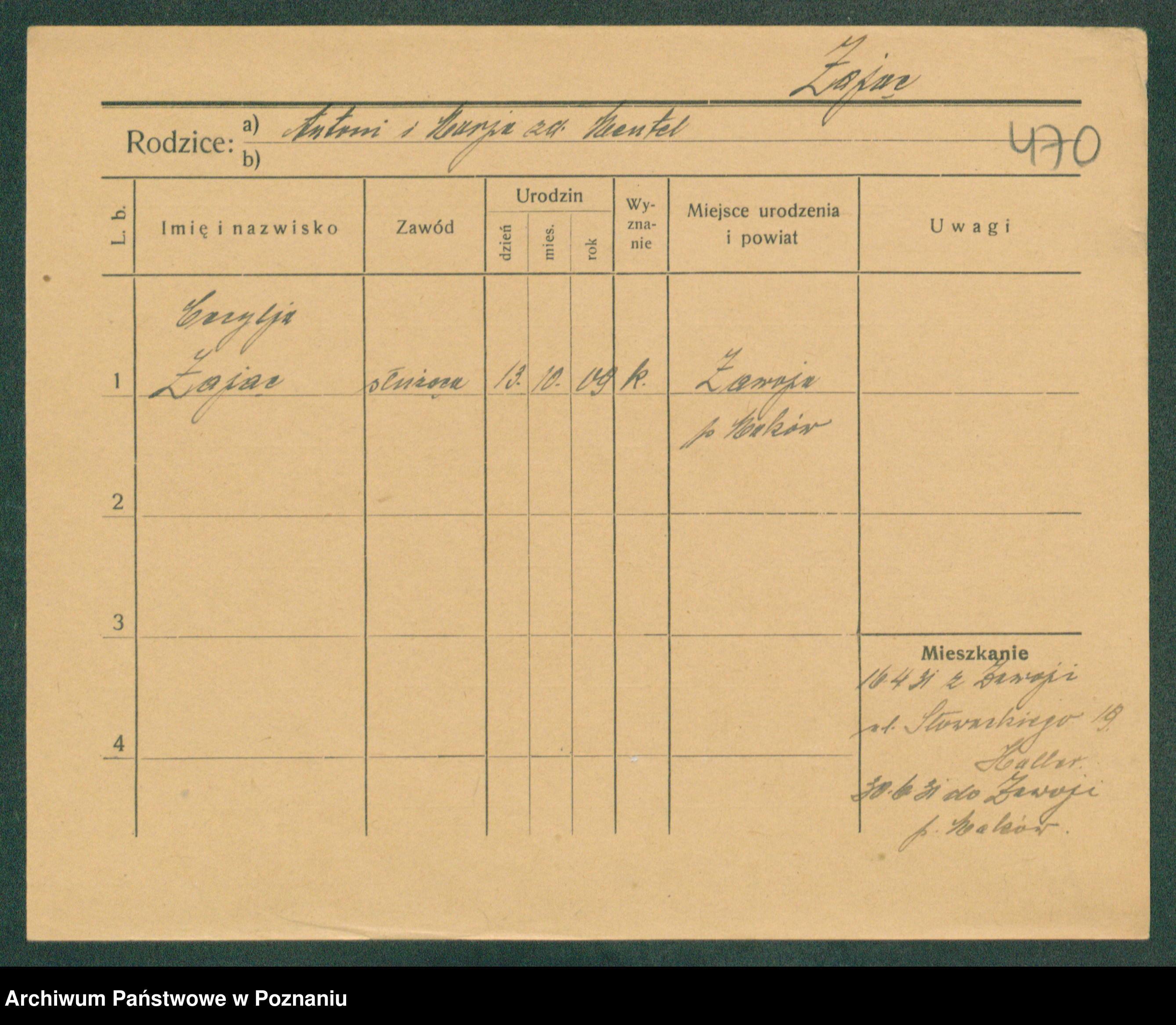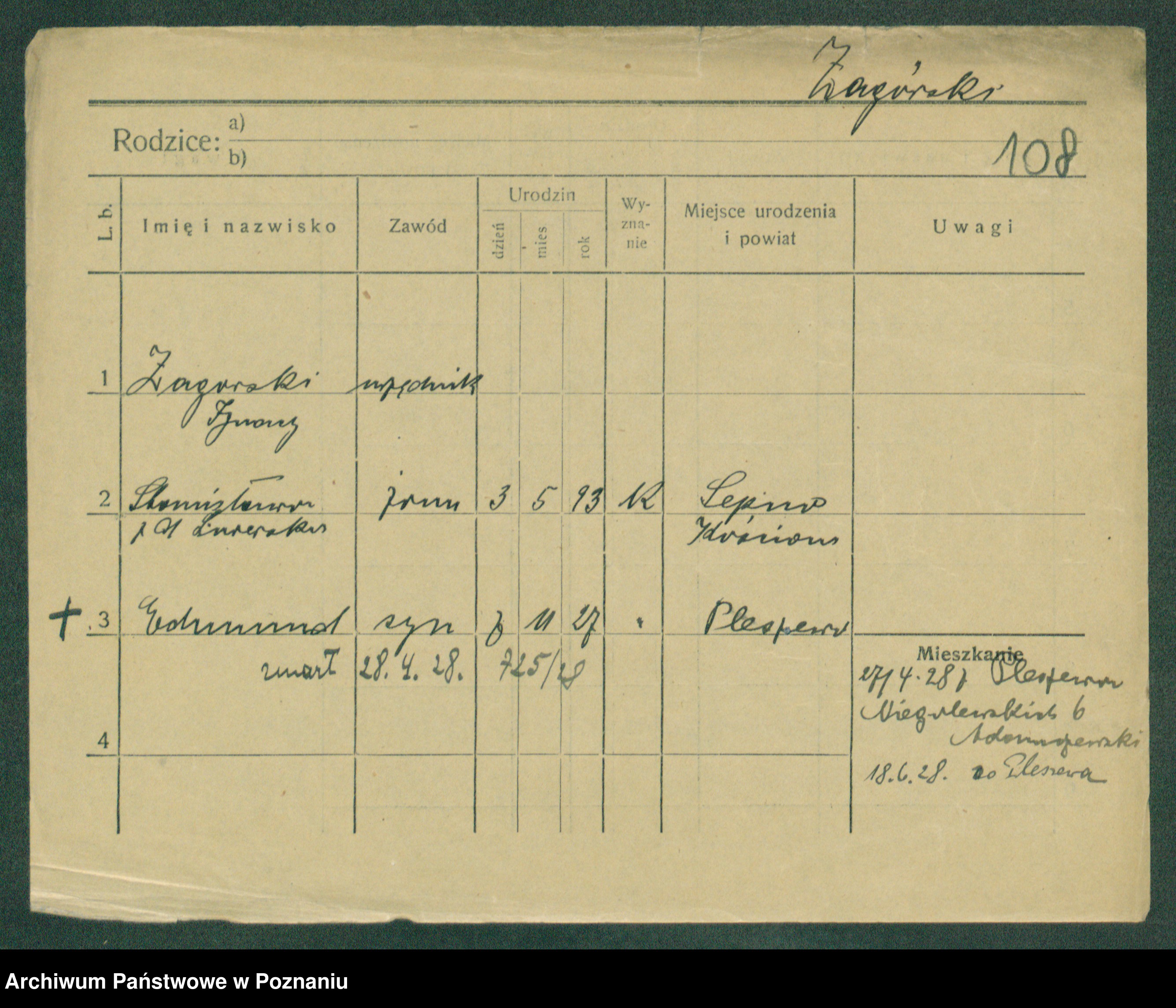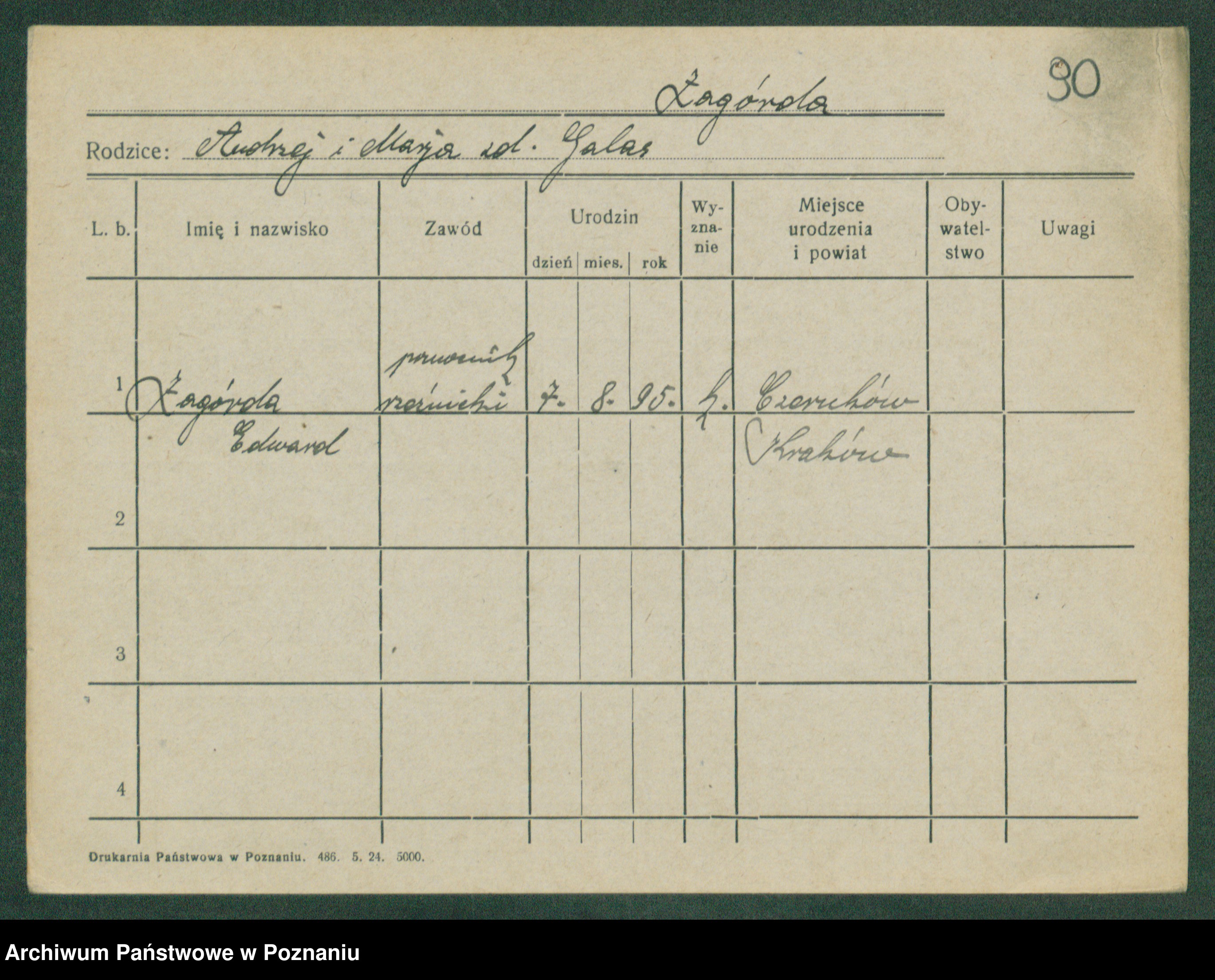 Podgląd karty osobowej dostępny jest po kliknięciu na nazwisko lub ikonkę karty. Można dokonywać powiększenia (ikony na górze) lub przechodzić między kolejnymi skanami (strzałki po bokach).